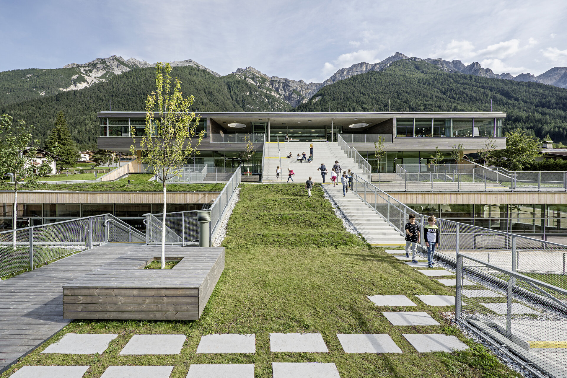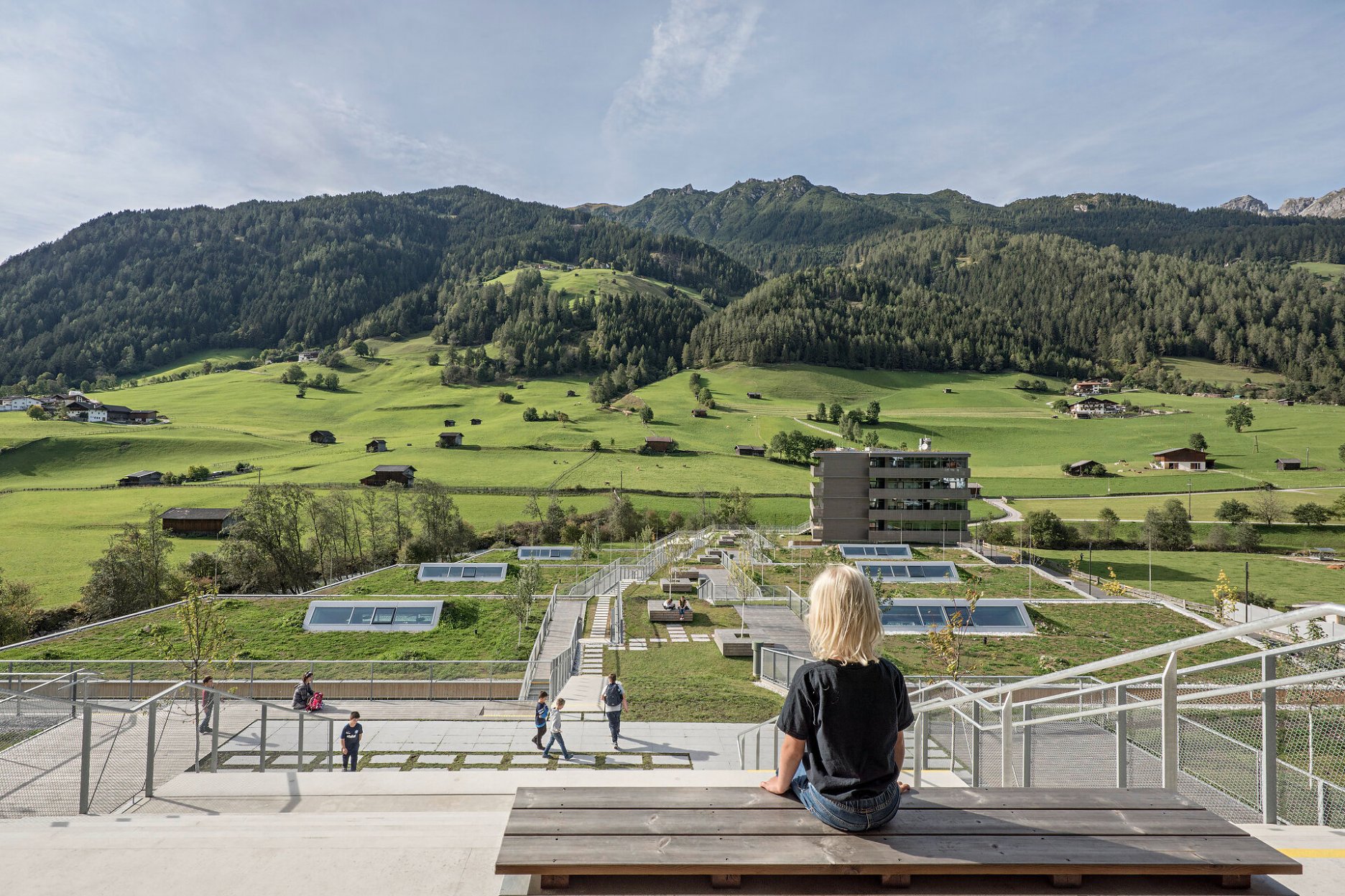 “Okolie charakterizujú lúky, alpské pastviny a v neposlednom rade pôsobivá horská panoráma. Krajina, ktorá stojí za zachovanie. Architektúra sa snaží v čo najväčšej miere zachovať charakter otvoreného priestoru s výhľadmi do okolia. Bariéru z rušnej ulice tvorí dvojpodlažný vstupný blok, za ktorým plynie nízka terasová zástavba so zelenou pochôdznou strešnou krajinou. Jedinú výraznejšiu výškovú dominantu tvorí objekt internátu na severozápadnom okraji kampusu” vysvetľujú architekti.