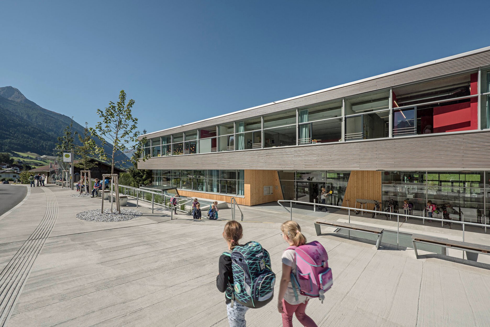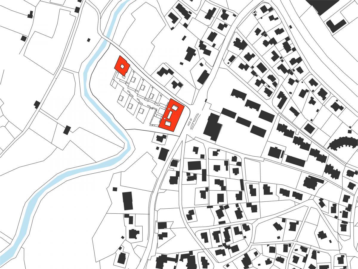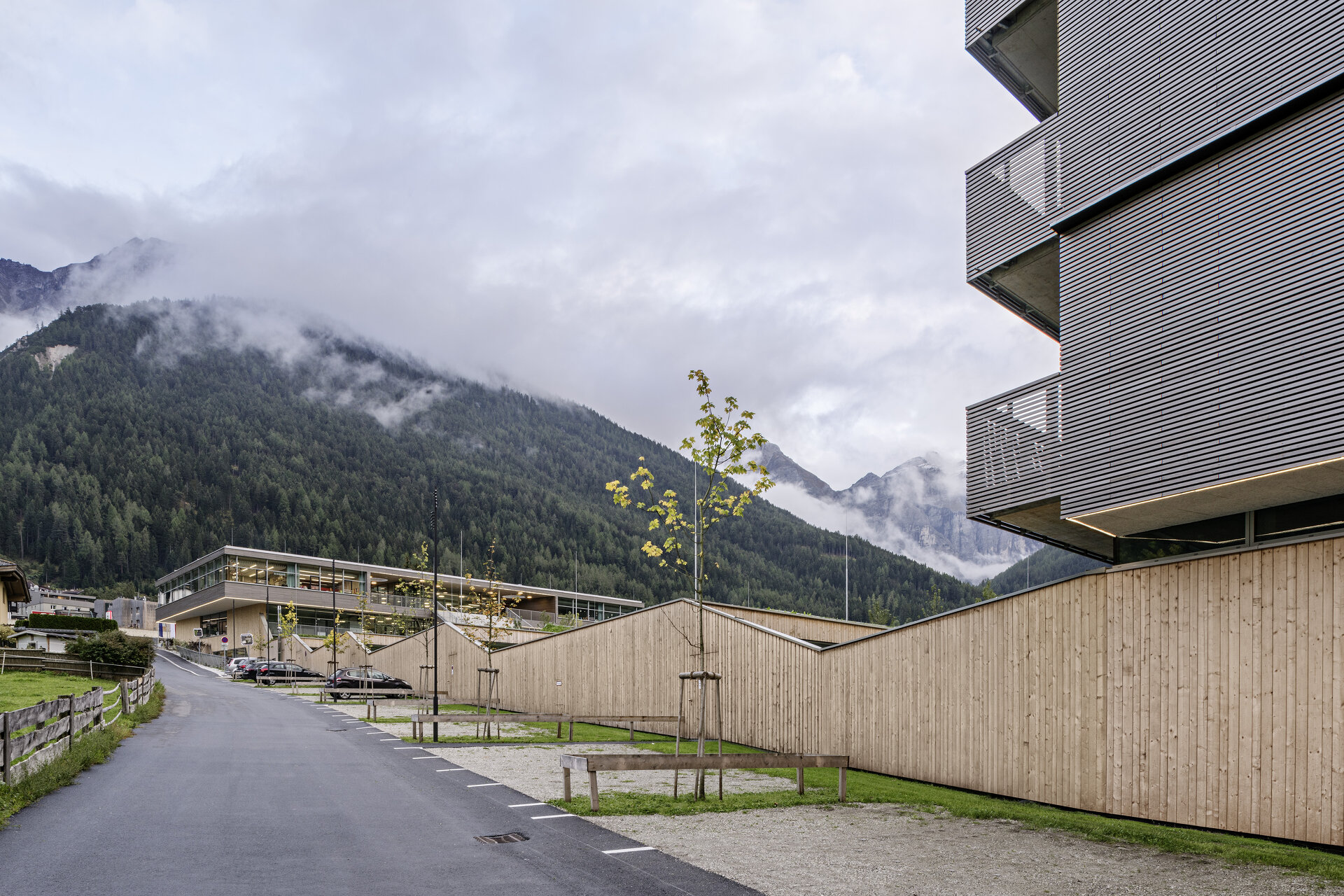 Architektonický koncept umne využíva svahovitý pozemok na okraji obce, ktorý sa od rušnej hlavnej cesty mierne zvažuje k ohybu rieky Ruetz.