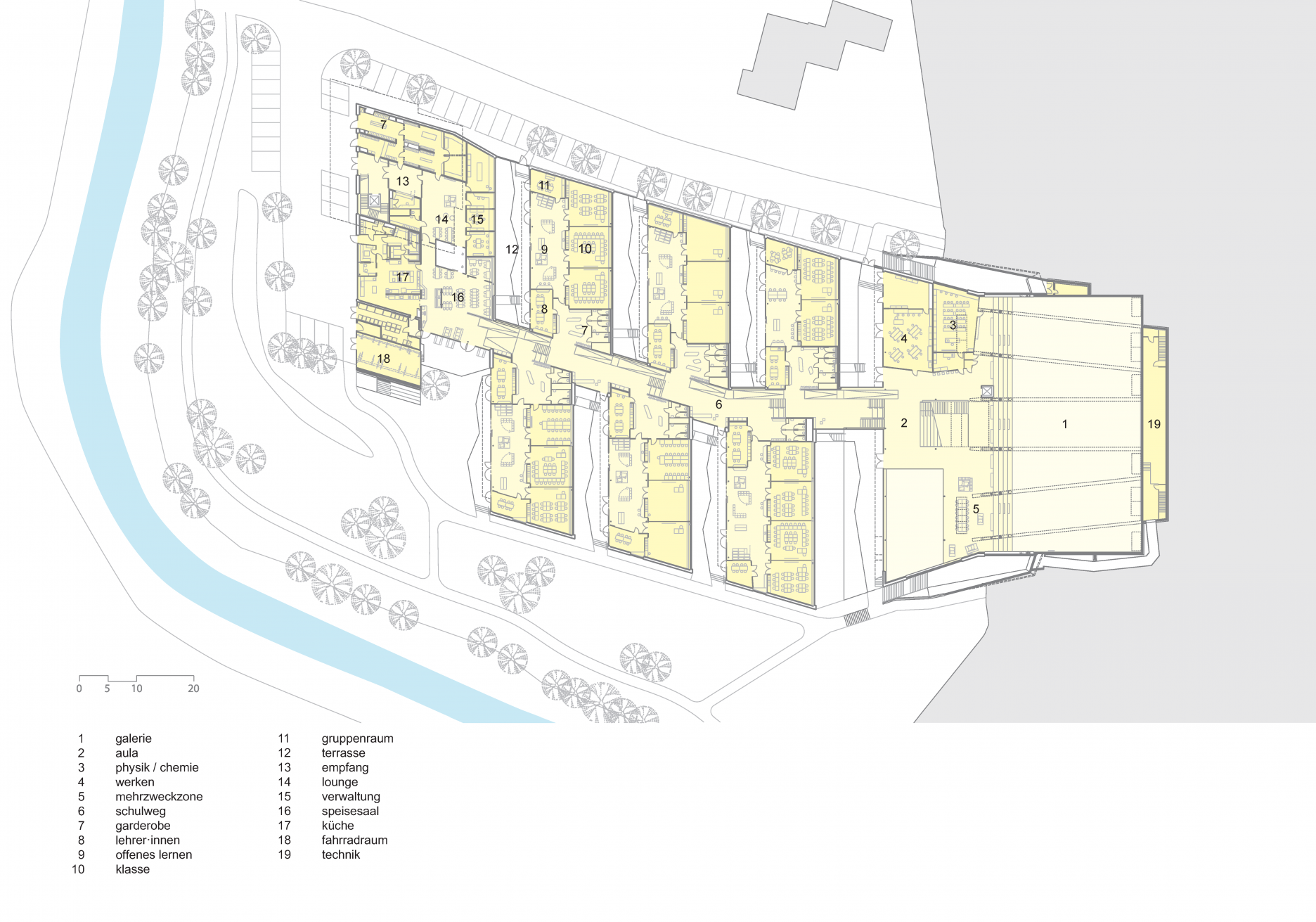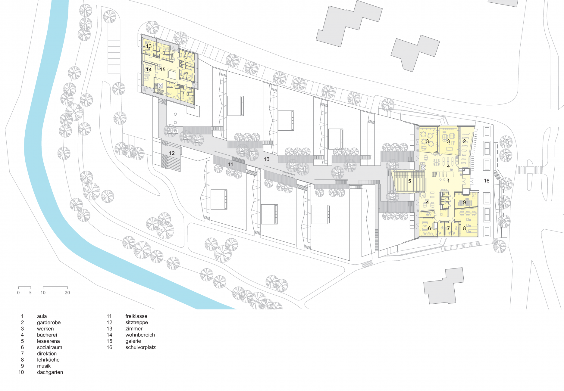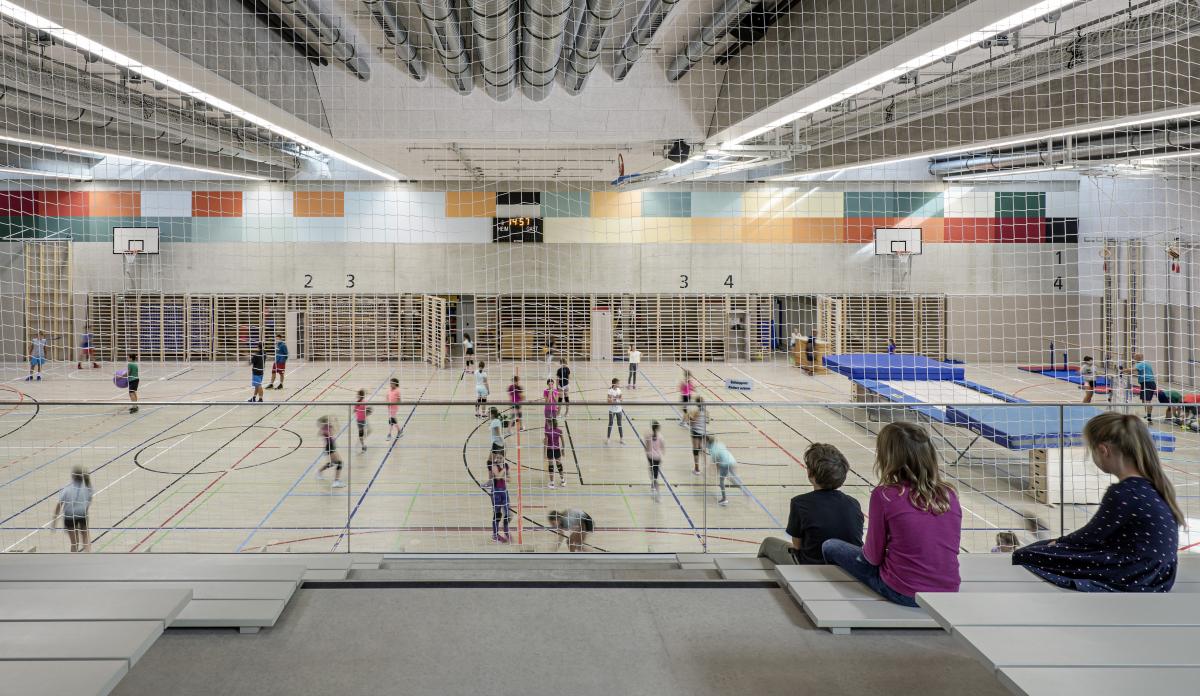 Priestory základnej školy sú situované na poschodí, priamo nad veľkoryso dimenzovaným vstupom. Učebne strednej školy a internátnej športovej školy sú terasovito usporiadané pozdĺž klesajúcej centrálnej komunikácie. Sedem tried sa otvára do spoločenskej zóny, prepojenej s obslužnými funkciami. Vzniká tak súvislá a prehľadná štruktúra, ktorá podporuje vzájomnú interakciu.
