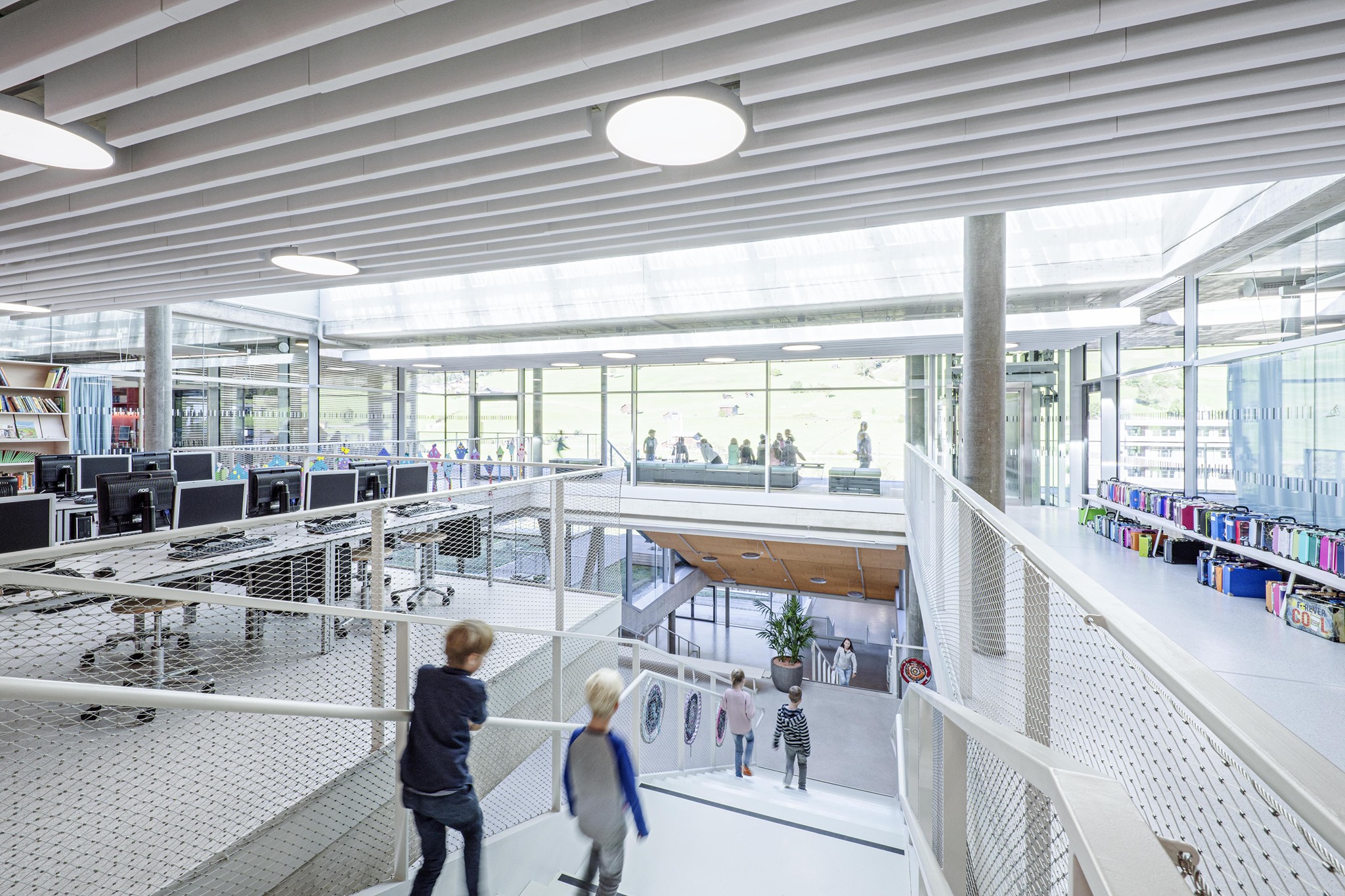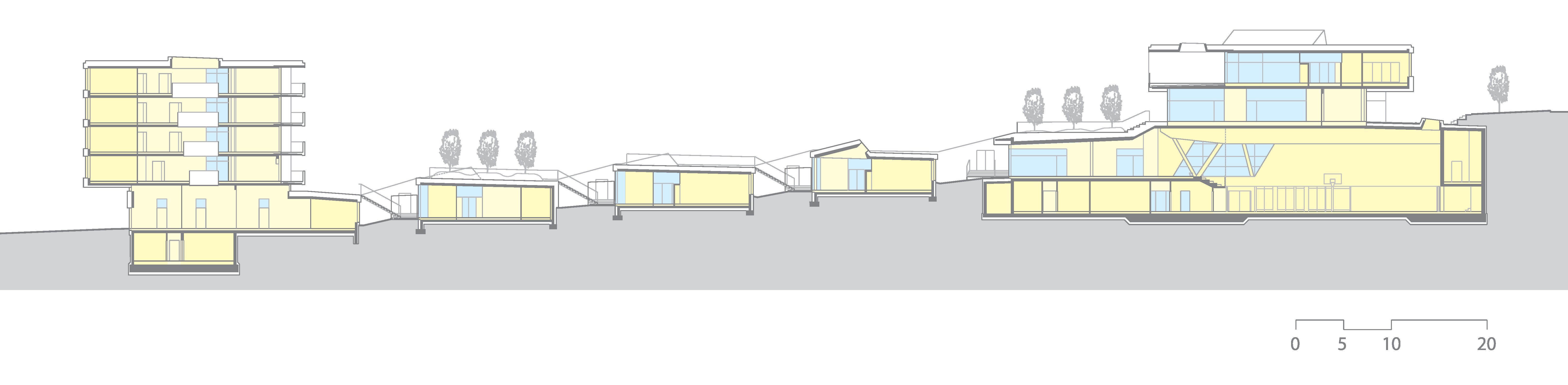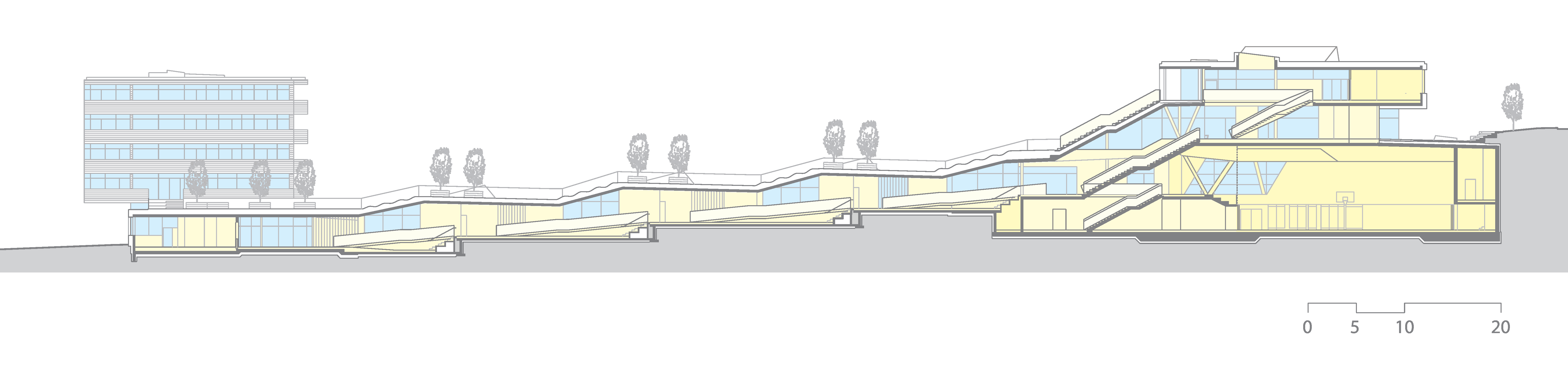 Priestory základnej školy sú situované na poschodí, priamo nad veľkoryso dimenzovaným vstupom. Učebne strednej školy a internátnej športovej školy sú terasovito usporiadané pozdĺž klesajúcej centrálnej komunikácie. Sedem tried sa otvára do spoločenskej zóny, prepojenej s obslužnými funkciami. Vzniká tak súvislá a prehľadná štruktúra, ktorá podporuje vzájomnú interakciu.