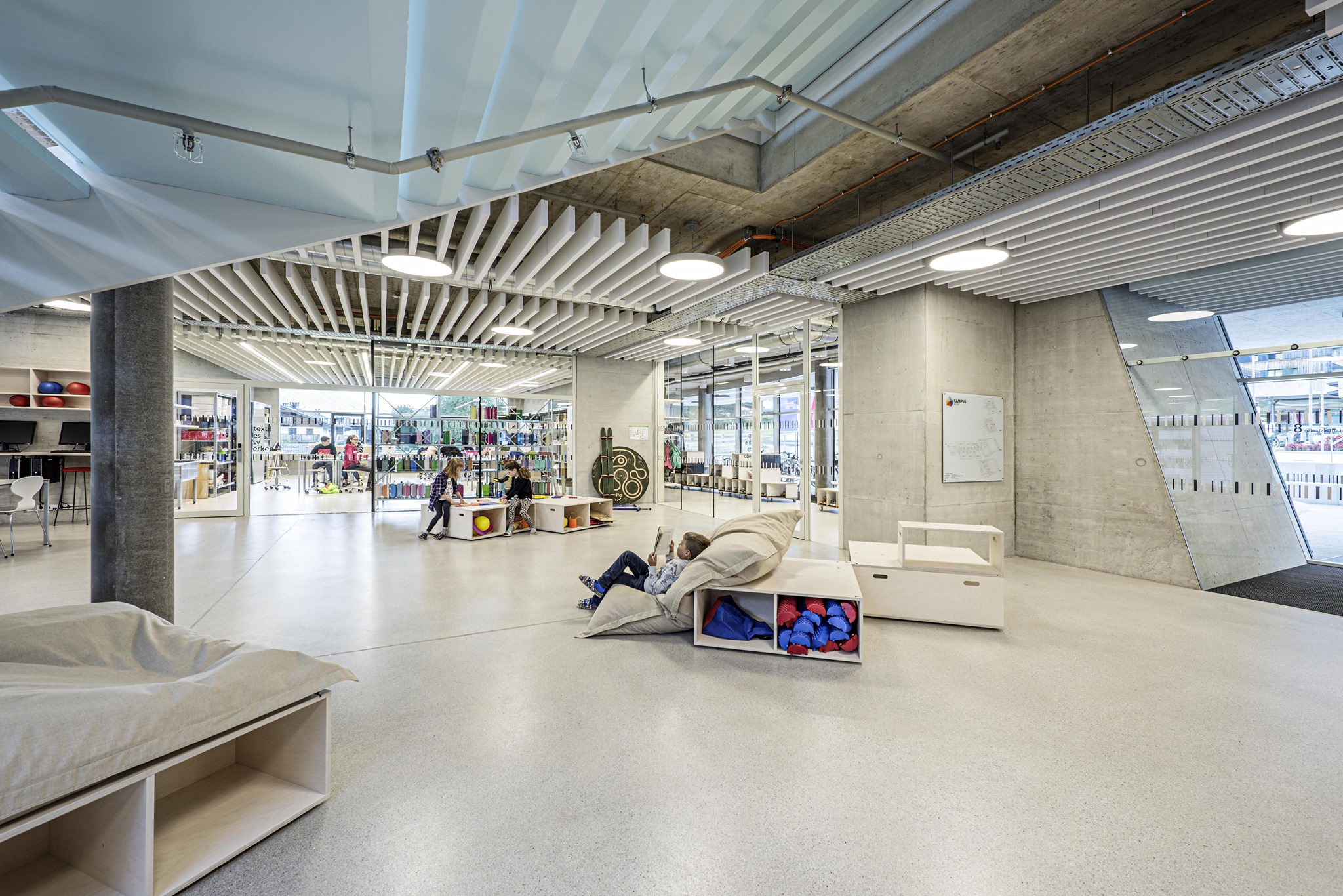 Ústredným priestorom kampusu je hala pri vstupe, otvorená cez dve podlažia. Široké pobytové schodisko prepája spoločenskú a oddychovú zónu s učebňami a telocvičňou, situovanými o úroveň nižšie.