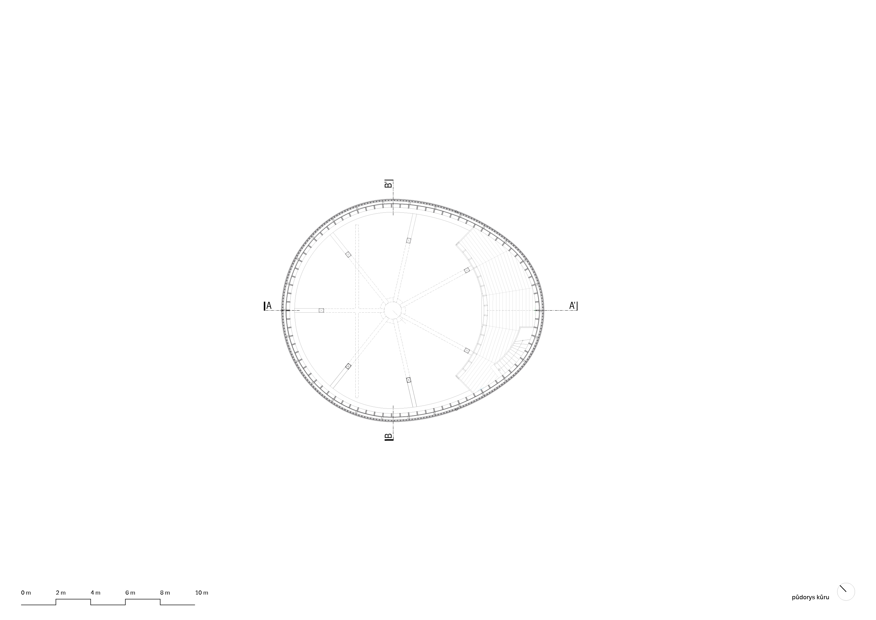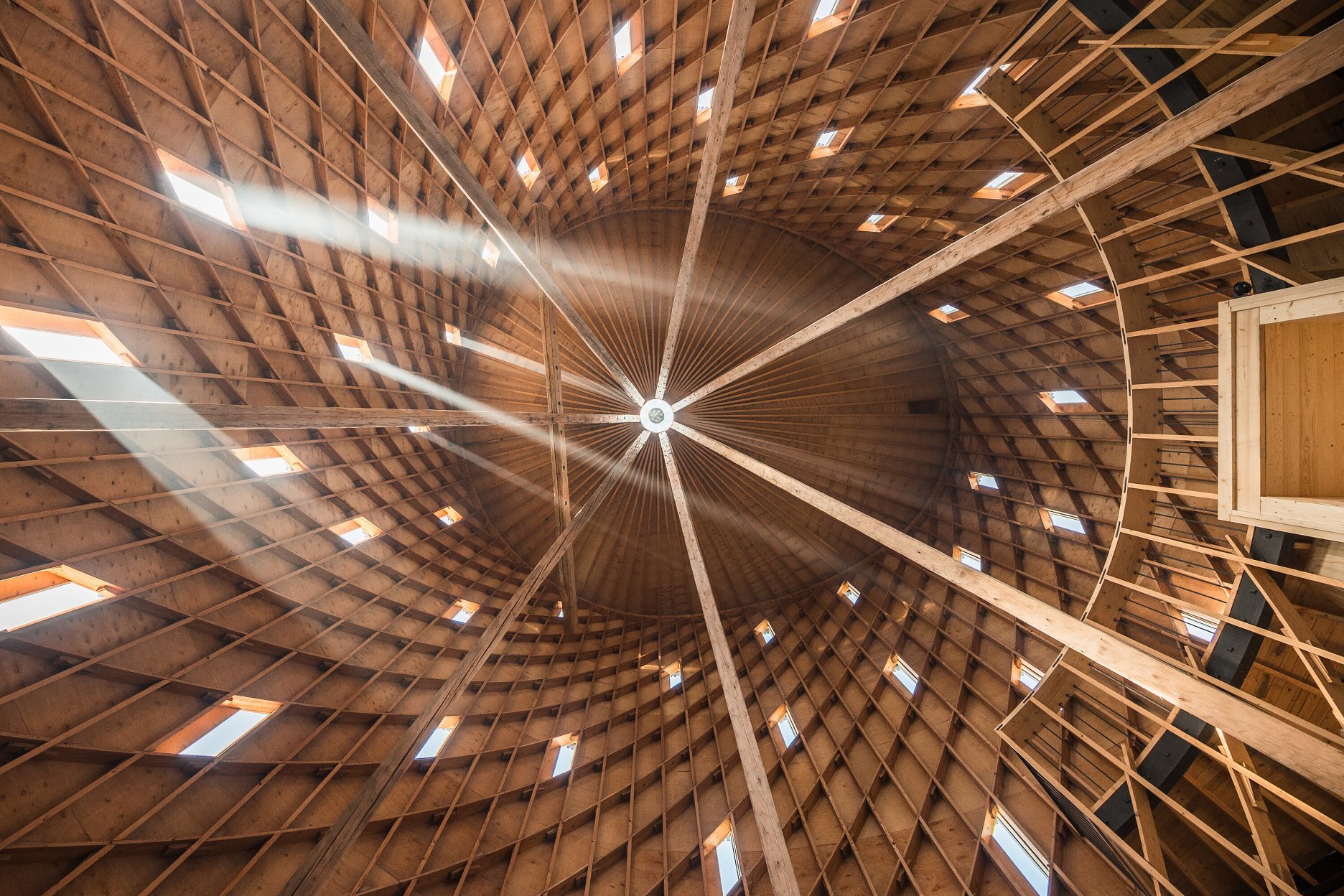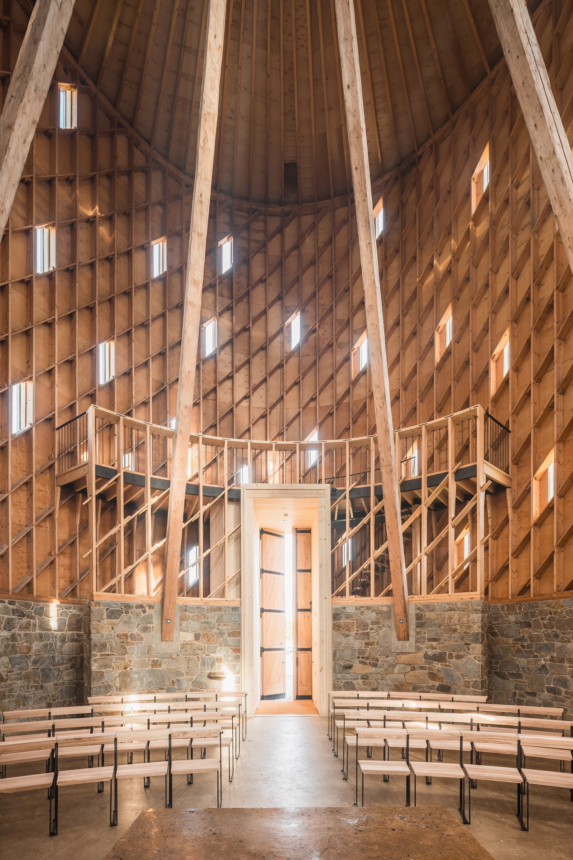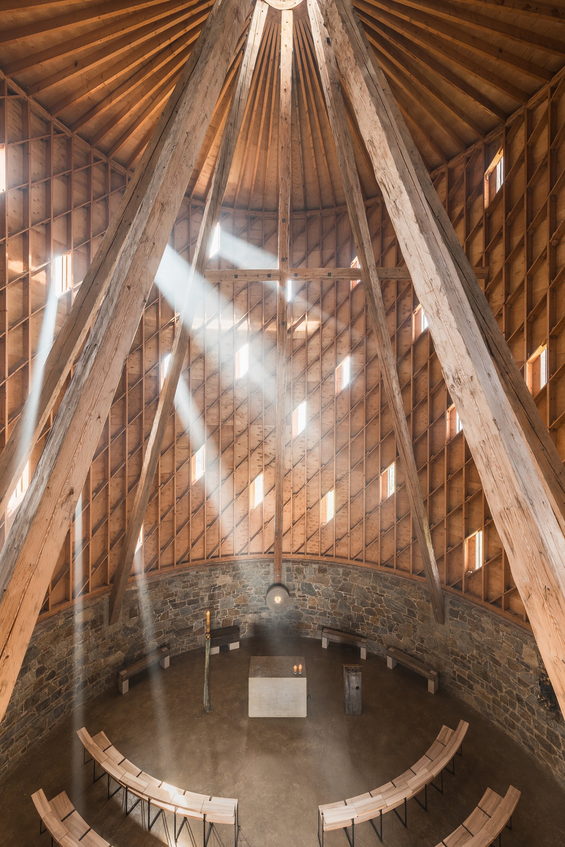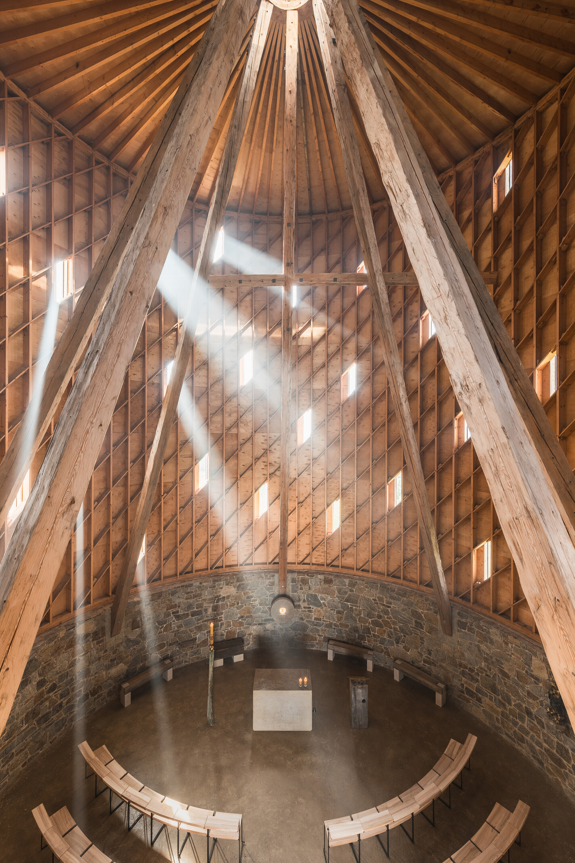 Stavba prepája tradície so súčasnosťou. Konštrukčné riešenie čerpá inšpiráciu zo stredovekých stavebných princípov, ktoré vstupujú do dialógu s modernými technológiami. Podlahu tvorí zhutnená brúsená hlina, steny sokla sú z lomového kameňa. Realizáciu nosnej lamelovej konštrukcie z tisícov drevených prvkov, tradične spájaných čapmi a klinmi, umožnilo realizovať presné obrábanie prvkov prostredníctvom CNC frézy. Ručne tesané trámy dlhé pätnásť metrov voľne pretínajú priestor a podopierajú strechu, ktorú korunuje oceľová vežička. Pri vstupe návštevníkov vítajú päť metrov vysoké vráta, za ktorými sa otvára dynamický priestor. Perspektíva trámov, spolu s okolitou lamelovou konštrukciou, usmerňuje pohľady smerom nahor.