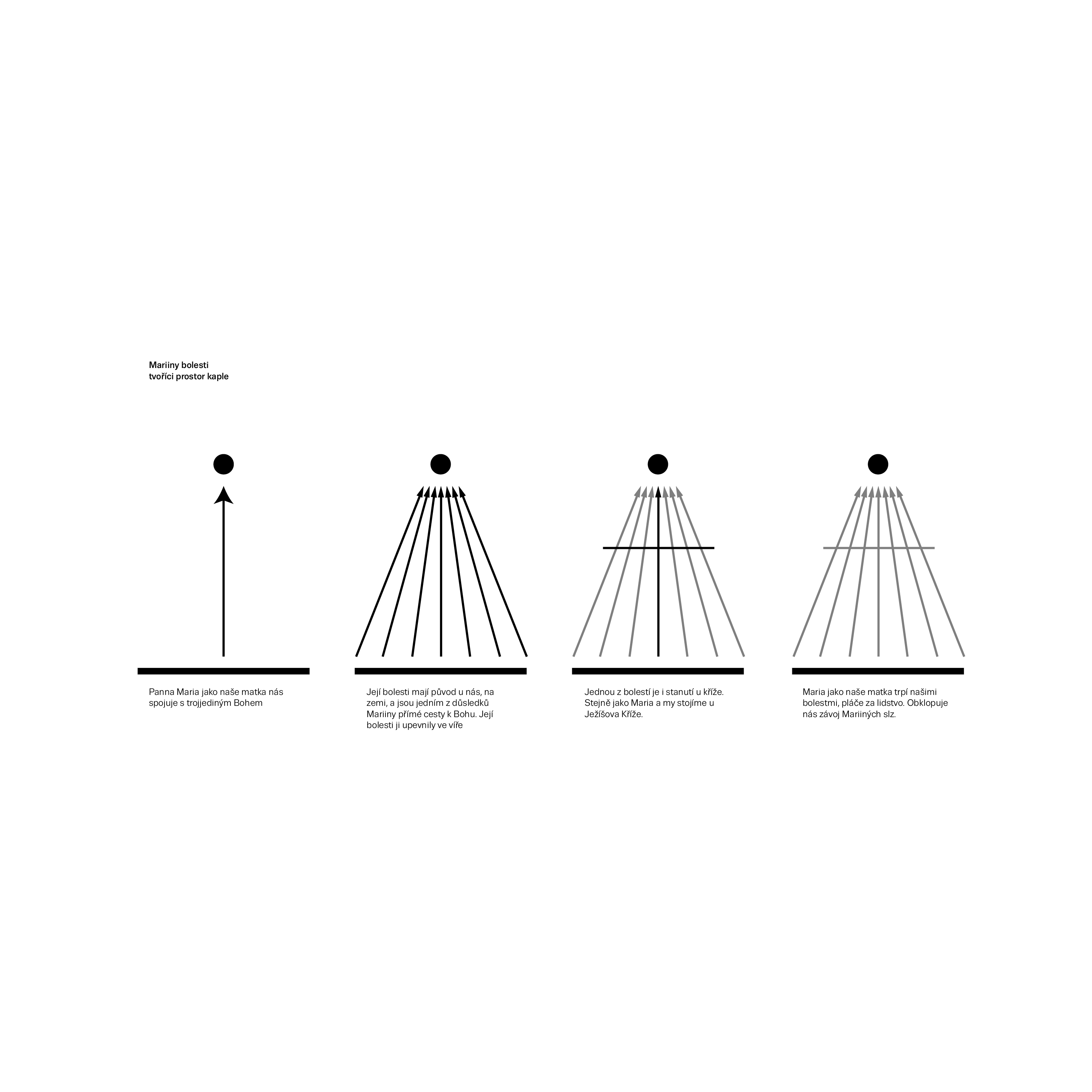 “Místní si vybrali jako patronku Pannu Marii Bolestnou, symbol utrpení, které prožívala. Její příběh a emoce se zrcadlí v prostoru. Na místním prachu a hlíně, jež tvoří podlahu, stavíme chrám. Spodní část, rulové kameny, představují nás, neposlušné, tvrdohlavé a těžko tvárné lidstvo. Sedmero Mariiných bolestí - trámů pak směřuje z těchto kamenů vzhůru k nebi a propojuje nás s Bohem. Z nebe se pak na nás snáší závoj Mariiných slz, pláč nad námi. Jemná dřevěná konstrukce, protkaná drobnými okny, umožňuje, aby sluneční paprsky vždy pronikly do nitra kaple. Stavbu obklopuje prstenec křížové cesty doplněný jabloněmi, které tvoří také alej vedoucí ke kapli a sad za ní navazující na záhumenní,” približuje autor východiská projektu.