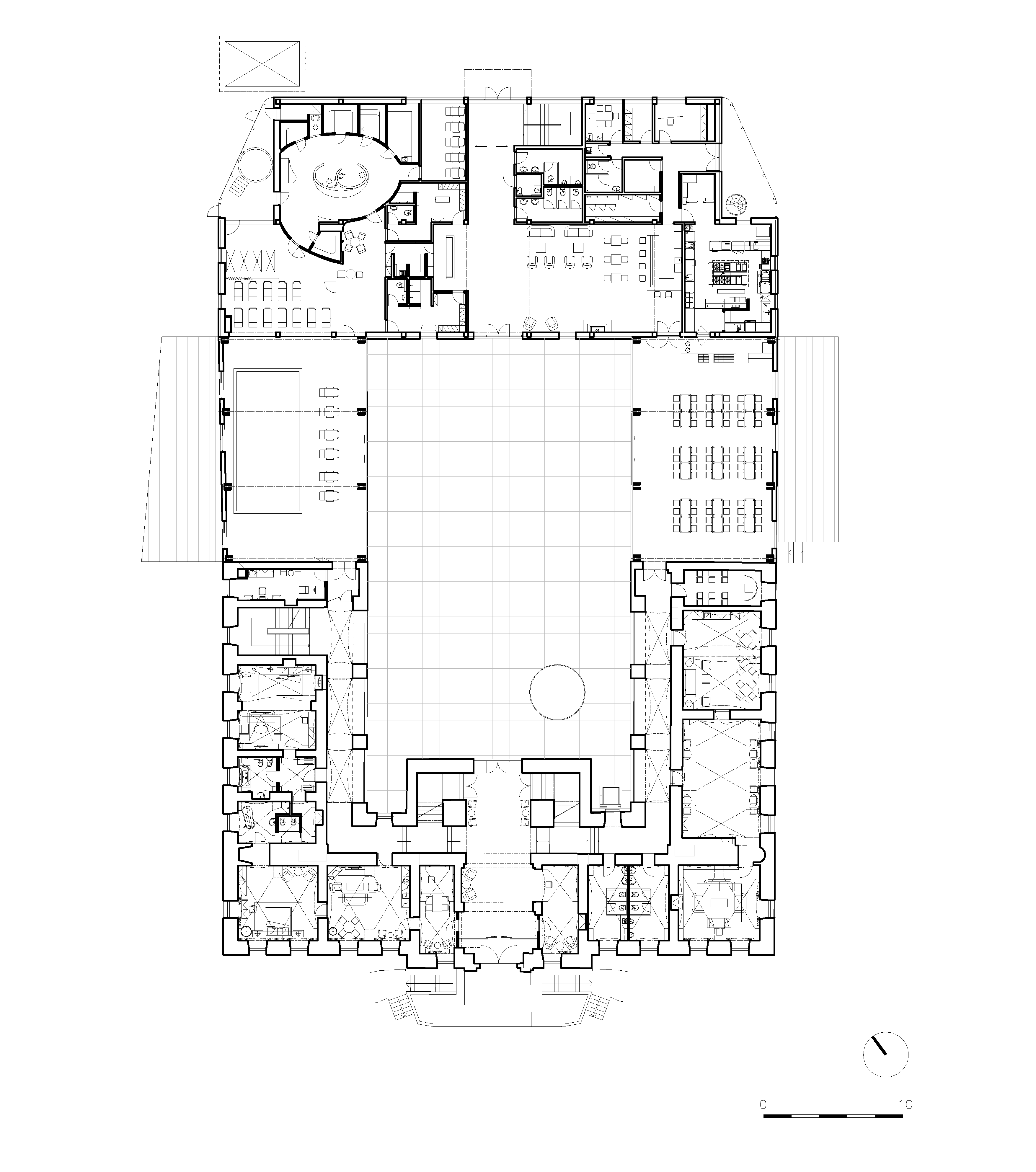 Toto átrium, akýsi vonkajší interiér, poskytuje možnosti pre usporiadanie rôznych typov eventov s možnosťou zapojenia vnútorných priestorov. Odtiaľto je možný pohľad do okolitého historického parku cez priestory reštaurácie a bazéna, ktoré majú transparentné steny s možnosťou zakrytia pohyblivými drevenými okenicami.