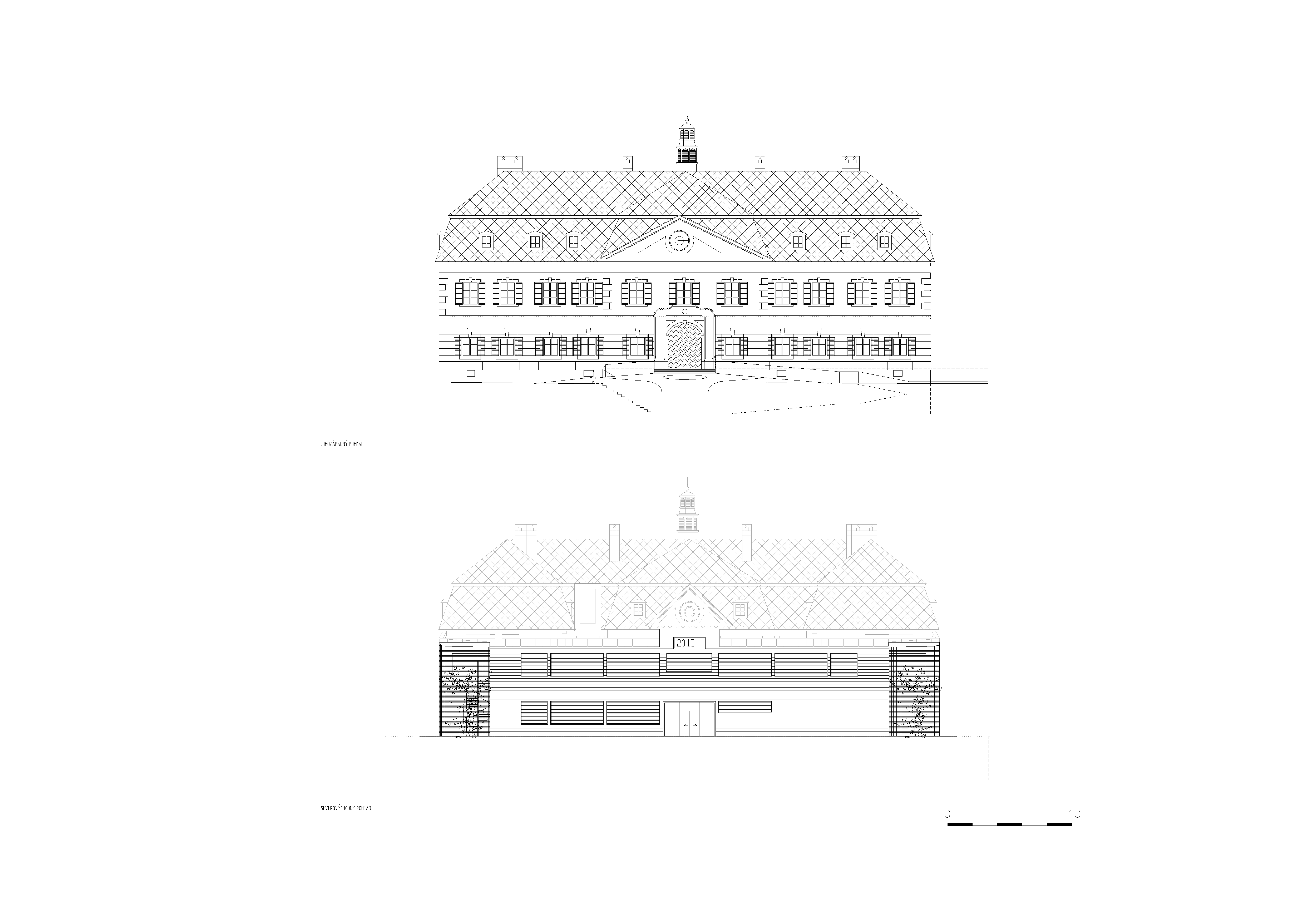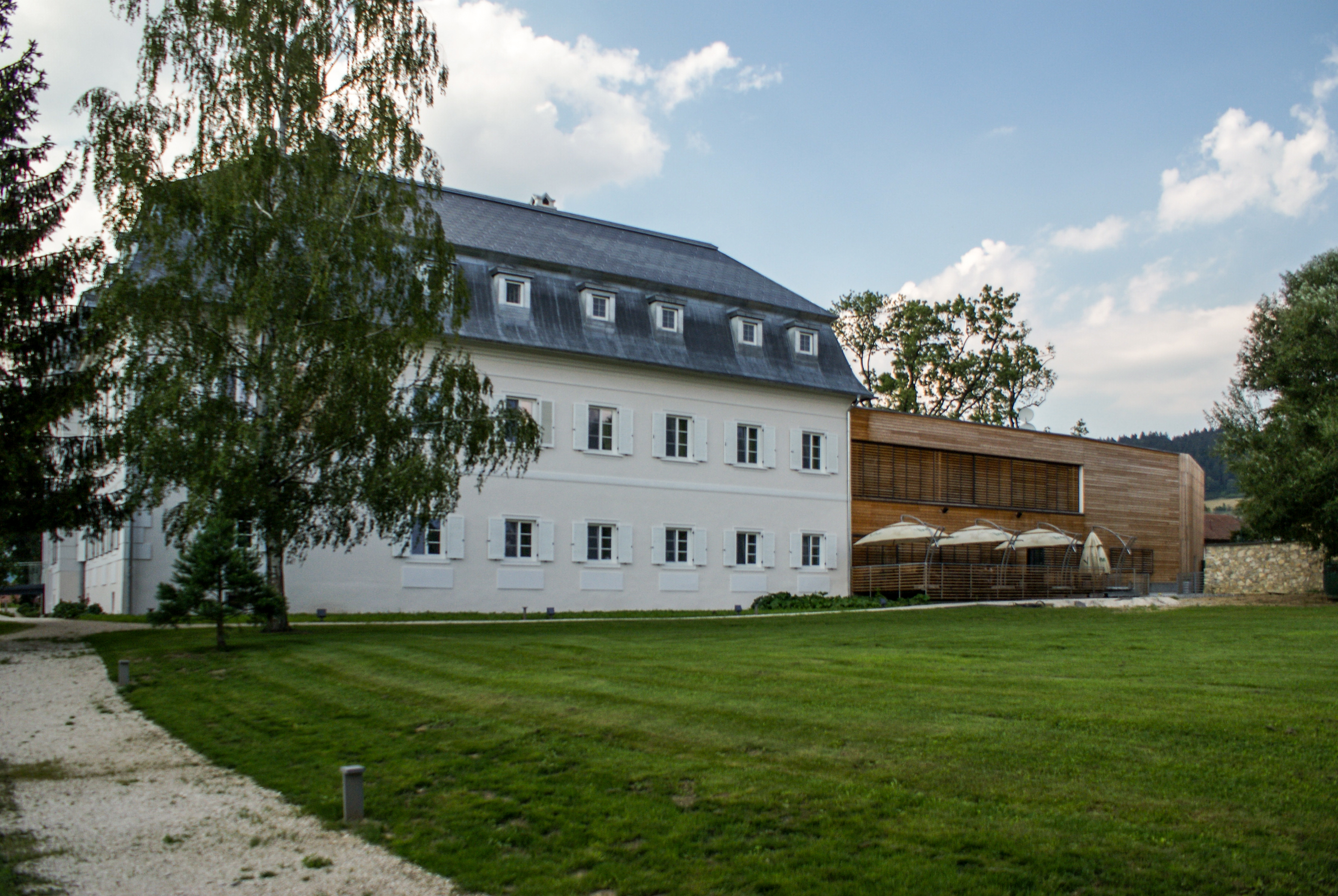 Hotel je riešený koncepčne ako symbióza starého a nového. Pôvodná baroková hmota tvaru U je stvárnená v omietke, monochrómne s drevenými bielymi okenicami. Nová prístavba, tiež tvaru U je riešená ako drevený monolit, s pohyblivými drevenými žalúziami - odpoveďou na barokové okenice.