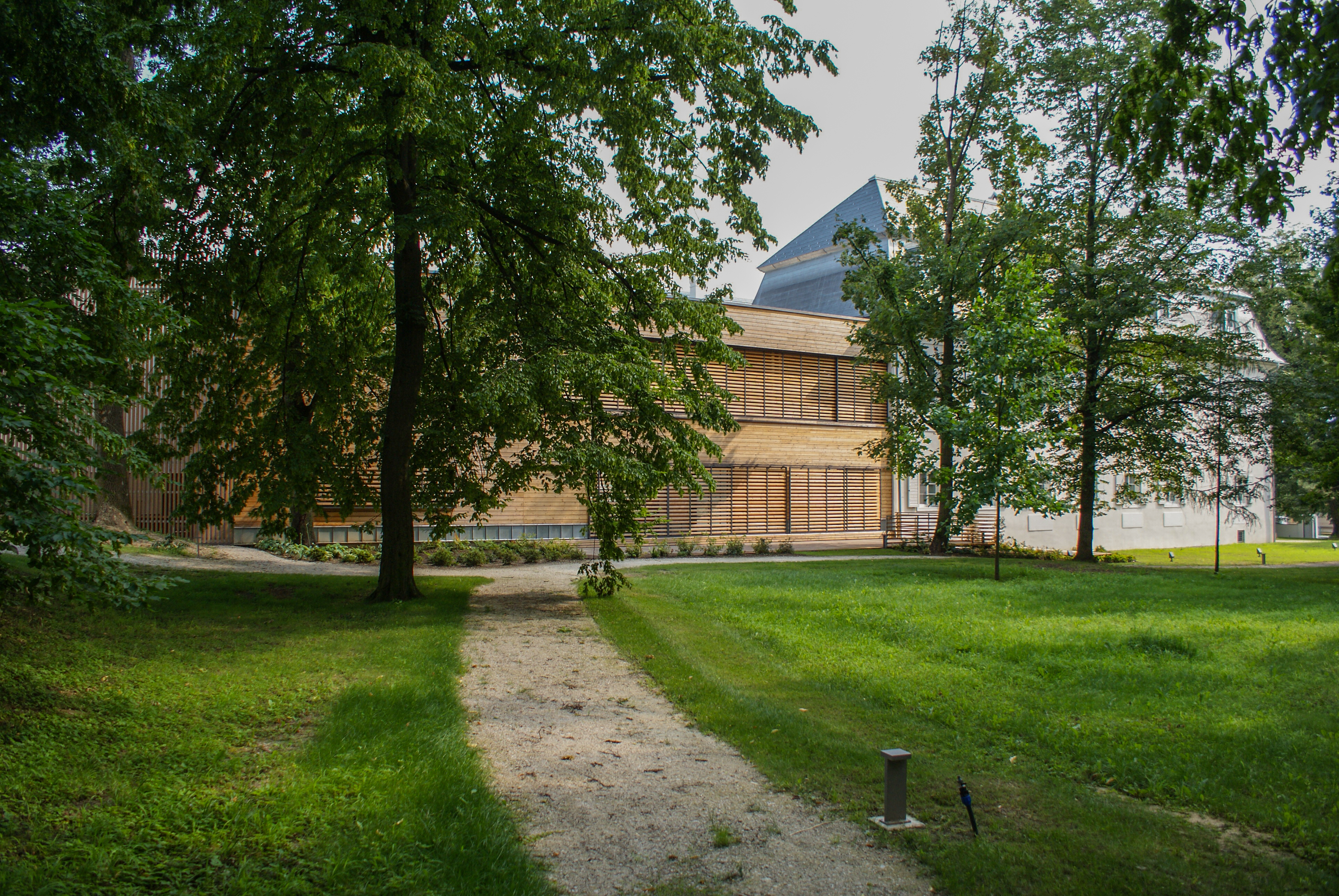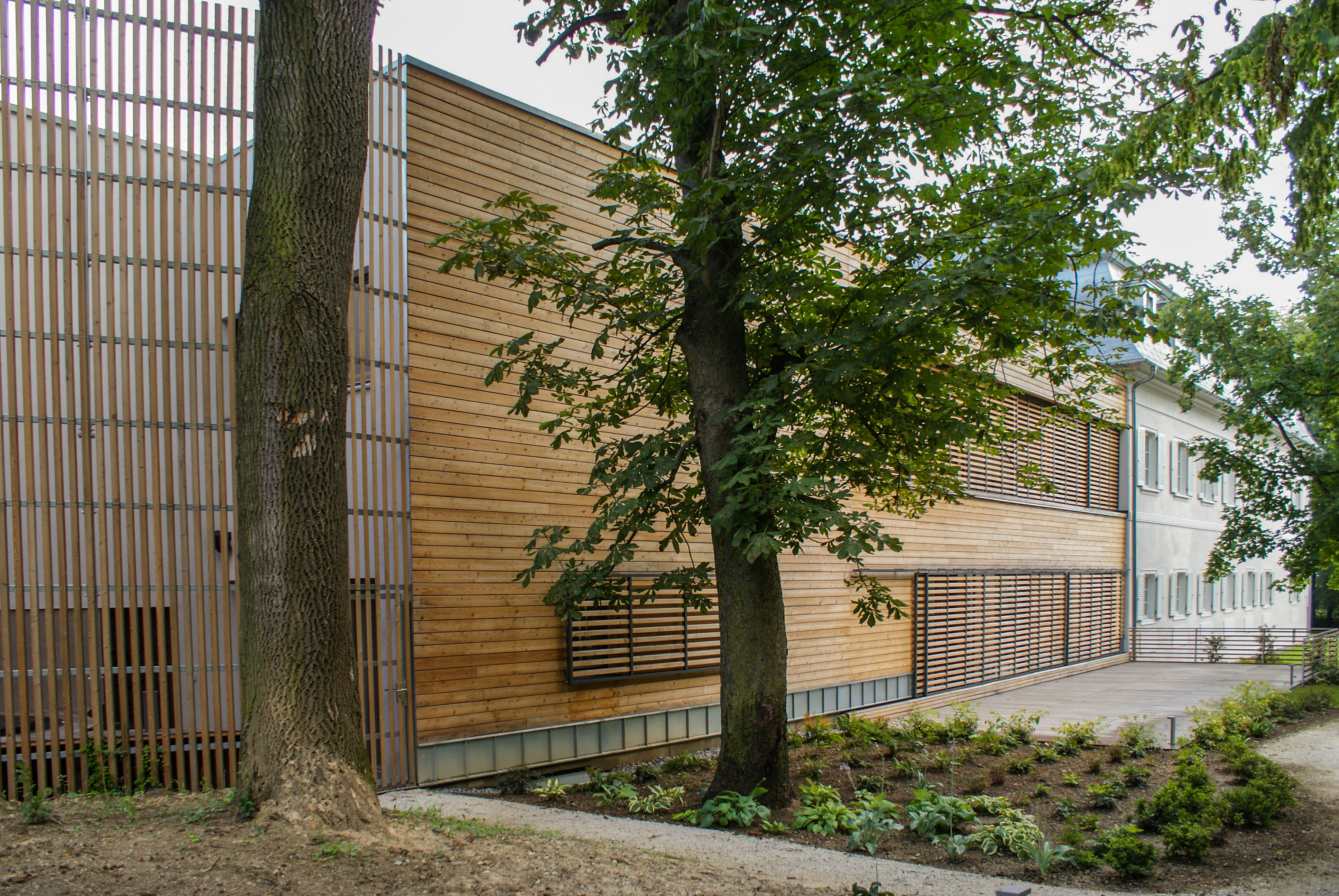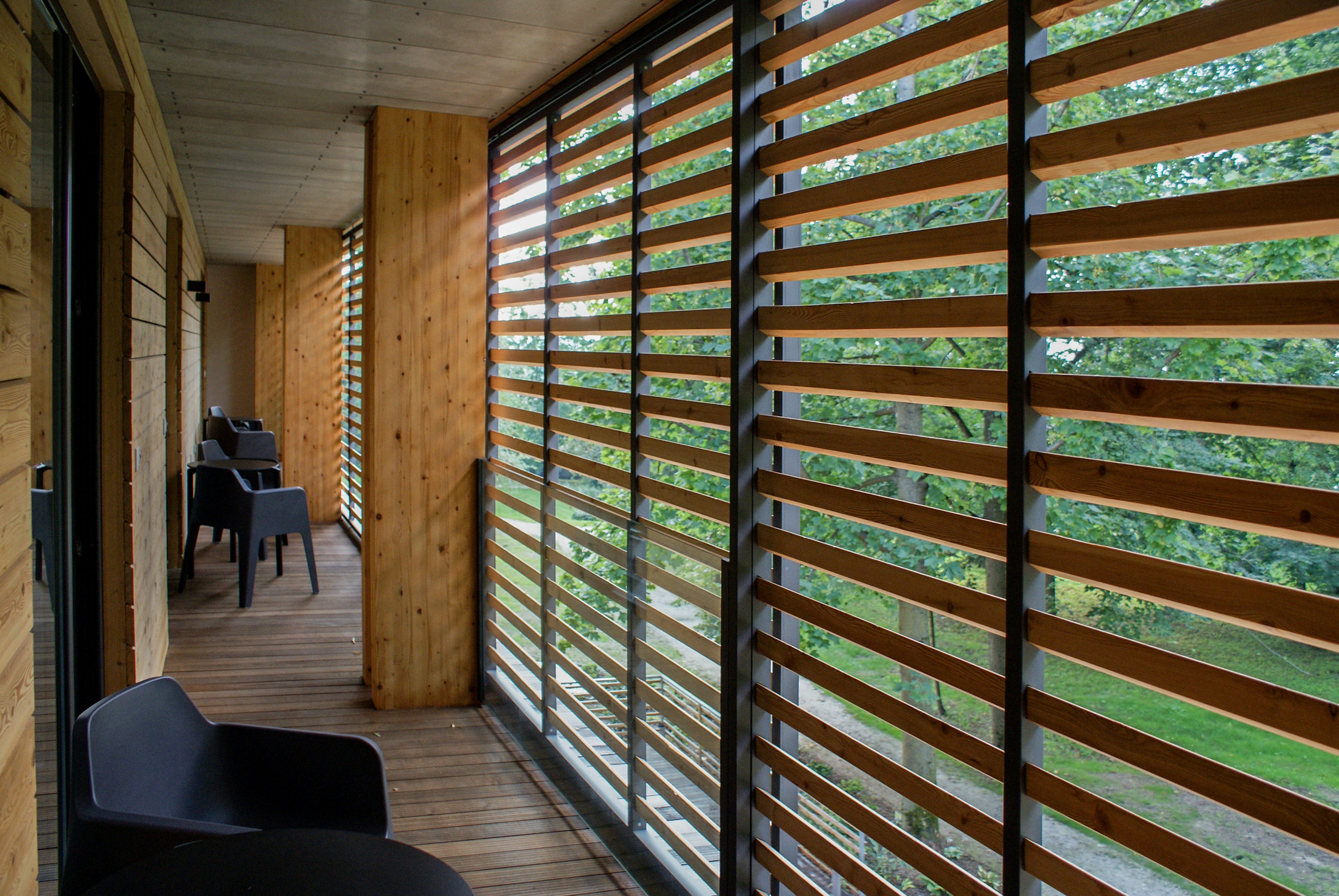 Prístavba má v rohoch dva medzipriestory, ktoré tvoria prechod medzi vnútrom a vonkajškom. V jednom sa nachádza zásobovací manipulačný priestor s exteriérovým schodiskom z kuchyne do kongresovej miestnosti na poschodí. V druhom je umiestnená vonkajšia vírivka pre wellness. Obidve drevené membrány pomaly zarastajú popínavou zeleňou, čím bude umocnená symbióza architektúry a okolitého historického parku.