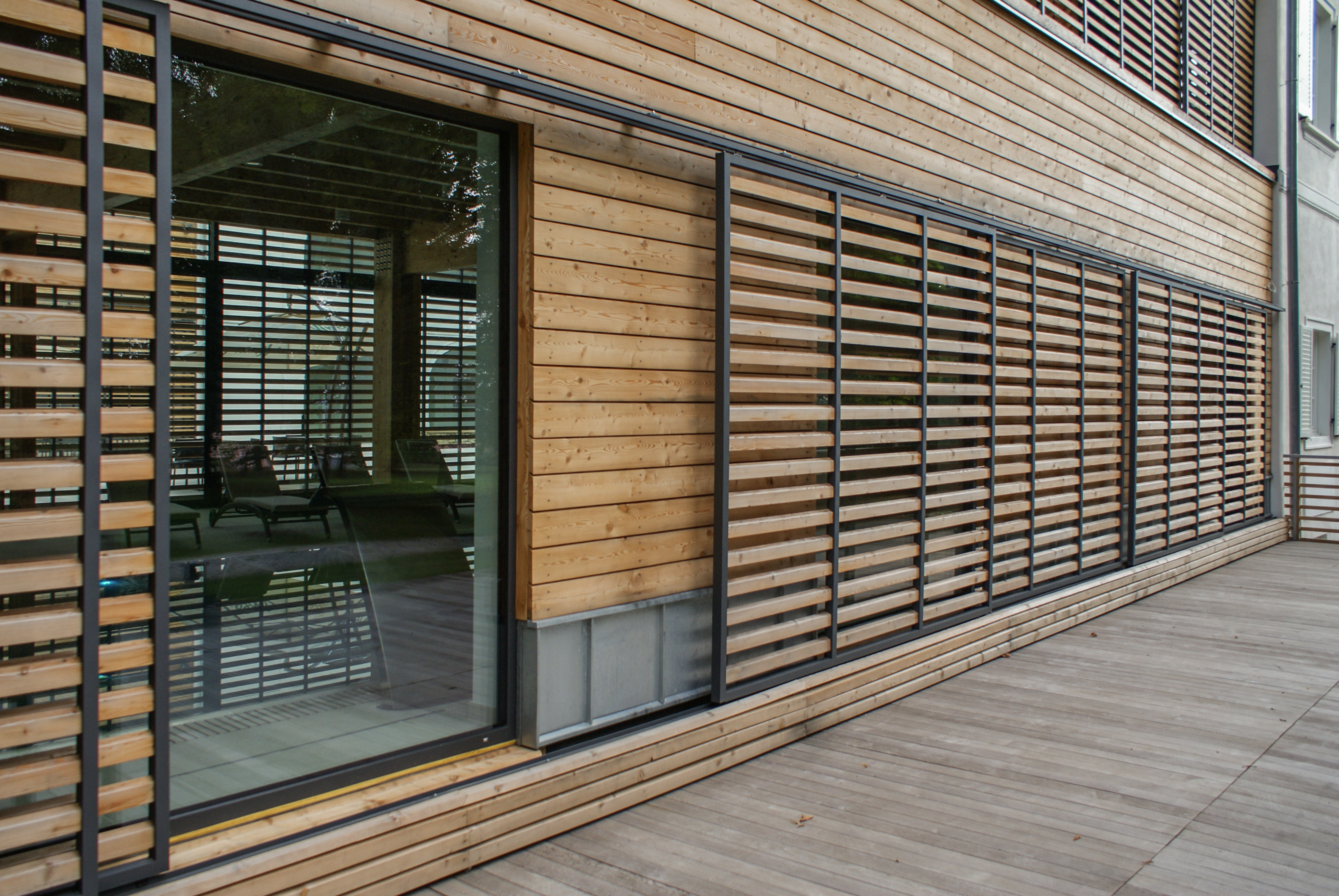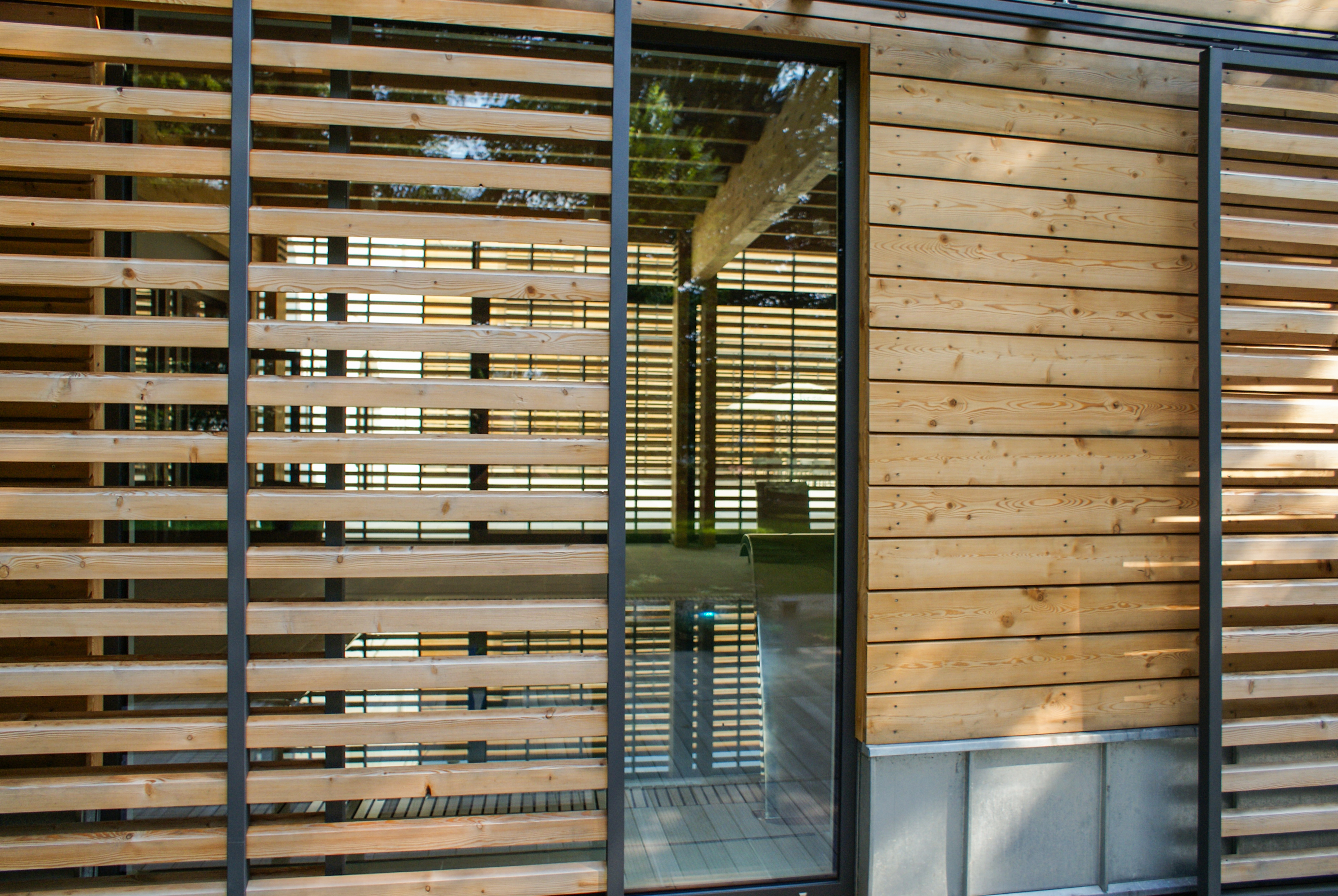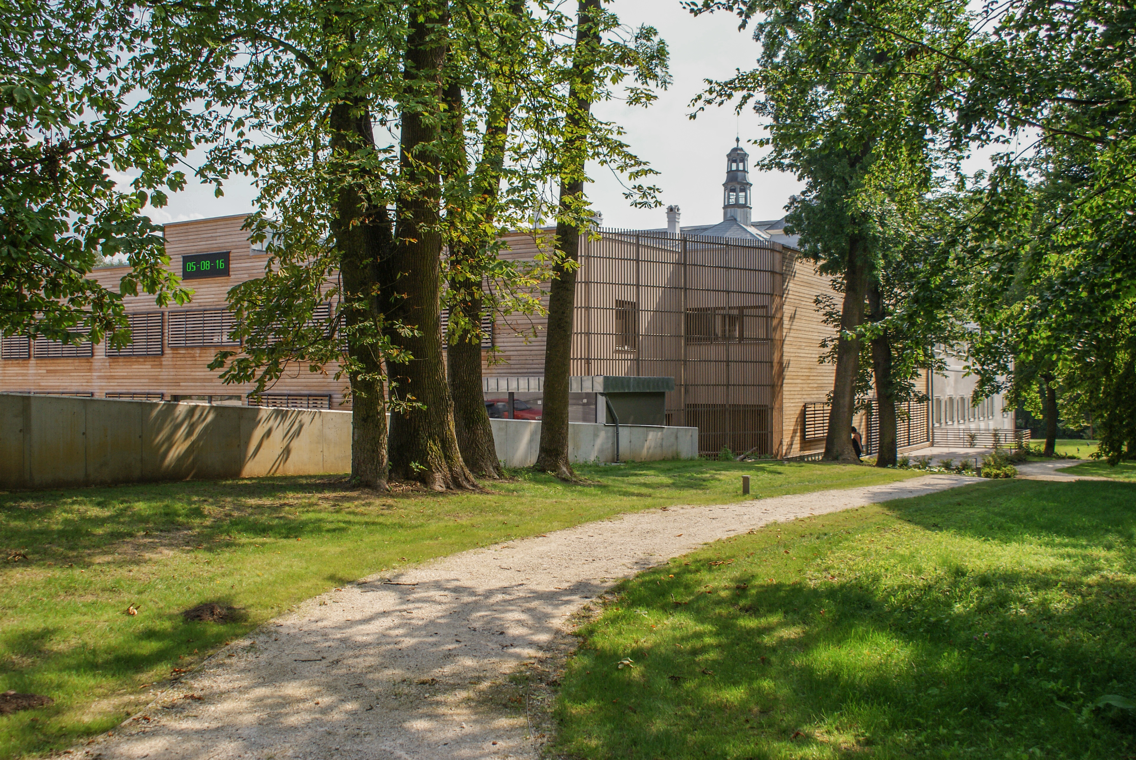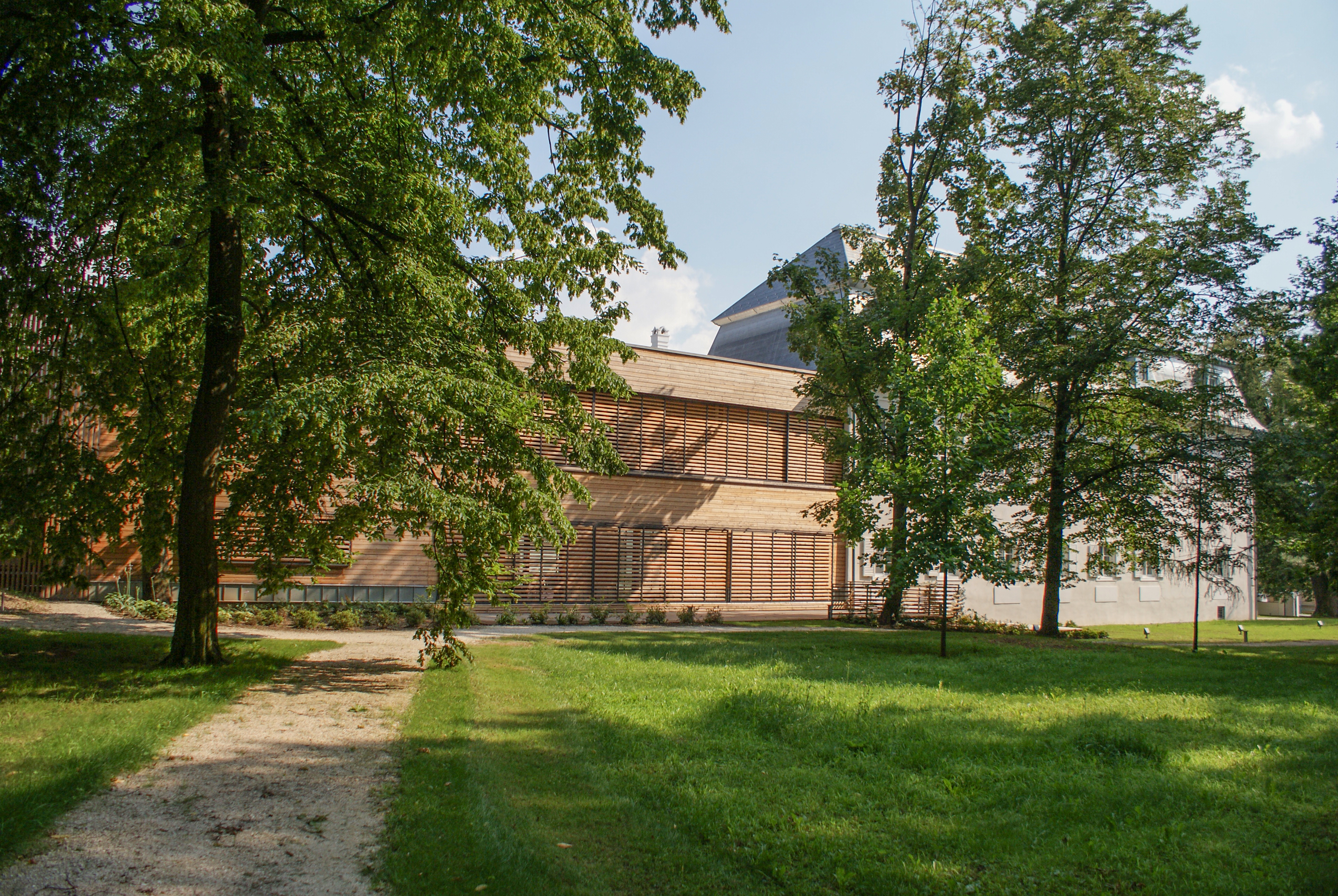 Prístavba má v rohoch dva medzipriestory, ktoré tvoria prechod medzi vnútrom a vonkajškom. V jednom sa nachádza zásobovací manipulačný priestor s exteriérovým schodiskom z kuchyne do kongresovej miestnosti na poschodí. V druhom je umiestnená vonkajšia vírivka pre wellness. Obidve drevené membrány pomaly zarastajú popínavou zeleňou, čím bude umocnená symbióza architektúry a okolitého historického parku.