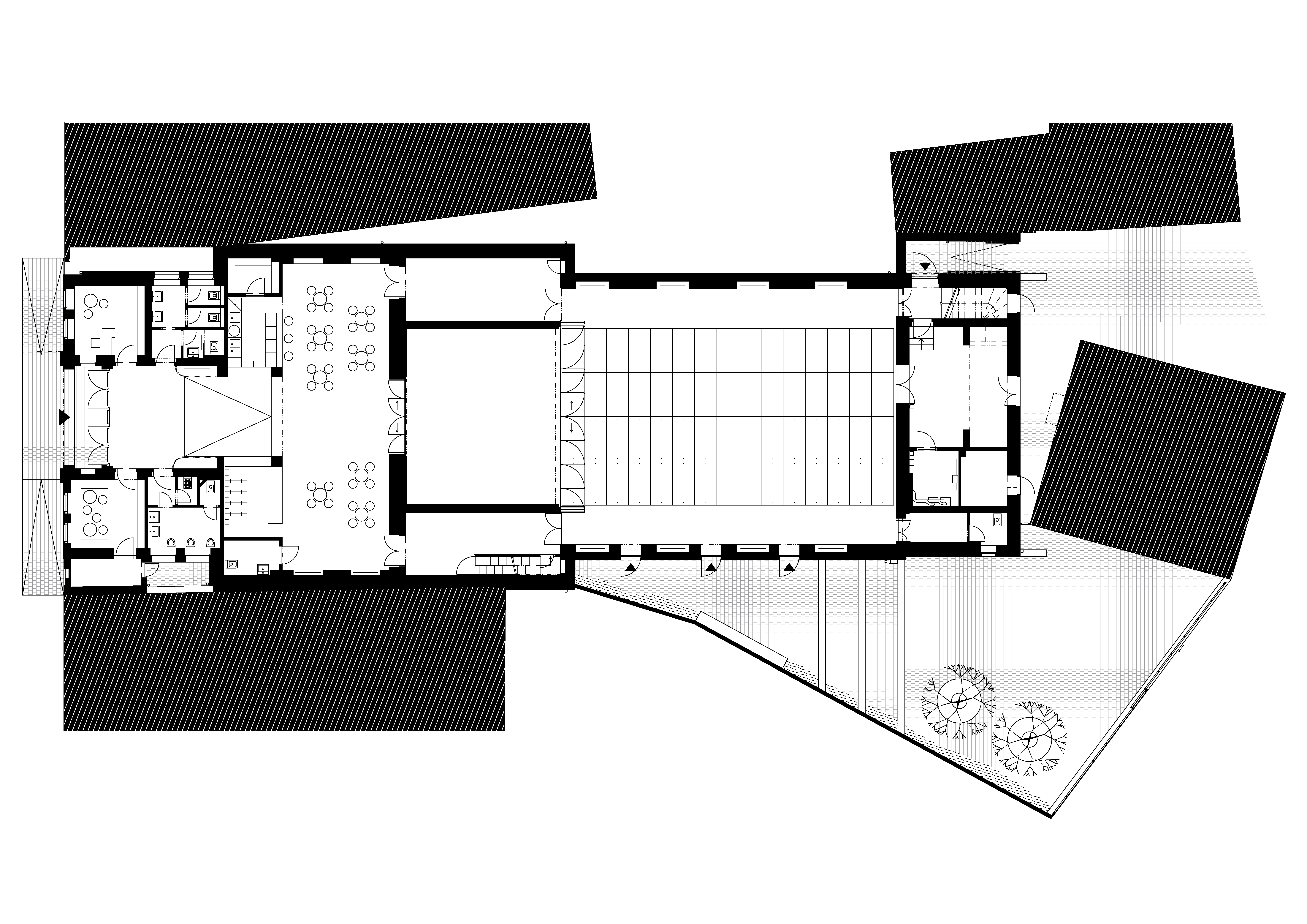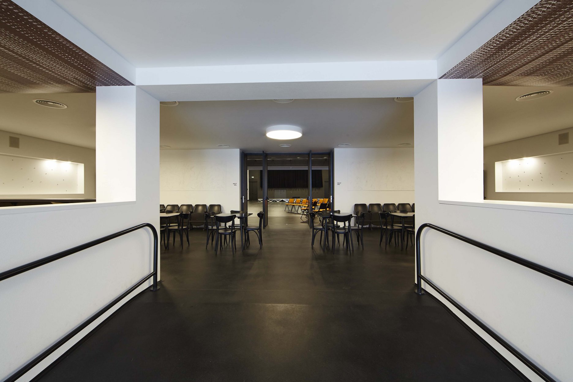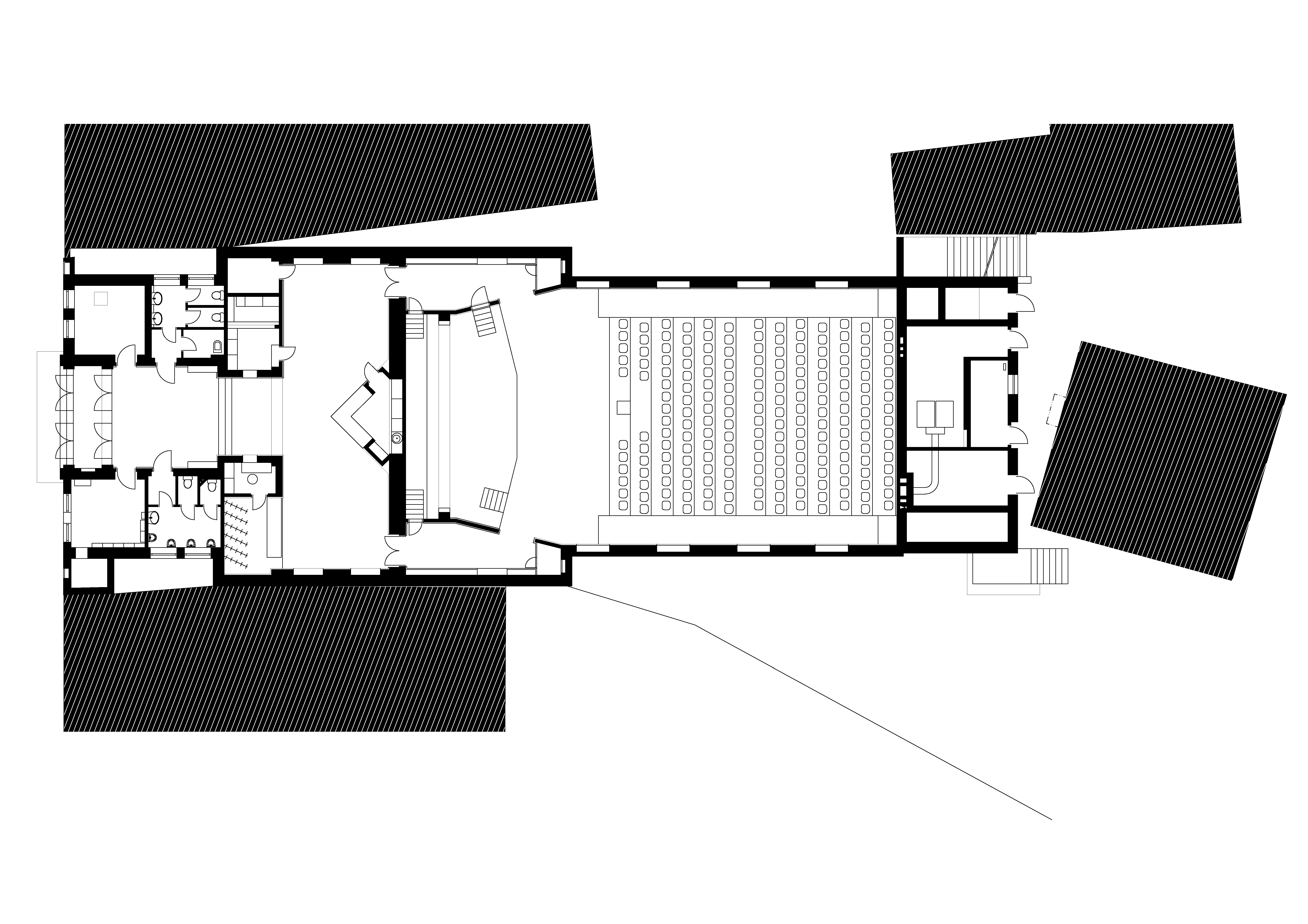 Nové dispozičné riešenie reaguje na aktuálne požiadavky mesta - objekt funguje ako sústava samostatných, na sebe nezávislých, avšak prepojiteľných prevádzok. Zároveň sa snaží zachovať výraznú osovosť charakterizujúcu celú budovu. Pôvodnú kinosála s fixnou eleváciou nahradila zlúčená veľká a malá sála s podlahou v jednej výškovej úrovni. Pôvodná záhrada pri zadnej časti budovy je novo riešená ako verejný dvor priliehajúci k hlavnej sále. Na vstupné priestory, ktoré sú po rekonštrukcii bezbariérovo prístupné nadväzuje foyer, v ktorom sa vedľa nutných servisných miestností nachádza kaviareň. S kaviarňou priamo susedí menšia sála, takzvaný Black box. Priestor je možné vyčleniť bez ohľadu na dianie v okolitých miestnostiach. Môže však ponúknuť aj prepojenie s kaviarňou alebo hlavnou sálou. Veľkosťou, technológiami aj prevádzkovou väzbou na servisné krídlo skladov a šatní pre účinkujúcich sa veľká sála stáva centrom kultúrneho života. Zaujímavým technickým riešením sú “zdvíhateľné” polia podlahy (praktikáble), ktoré zväčšujú flexibilitu využitia priestoru. Technický balkónom s “live” postom pre zvukárov aj osvetľovača a vymedzený priestor pre premietaciu techniku zodpovedá moderným štandardom..