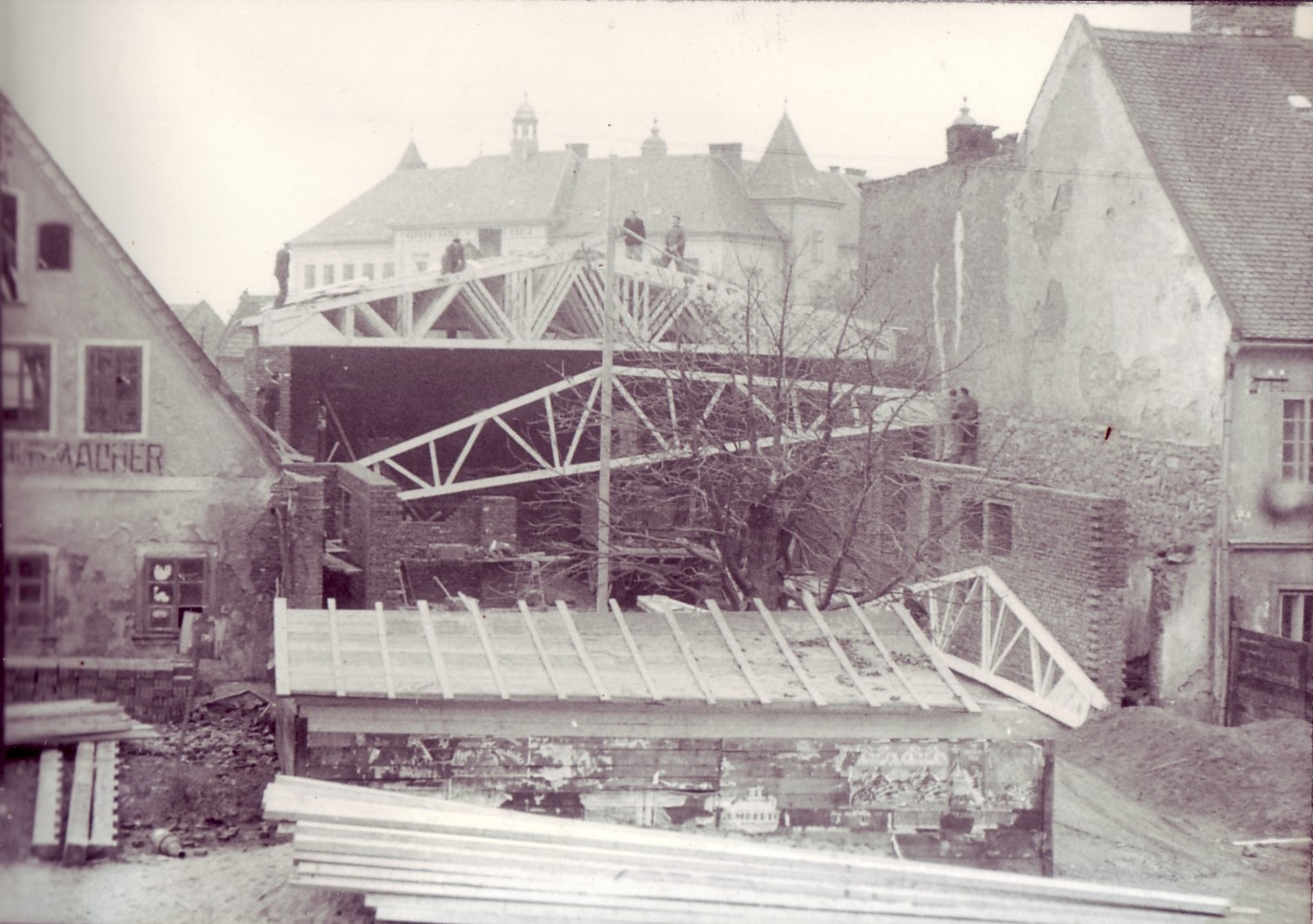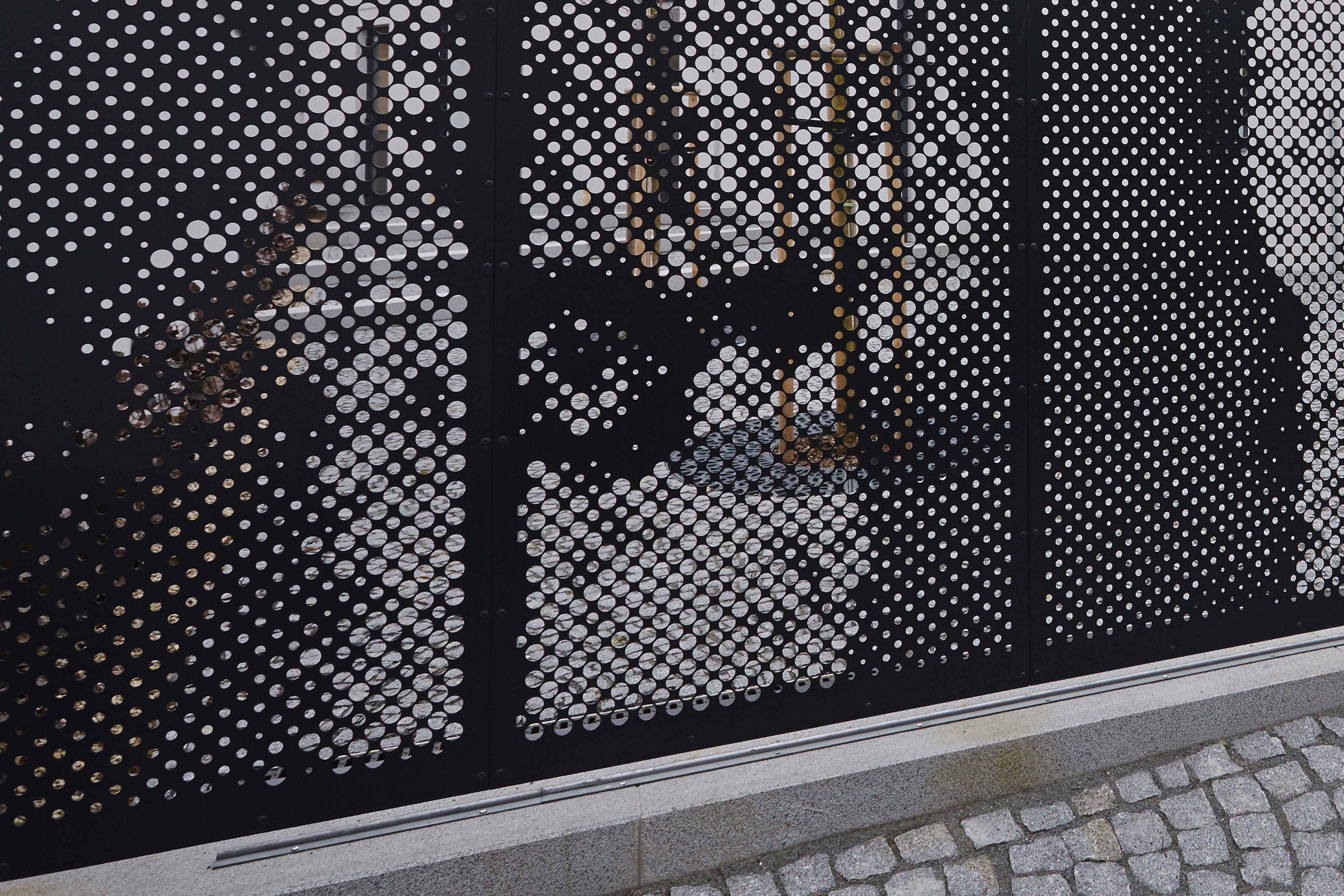 Odkaz na špecifickú dobovú realizáciu budovy, v rámci ktorej ruku k dielu priložili miestni obyvatelia, pripomína motív na bráne oplotenia. Prostredníctvom perforácie je na plech prenesená fotografia zo stavby kina z roku 1958.