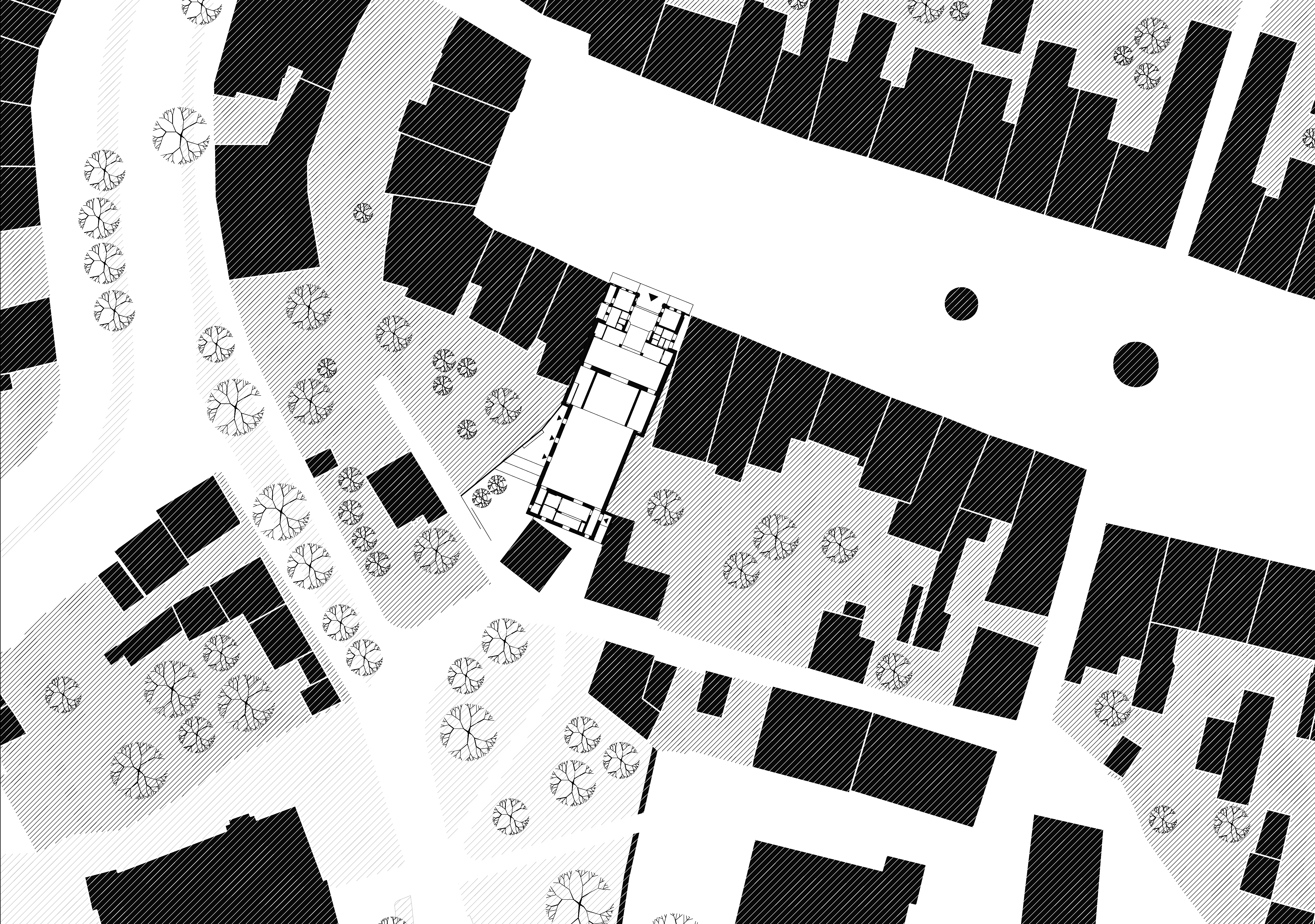 Hlavný bezbariérový vstup je orientovaný do námestia Slobody. Miestnosti za severnou fasádou interagujú s verejným priestorom námestia. Stávajú sa "výkladnou skriňou" programovej náplne objektu, čomu je podriadená ich náplň - predajňa lístkov a salónik kaviarne. Južný "chrbát" budovy je clonený vyčnievajúcou fasádou susednej cukrárne. Výškový rozdiel sály a terénu vyrovnáva terasa so širokým vyrovnávacím schodiskom, ktoré vytvára pomyselný amfiteáter.