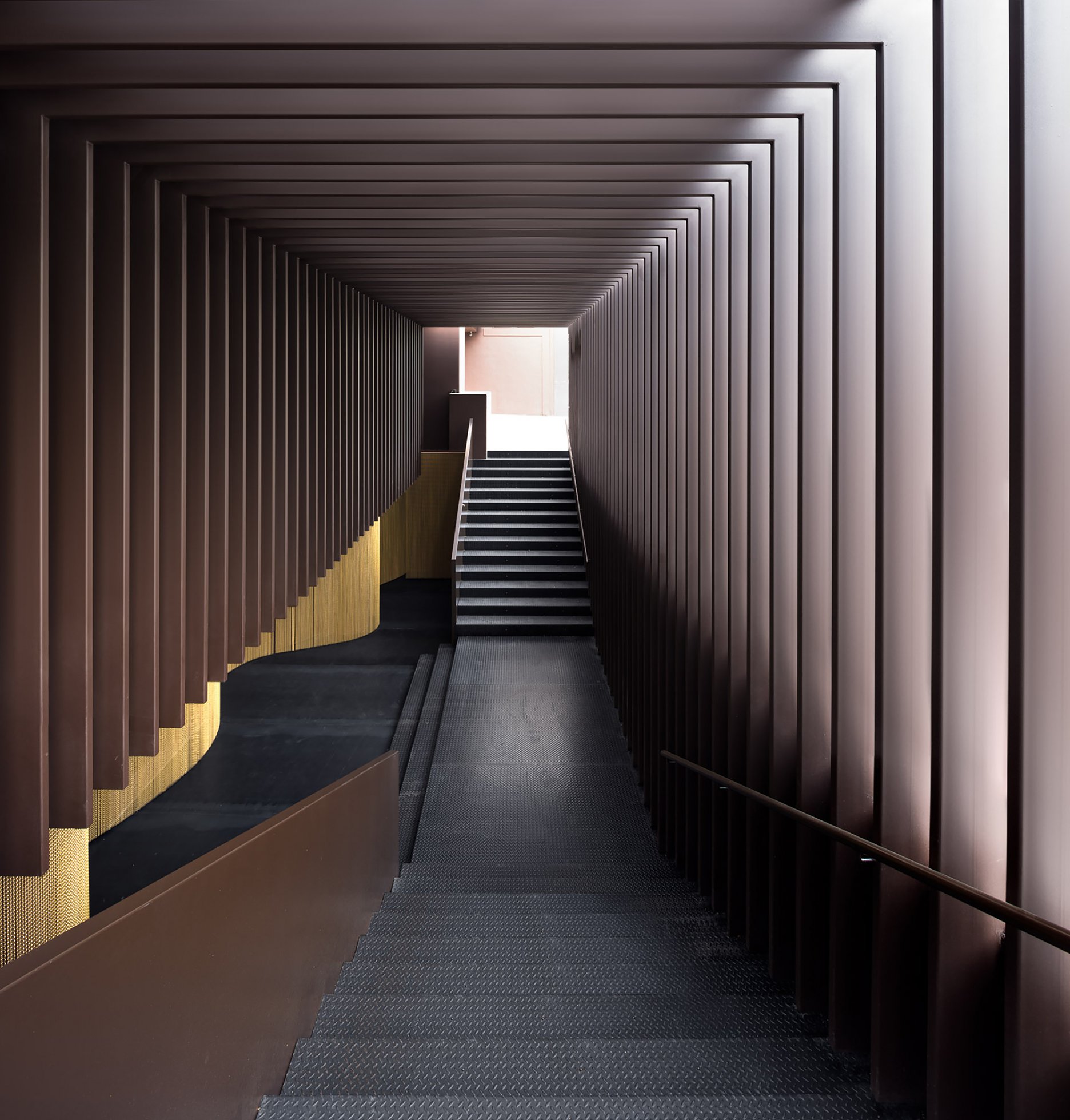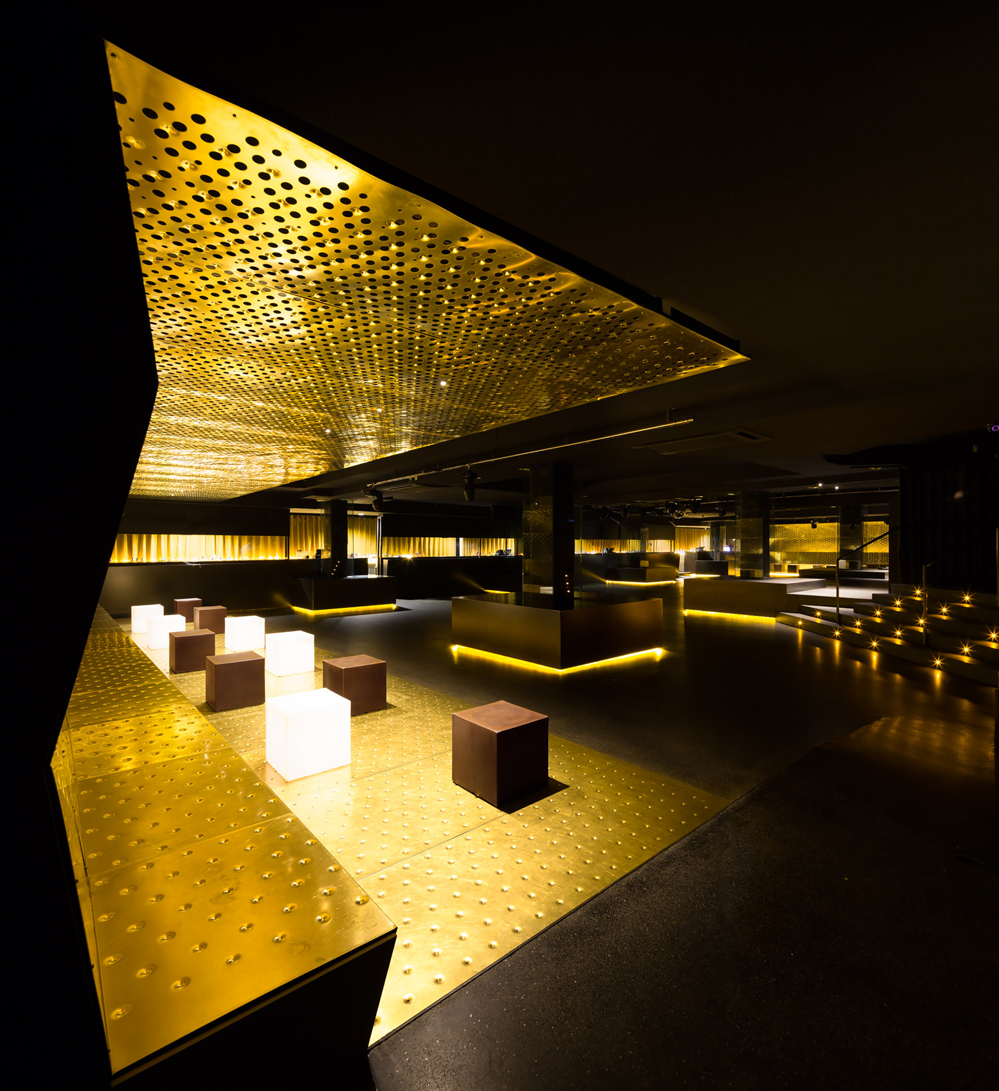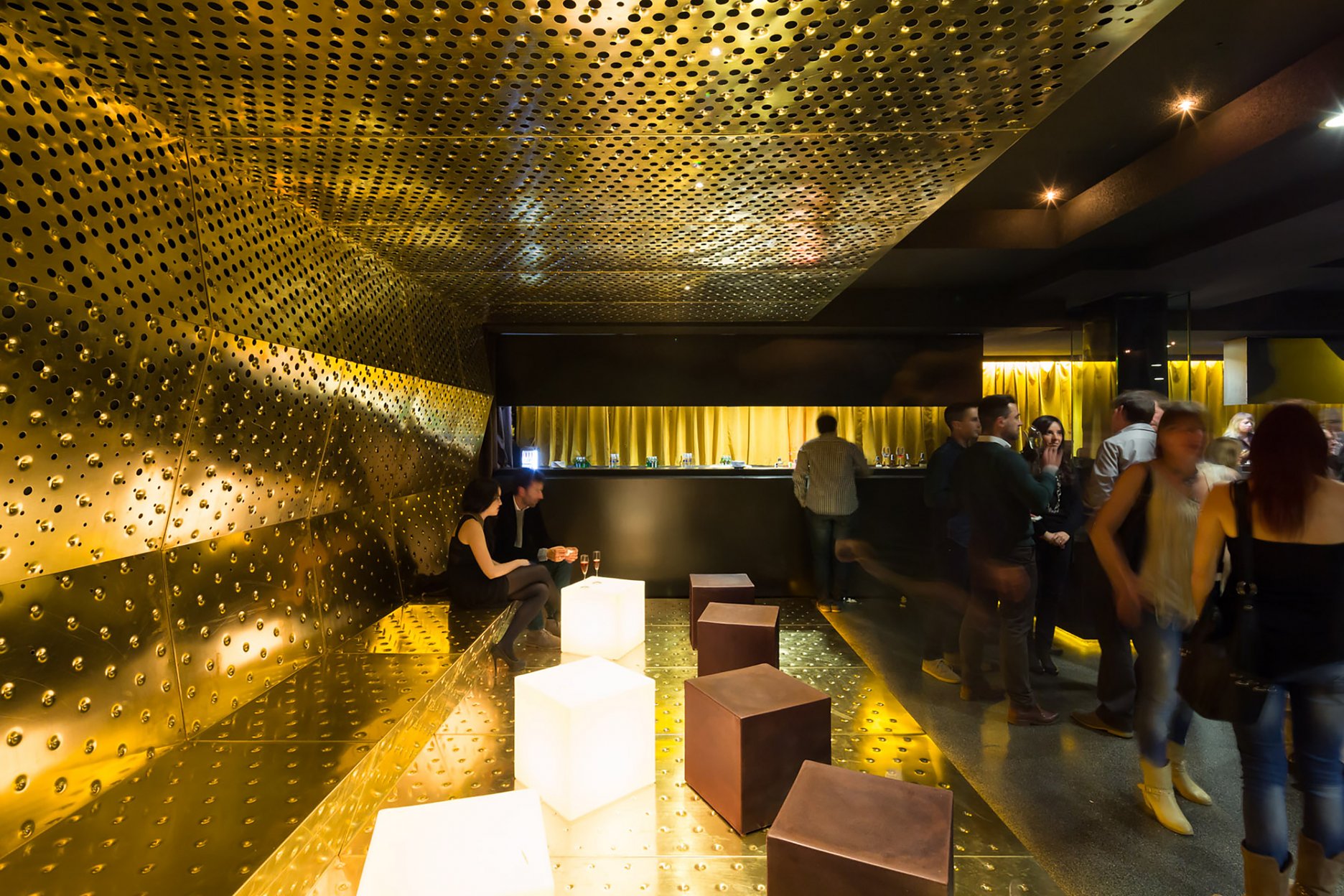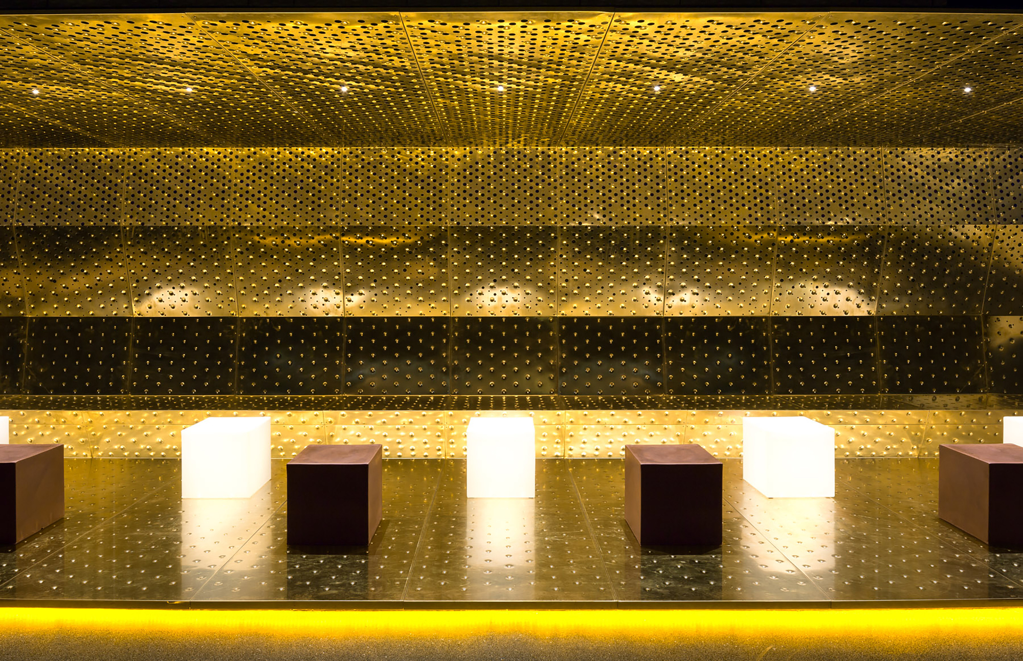 Mosadzné platne, ktoré sú uchytené na nosnú oceľovú podkonštrukciu umožnili architektom materiálovo zjednotiť steny, strop aj podlahu. Perforovaný povrch na stenách a strope bol zvolený pre svoju schopnosť akustickej absorpcie a redukcie rezonancie. Hudba vo vzdialenejších častiach baru, kde bola použitá mosadz je tichšia. Nachádza sa tu kľudová zóna a posedenie.
