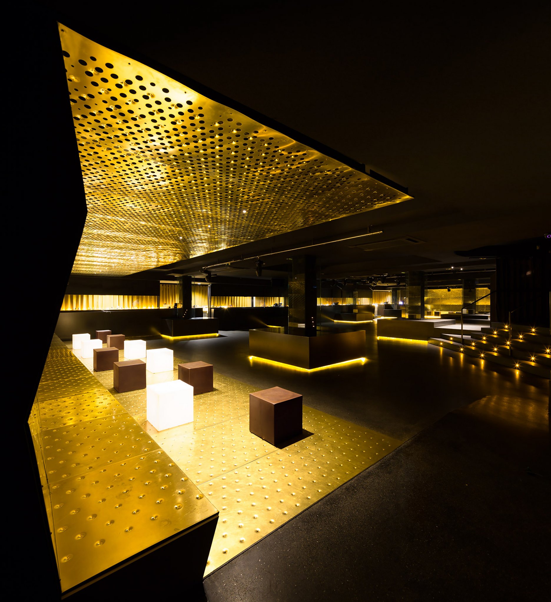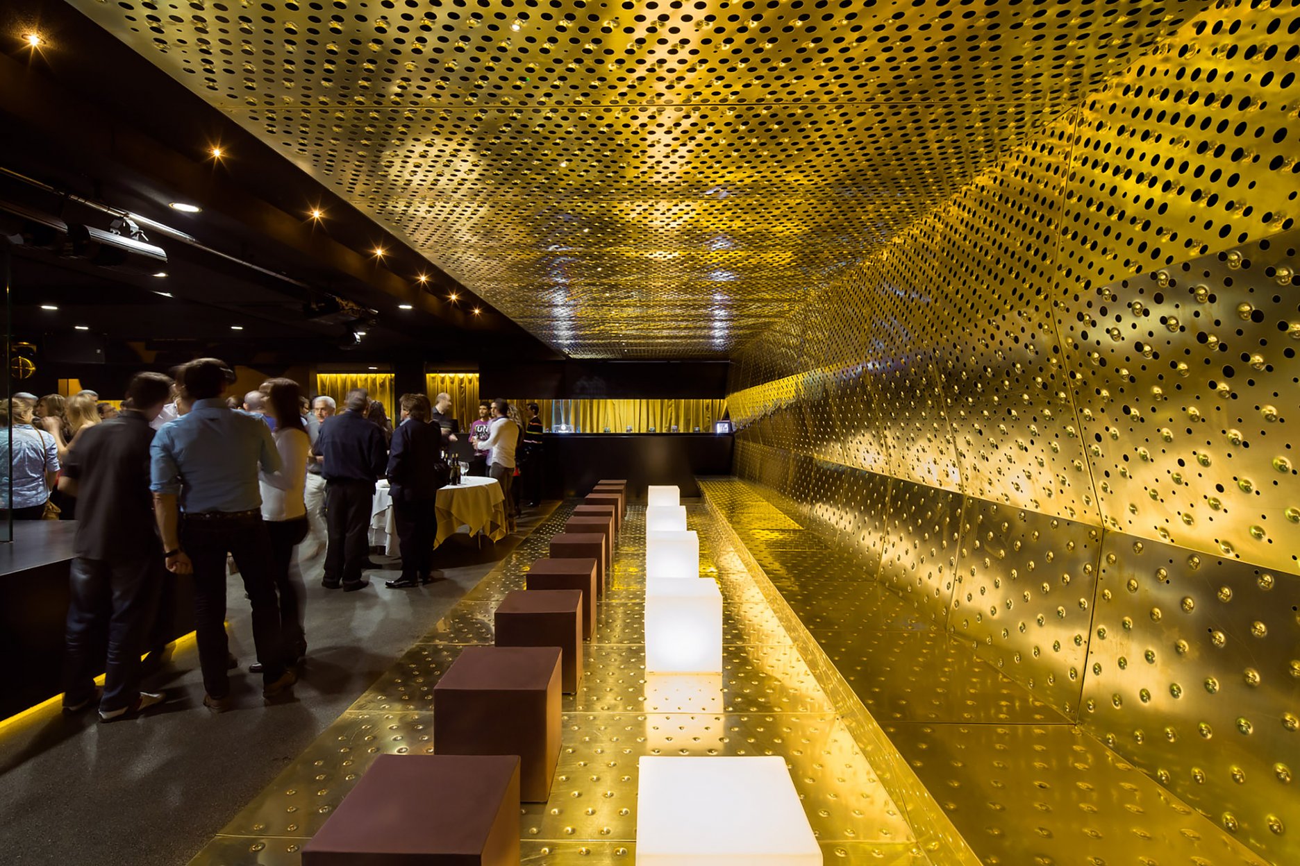 Pri komplexnej rekonštrukcii nočného klubu v centre španielskej Pamplony bola v interiéri ako akcent použitá leštená mosadz. Leitmotívom projektu sú odrazy zábleskov farebných svetiel vo vnútri tmavého boxu. Výsledný interiér tak decentne odhaľuje španielsky temperament.
