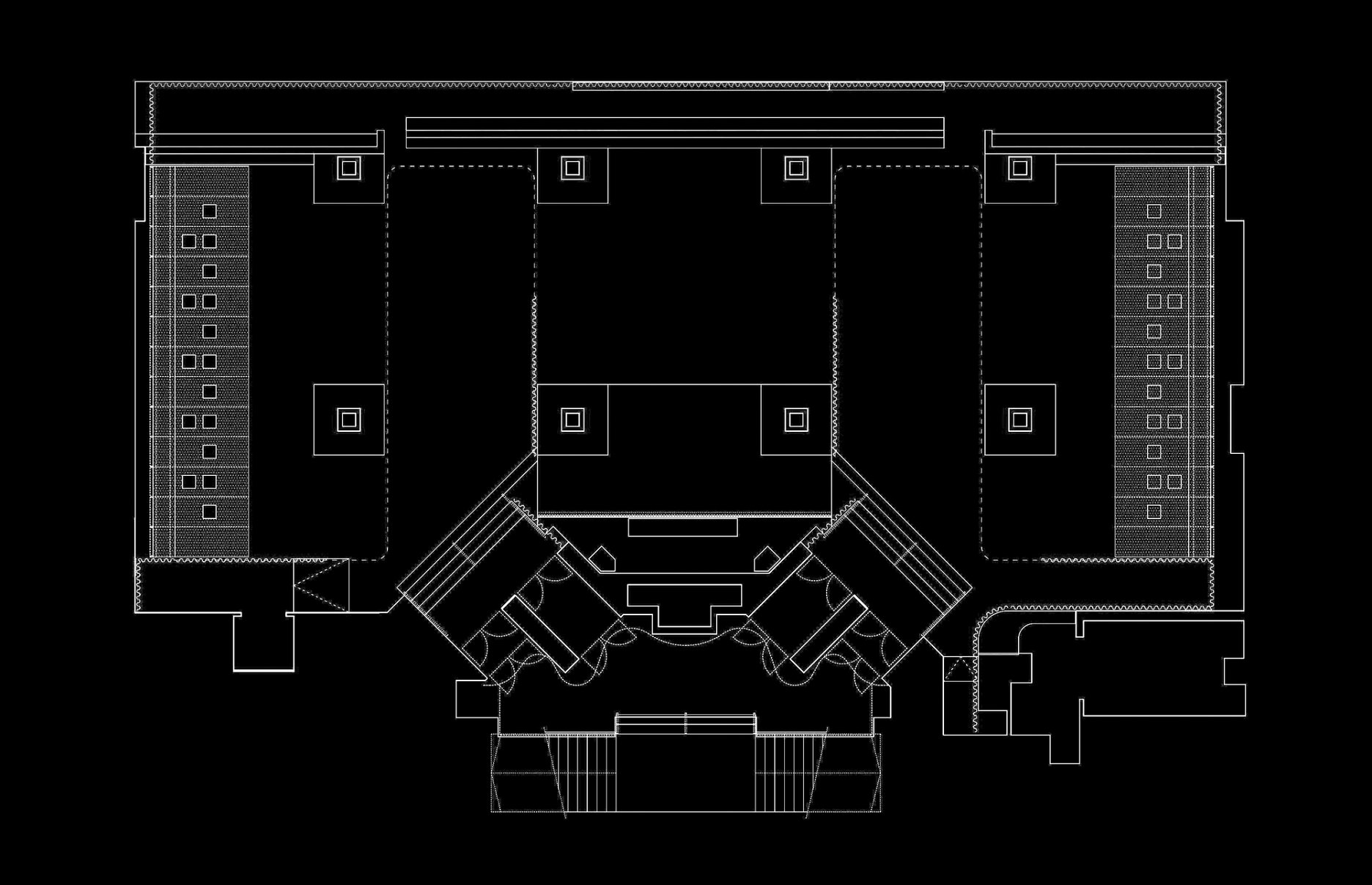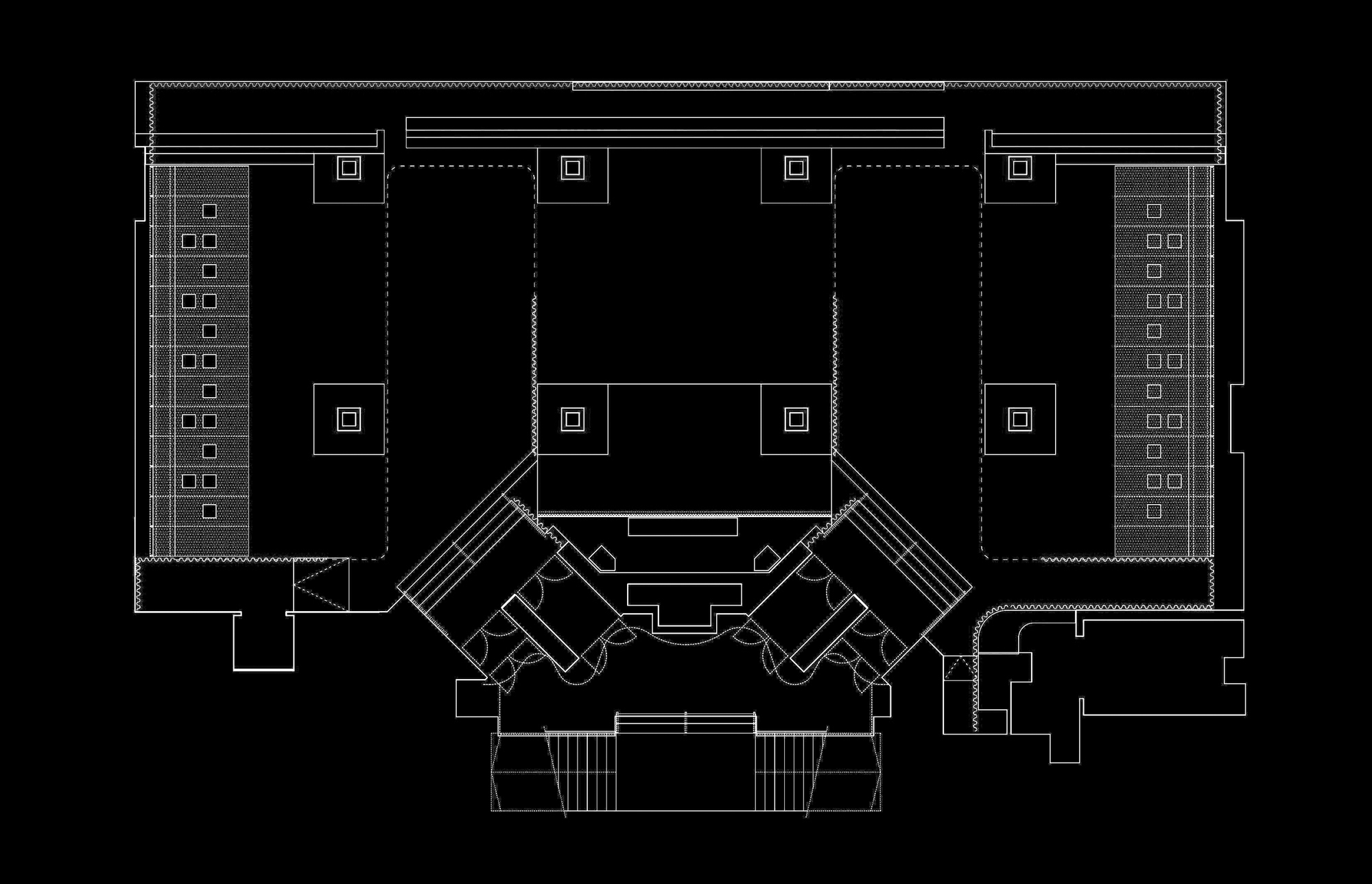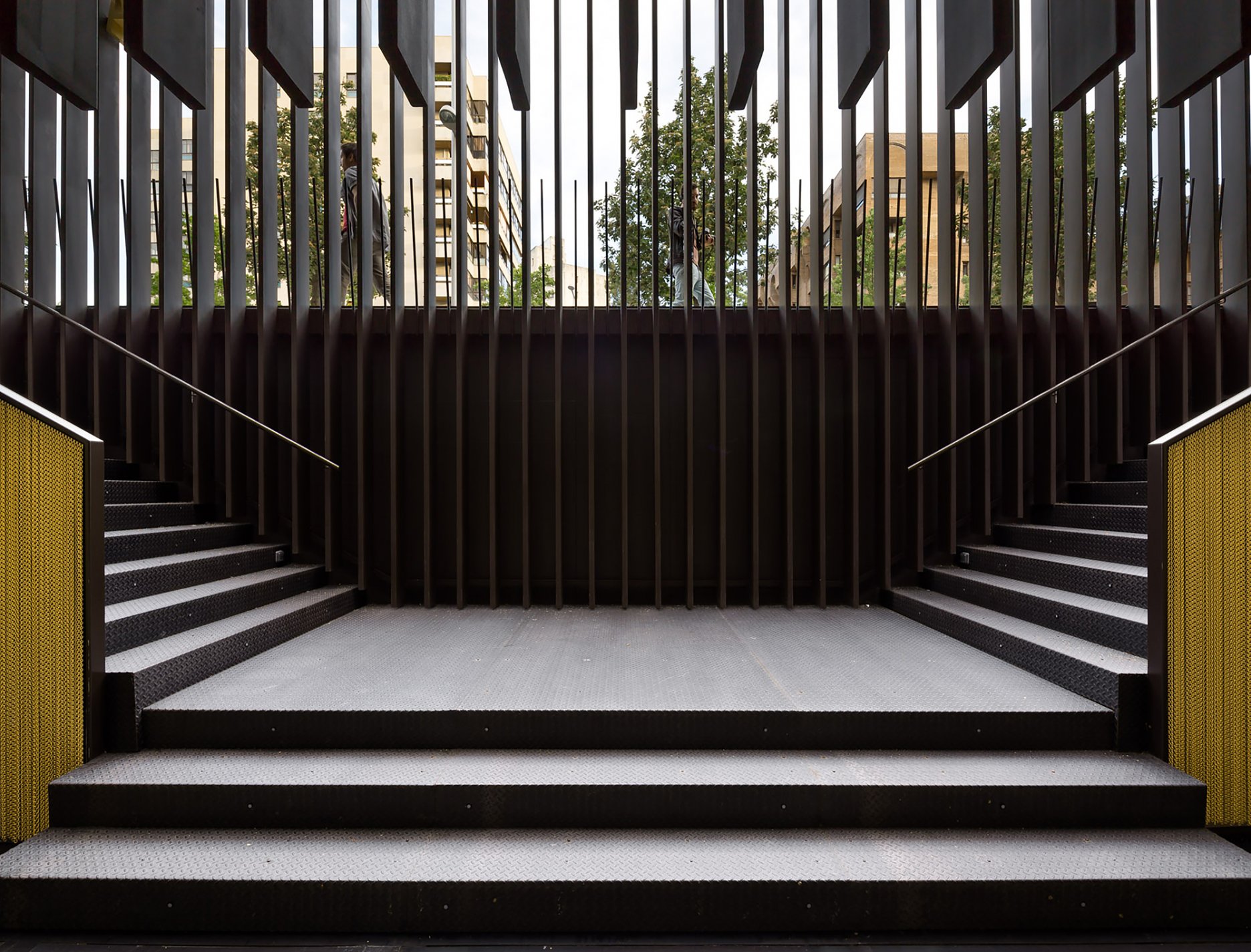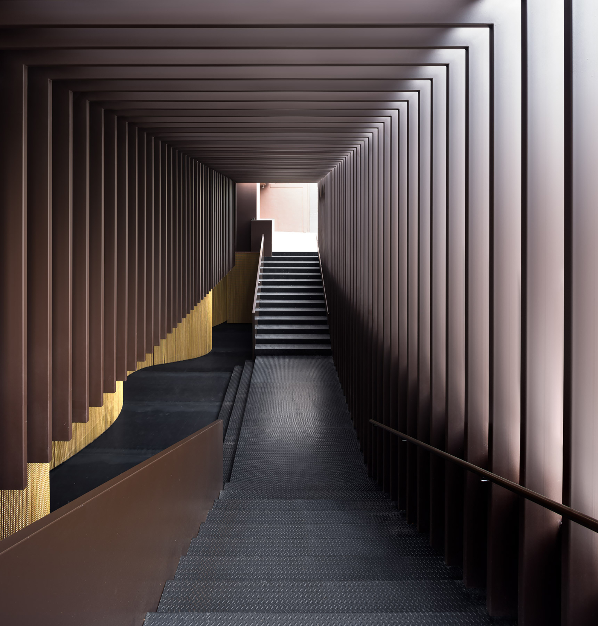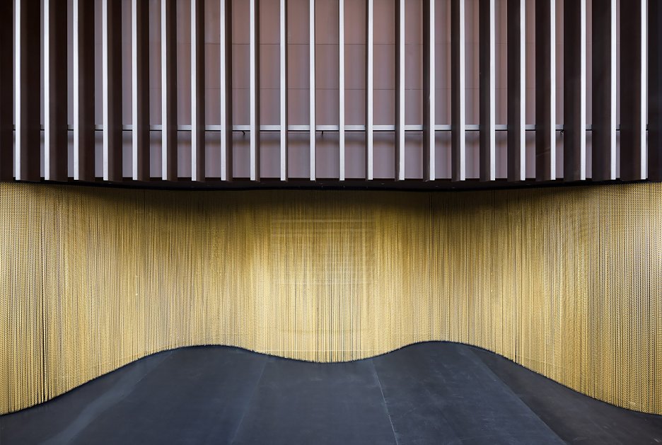 Počas dňa „Zlatá“ farba dominuje aj vstupnej hale. Organický tvar zásteny zloženej z vertikálnych mosadzných reťazí kontrastuje s geometrickým rastrom oceľovej konštrukcie. Tento prvok naznačuje čo sa ukrýva v navonok jednoduchom tmavom boxe.