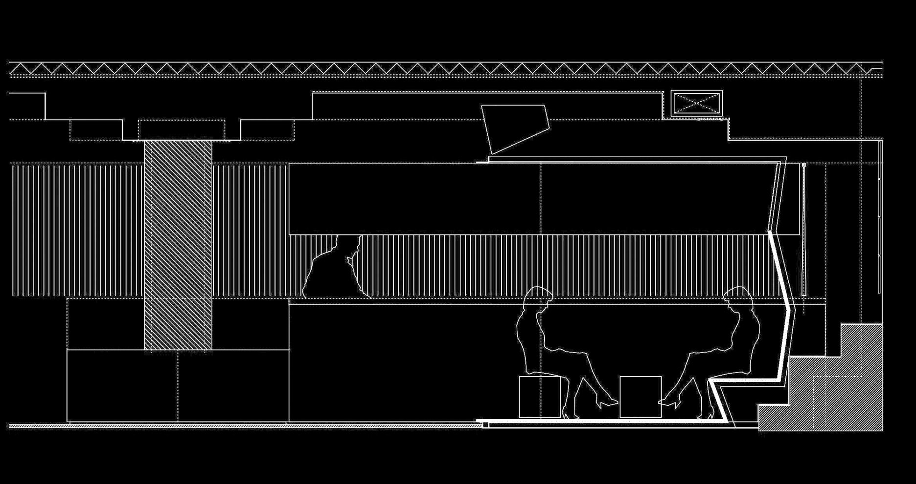 Betónový strop, kovové zariaďovacie prvky a jednoliata bezškárová asfaltová podlaha. Materialita je základným tvaroslovným prostriedkom tohto interiéru.