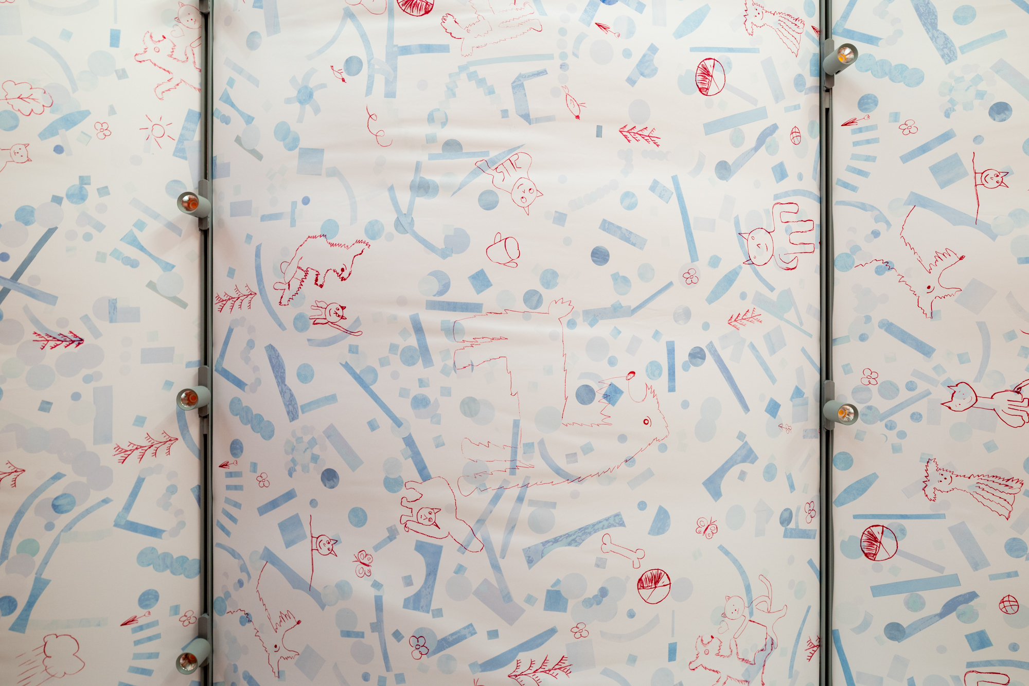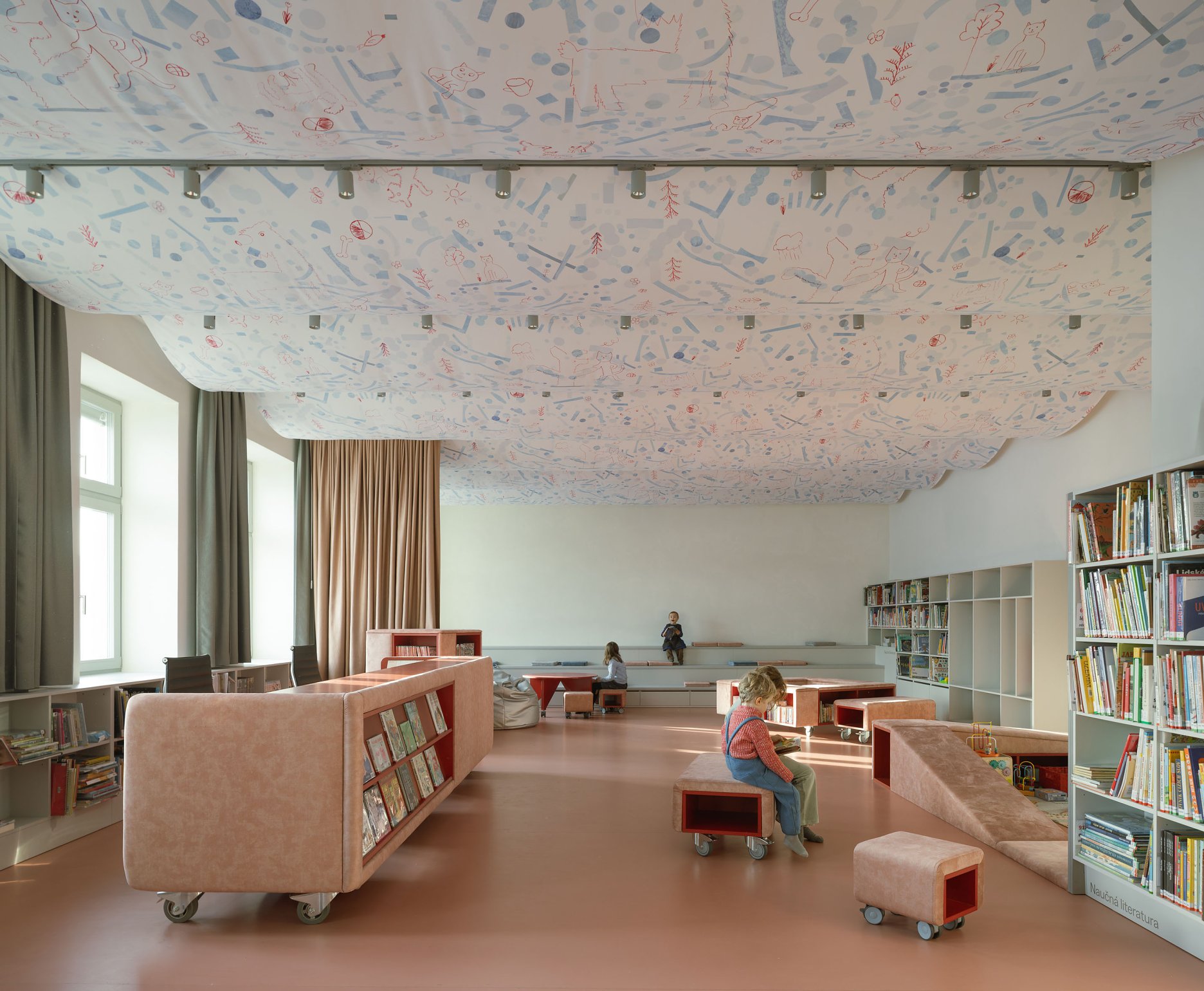 V prízemnom oddelení pre dospelých je nábytok usporiadaný do pravidelných radov, zatiaľ čo v detskom oddelení na poschodí majú regály hravejšie tvary a rôzne výšky, prispôsobené jednotlivým vekovým skupinám. Strop detského oddelenia dopĺňa textilný baldachýn od výtvarníčky Lindy Retterovej, ktorý vznikol v rámci workshopu s miestnymi deťmi. Baldachýn zlepšuje akustické vlastnosti priestoru a prepúšťa mäkko rozptýlené svetlo.