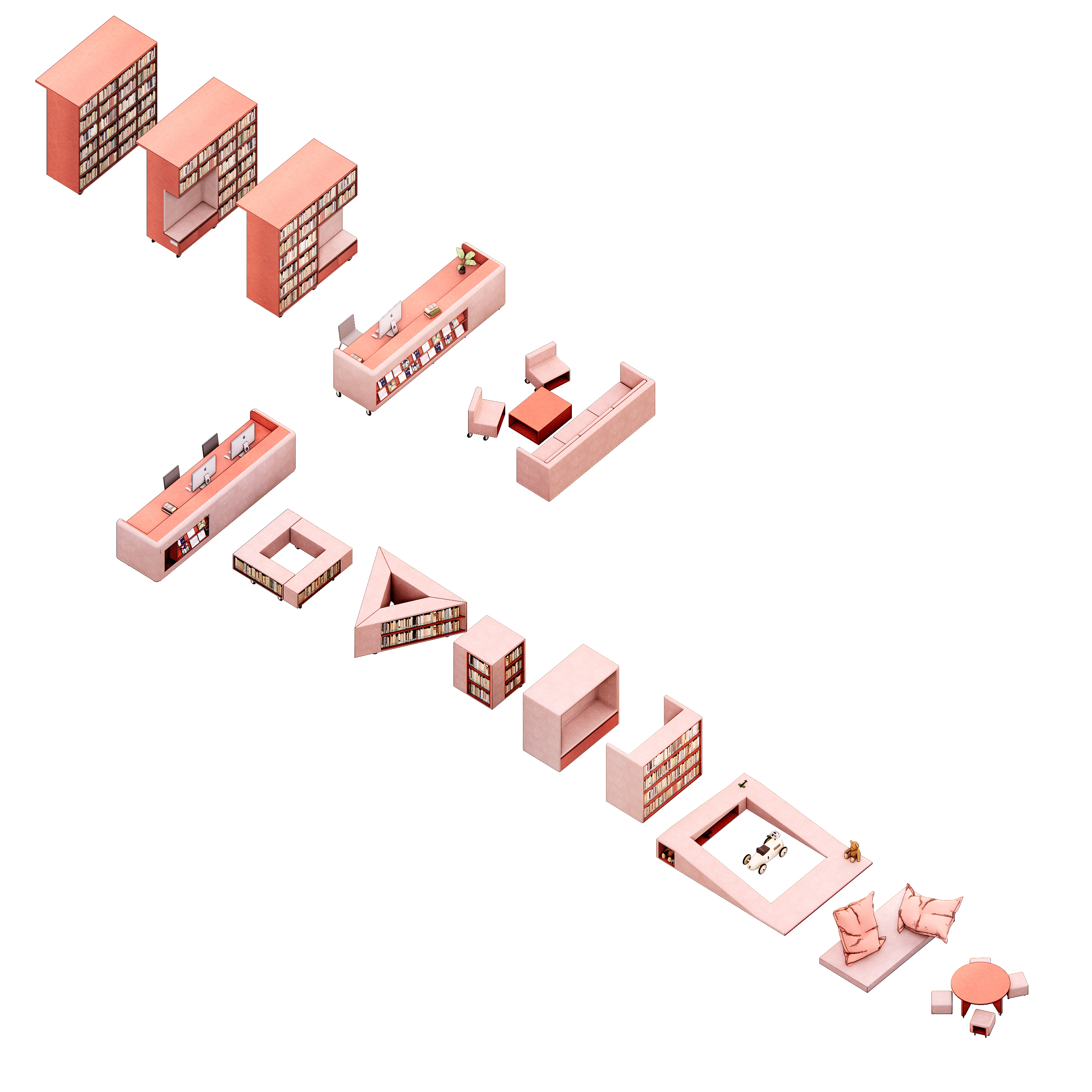 Súčasťou návrhu je aj komplexná koncepcia nábytku. Pozdĺž stien je situovaný vstavaný utilitárny mobiliár v neutrálnej sivej farbe. Stred miestností patrí výraznému červenému nábytku. Ten je mobilný a multifunkčný. Okrem úložných priestorov vytvára miesta na sedenie a integruje prvky osvetlenia. Vďaka kolieskam sa dá ľahko presúvať k stenám, čím sa uvoľní priestor na verejné podujatia.