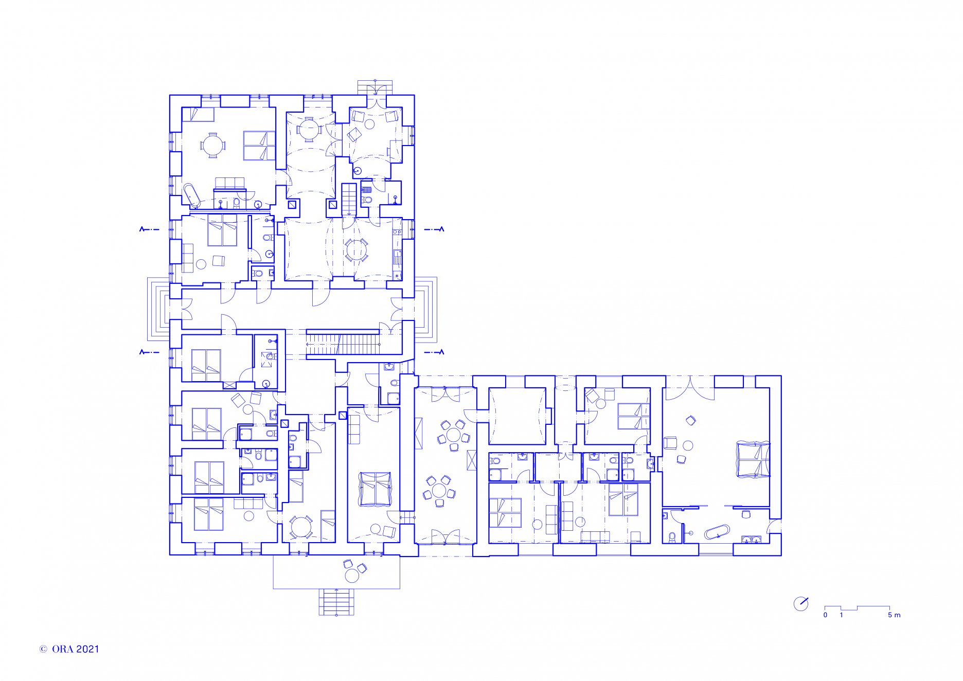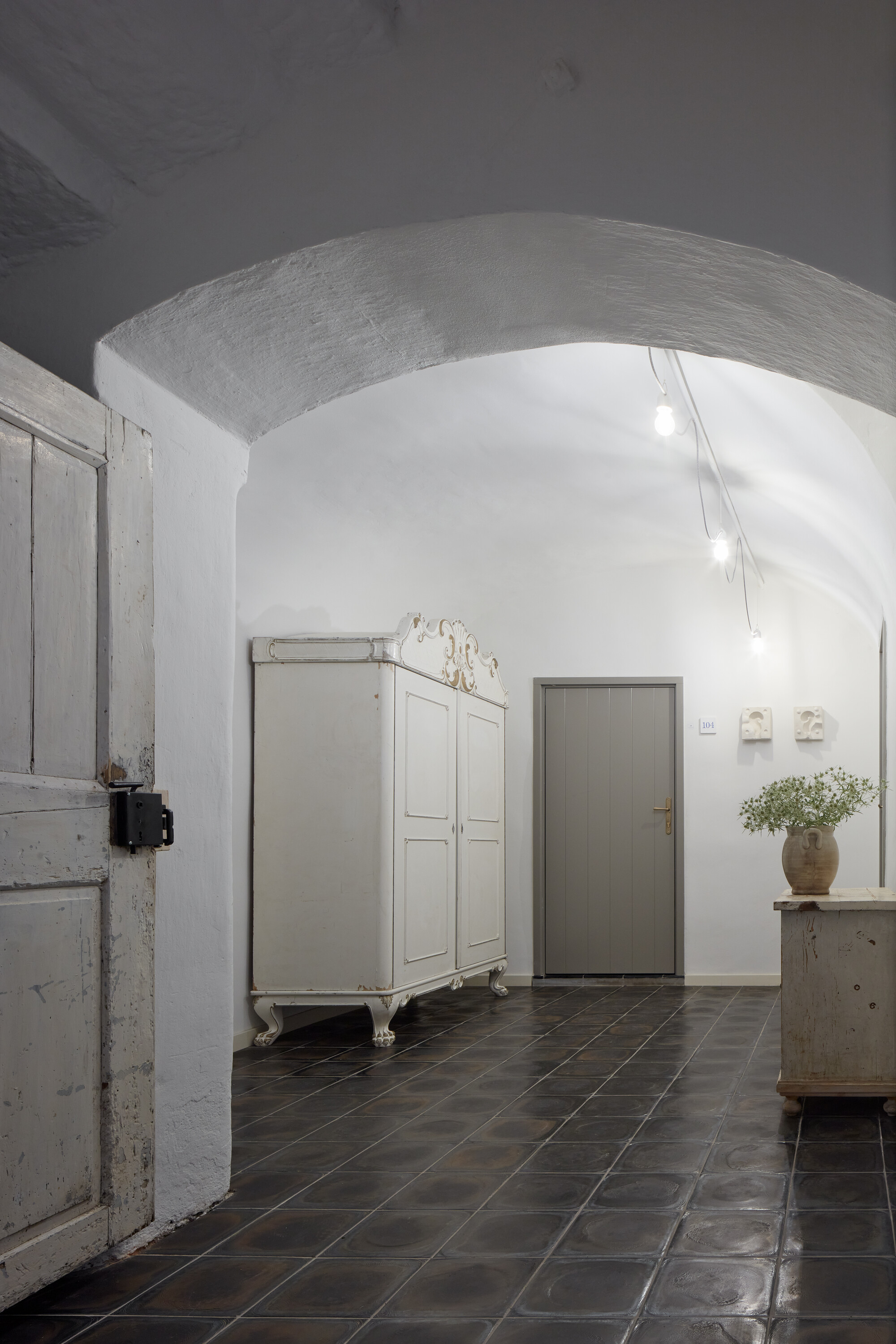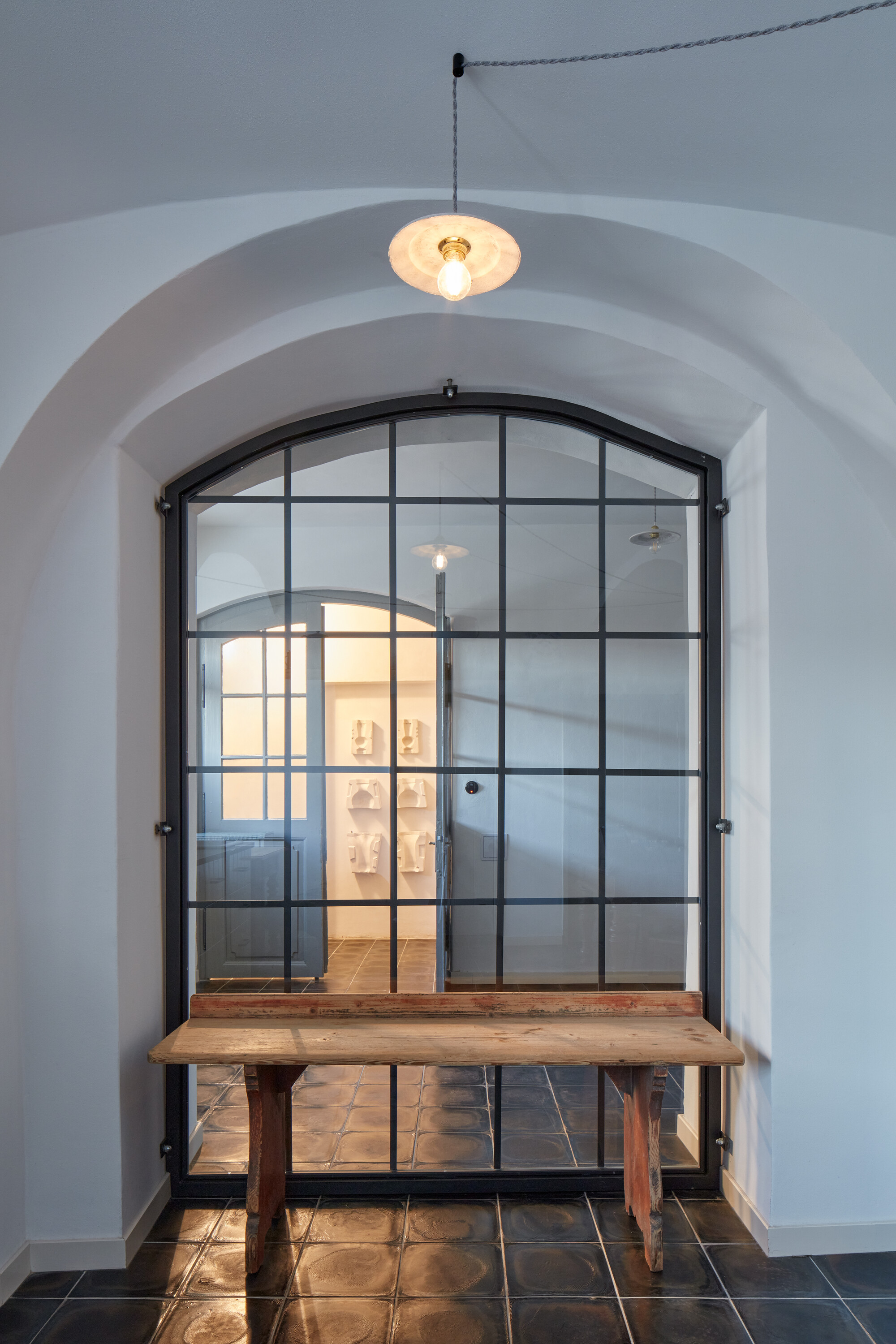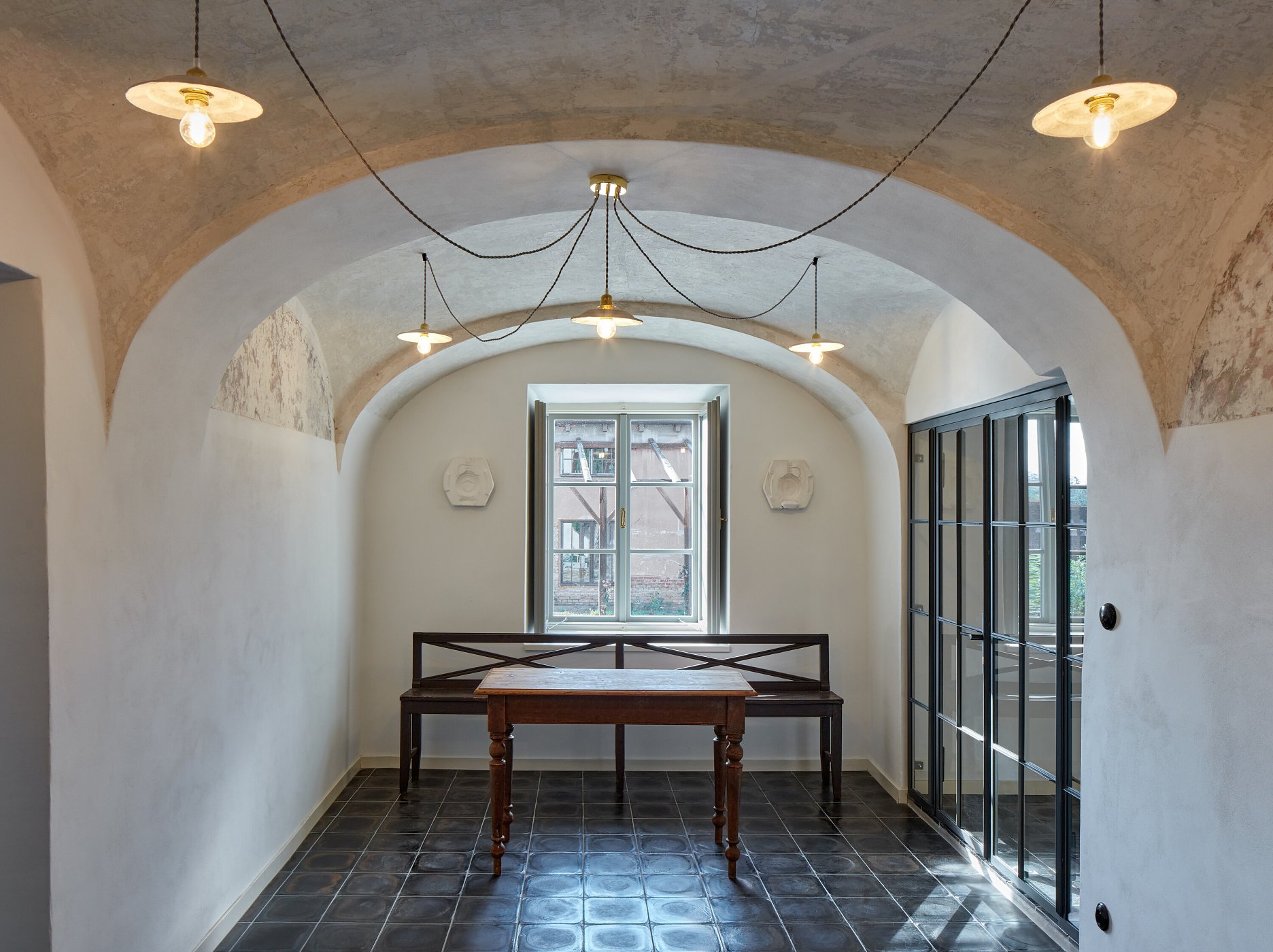“Interiér je záměrně spartánský, nechybí mu ale přívětivost,” vysvetľujú architekti z ateliéru ORA, ktorí dbajú na zachovanie autentických materiálov a detailov. Ako príklad môžu slúžiť dobové dvere, ktoré nahrádzajú nové jednoduché výplne len v prípade absencie originálu. Rovnakú logiku aplikovali pri rekonštrukcii podláh, kde možno vidieť dobové masívne drevené kazety, doplnené čadičovými a cementovými dlaždicami. V interiéri sa odhaľujú fragmenty pôvodnej výmaľby.