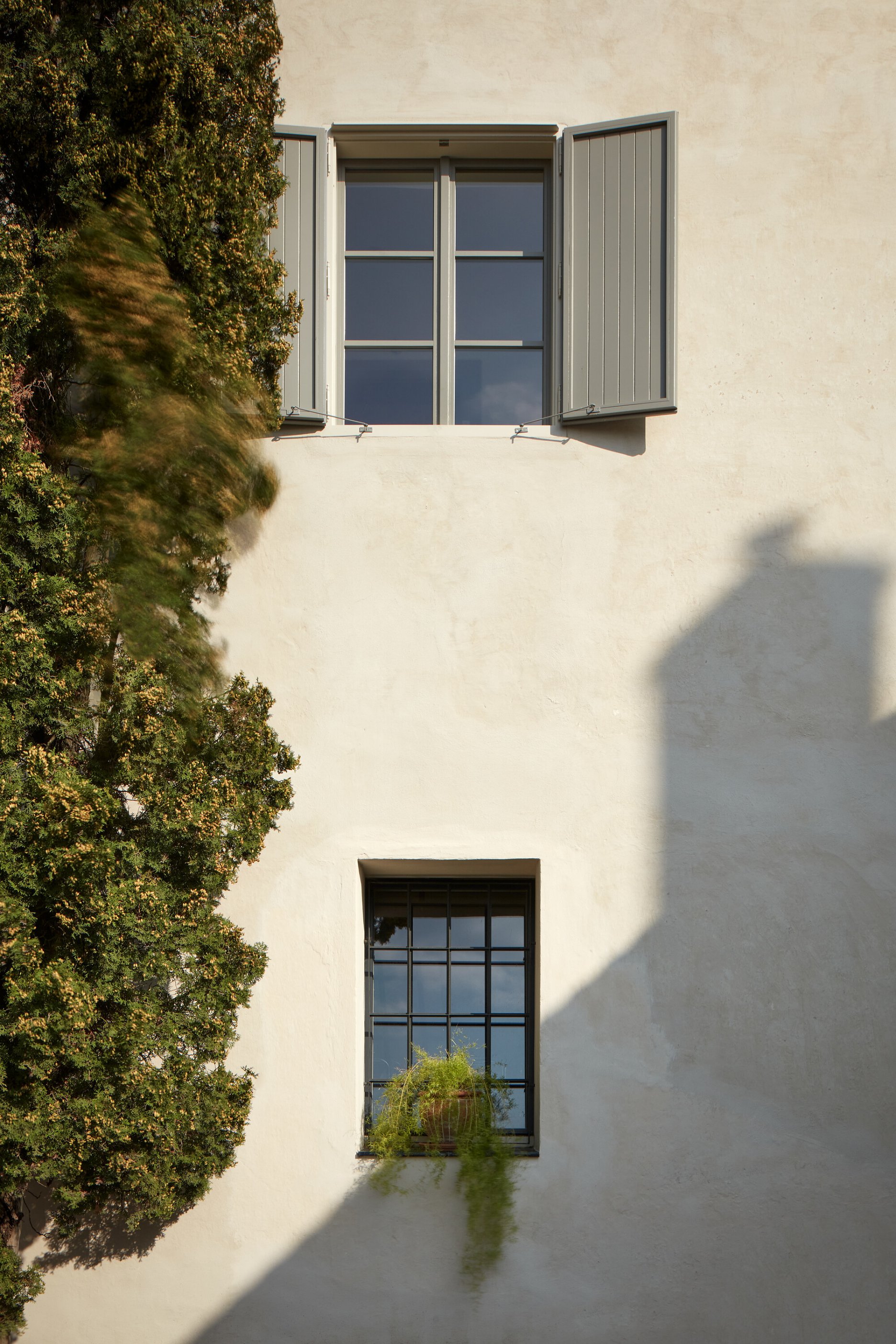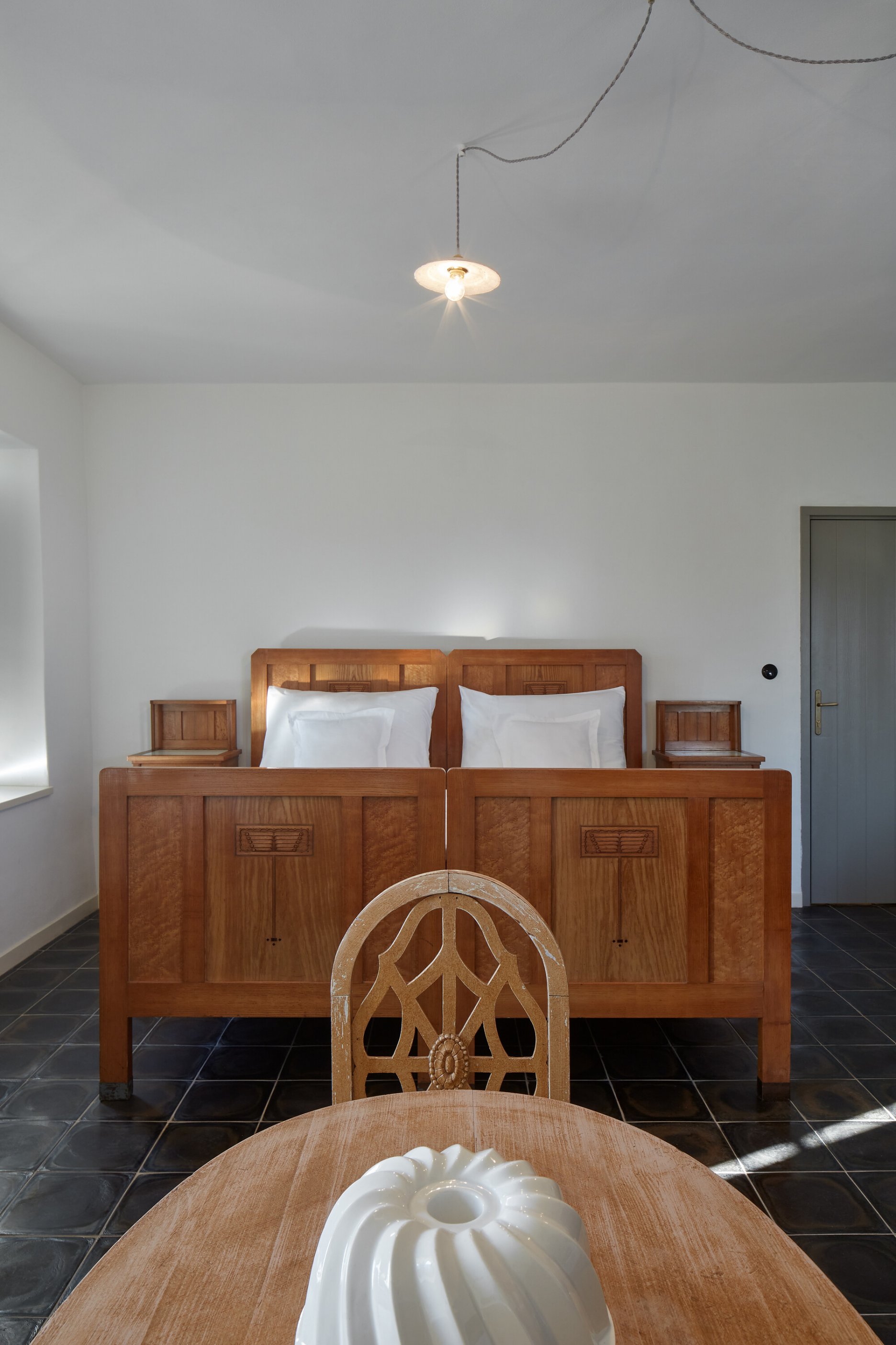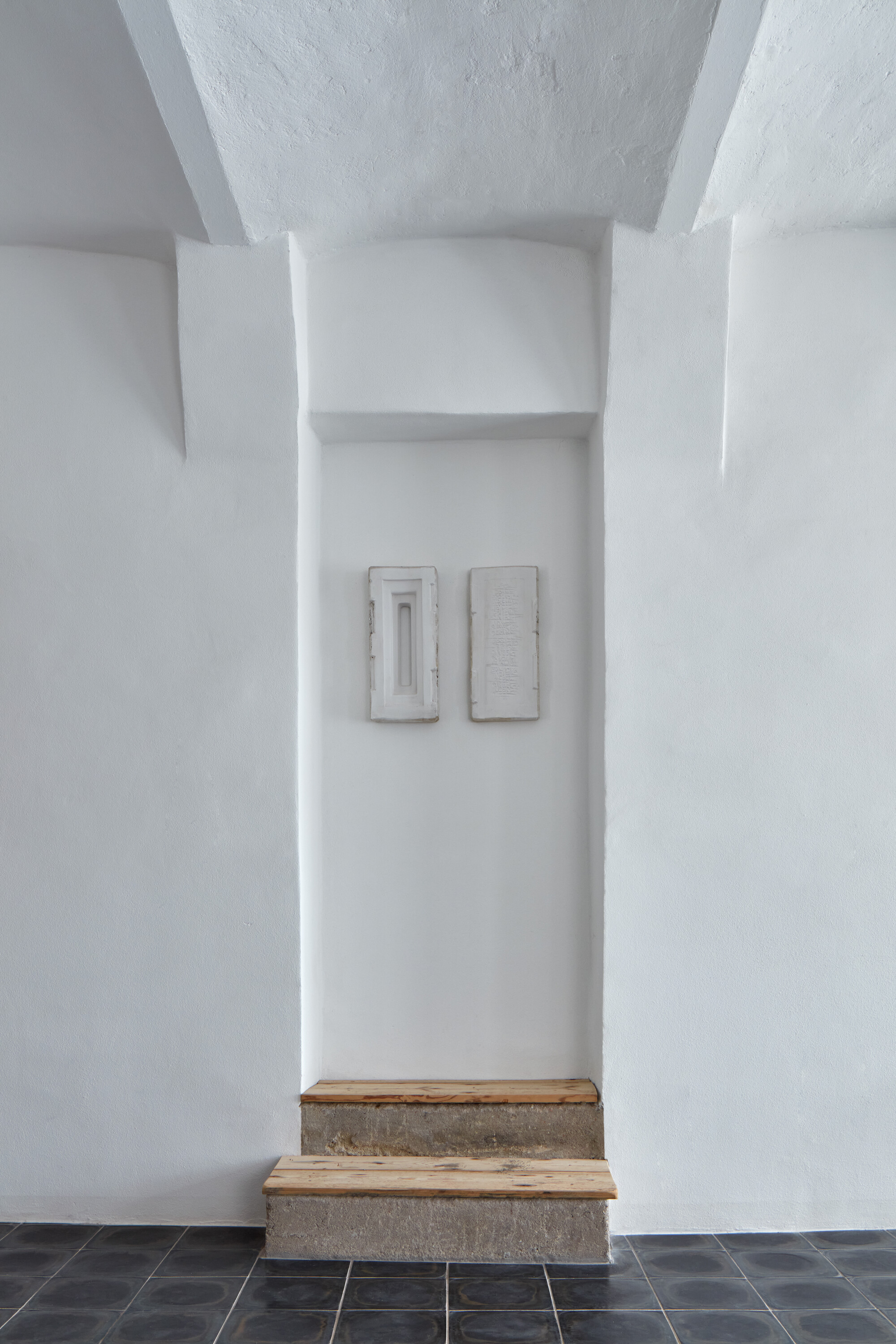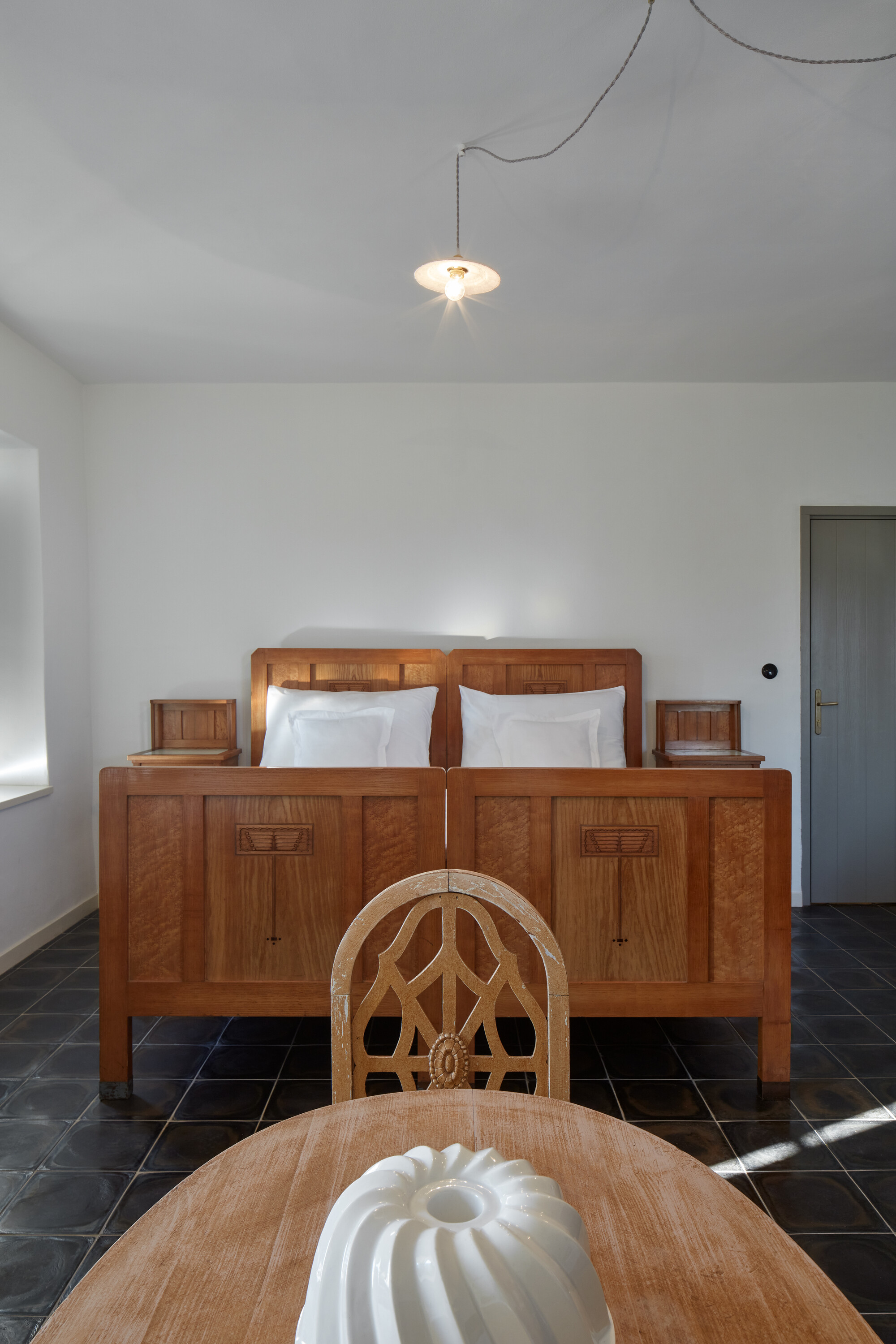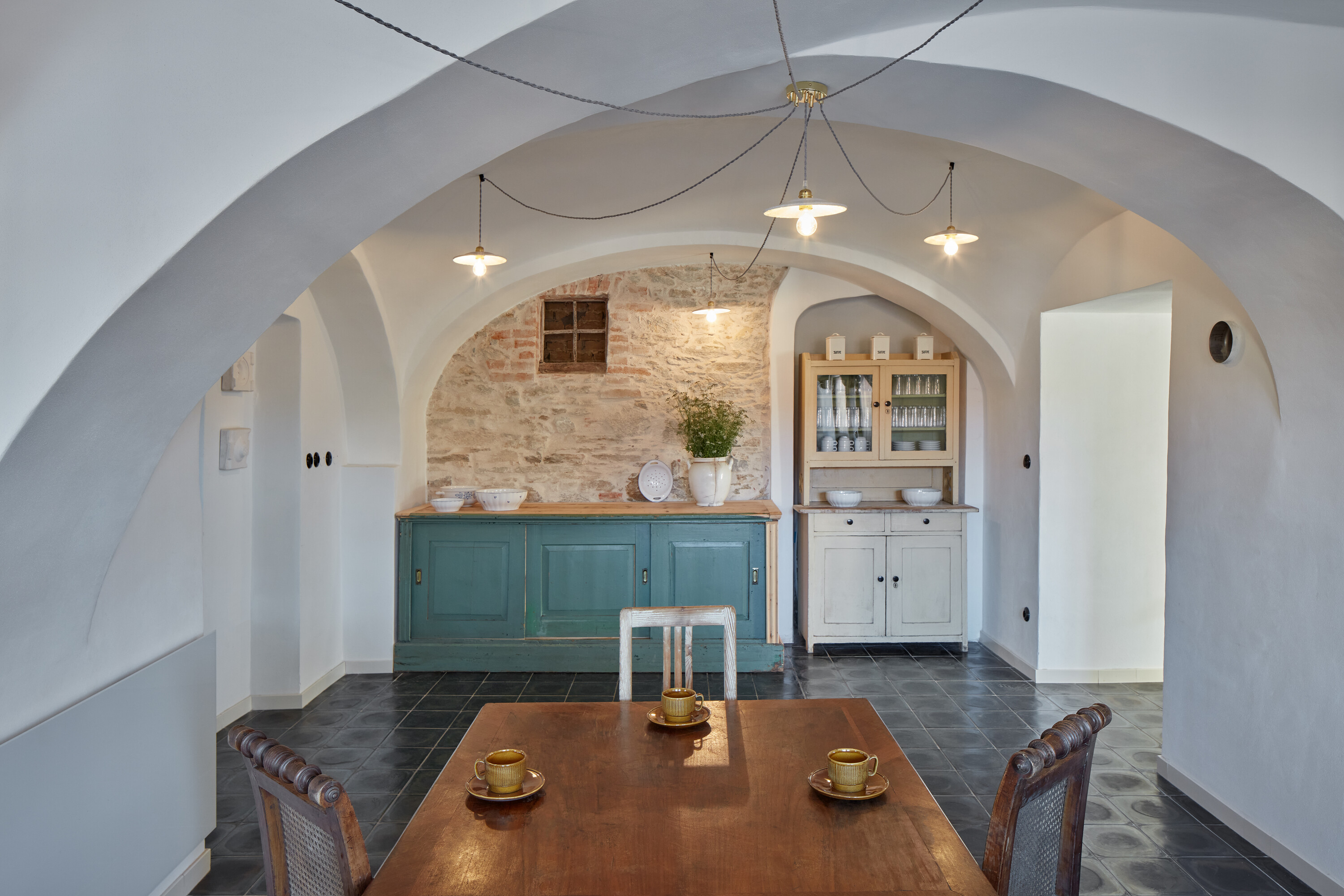 “Interiér je záměrně spartánský, nechybí mu ale přívětivost,” vysvetľujú architekti z ateliéru ORA, ktorí dbajú na zachovanie autentických materiálov a detailov. Ako príklad môžu slúžiť dobové dvere, ktoré nahrádzajú nové jednoduché výplne len v prípade absencie originálu. Rovnakú logiku aplikovali pri rekonštrukcii podláh, kde možno vidieť dobové masívne drevené kazety, doplnené čadičovými a cementovými dlaždicami. V interiéri sa odhaľujú fragmenty pôvodnej výmaľby.