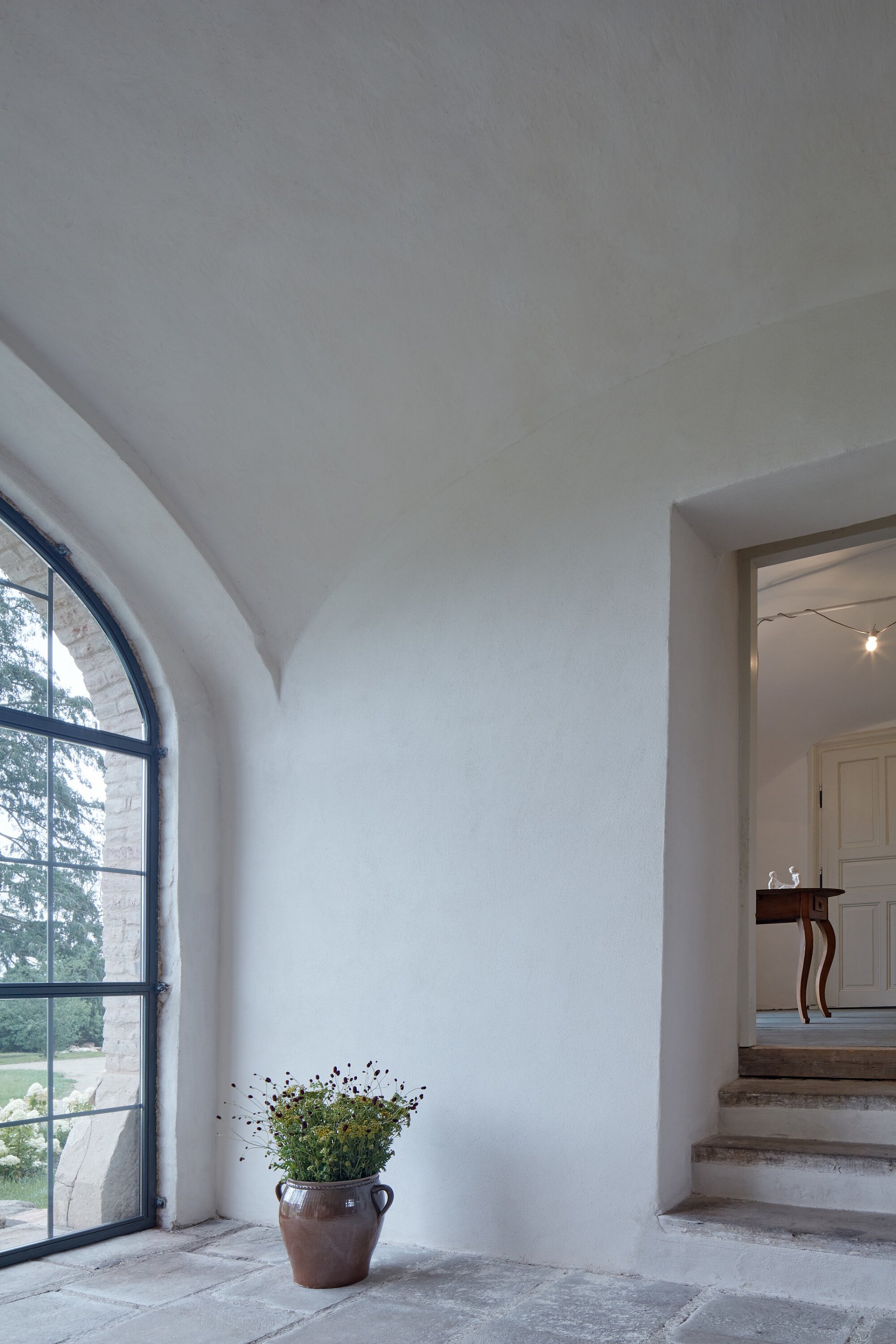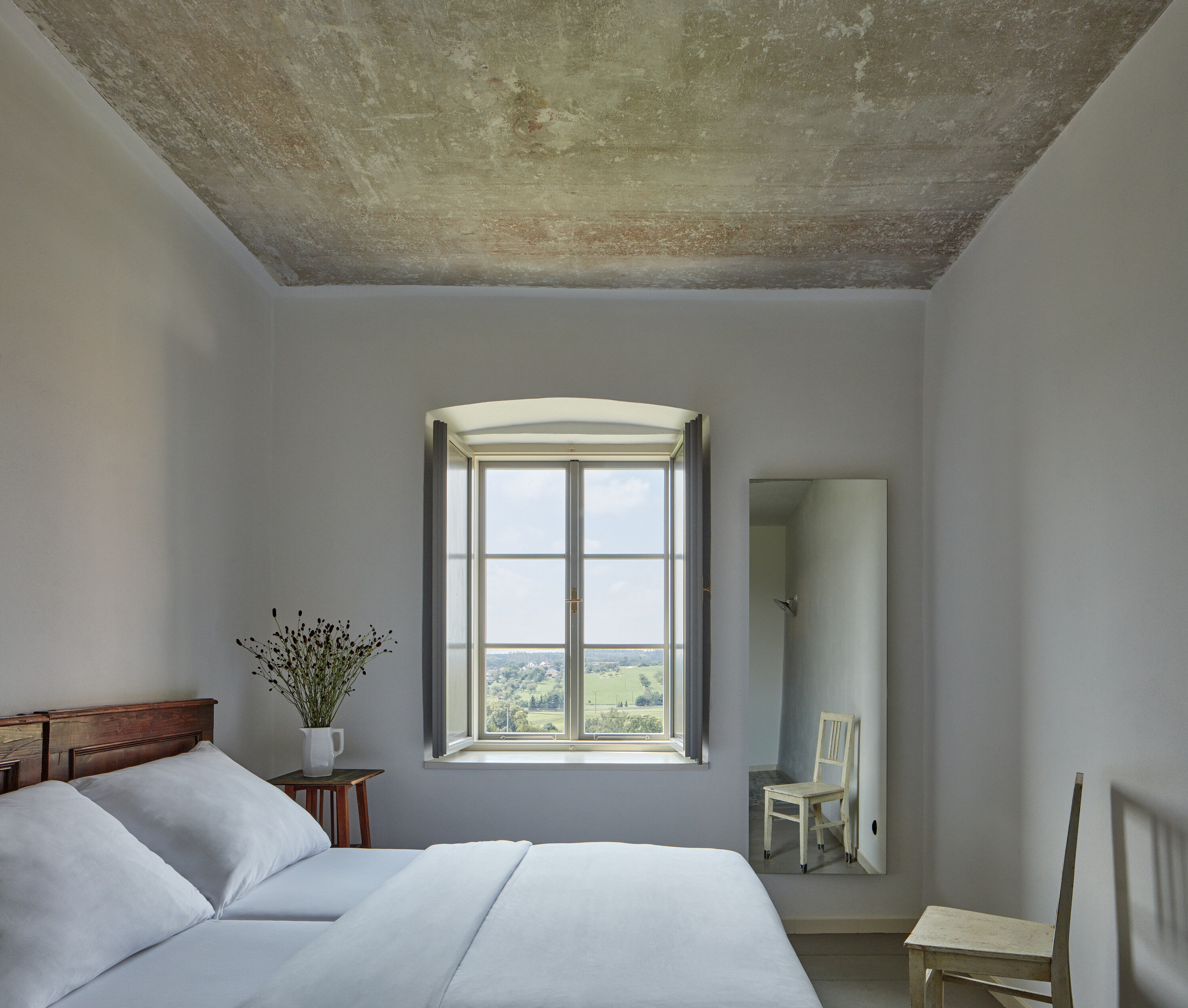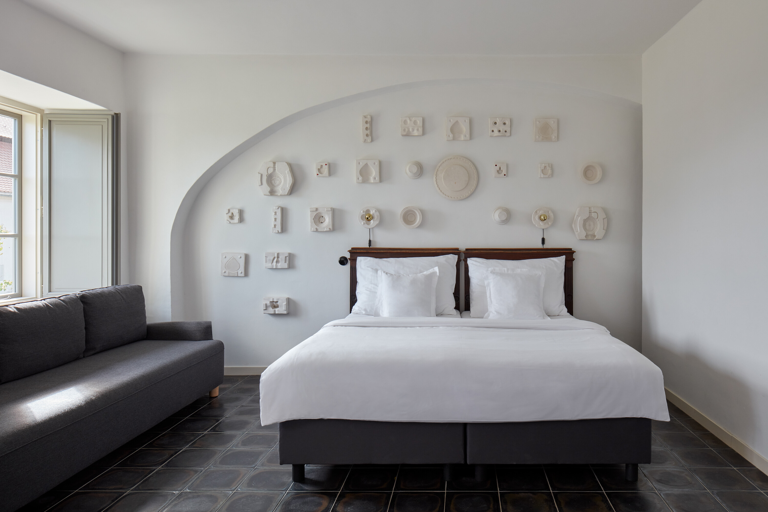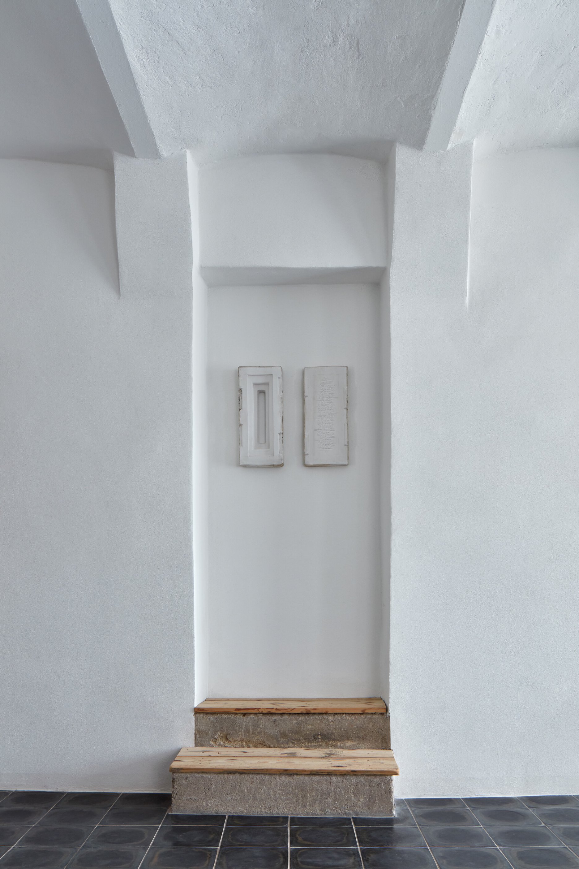 “Interiér je záměrně spartánský, nechybí mu ale přívětivost,” vysvetľujú architekti z ateliéru ORA, ktorí dbajú na zachovanie autentických materiálov a detailov. Ako príklad môžu slúžiť dobové dvere, ktoré nahrádzajú nové jednoduché výplne len v prípade absencie originálu. Rovnakú logiku aplikovali pri rekonštrukcii podláh, kde možno vidieť dobové masívne drevené kazety, doplnené čadičovými a cementovými dlaždicami. V interiéri sa odhaľujú fragmenty pôvodnej výmaľby.
