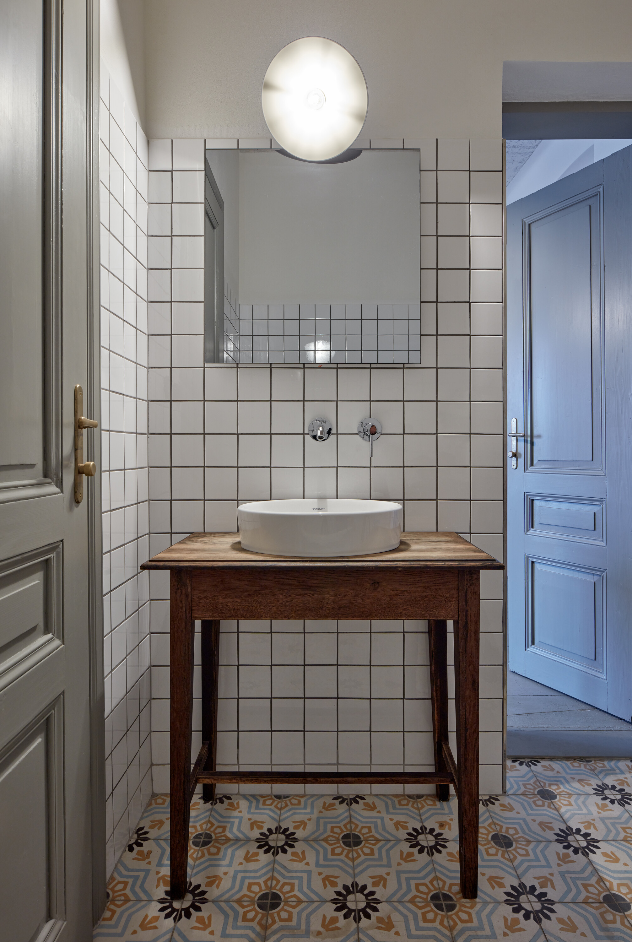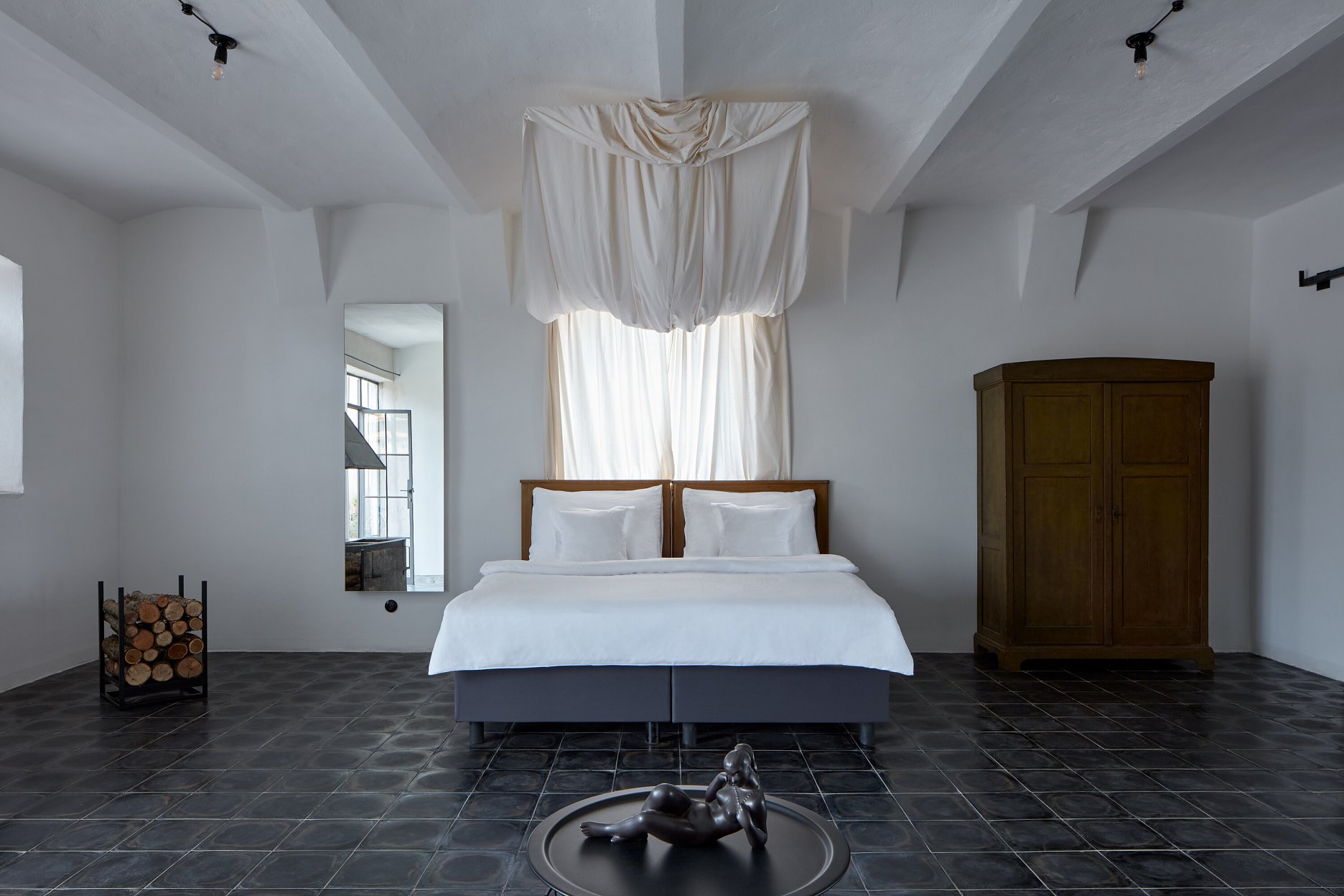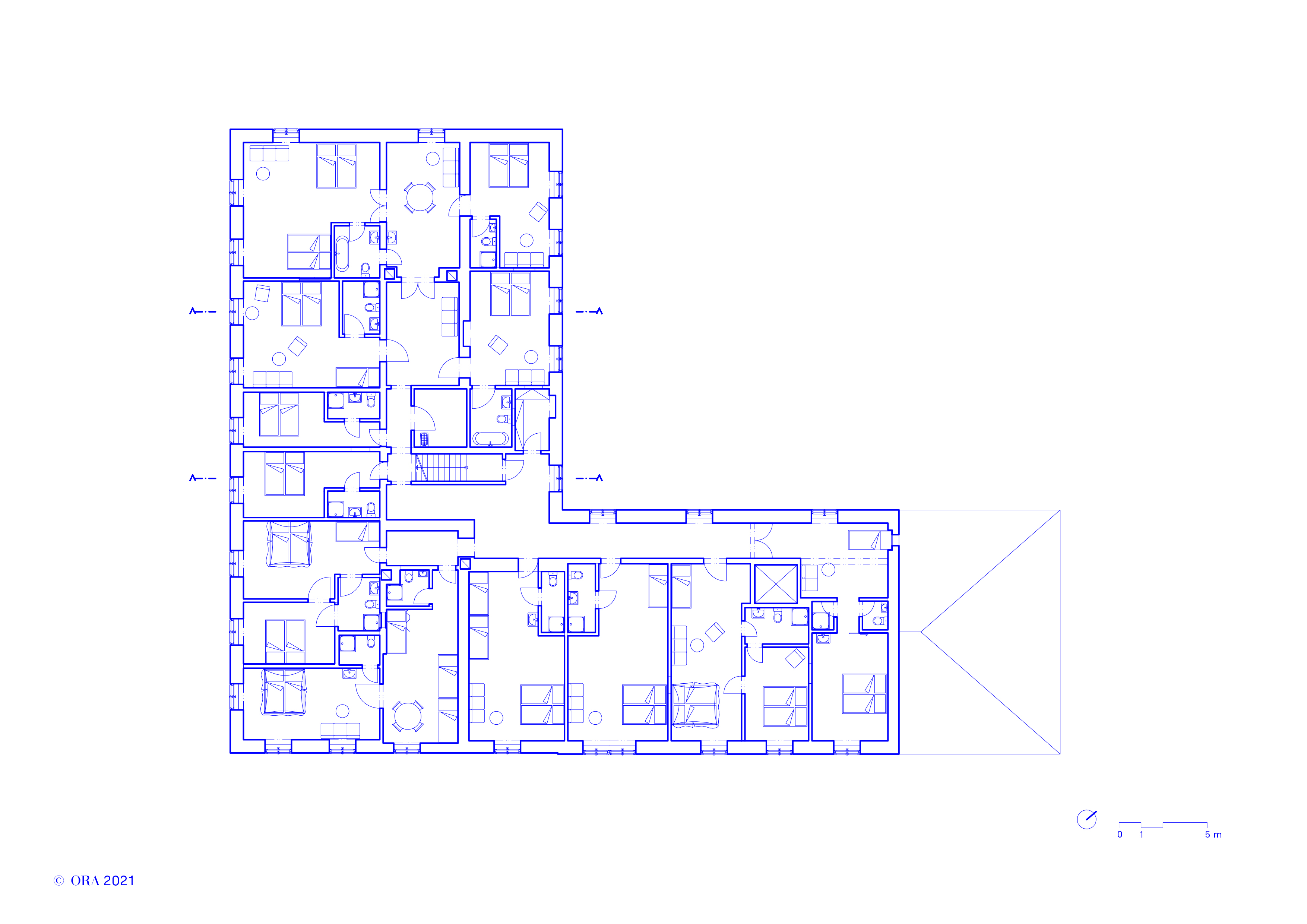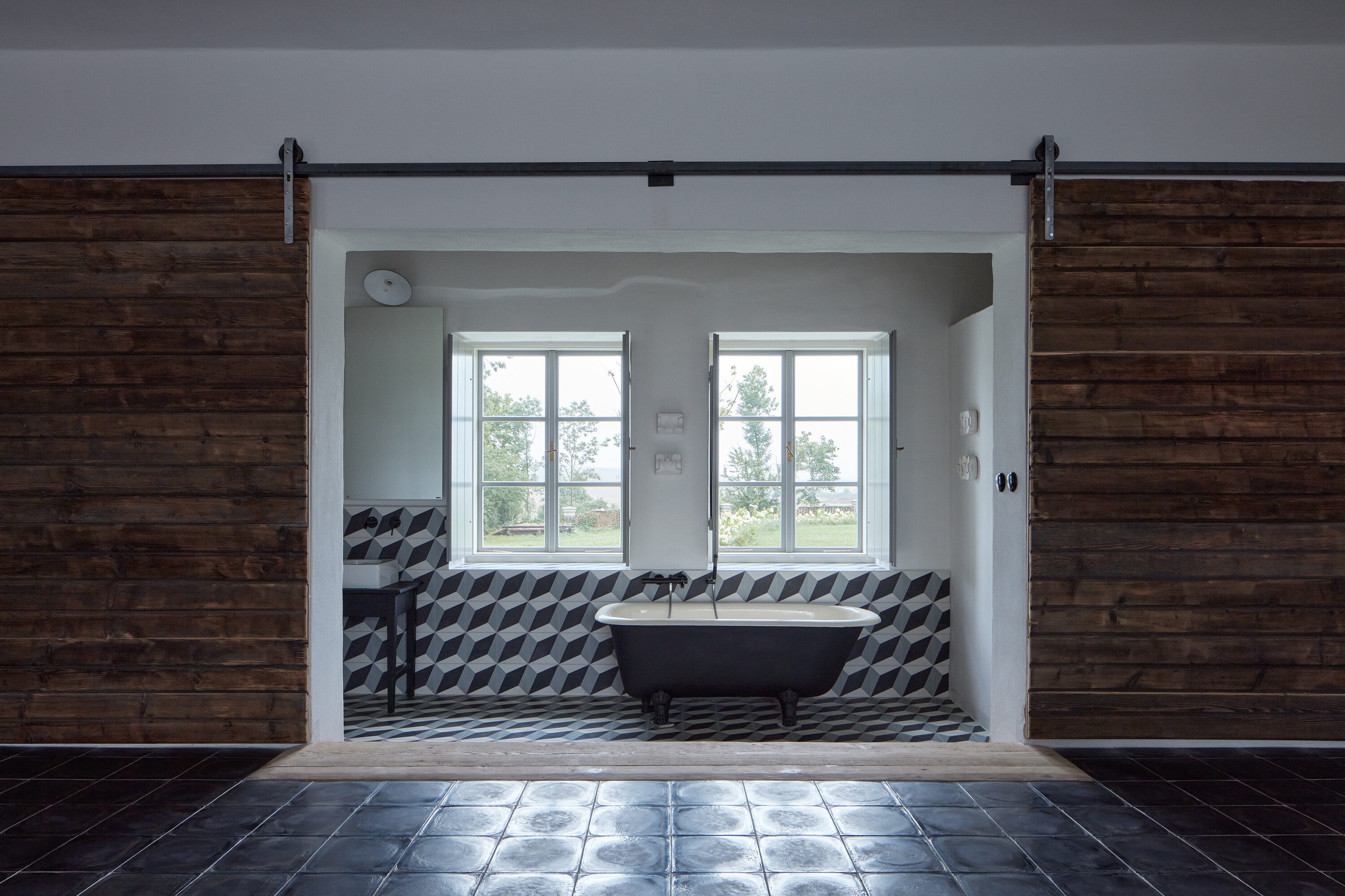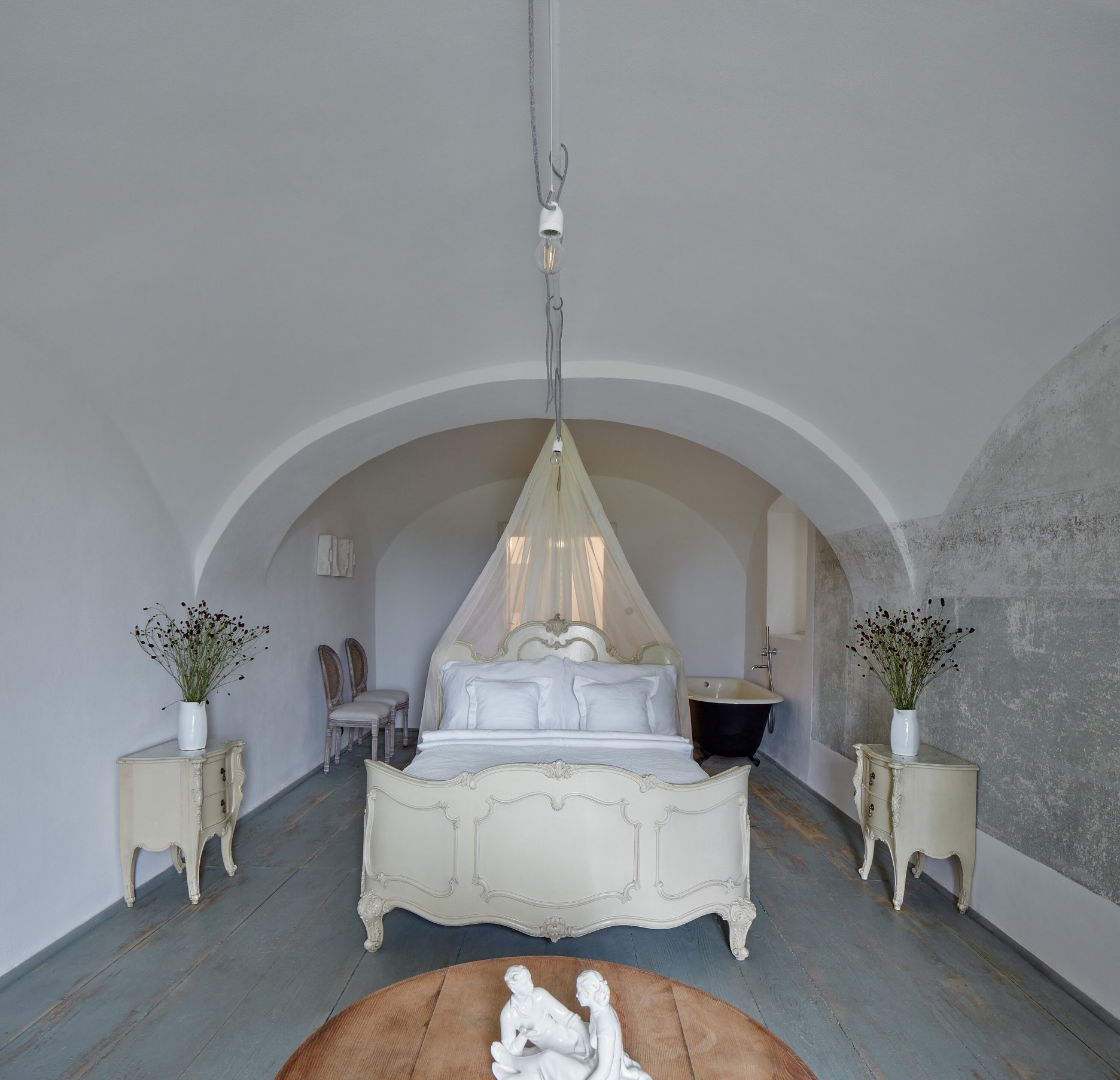 “Interiér je záměrně spartánský, nechybí mu ale přívětivost,” vysvetľujú architekti z ateliéru ORA, ktorí dbajú na zachovanie autentických materiálov a detailov. Ako príklad môžu slúžiť dobové dvere, ktoré nahrádzajú nové jednoduché výplne len v prípade absencie originálu. Rovnakú logiku aplikovali pri rekonštrukcii podláh, kde možno vidieť dobové masívne drevené kazety, doplnené čadičovými a cementovými dlaždicami. V interiéri sa odhaľujú fragmenty pôvodnej výmaľby.