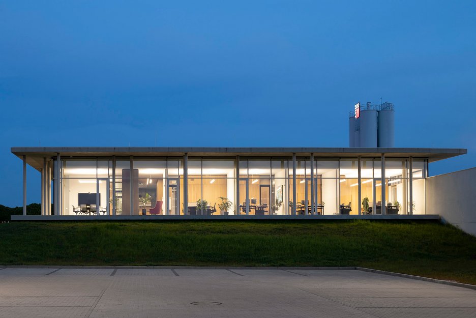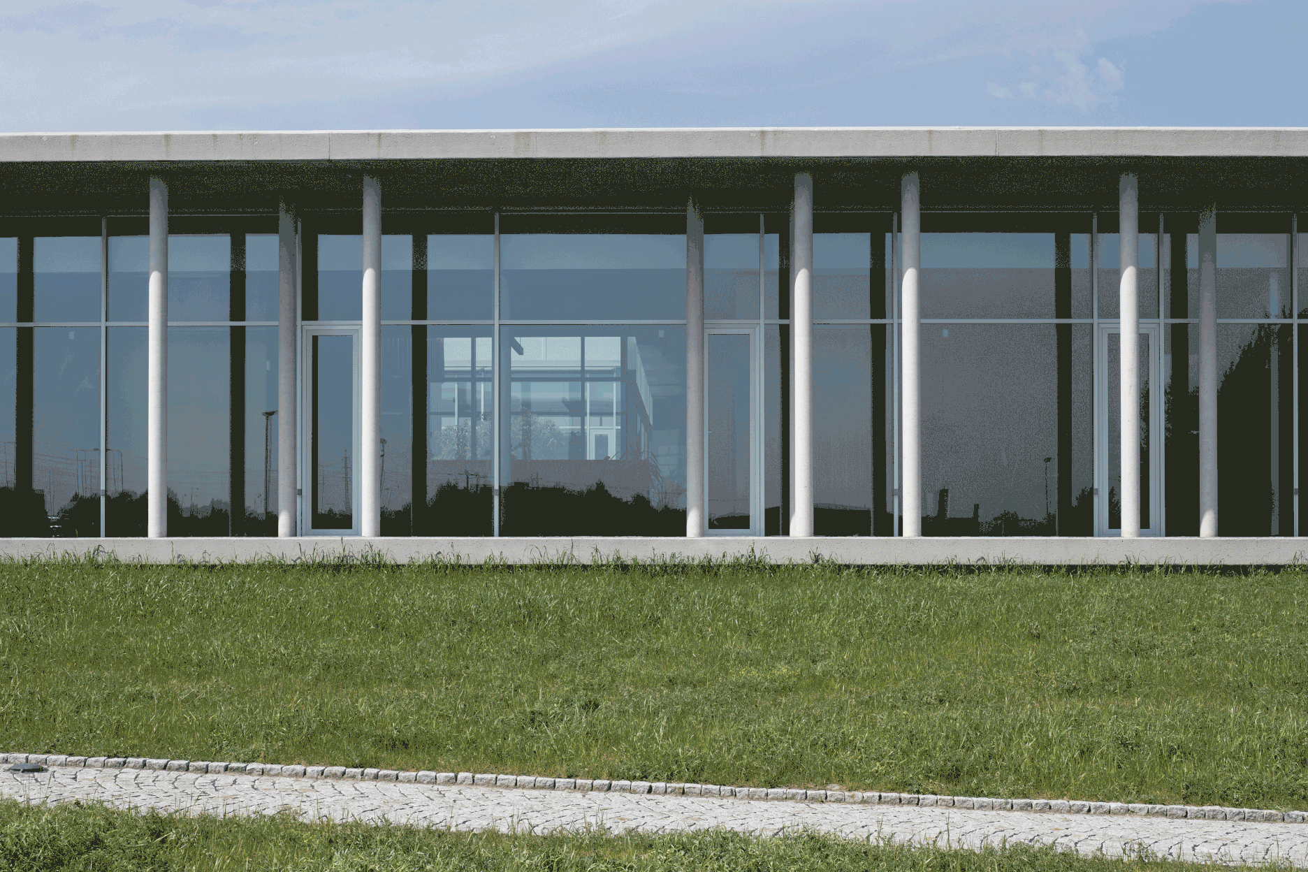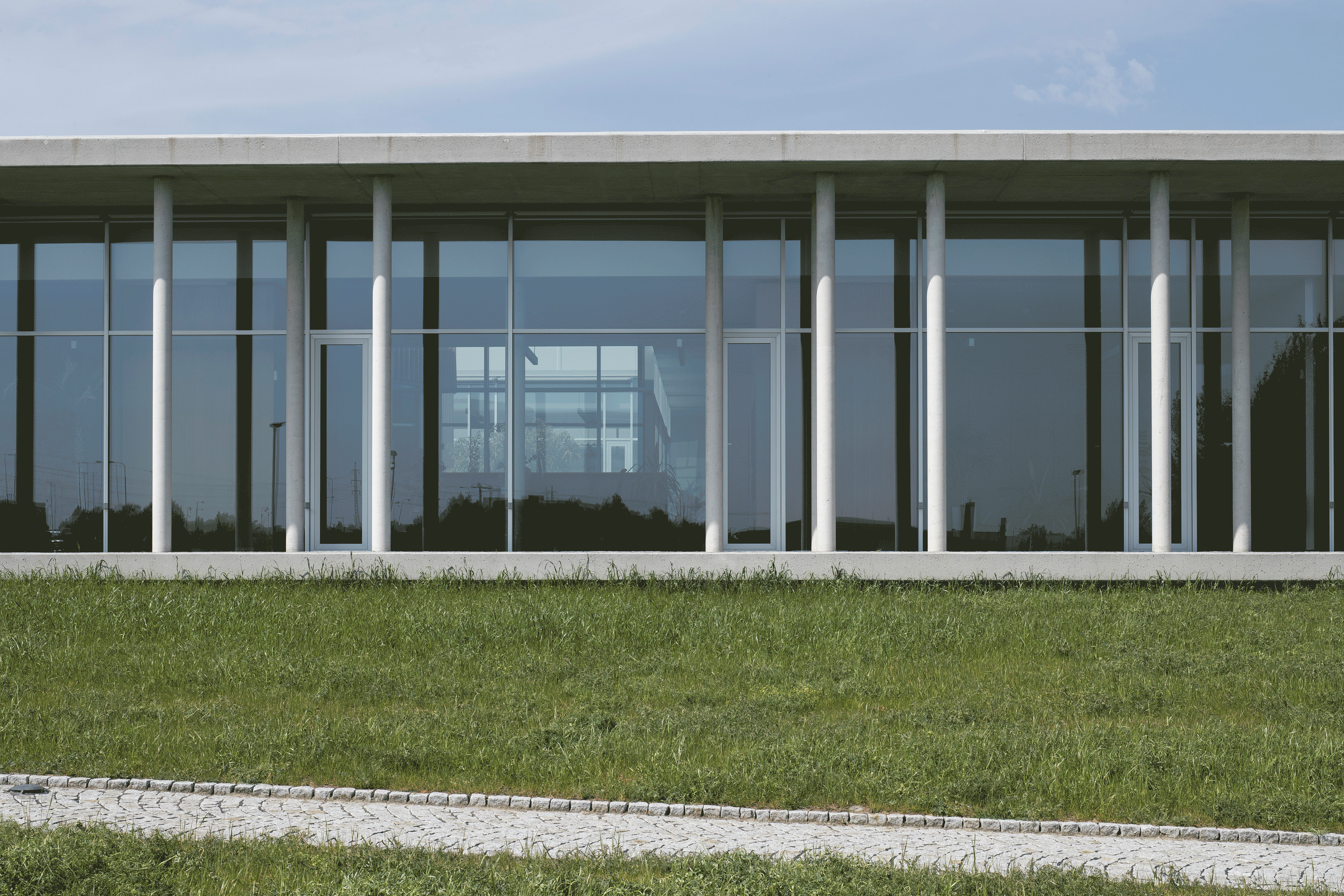 Keďže architektúra reprezentuje vonkajšiu tvár firmy voči okoliu (najmä ak ide o “partnerov z brandže”), priestor pre dobrú architektúru sa našiel aj v tejto polohe. Namiesto zateplenej a omietnutej krabice nás pri vstupe do areálu víta otvorený pavilón, pohľadový betón a sklo.