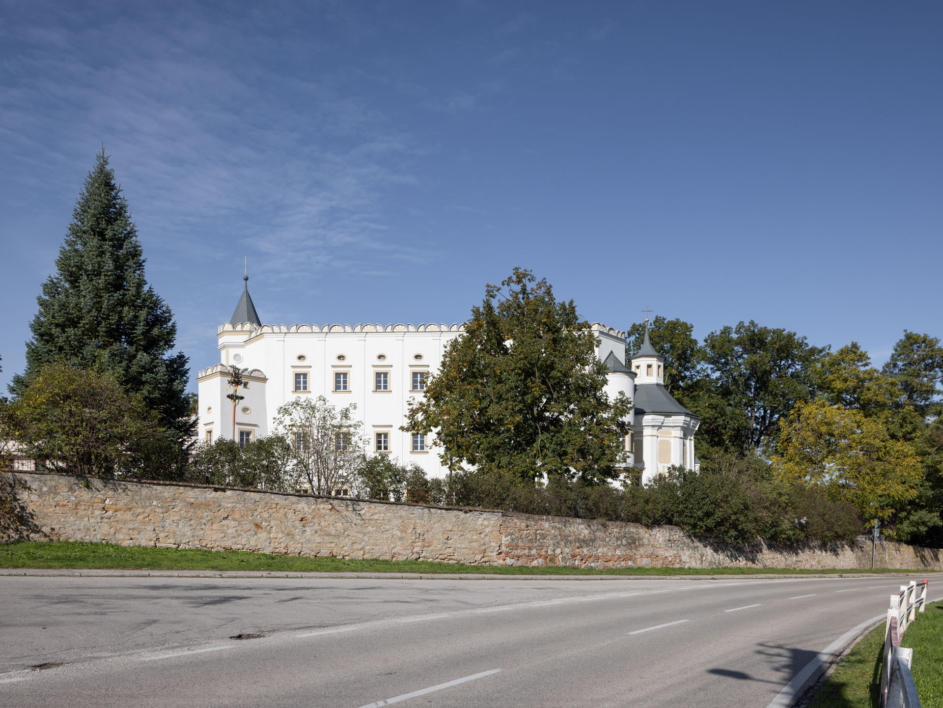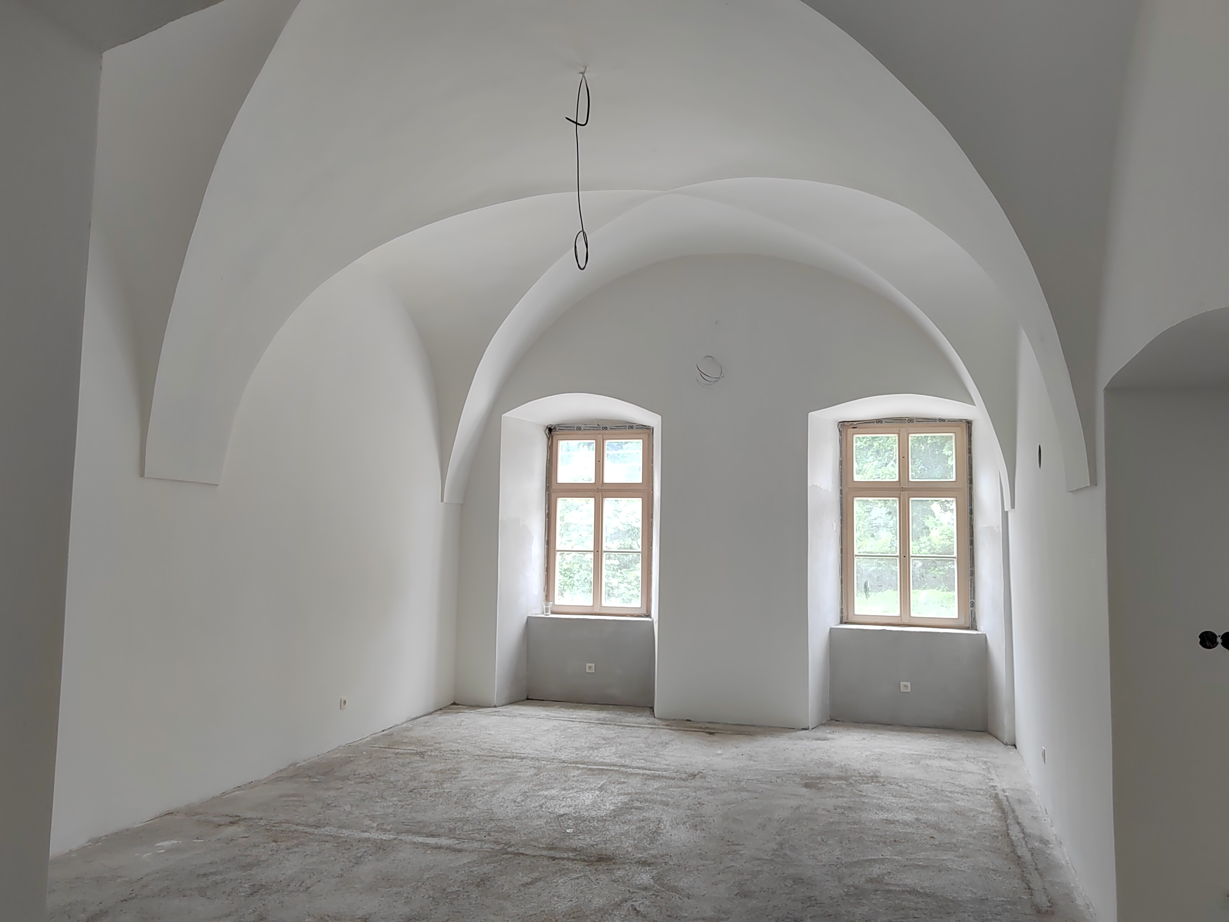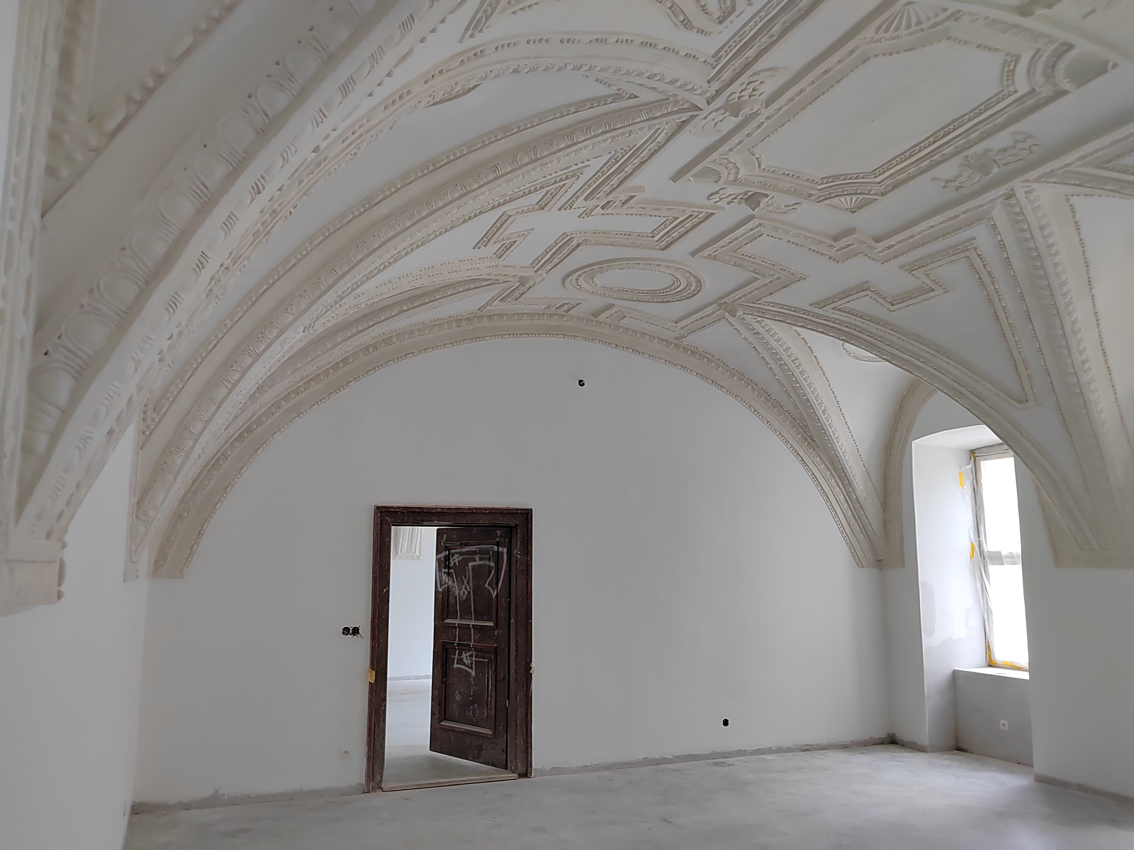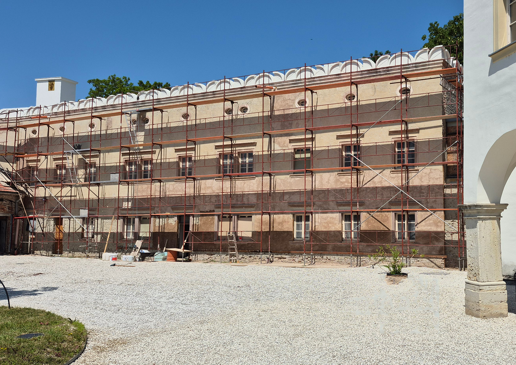 Od roku 2020 sa sústredila pozornosť na murivá a interiérové konštrukcie. Horizontálne chemické injektáže Ø 18 mm v rastri 120 mm zastavili kapilárne vlhnutie obvodových a nosných stien; po ich vyzretí boli nanesené sanačné omietky. V salónoch prízemia sa odstránili povojnové latexové nátery, štukové rámy s motívmi vajcovca a perlovca sa reštaurovali tradičnou vápennou mikro-omietkou a v kaplnke sa konzervoval monochromatický biely farebný koncept, kým pre barokovú kazateľnicu sa pripravuje návrat na pôvodné miesto.