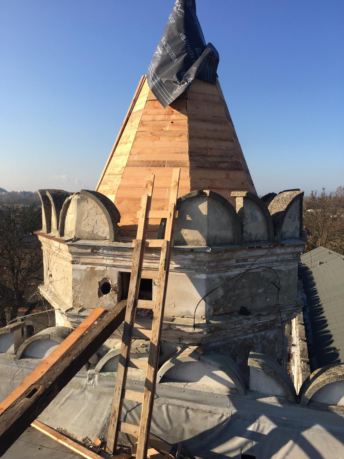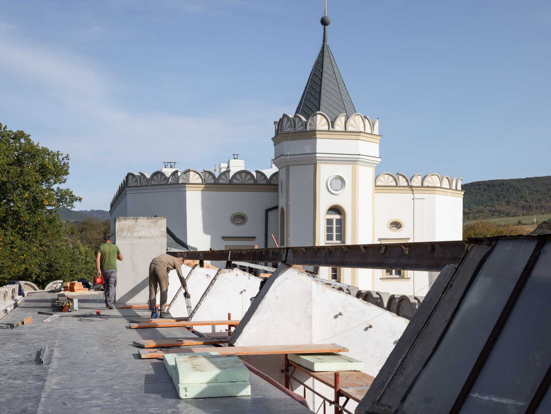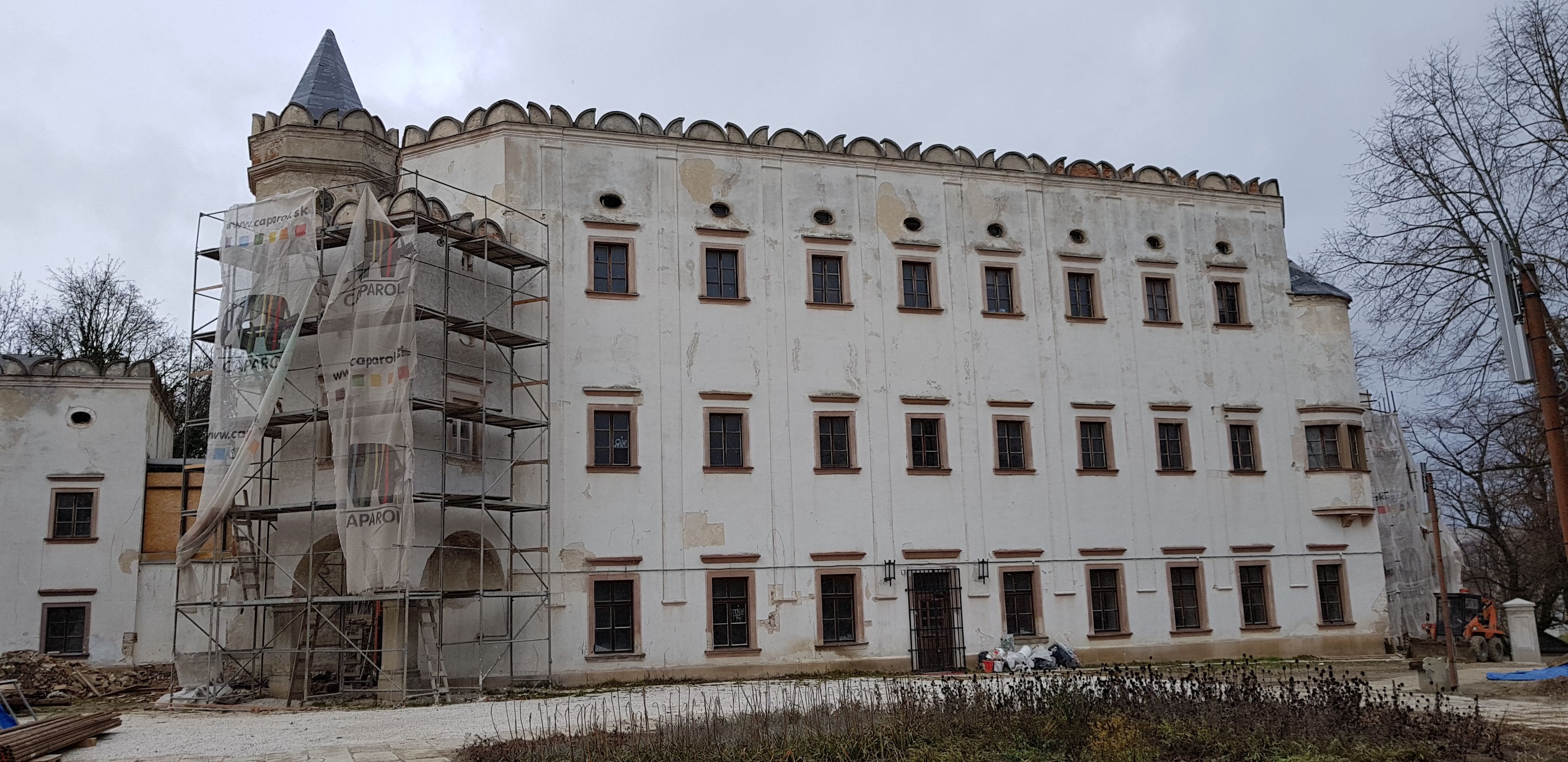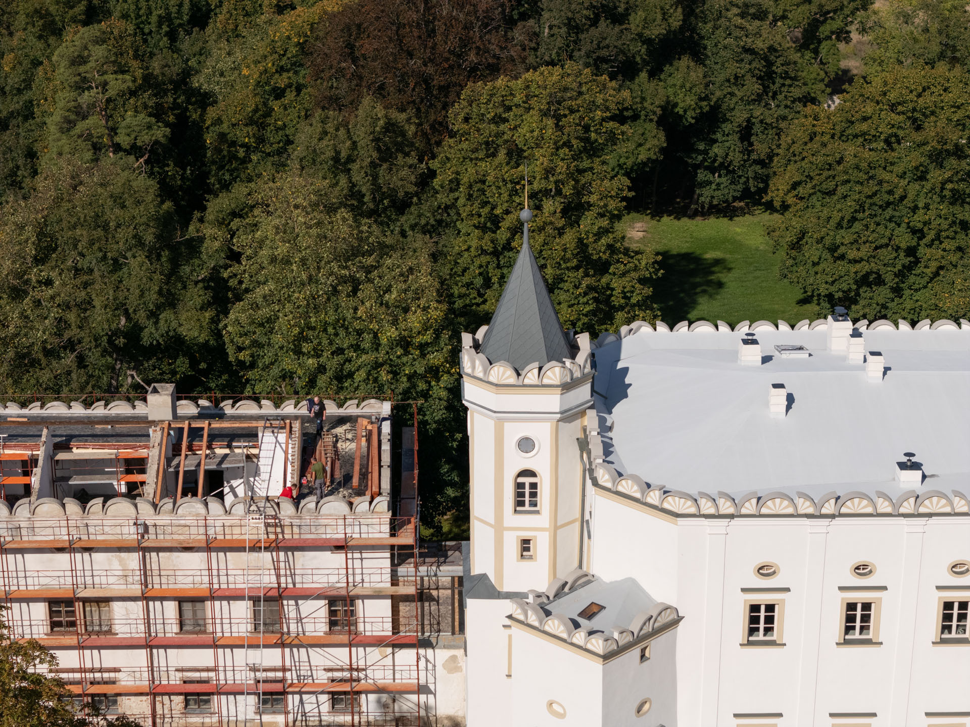 V prvej etape preto prebehla kompletná výmena krytín: na kaplnke sa pôvodný meďou oplechovaný helm nahradil titán-zinkovou šablónovou krytinou 30 × 30 cm, arkierové veže dostali nové dubové krovy a v podkroví kaštieľa bol inštalovaný súbor oceľových tiahel a pochôdznych lávok, ktorý stabilizuje krov a umožňuje revízny pohyb bez ďalšieho zaťaženia historických prvkov. Paralelne sa obnovila charakteristická „lastovičia“ atika: po demontáži sekundárnych cementových úprav boli profilované články doplnené vápennou ručne modelovanou omietkou a opatrené difúzne otvoreným minerálnym náterom.