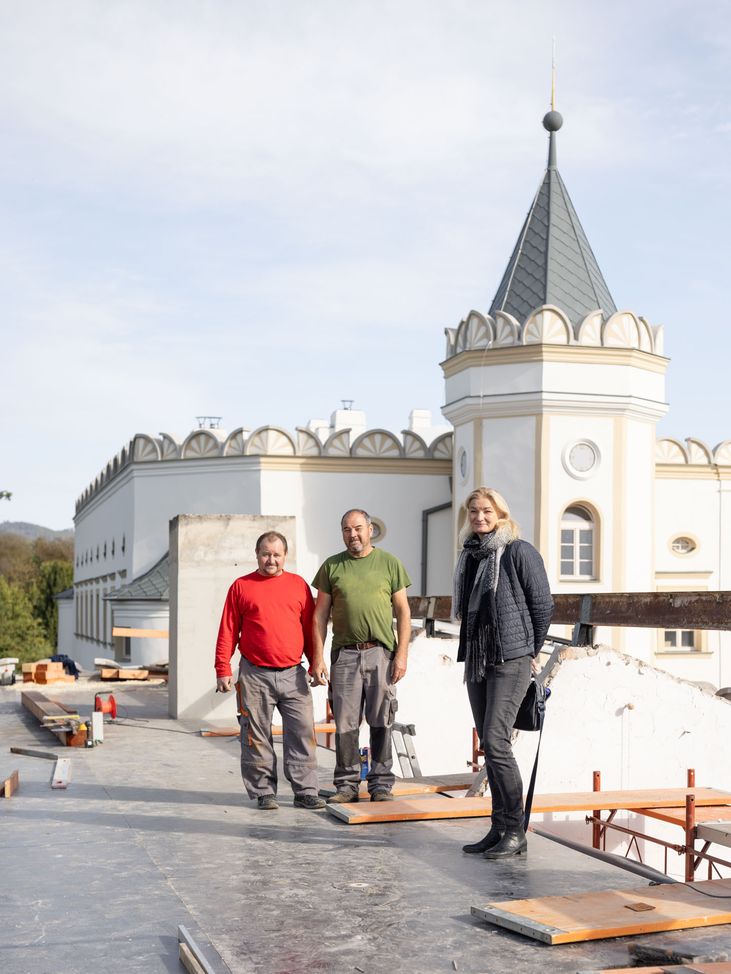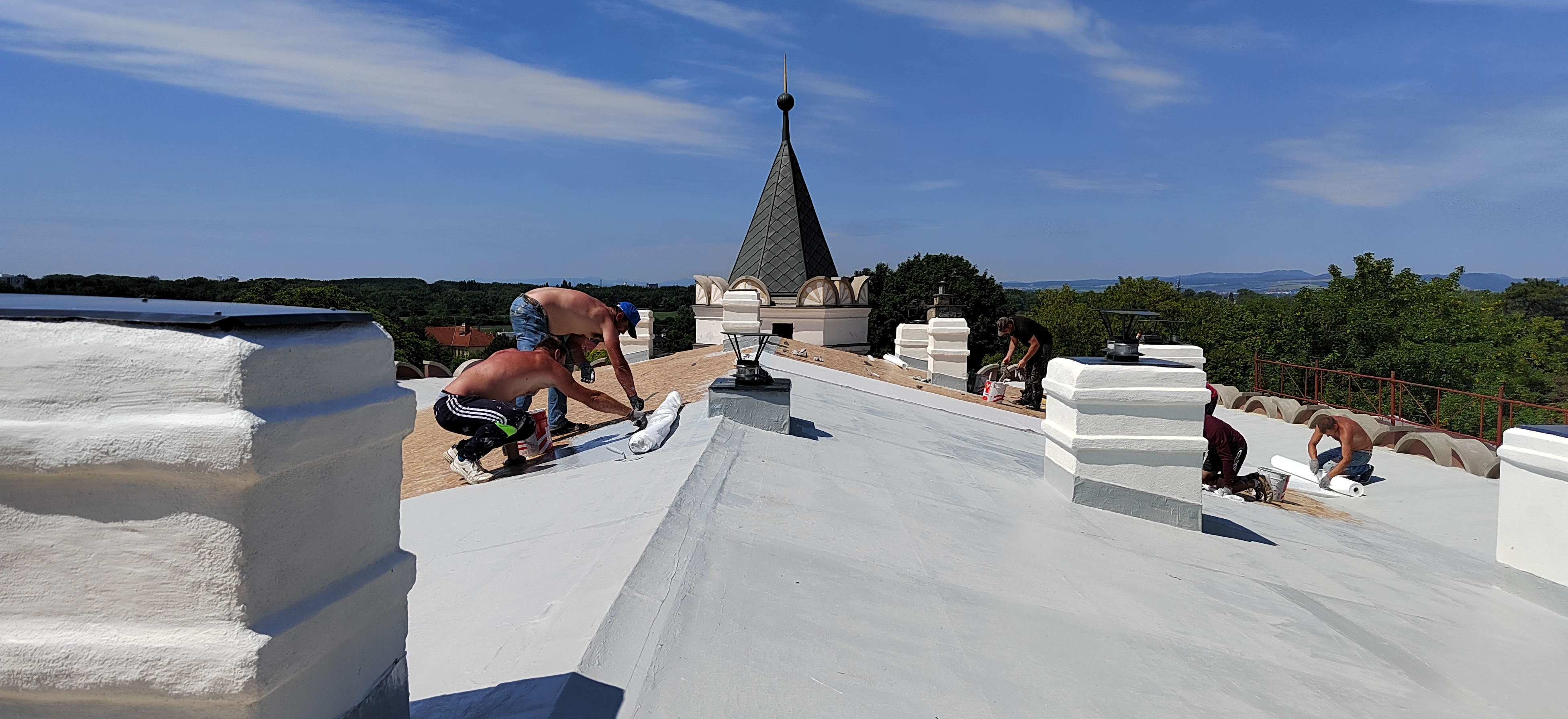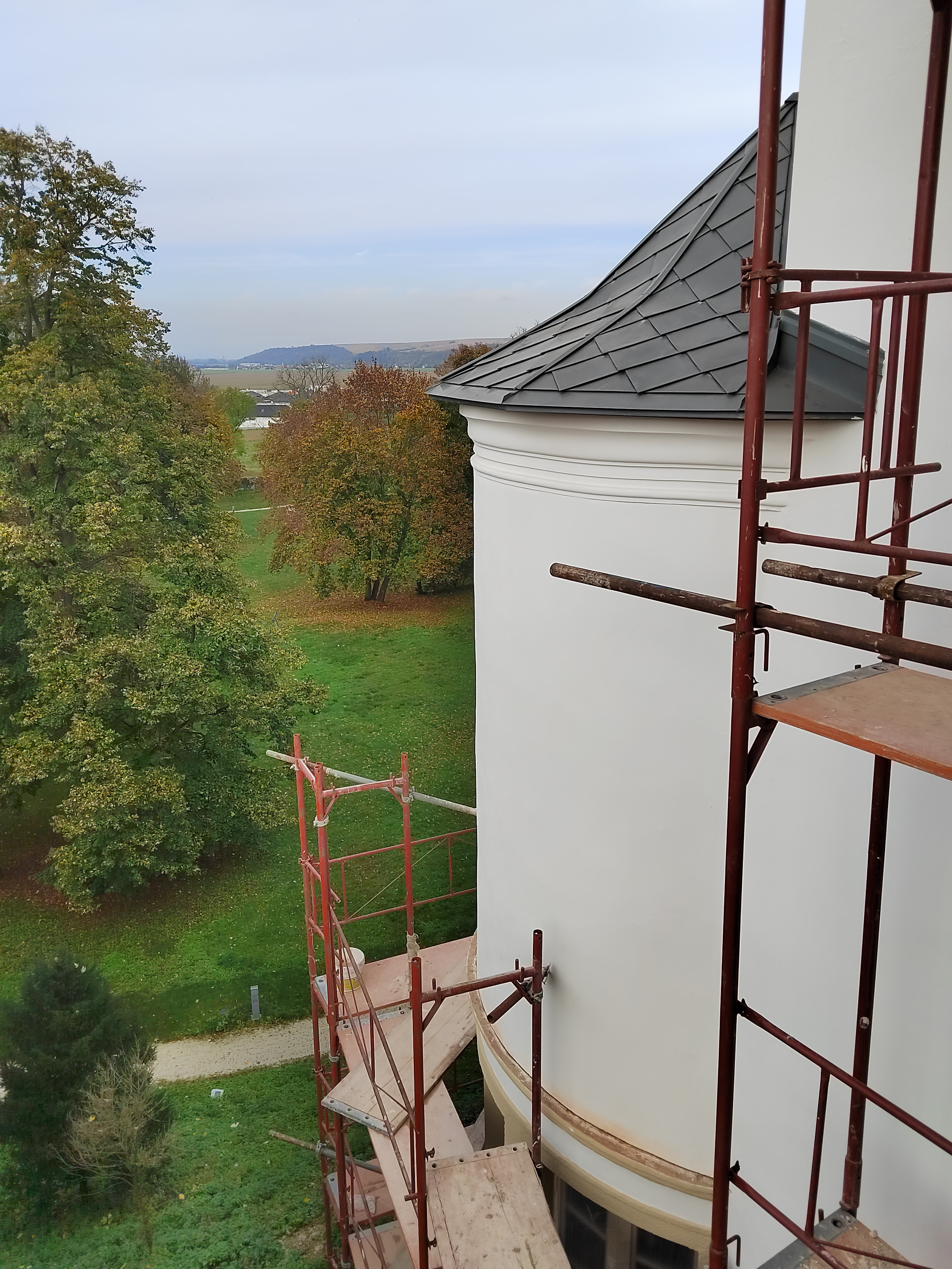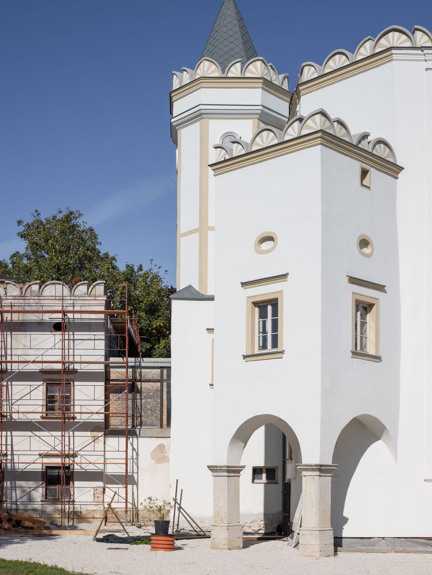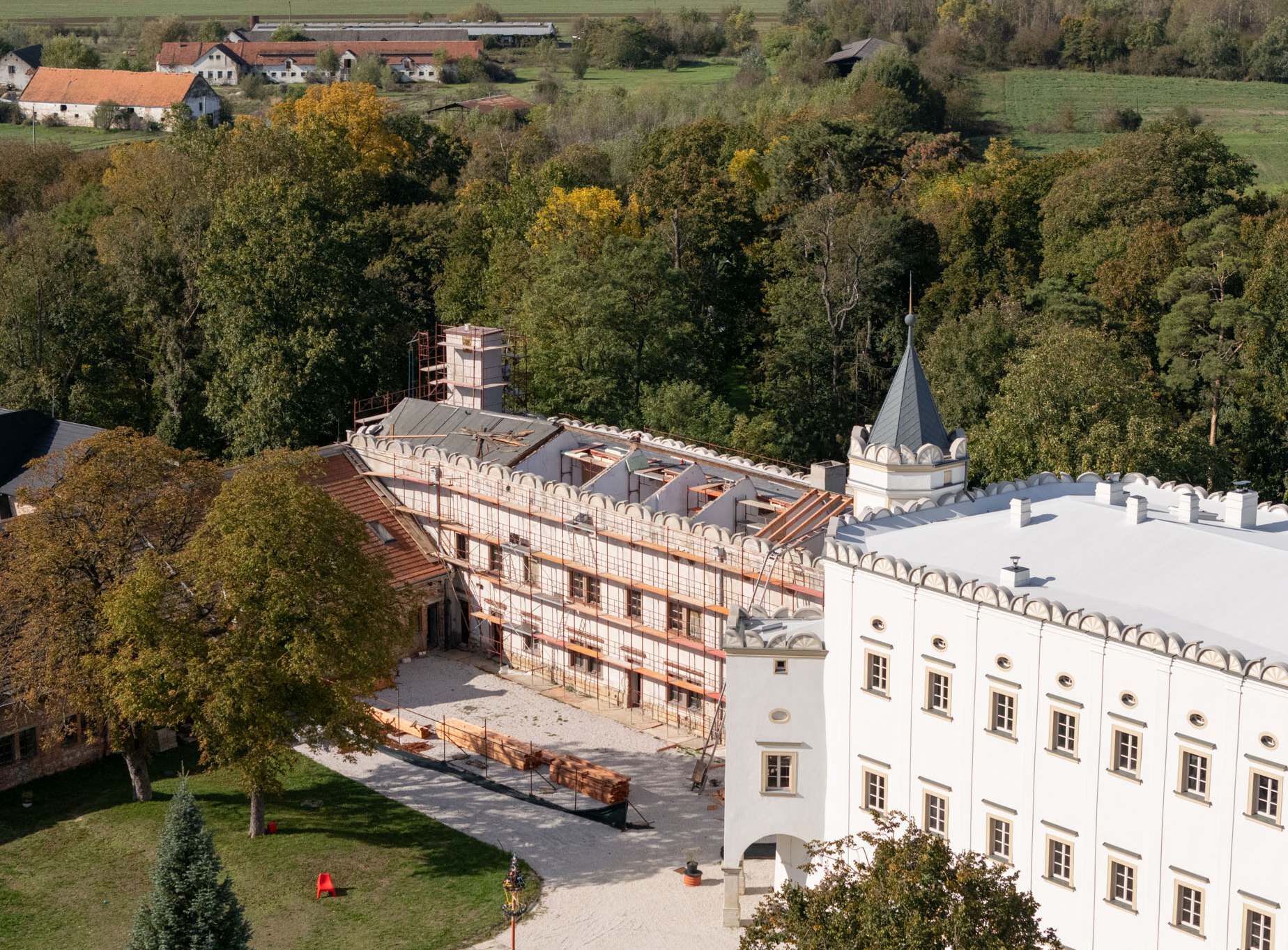 V prvej etape preto prebehla kompletná výmena krytín: na kaplnke sa pôvodný meďou oplechovaný helm nahradil titán-zinkovou šablónovou krytinou 30 × 30 cm, arkierové veže dostali nové dubové krovy a v podkroví kaštieľa bol inštalovaný súbor oceľových tiahel a pochôdznych lávok, ktorý stabilizuje krov a umožňuje revízny pohyb bez ďalšieho zaťaženia historických prvkov. Paralelne sa obnovila charakteristická „lastovičia“ atika: po demontáži sekundárnych cementových úprav boli profilované články doplnené vápennou ručne modelovanou omietkou a opatrené difúzne otvoreným minerálnym náterom.