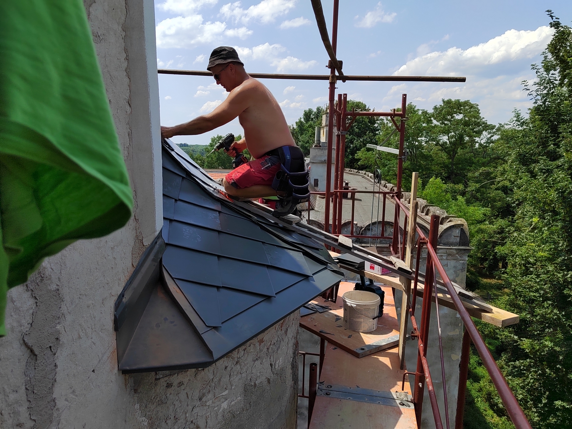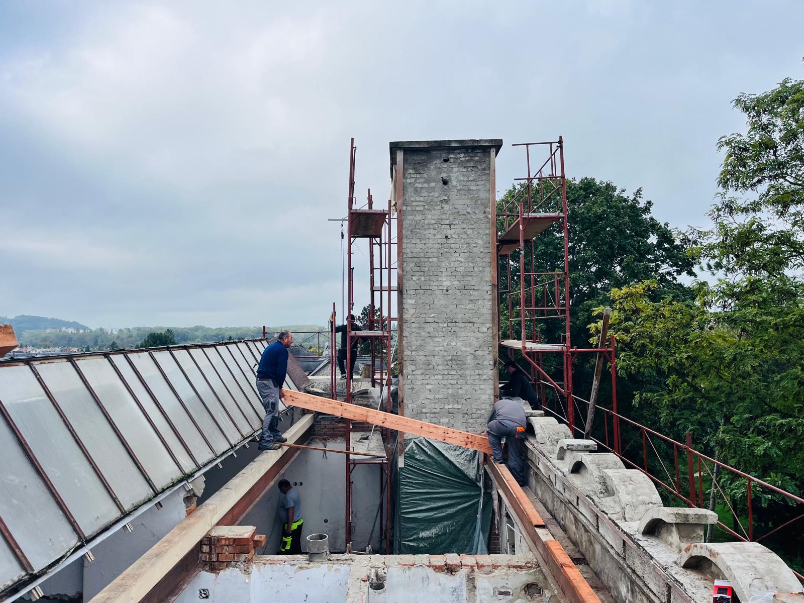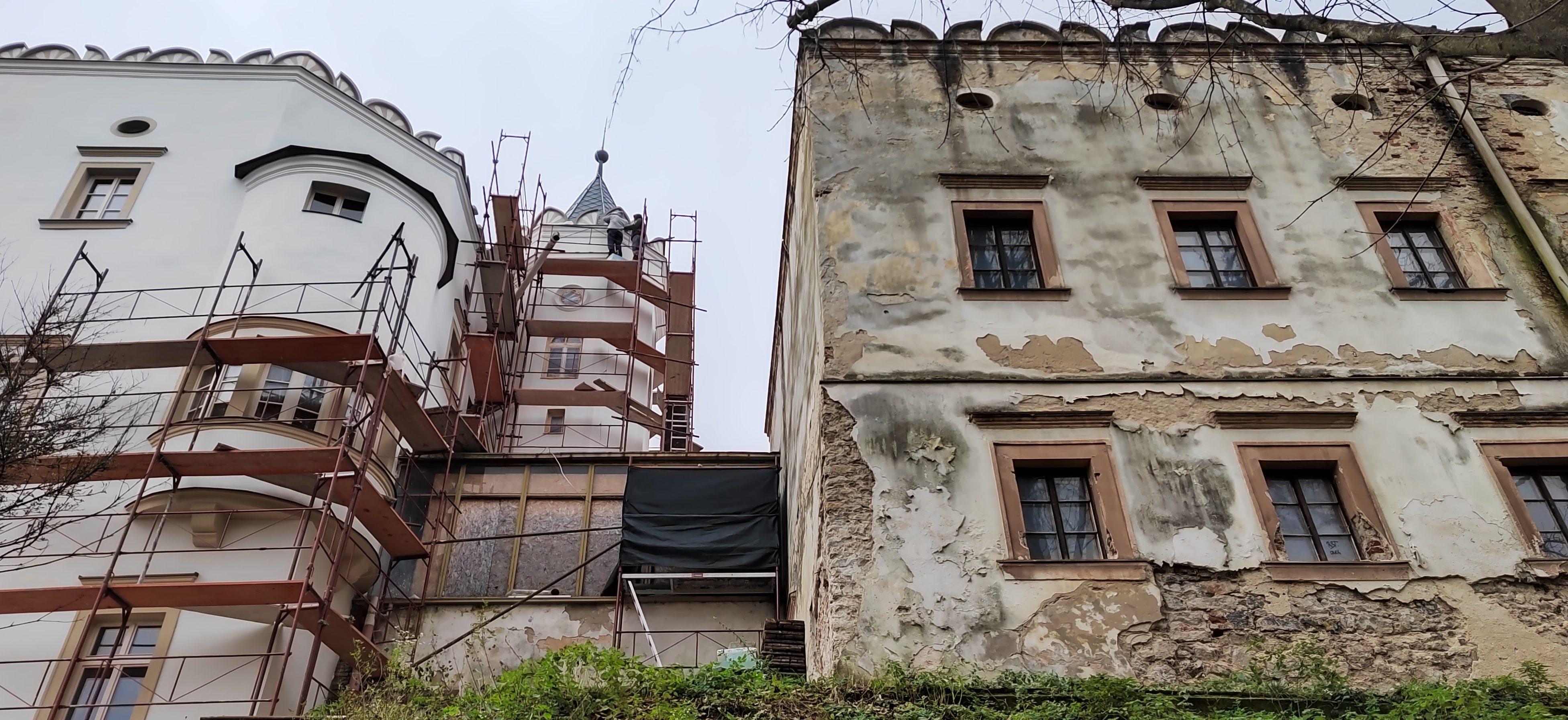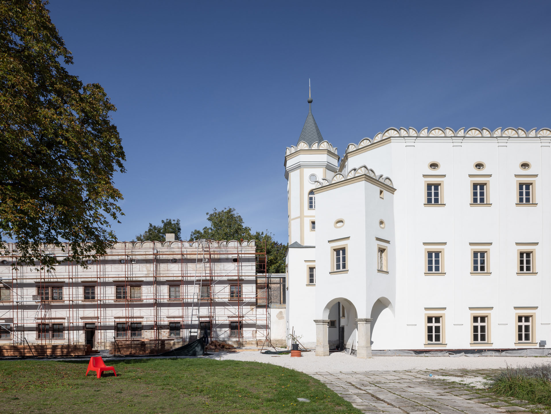 V prvej etape preto prebehla kompletná výmena krytín: na kaplnke sa pôvodný meďou oplechovaný helm nahradil titán-zinkovou šablónovou krytinou 30 × 30 cm, arkierové veže dostali nové dubové krovy a v podkroví kaštieľa bol inštalovaný súbor oceľových tiahel a pochôdznych lávok, ktorý stabilizuje krov a umožňuje revízny pohyb bez ďalšieho zaťaženia historických prvkov. Paralelne sa obnovila charakteristická „lastovičia“ atika: po demontáži sekundárnych cementových úprav boli profilované články doplnené vápennou ručne modelovanou omietkou a opatrené difúzne otvoreným minerálnym náterom.