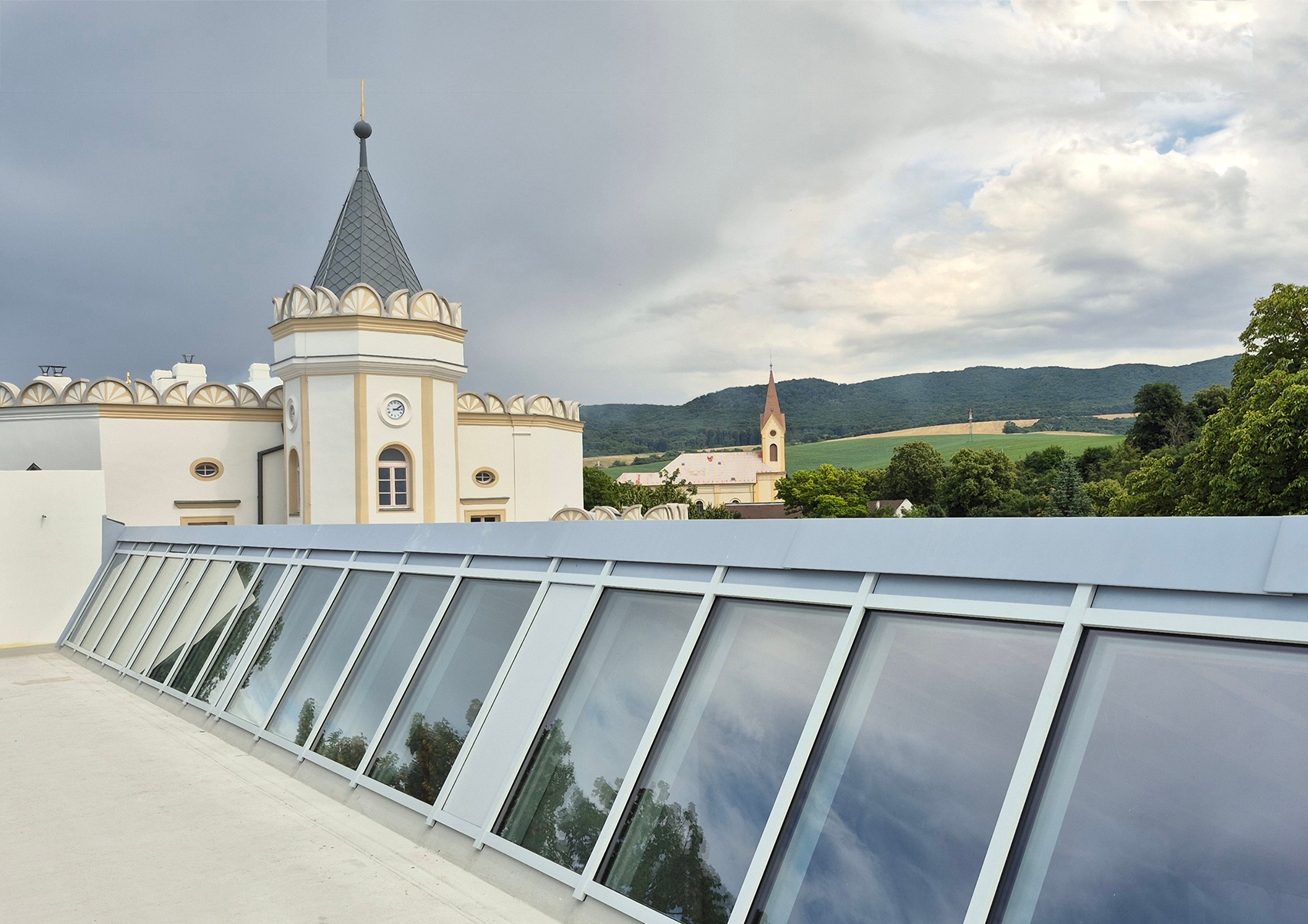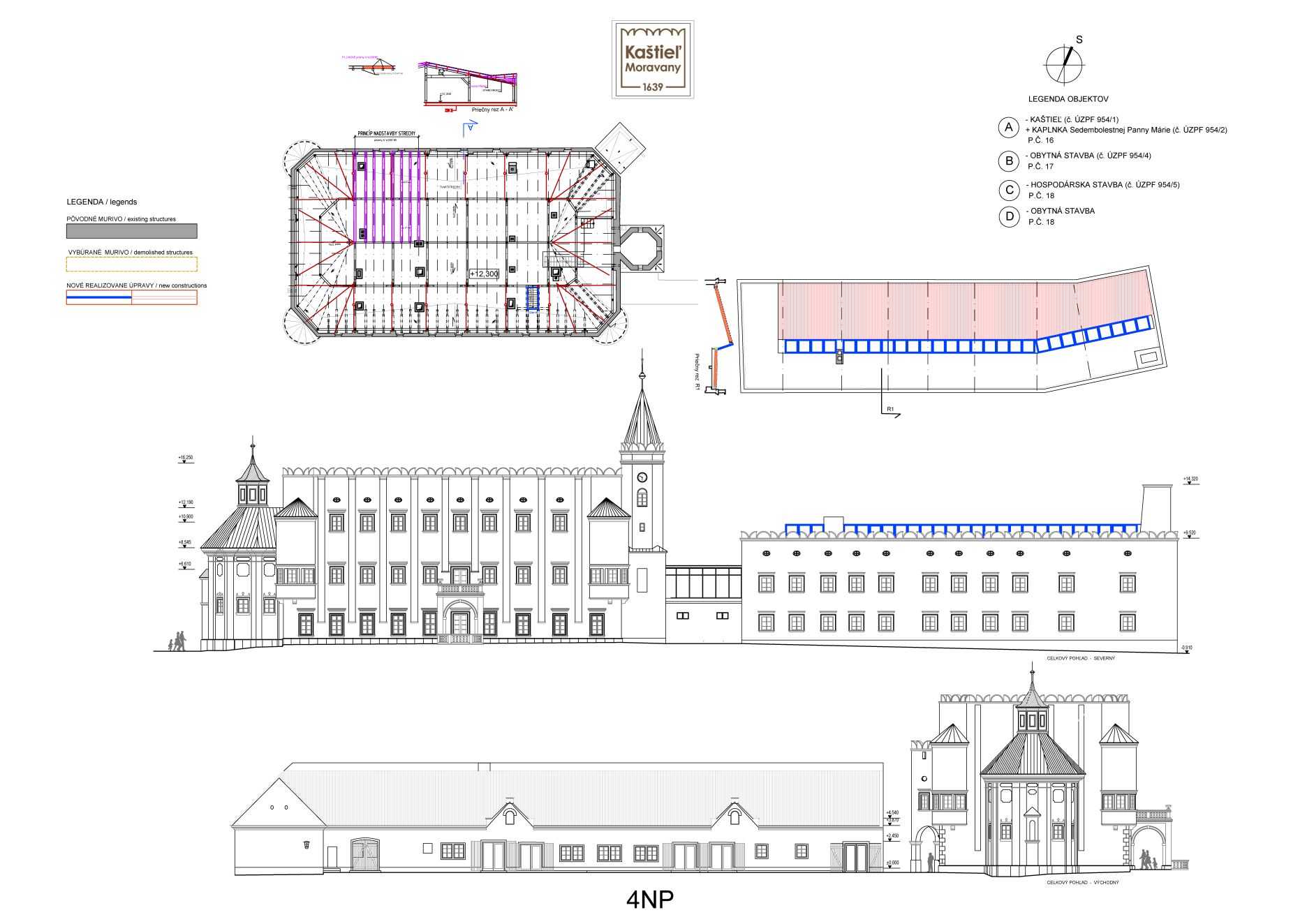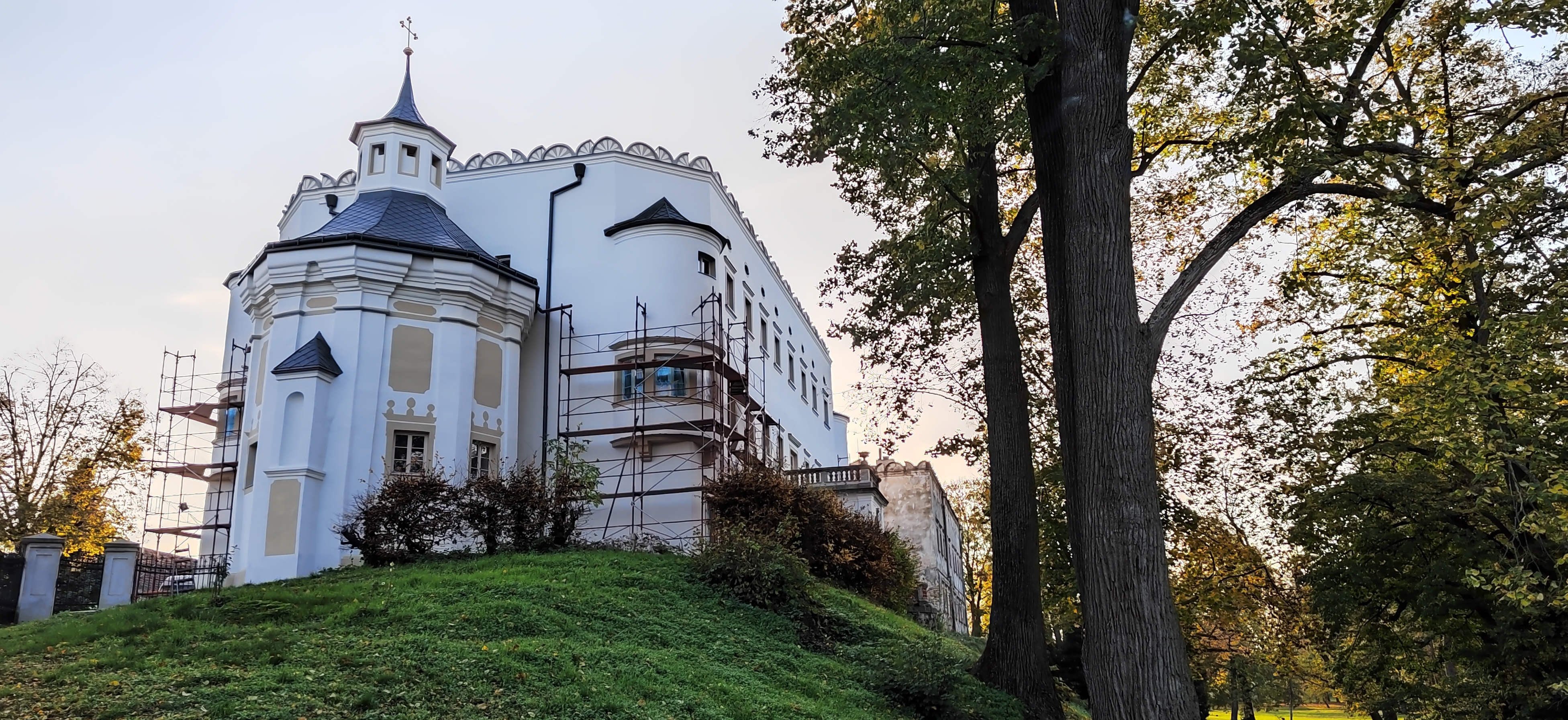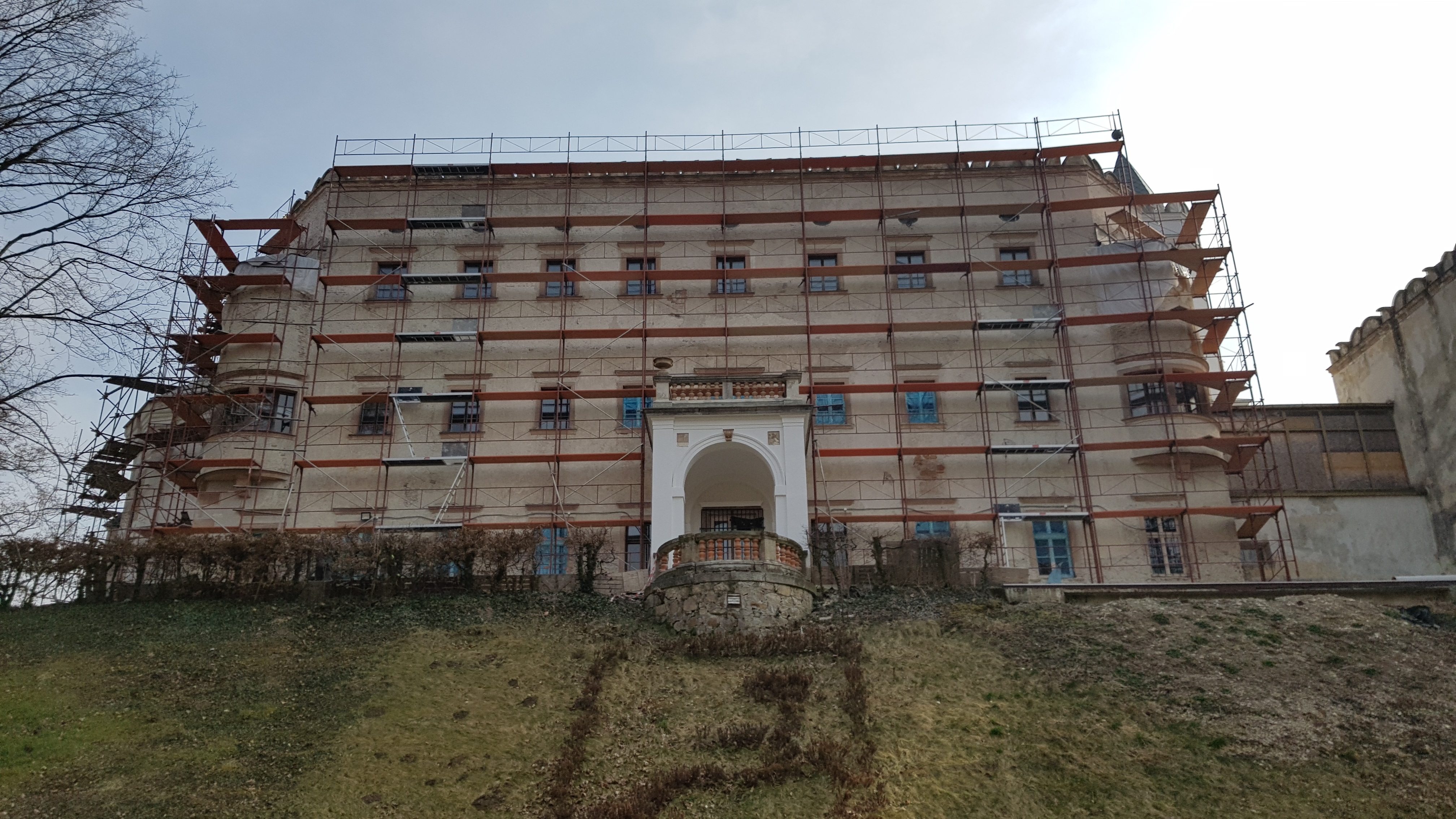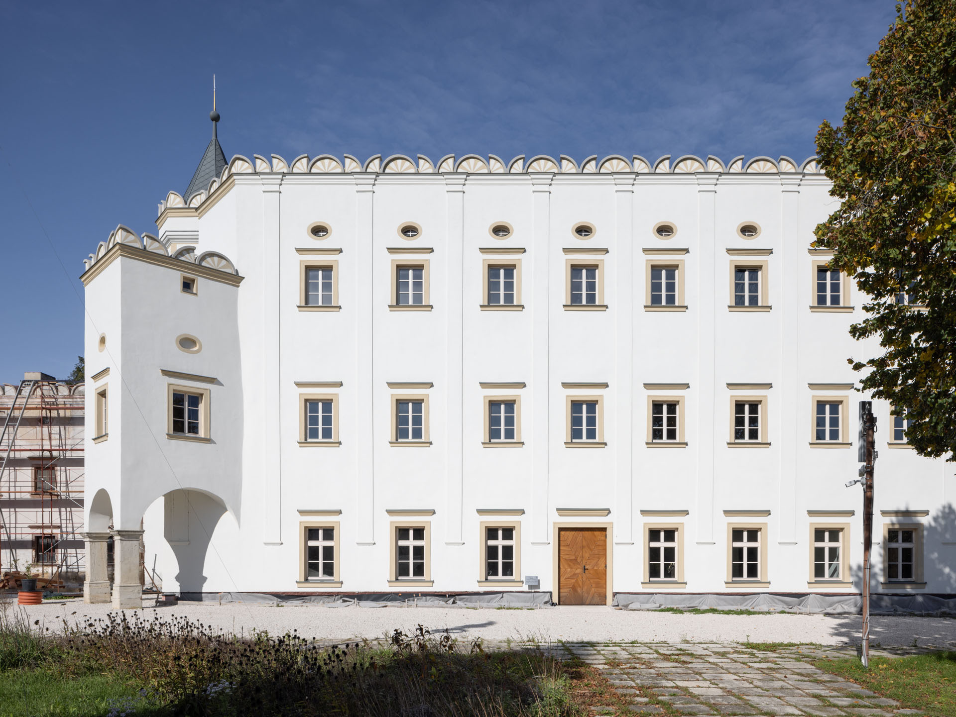 V prvej etape preto prebehla kompletná výmena krytín: na kaplnke sa pôvodný meďou oplechovaný helm nahradil titán-zinkovou šablónovou krytinou 30 × 30 cm, arkierové veže dostali nové dubové krovy a v podkroví kaštieľa bol inštalovaný súbor oceľových tiahel a pochôdznych lávok, ktorý stabilizuje krov a umožňuje revízny pohyb bez ďalšieho zaťaženia historických prvkov. Paralelne sa obnovila charakteristická „lastovičia“ atika: po demontáži sekundárnych cementových úprav boli profilované články doplnené vápennou ručne modelovanou omietkou a opatrené difúzne otvoreným minerálnym náterom.