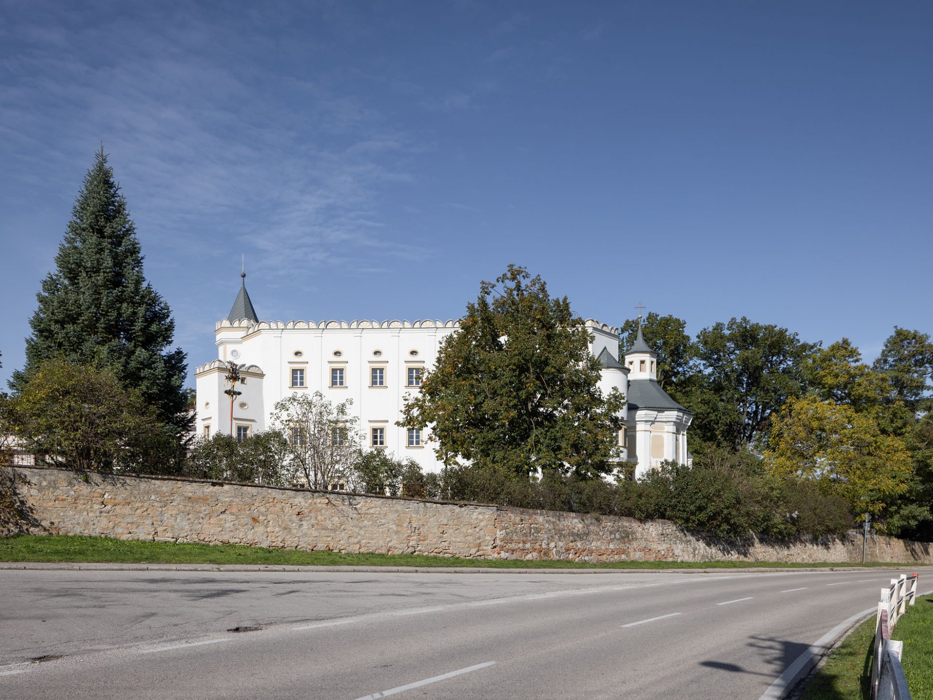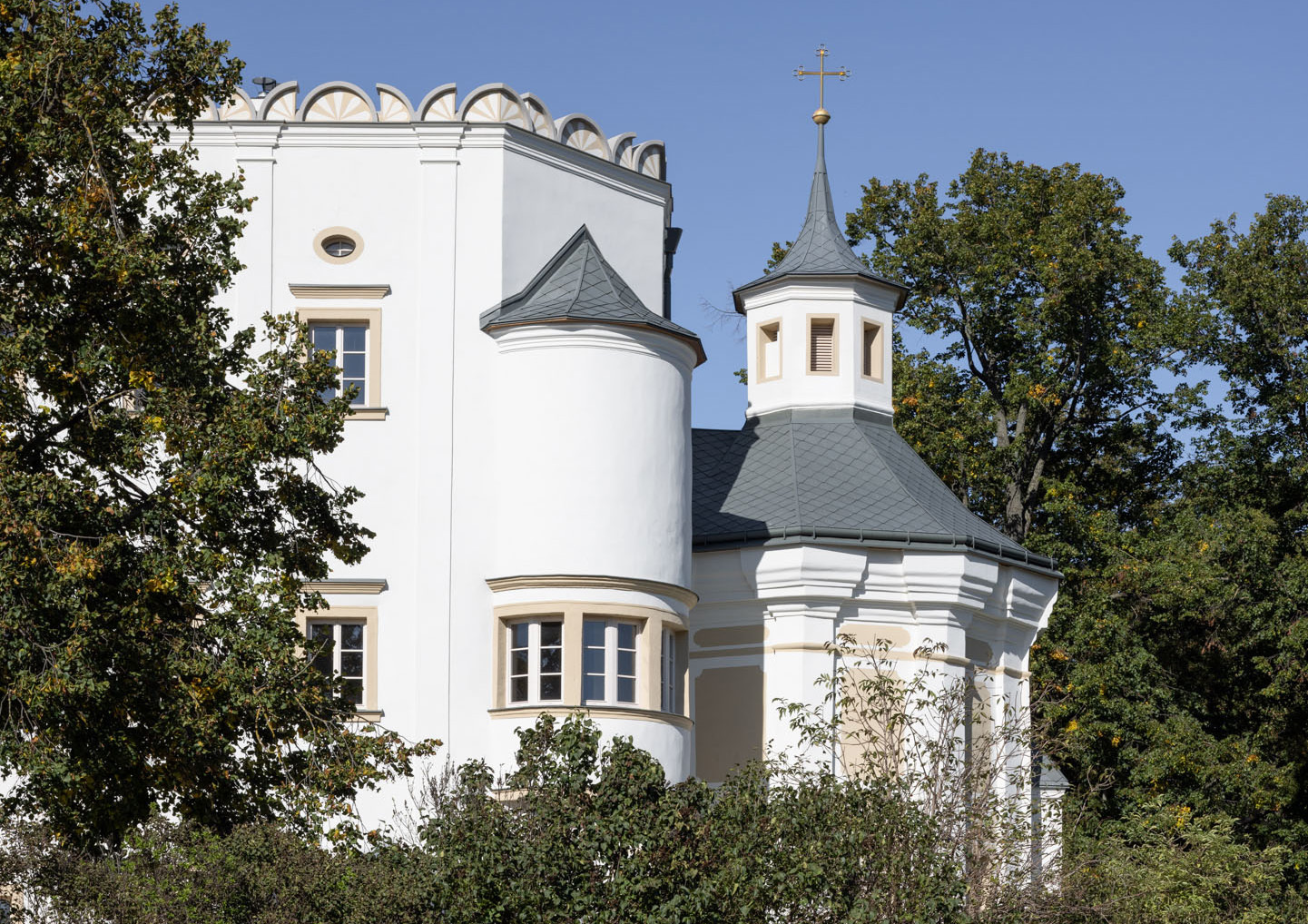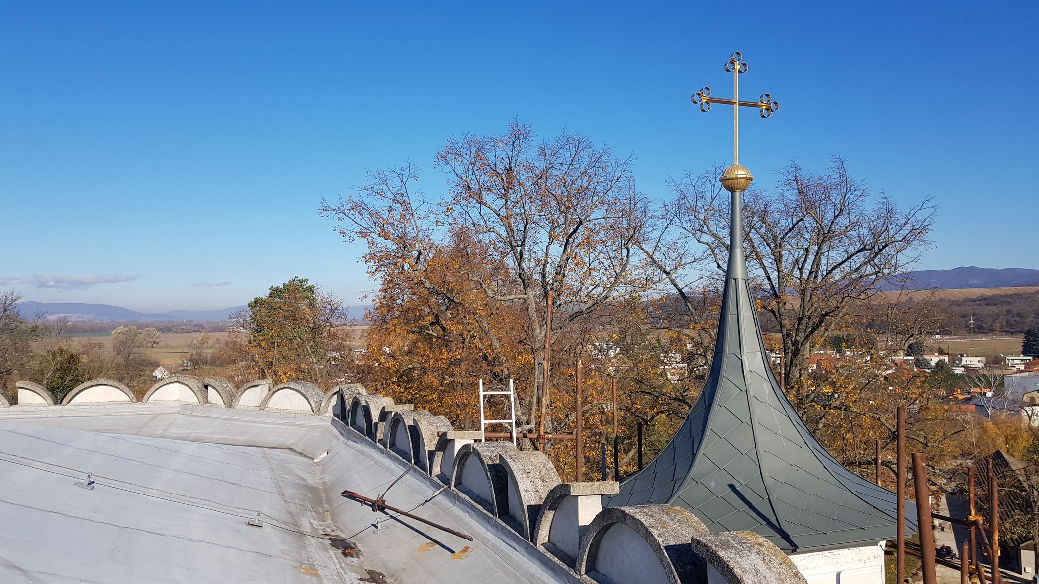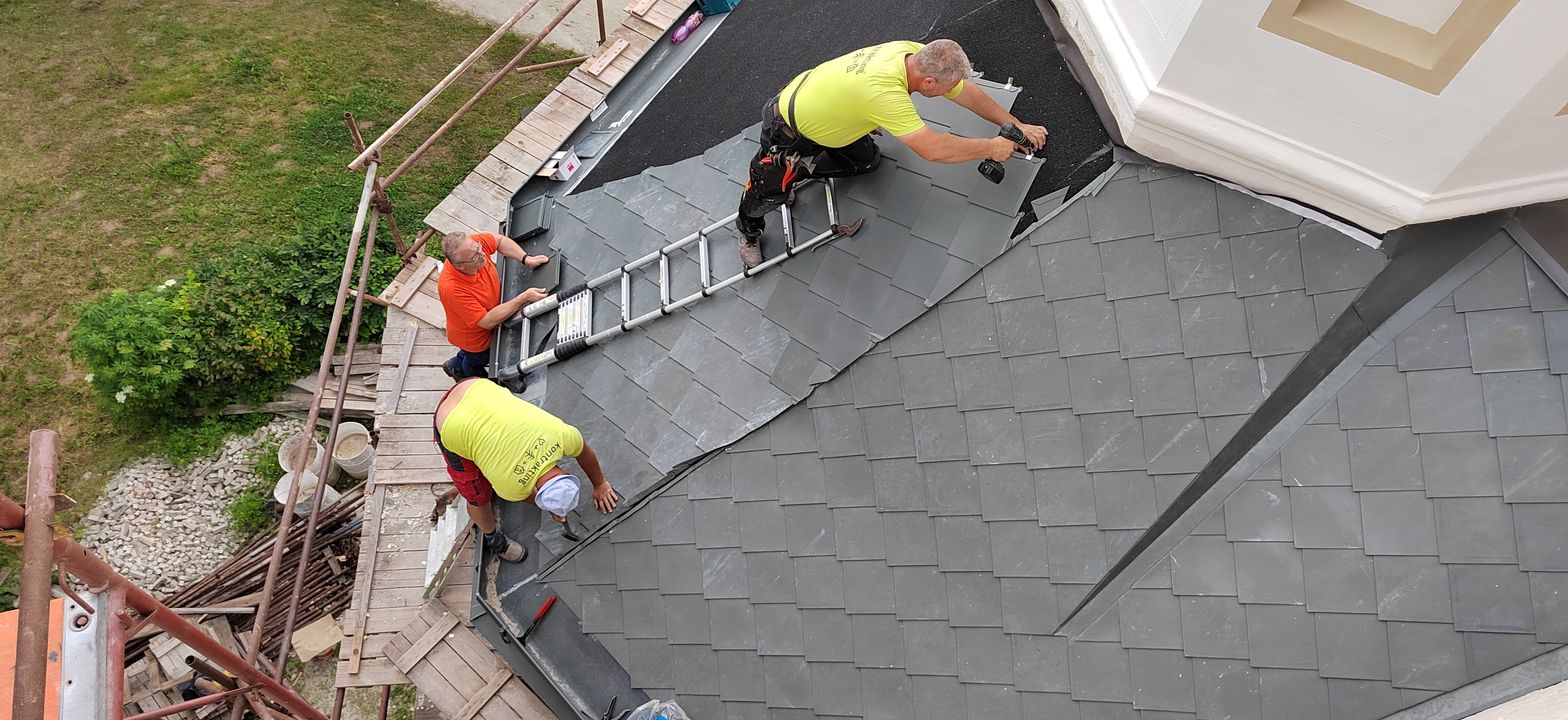 V prvej etape preto prebehla kompletná výmena krytín: na kaplnke sa pôvodný meďou oplechovaný helm nahradil titán-zinkovou šablónovou krytinou 30 × 30 cm, arkierové veže dostali nové dubové krovy a v podkroví kaštieľa bol inštalovaný súbor oceľových tiahel a pochôdznych lávok, ktorý stabilizuje krov a umožňuje revízny pohyb bez ďalšieho zaťaženia historických prvkov. Paralelne sa obnovila charakteristická „lastovičia“ atika: po demontáži sekundárnych cementových úprav boli profilované články doplnené vápennou ručne modelovanou omietkou a opatrené difúzne otvoreným minerálnym náterom.
