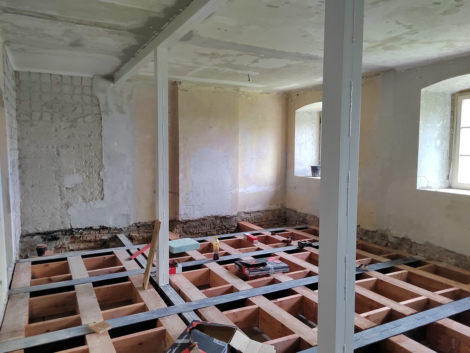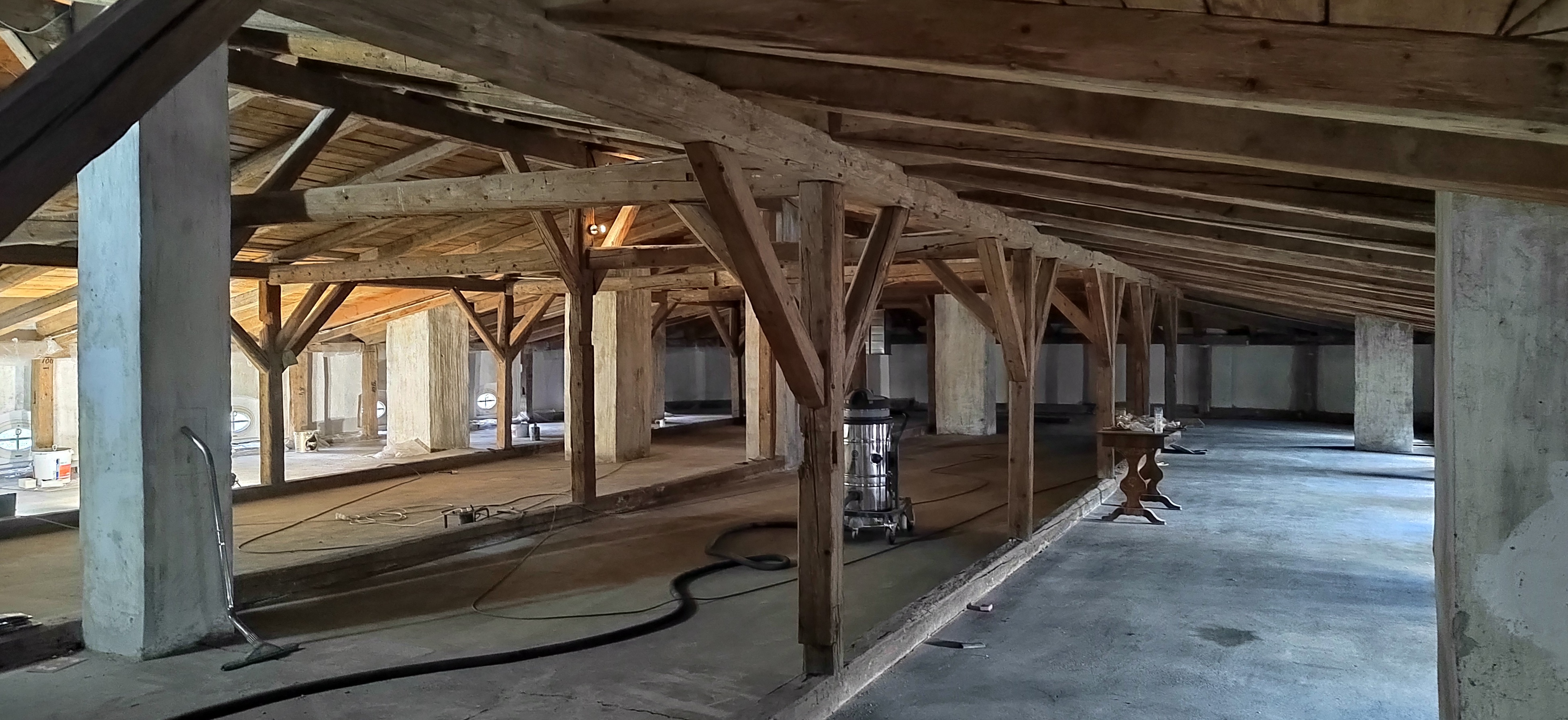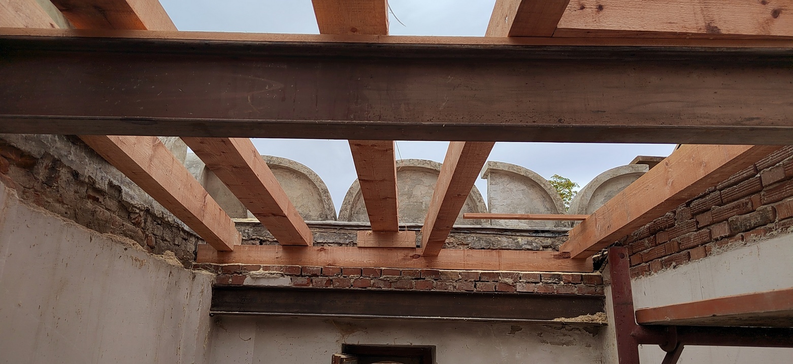 Statické výpočty potvrdili nedostatočnú únosnosť historického stropu nad druhým podlažím, preto bol vložený nový drevený rošt z hranolov 180 × 200 mm s rozponom 600 mm, vyplnený minerálnou izoláciou a zaklopený OSB doskami; riešenie umožnilo udržať historické omietky parteru a zároveň garantovať výstavné zaťaženie 5 kN/m². Súčasťou druhej etapy bola aj inštalácia výťahovej plošiny pre bezbariérové prepojenie medzi suterénom, prízemím a ateliérmi, nová elektroinštalácia s prípravou na rekuperačné vetranie a revitalizácia pivničných priestorov, kde vznikla malá vinotéka.