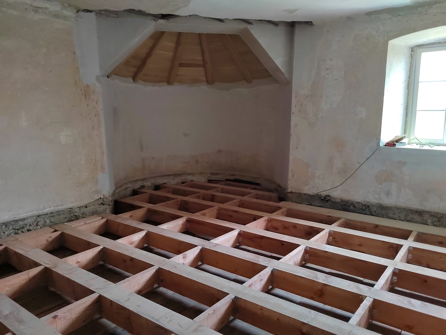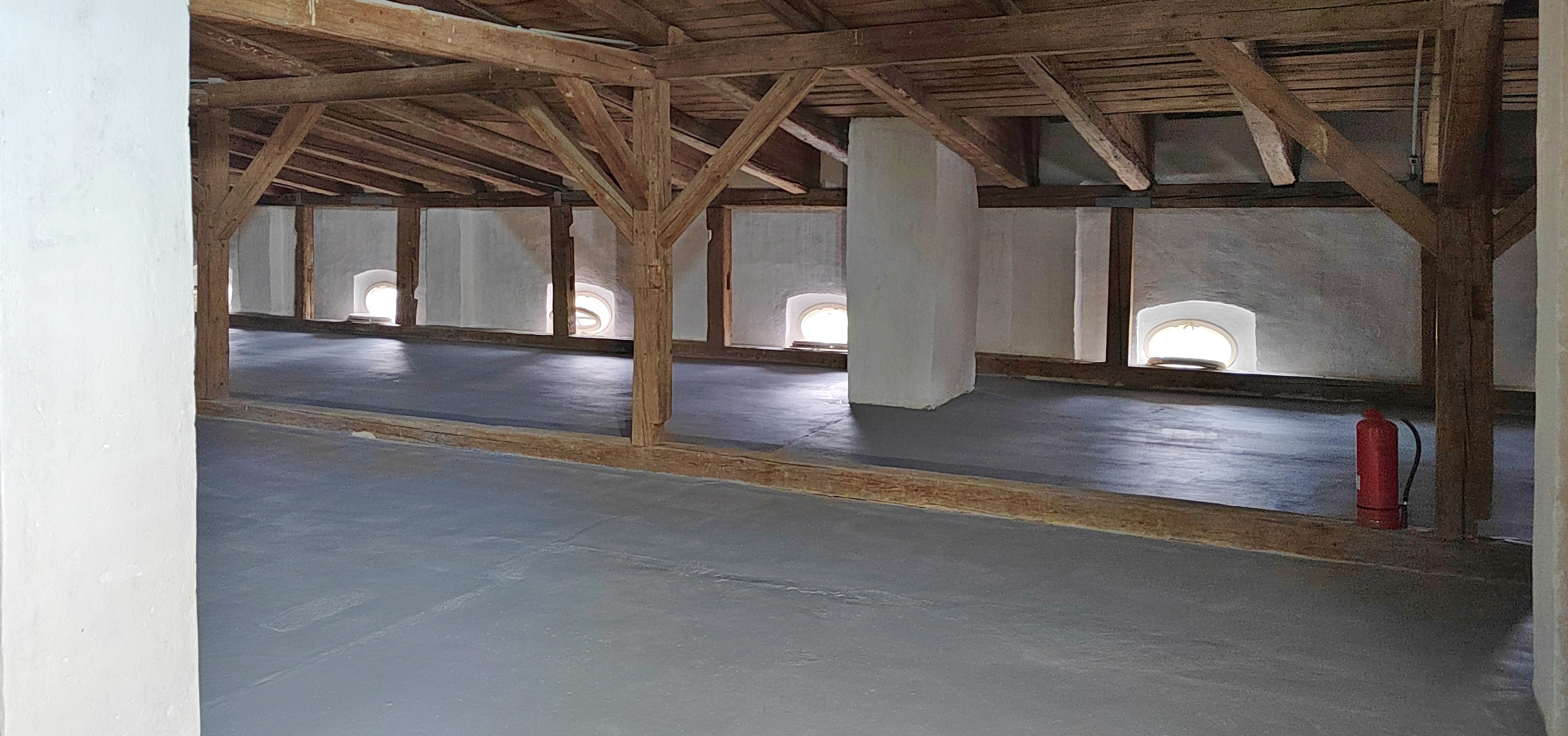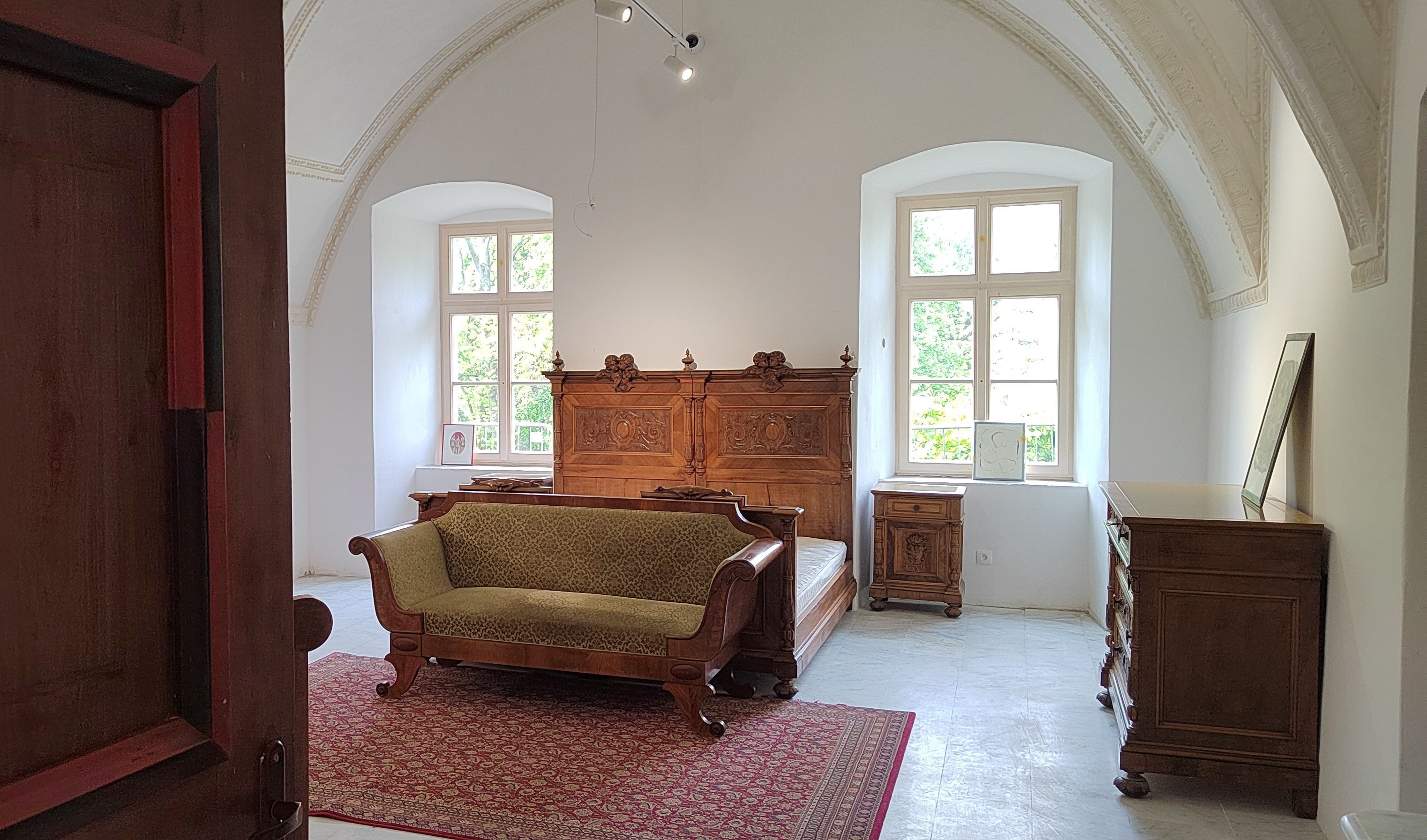 Statické výpočty potvrdili nedostatočnú únosnosť historického stropu nad druhým podlažím, preto bol vložený nový drevený rošt z hranolov 180 × 200 mm s rozponom 600 mm, vyplnený minerálnou izoláciou a zaklopený OSB doskami; riešenie umožnilo udržať historické omietky parteru a zároveň garantovať výstavné zaťaženie 5 kN/m². Súčasťou druhej etapy bola aj inštalácia výťahovej plošiny pre bezbariérové prepojenie medzi suterénom, prízemím a ateliérmi, nová elektroinštalácia s prípravou na rekuperačné vetranie a revitalizácia pivničných priestorov, kde vznikla malá vinotéka.