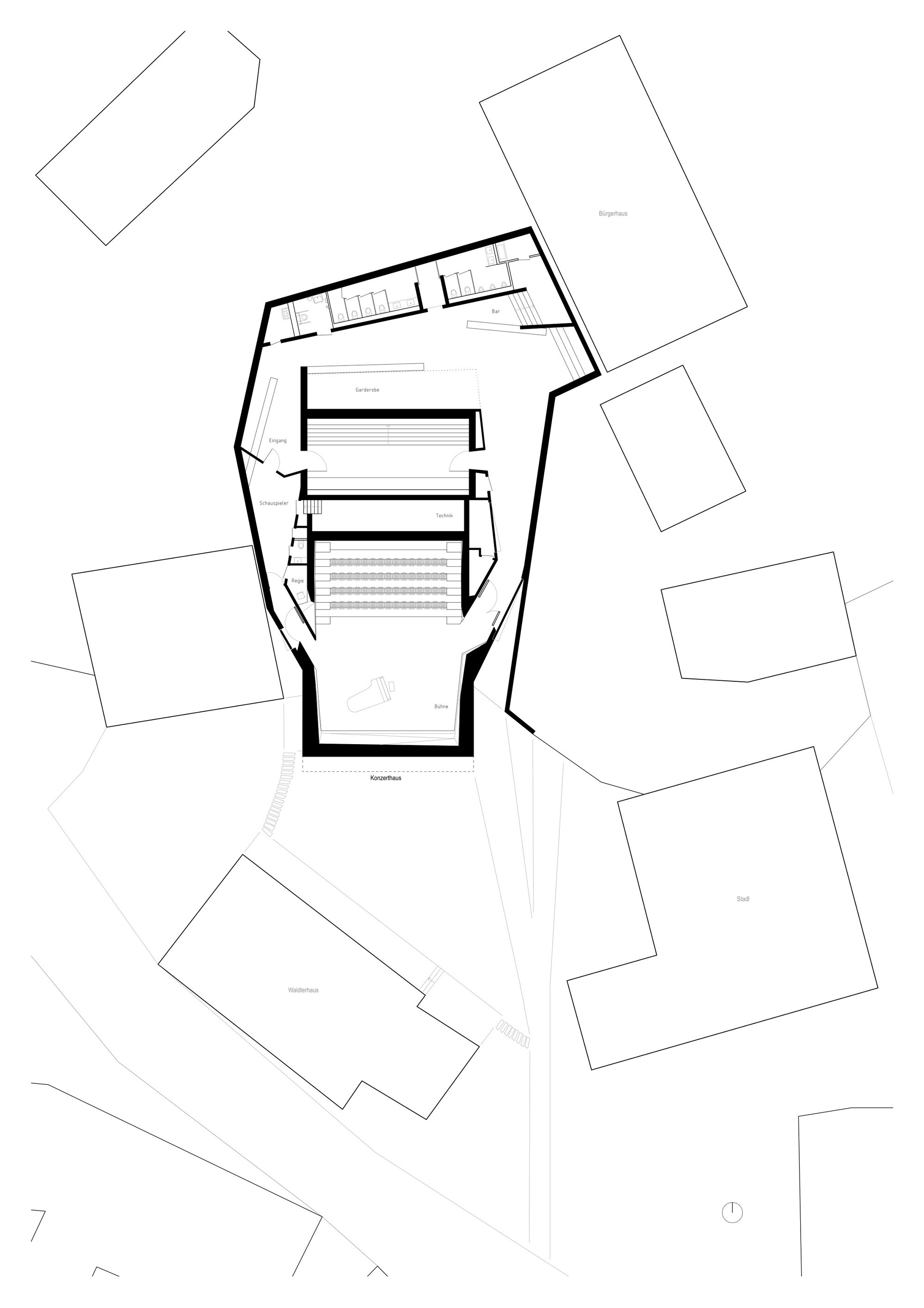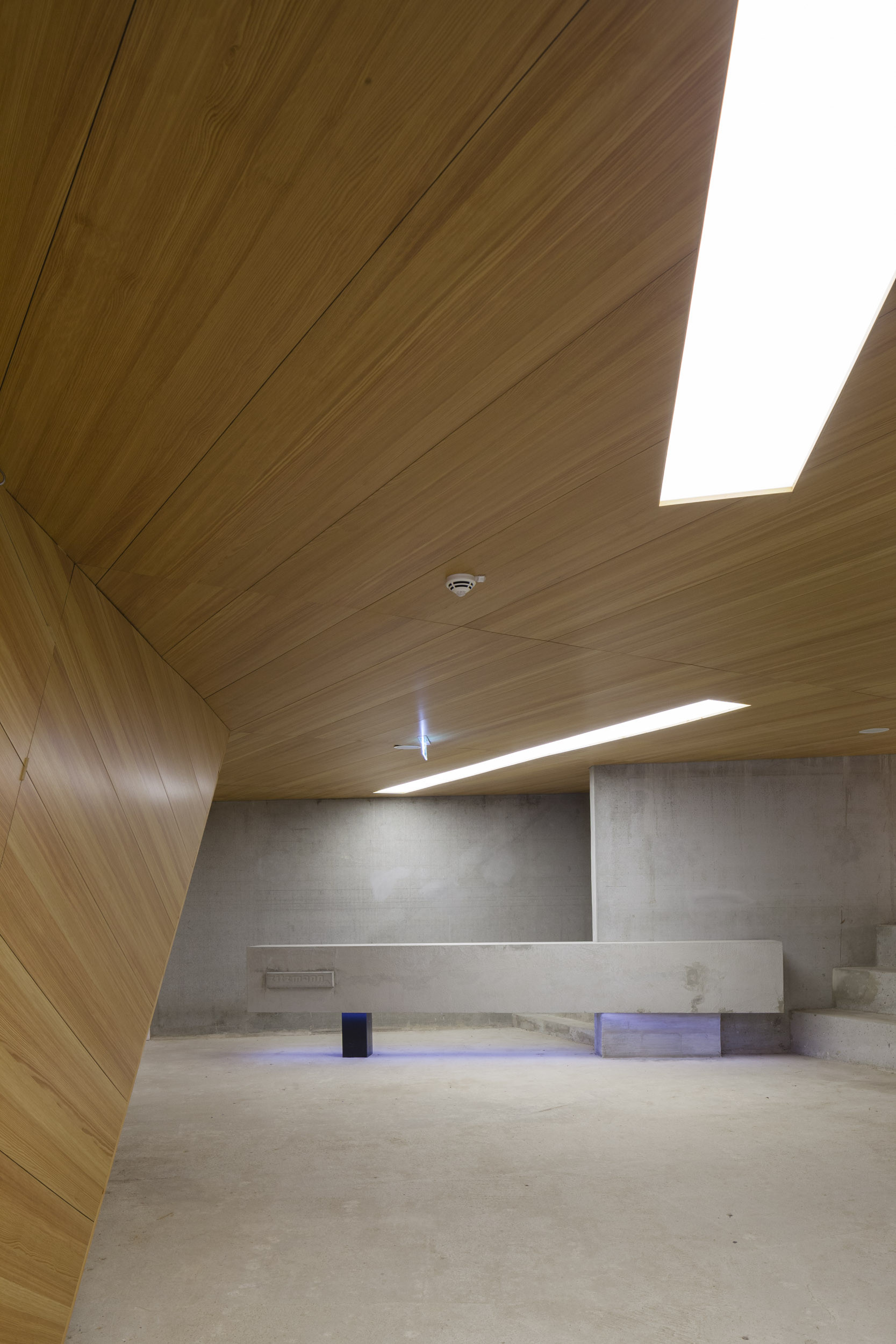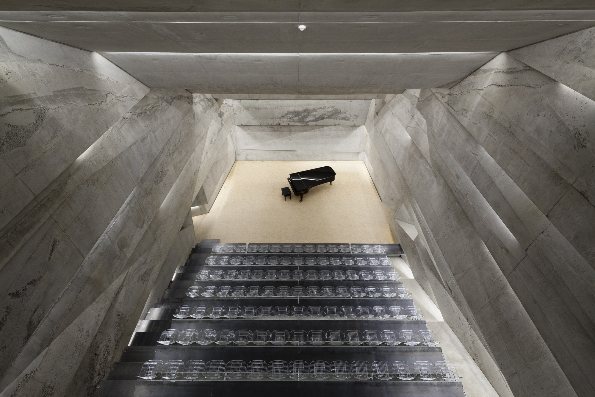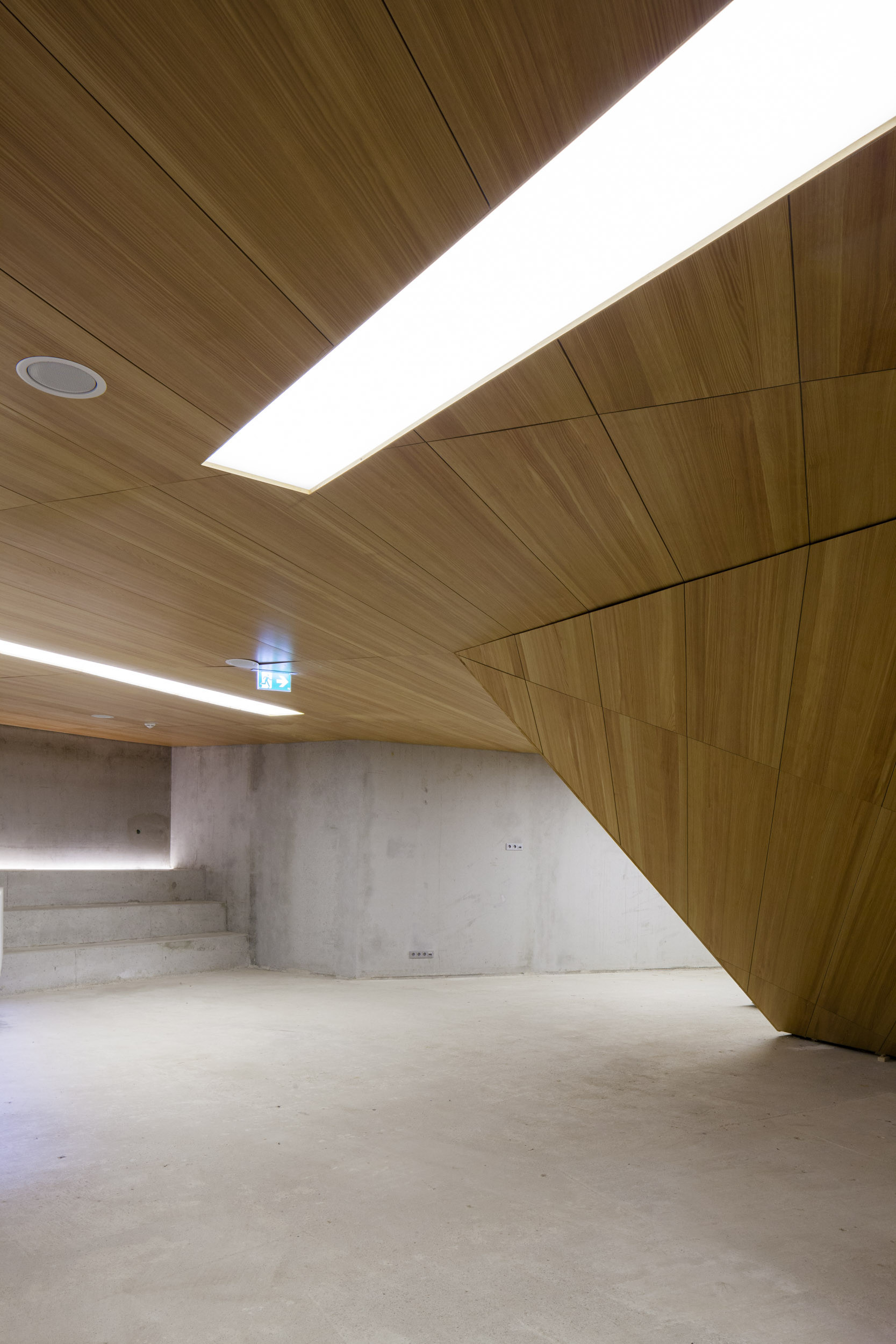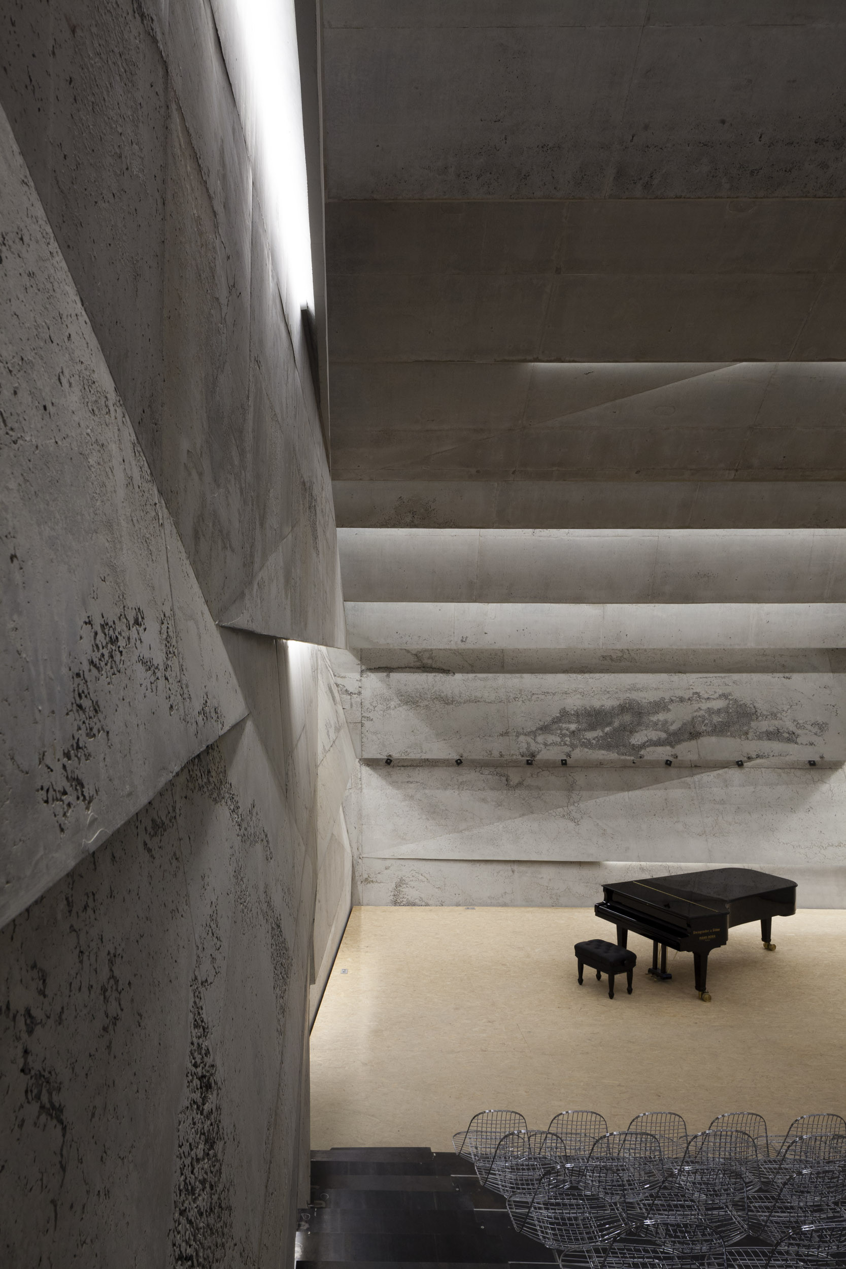 Zvažujúca sa hmota navádza návštevníkov na široké betónové schodisko vedúce do foyeru v podzemnom podlaží. Sekundárne priestory (šatne, toalety) sú skryté za stenami z drevených panelov. Sála s kapacitou 200 miest bola od začiatku navrhovaná ako miesto s kvalitnou akustikou. Medzi drsnými betónovými plochami v interiéri vznikajú štrbiny, ktoré sú vyplnené zvuk pohlcujúcimi materiálmi a slúžia aj ako tienidlá pre skryté lineárne LED svietidlá. Toto riešenie spolu s riešením sedenia zamedzuje neželaným odrazom a zaručuje čistý zvuk.