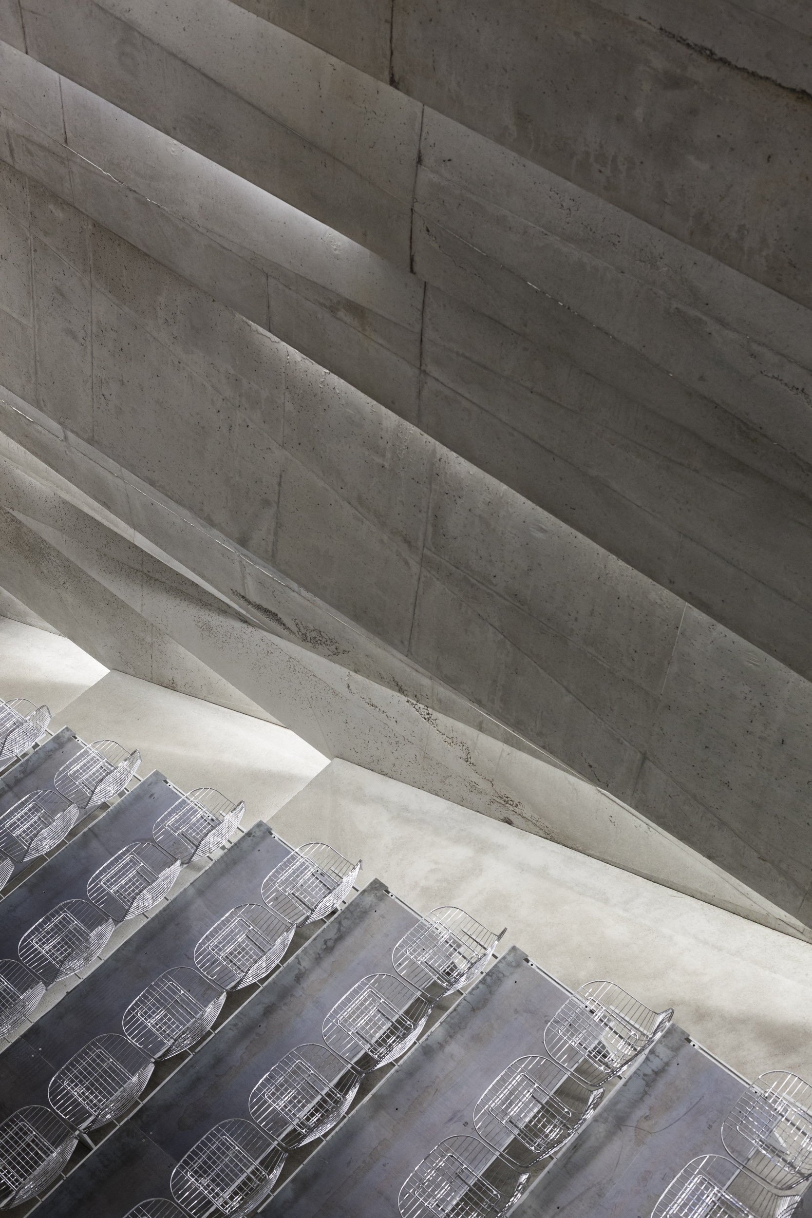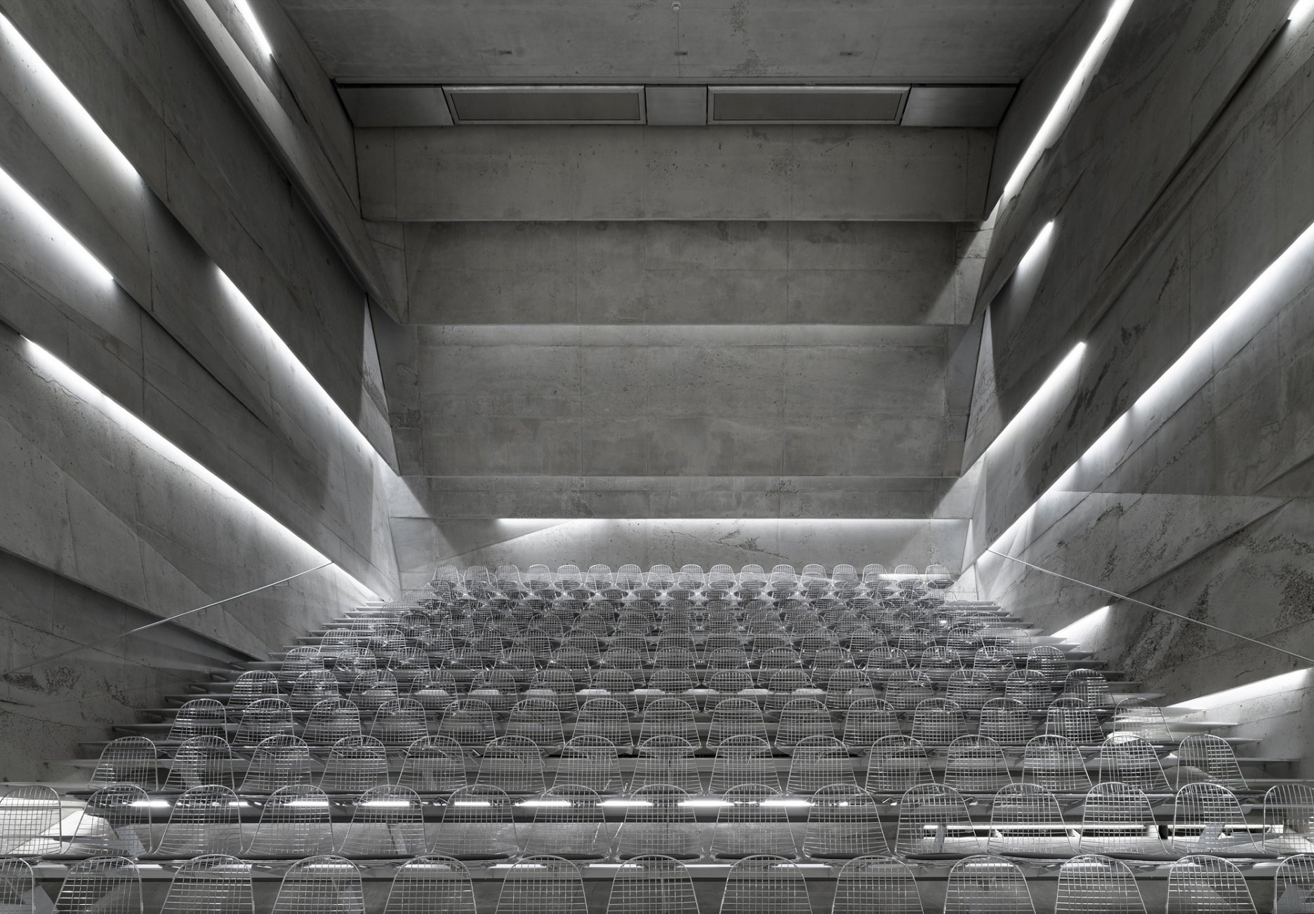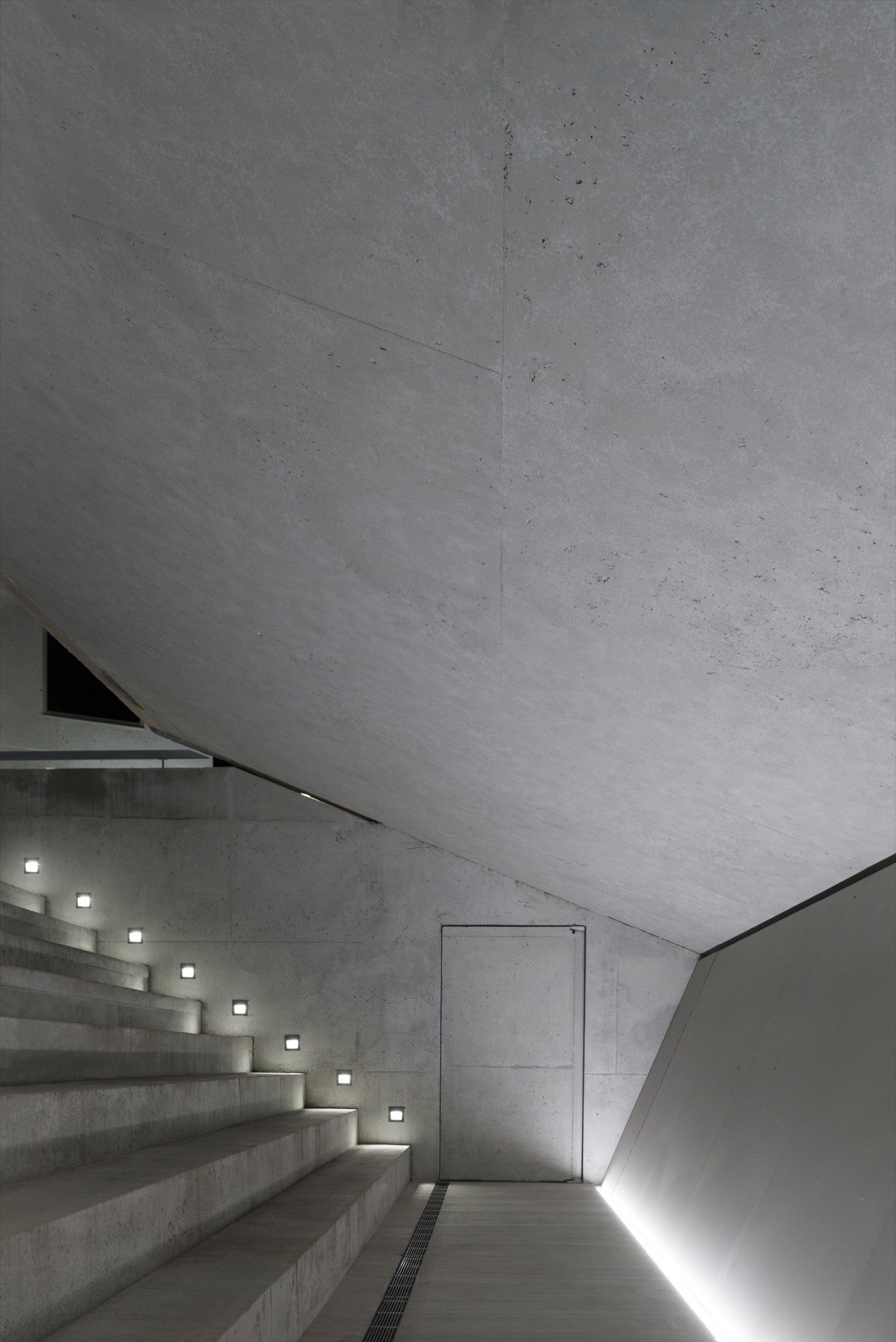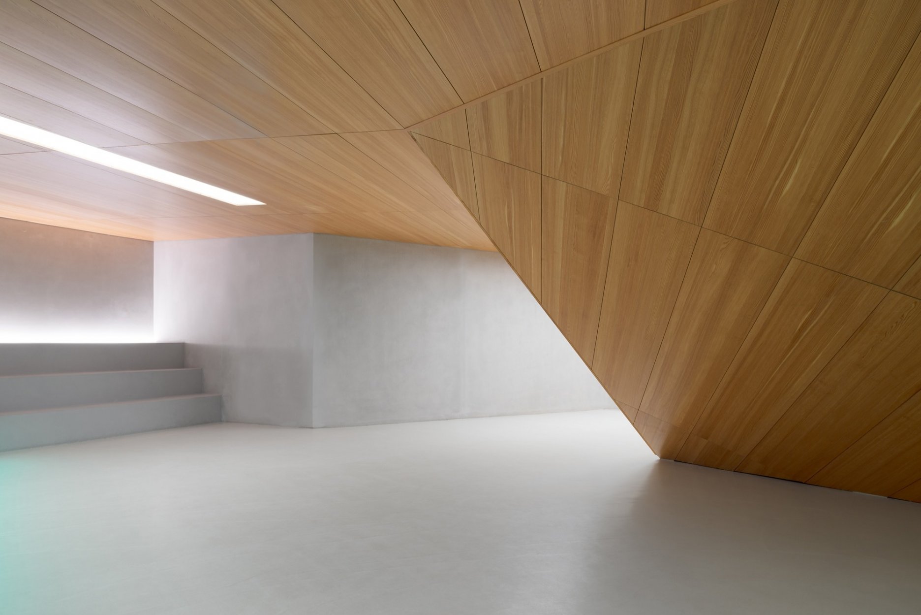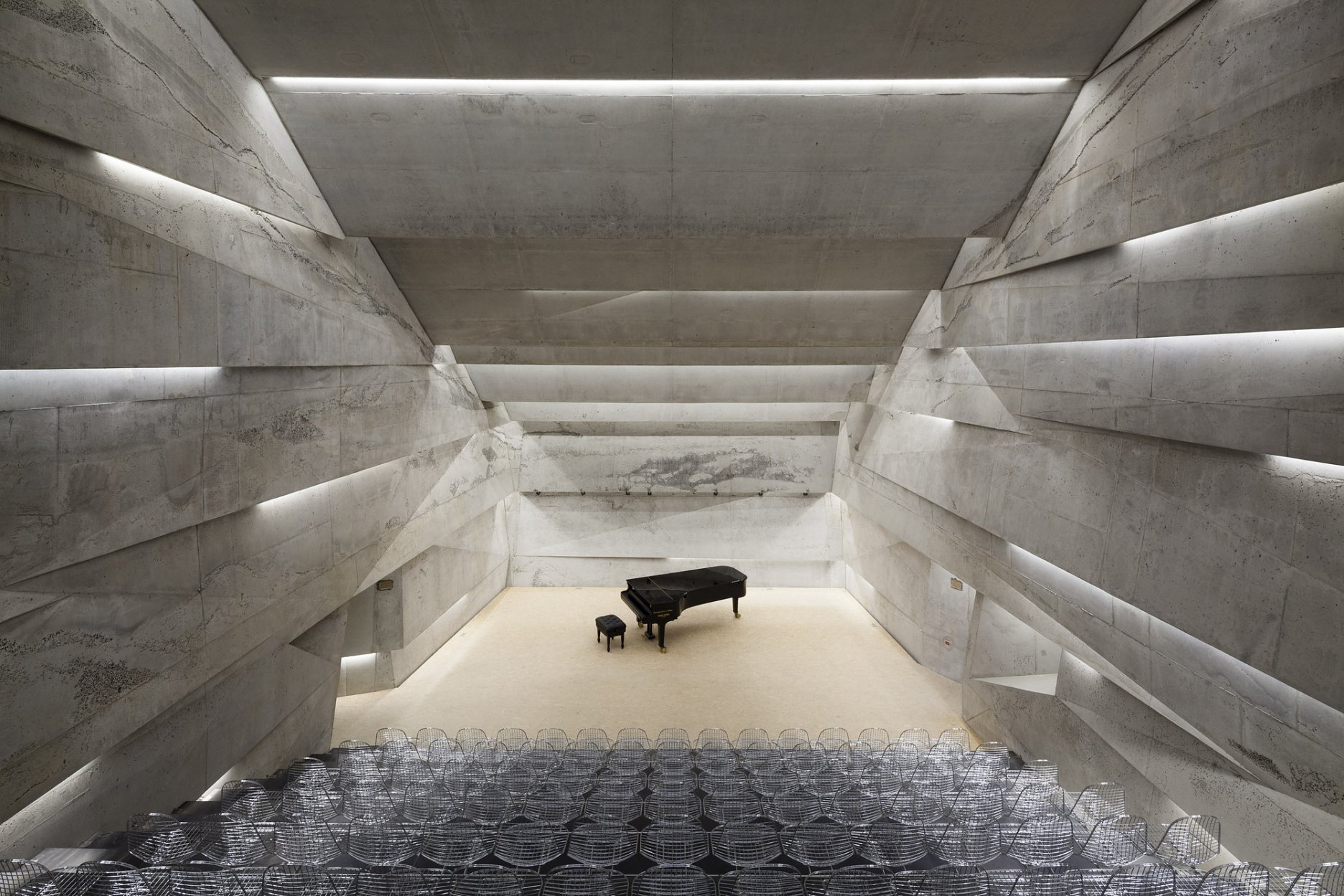 Zvažujúca sa hmota navádza návštevníkov na široké betónové schodisko vedúce do foyeru v podzemnom podlaží. Sekundárne priestory (šatne, toalety) sú skryté za stenami z drevených panelov. Sála s kapacitou 200 miest bola od začiatku navrhovaná ako miesto s kvalitnou akustikou. Medzi drsnými betónovými plochami v interiéri vznikajú štrbiny, ktoré sú vyplnené zvuk pohlcujúcimi materiálmi a slúžia aj ako tienidlá pre skryté lineárne LED svietidlá. Toto riešenie spolu s riešením sedenia zamedzuje neželaným odrazom a zaručuje čistý zvuk.