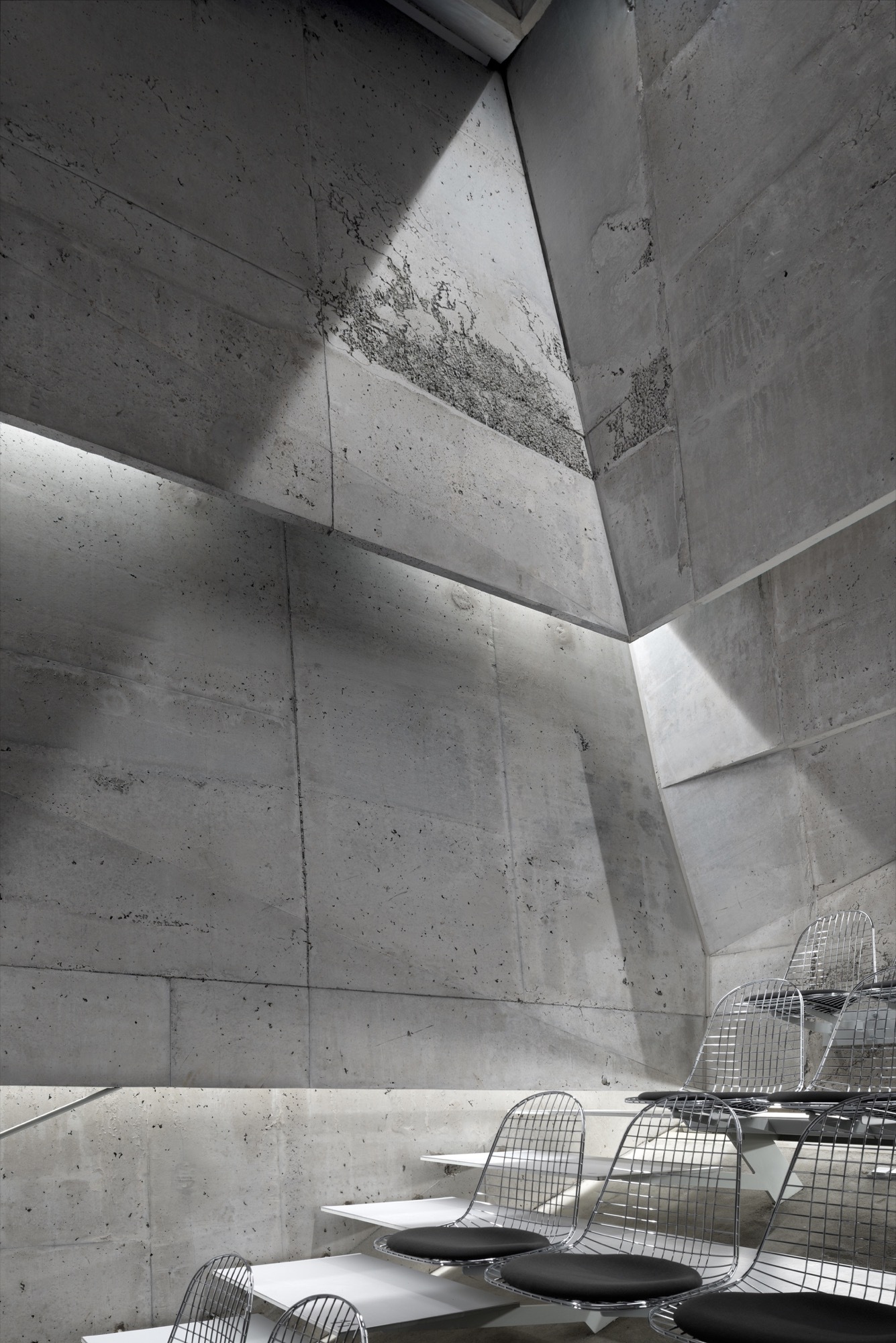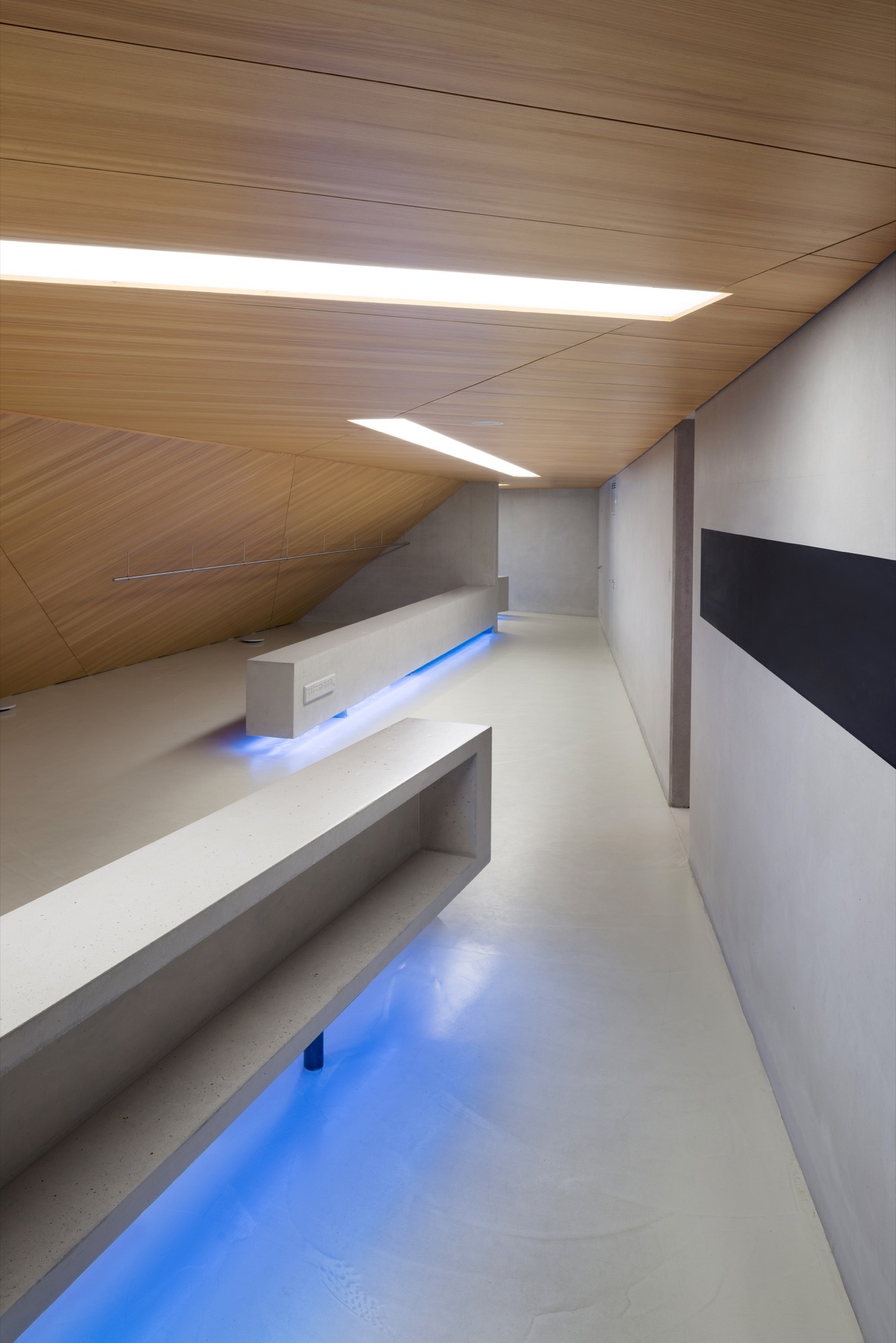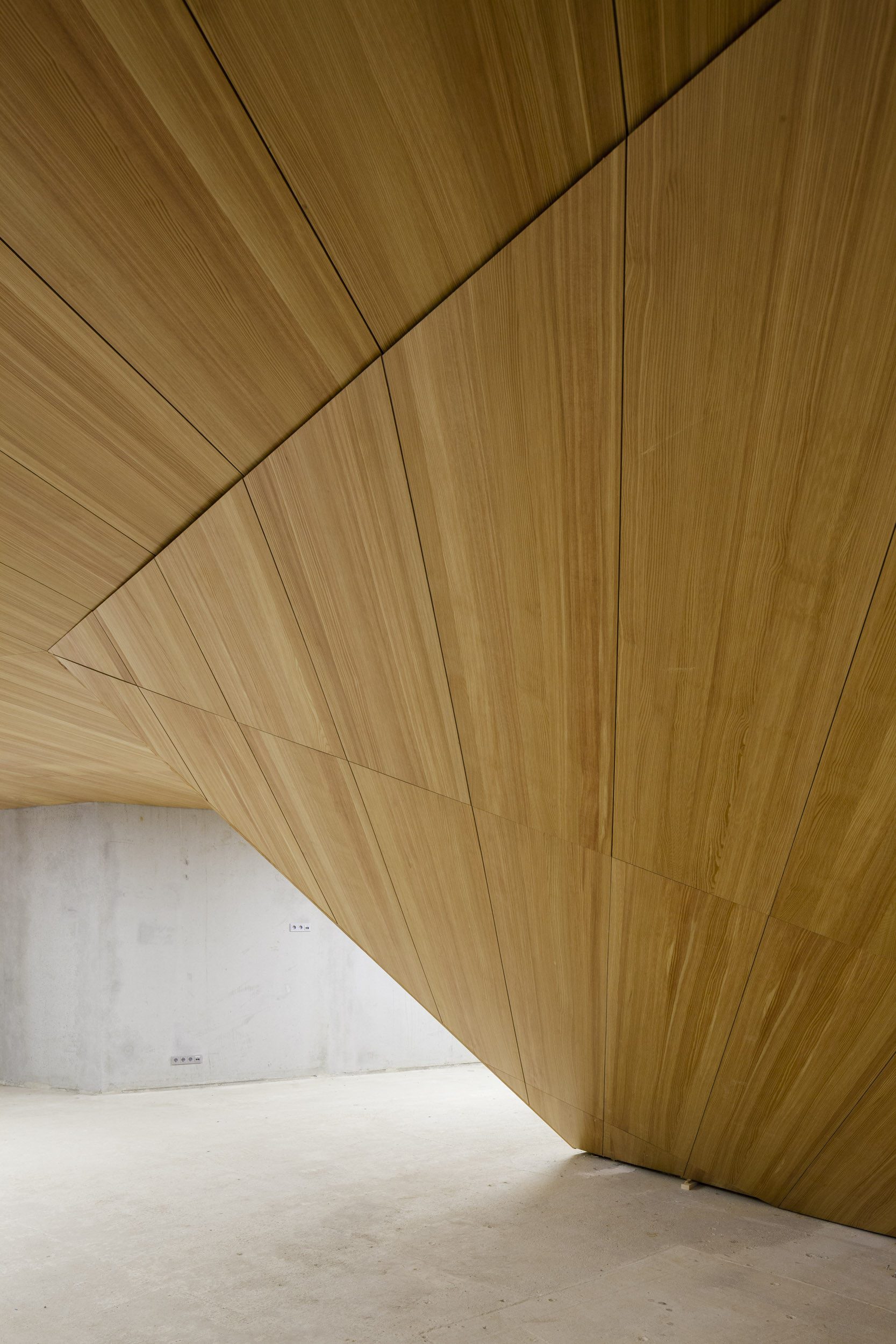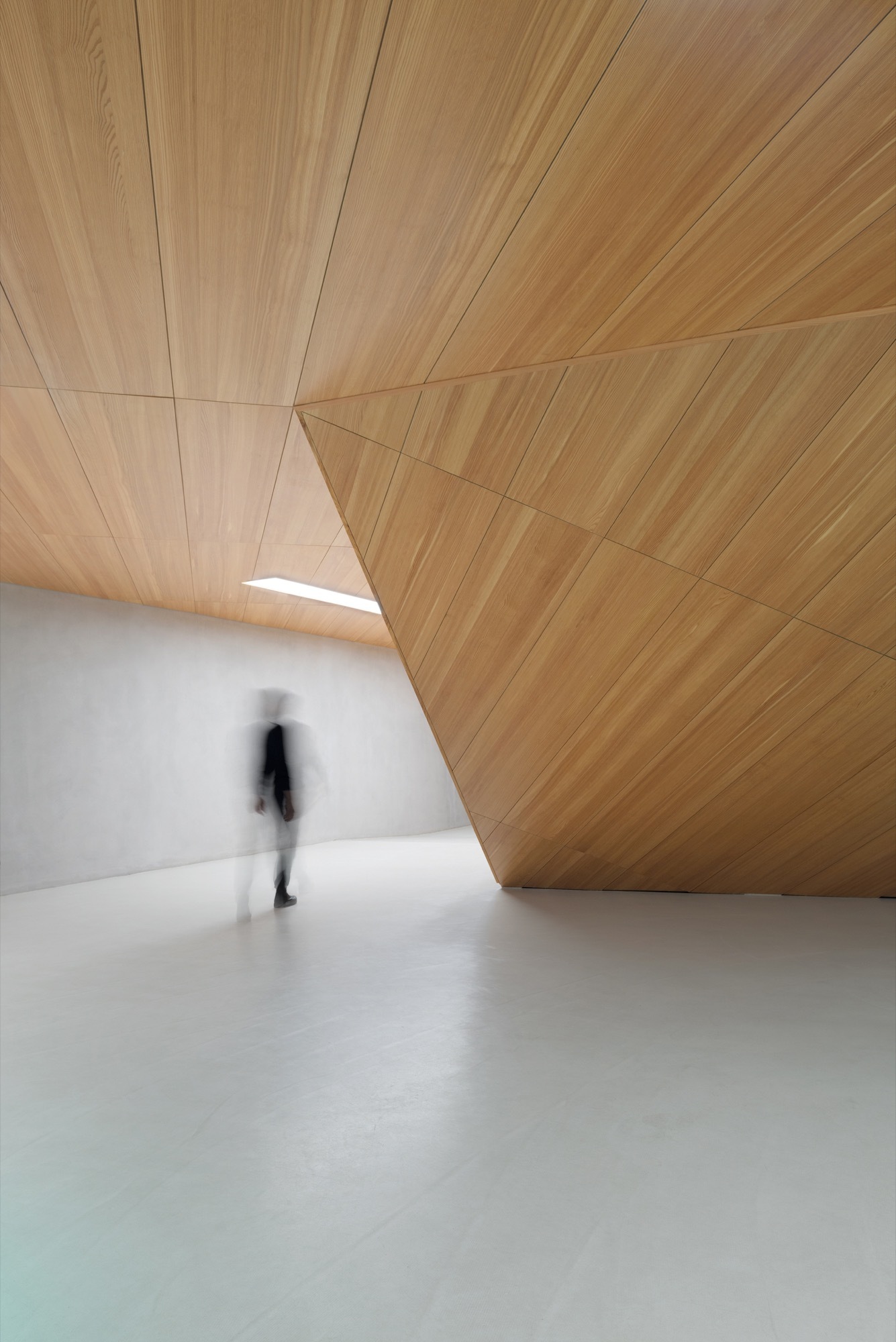 Zvažujúca sa hmota navádza návštevníkov na široké betónové schodisko vedúce do foyeru v podzemnom podlaží. Sekundárne priestory (šatne, toalety) sú skryté za stenami z drevených panelov. Sála s kapacitou 200 miest bola od začiatku navrhovaná ako miesto s kvalitnou akustikou. Medzi drsnými betónovými plochami v interiéri vznikajú štrbiny, ktoré sú vyplnené zvuk pohlcujúcimi materiálmi a slúžia aj ako tienidlá pre skryté lineárne LED svietidlá. Toto riešenie spolu s riešením sedenia zamedzuje neželaným odrazom a zaručuje čistý zvuk.