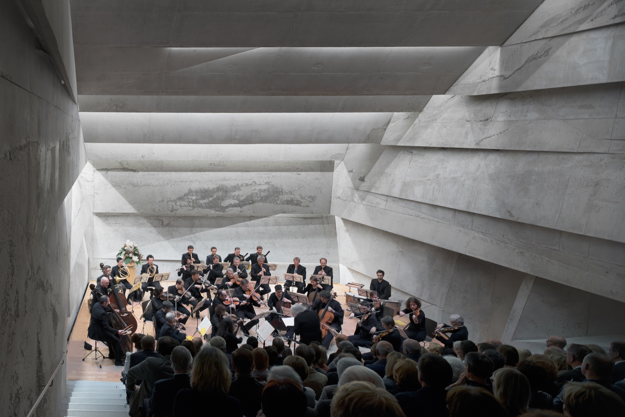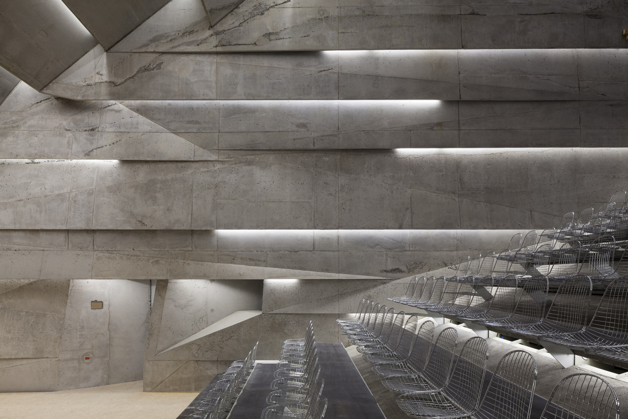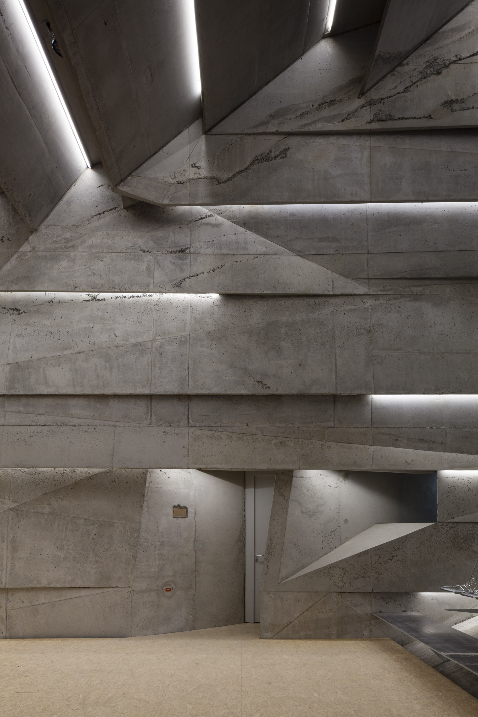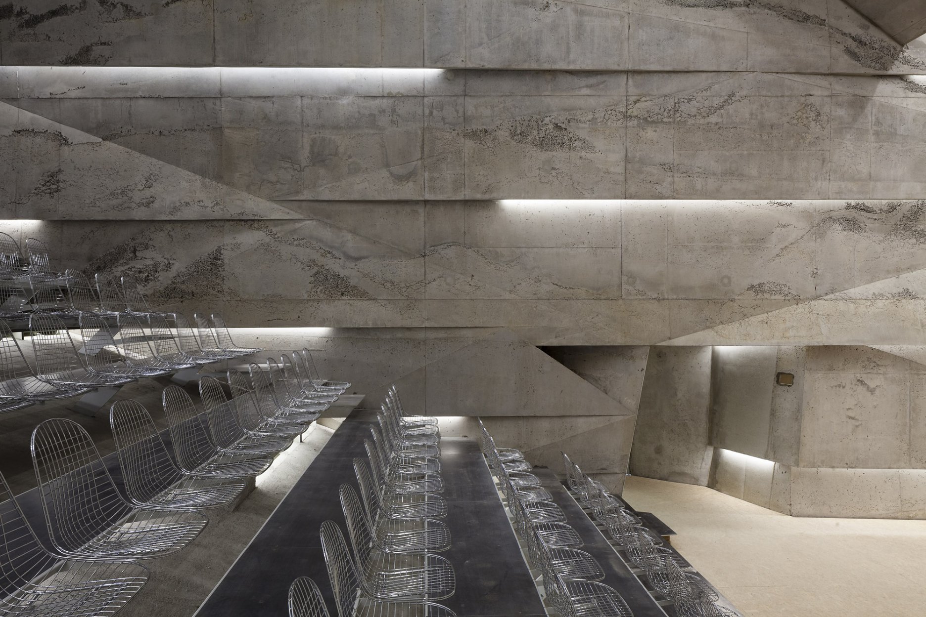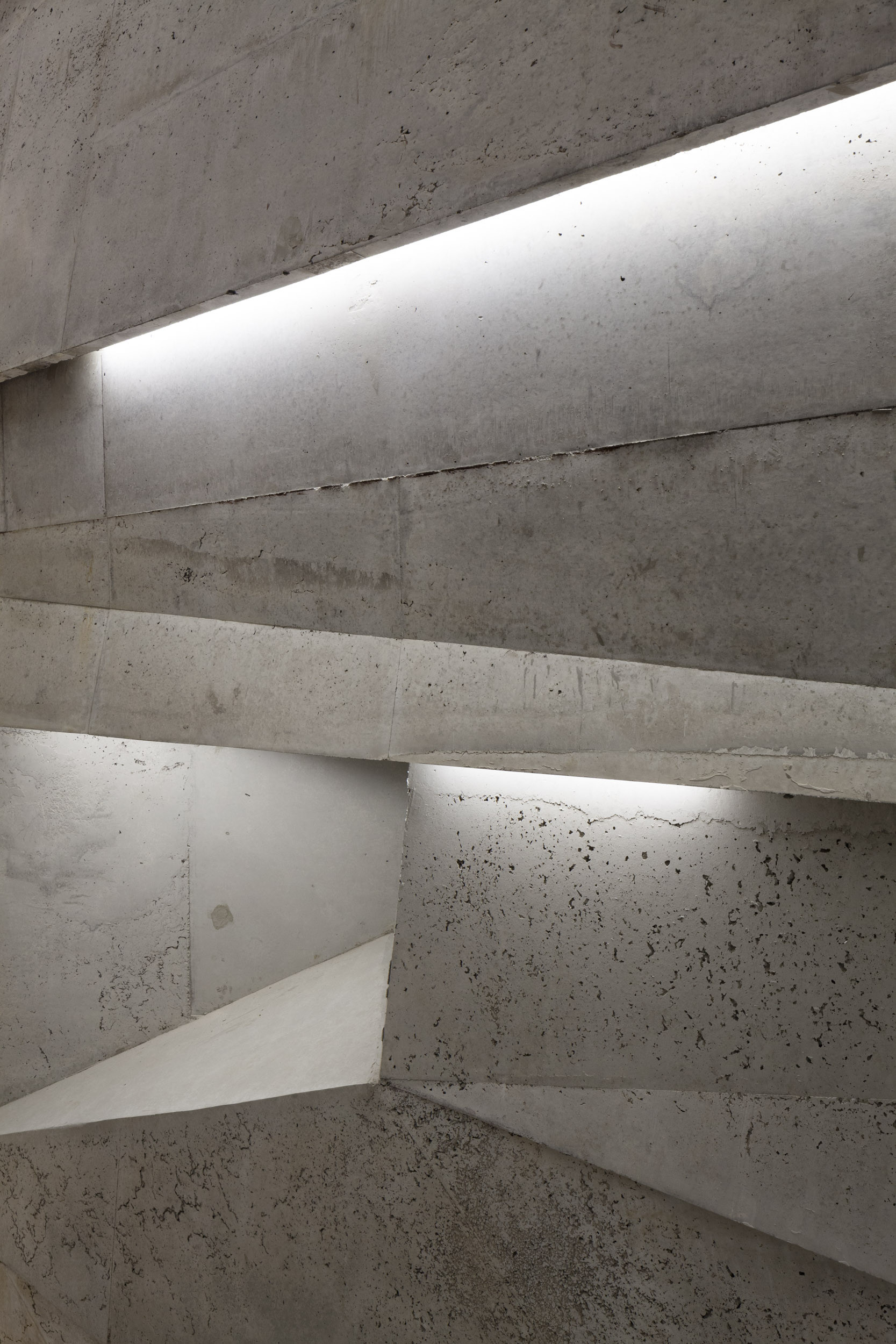Zvažujúca sa hmota navádza návštevníkov na široké betónové schodisko vedúce do foyeru v podzemnom podlaží. Sekundárne priestory (šatne, toalety) sú skryté za stenami z drevených panelov. Sála s kapacitou 200 miest bola od začiatku navrhovaná ako miesto s kvalitnou akustikou. Medzi drsnými betónovými plochami v interiéri vznikajú štrbiny, ktoré sú vyplnené zvuk pohlcujúcimi materiálmi a slúžia aj ako tienidlá pre skryté lineárne LED svietidlá. Toto riešenie spolu s riešením sedenia zamedzuje neželaným odrazom a zaručuje čistý zvuk.