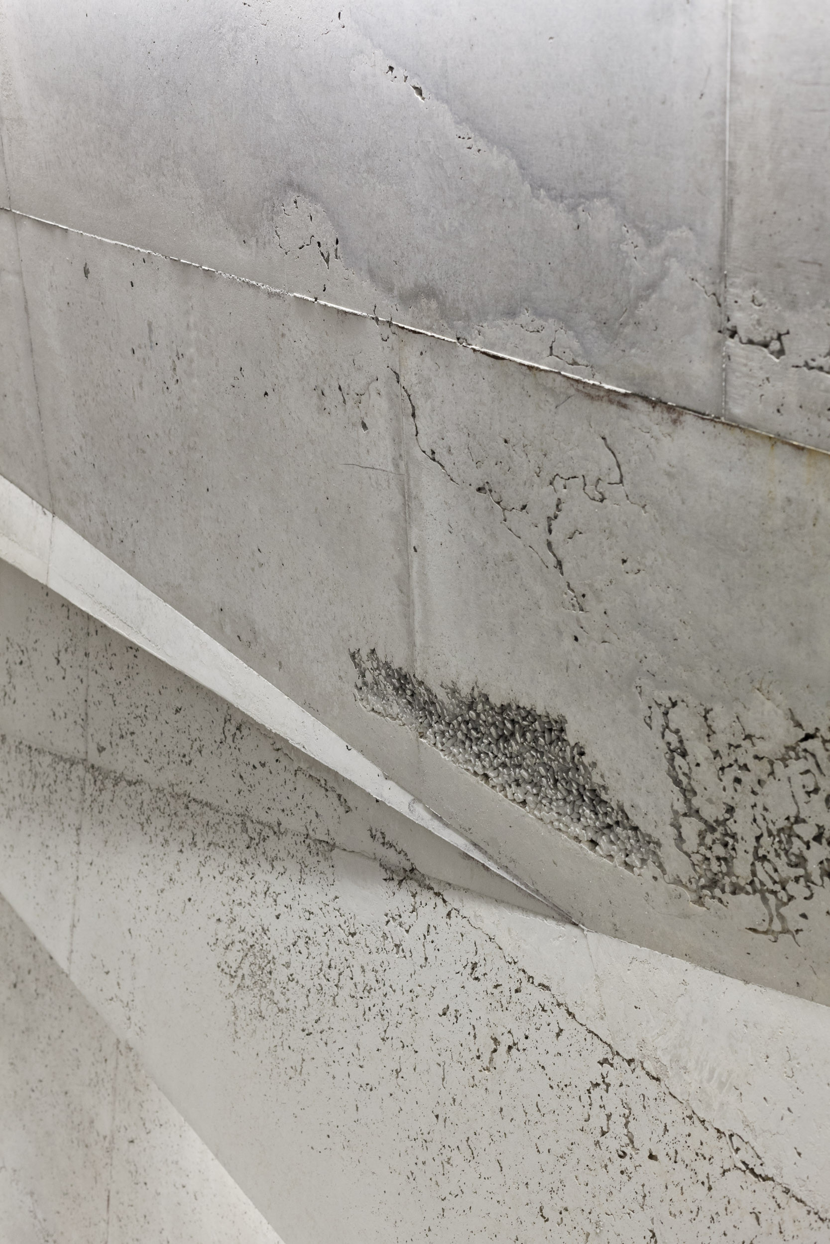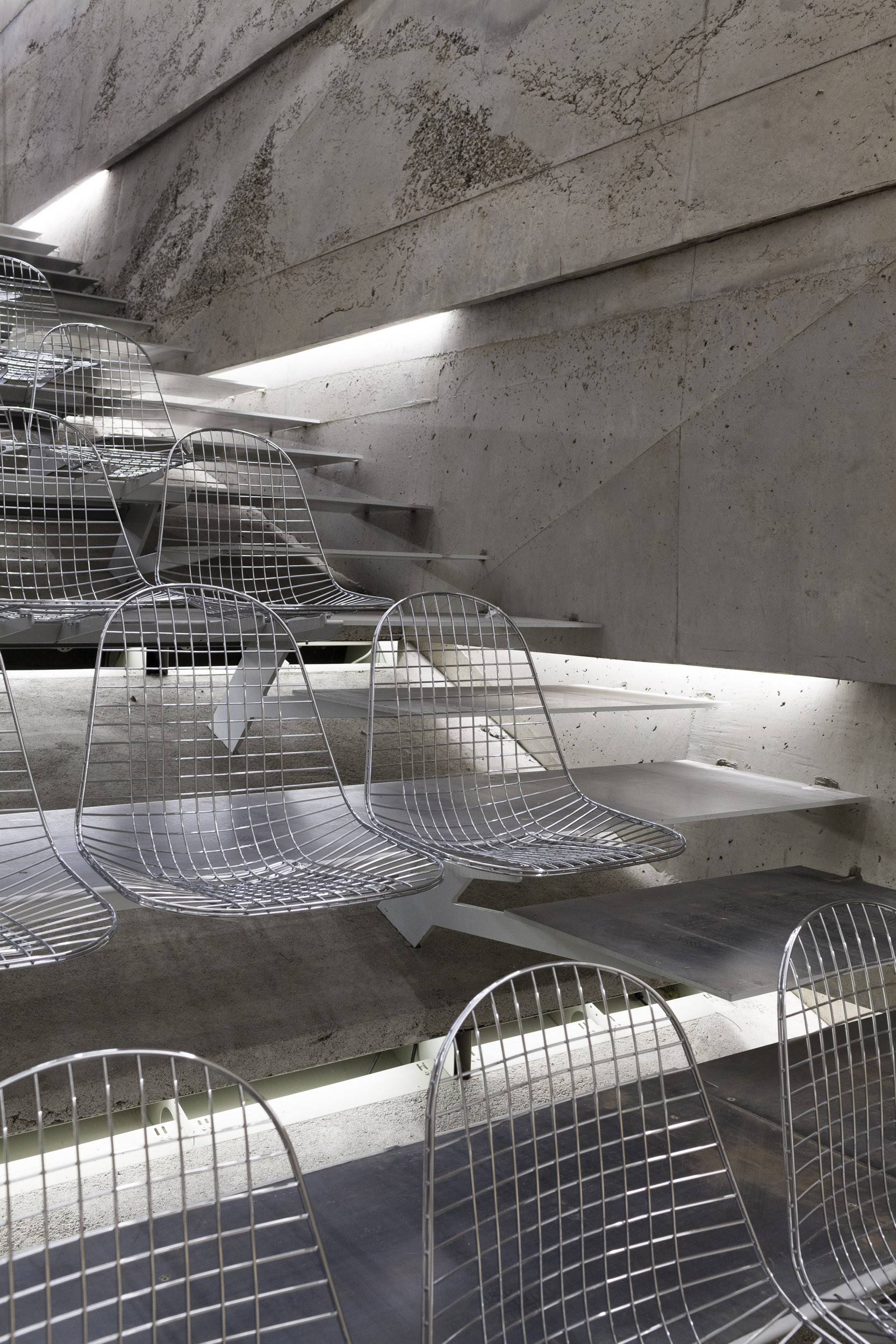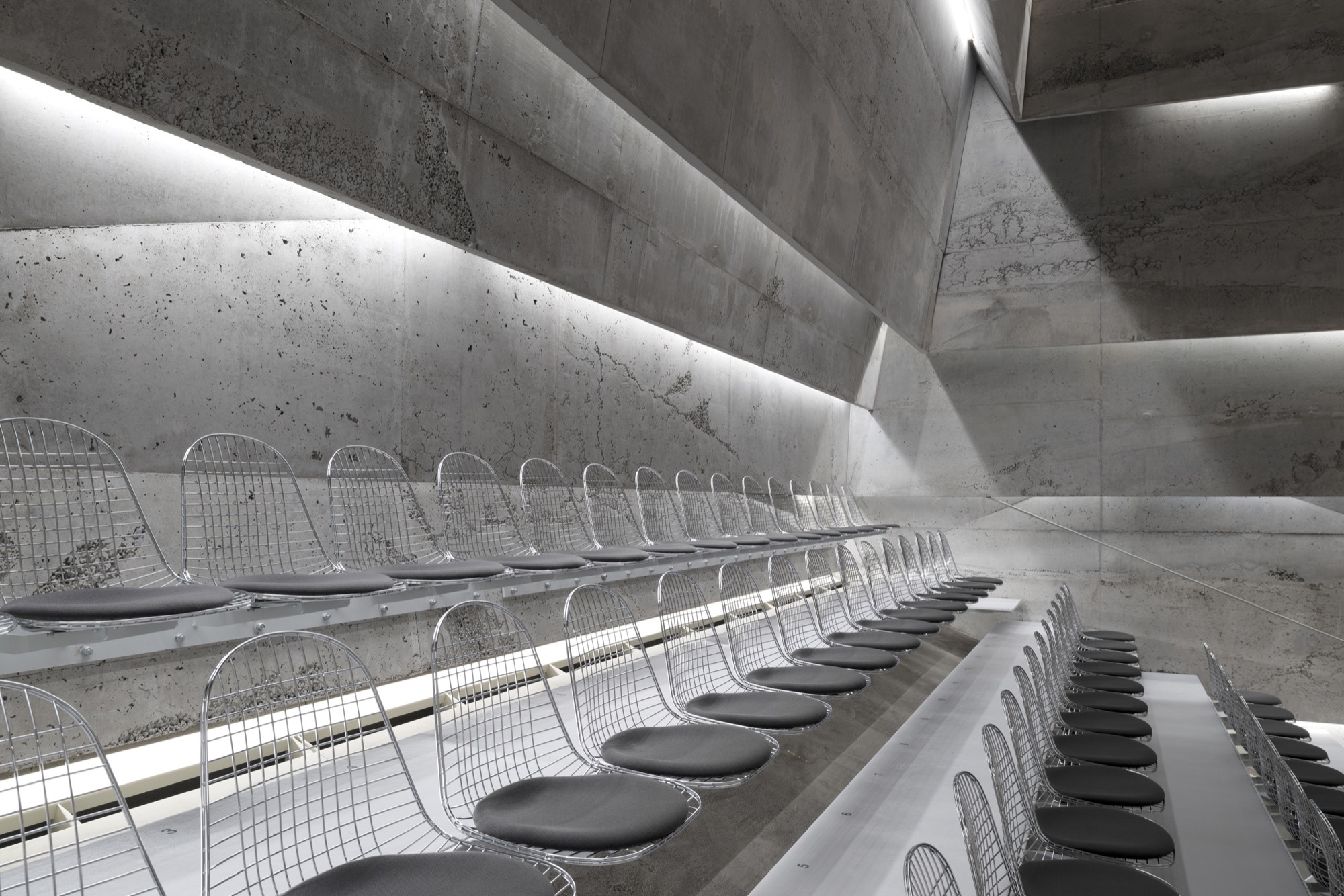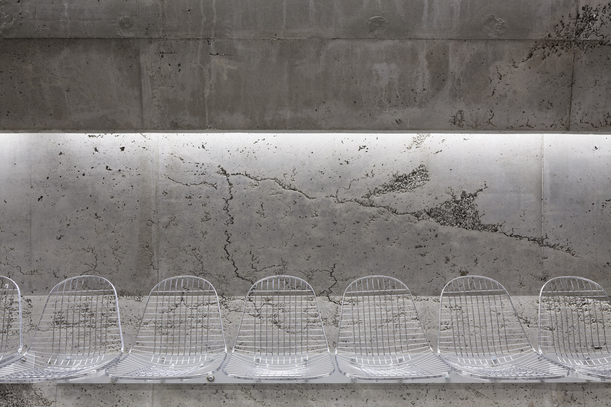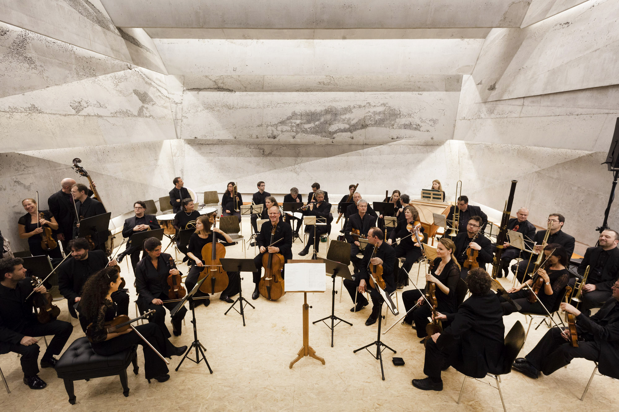 Zvažujúca sa hmota navádza návštevníkov na široké betónové schodisko vedúce do foyeru v podzemnom podlaží. Sekundárne priestory (šatne, toalety) sú skryté za stenami z drevených panelov. Sála s kapacitou 200 miest bola od začiatku navrhovaná ako miesto s kvalitnou akustikou. Medzi drsnými betónovými plochami v interiéri vznikajú štrbiny, ktoré sú vyplnené zvuk pohlcujúcimi materiálmi a slúžia aj ako tienidlá pre skryté lineárne LED svietidlá. Toto riešenie spolu s riešením sedenia zamedzuje neželaným odrazom a zaručuje čistý zvuk.
