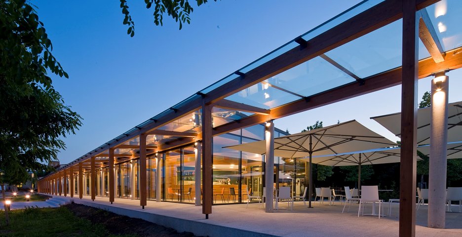 Pozdĺžne osi tvorí obvodová stena, rad okrúhlych betónových stĺpov a zvislá drevená konštrukcia väzníkov, prostredníctvom ktorej je stavba kontinuálne prepojená s parkom.