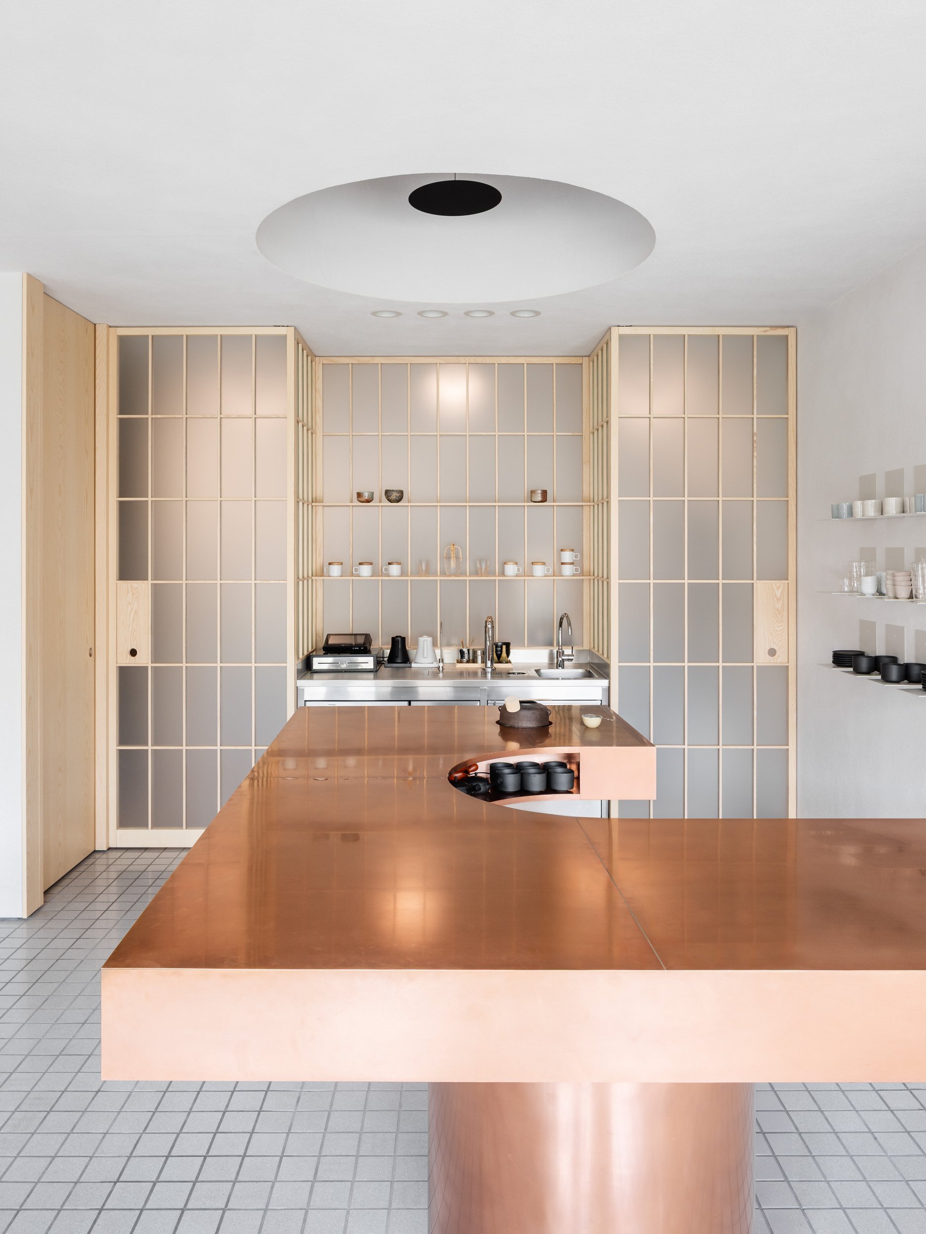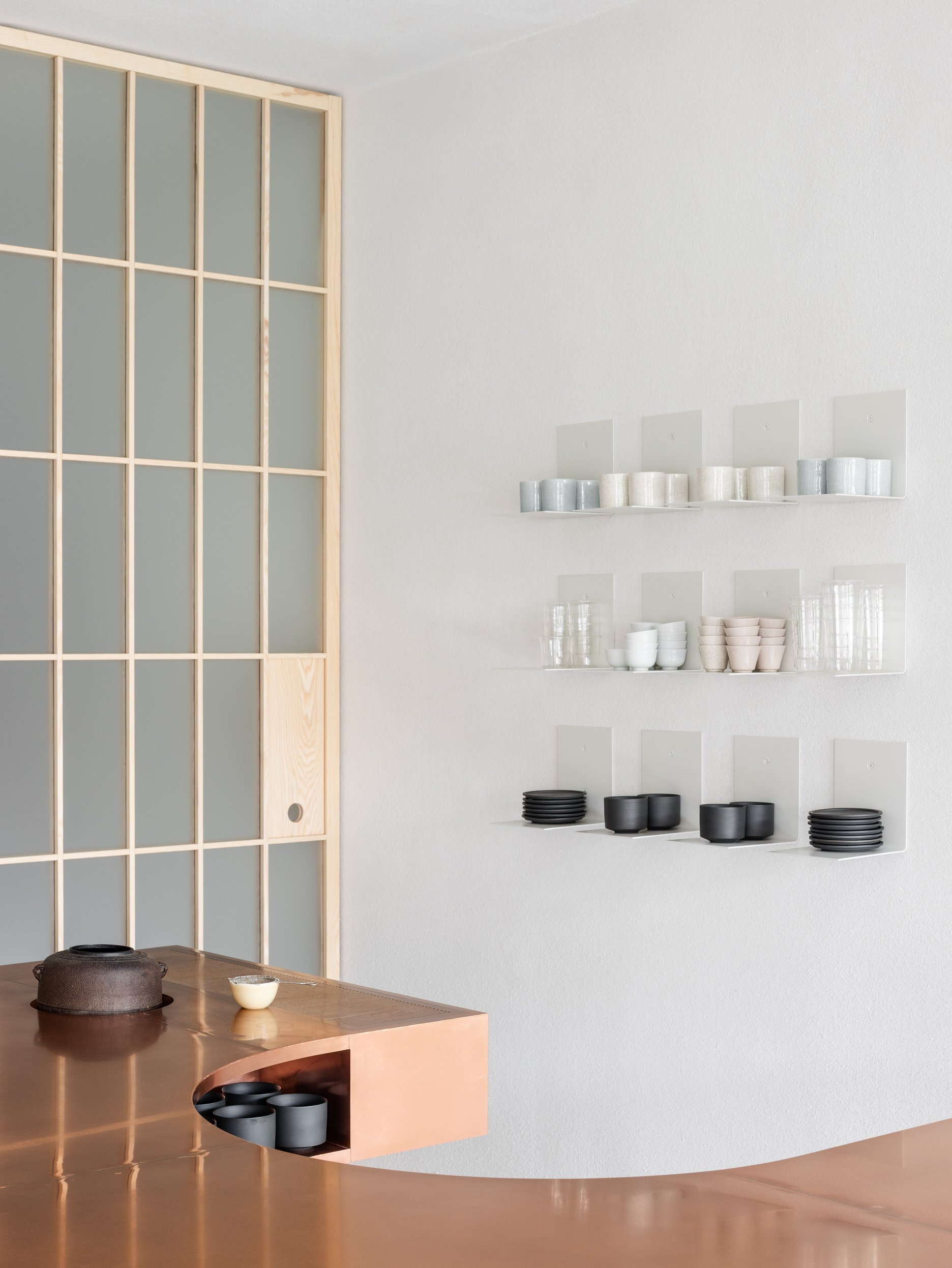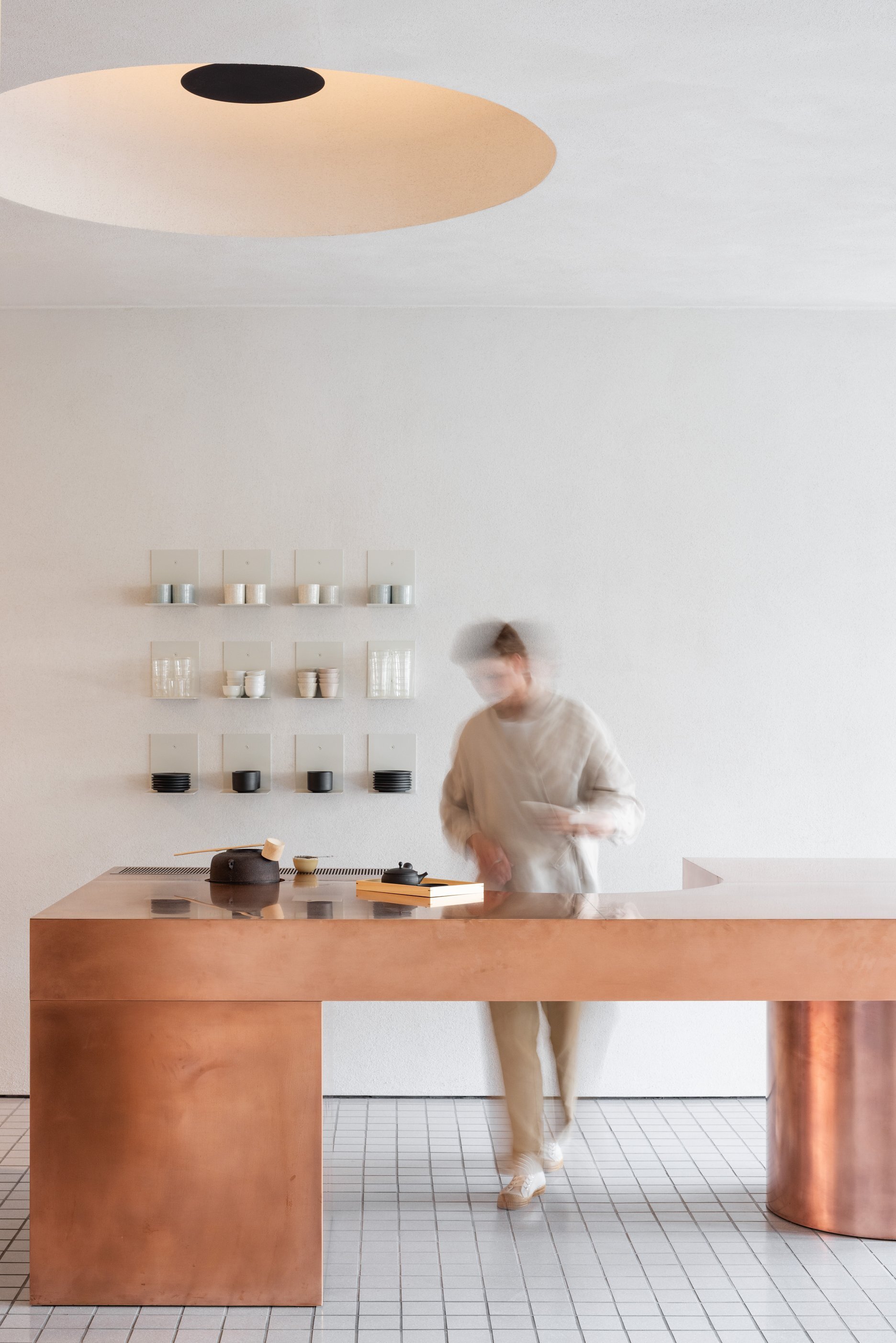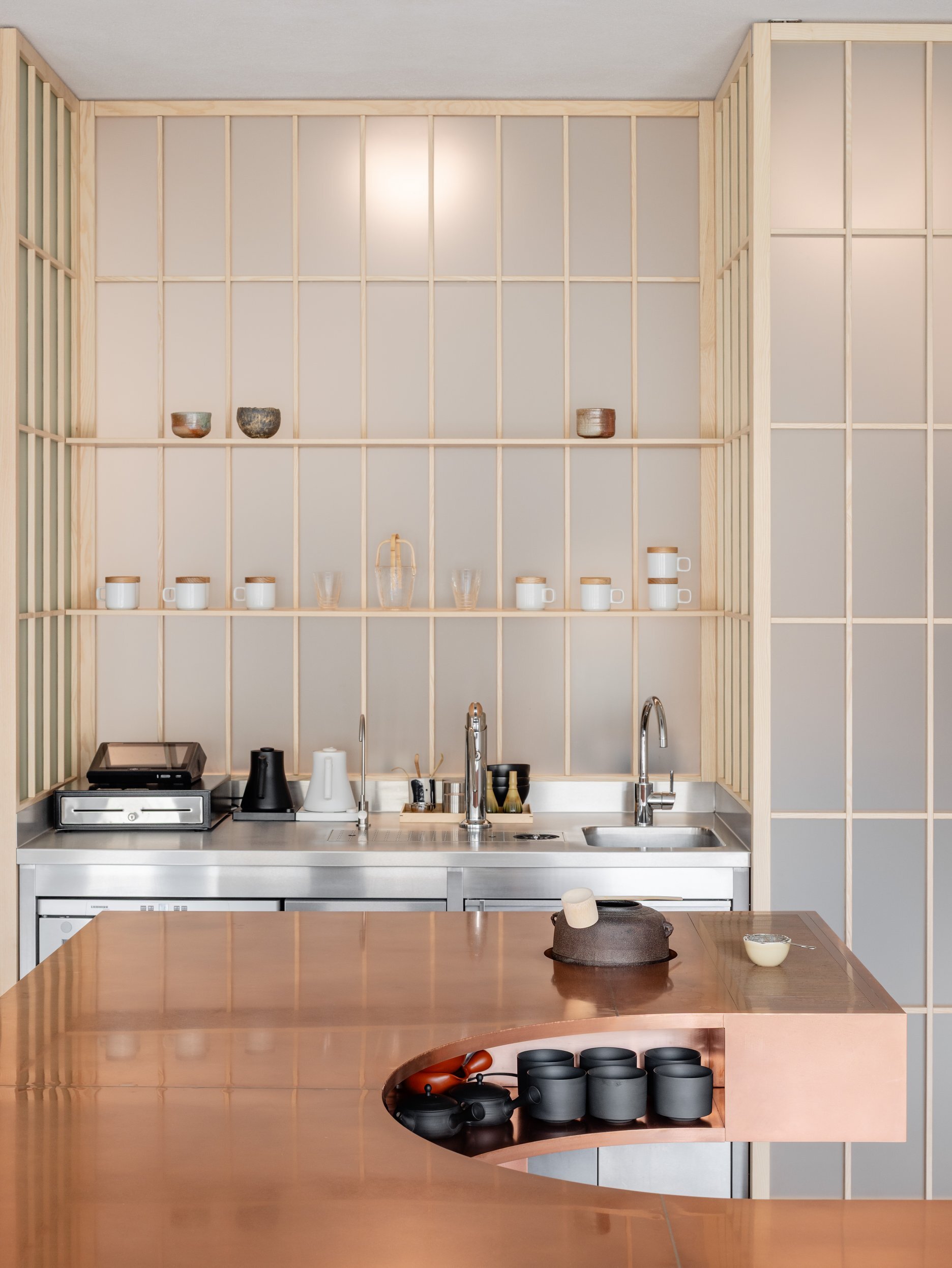 Dôsledné "vyčistenie" dispozície a interiéru upriamuje pozornosť na to podstatné - prípravu čaju a predaj čajovej keramiky. Ústredným prvkom prevádzky je vykrojený medený pult, ktorý slúži ako pracovisko čajového majstra. Na prvý pohľad nenápadnú estetiku priestoru dotvára citlivá práca autorov s materiálmi a detailmi, voľne inšpirovaná japonskými remeselnými tradíciami.