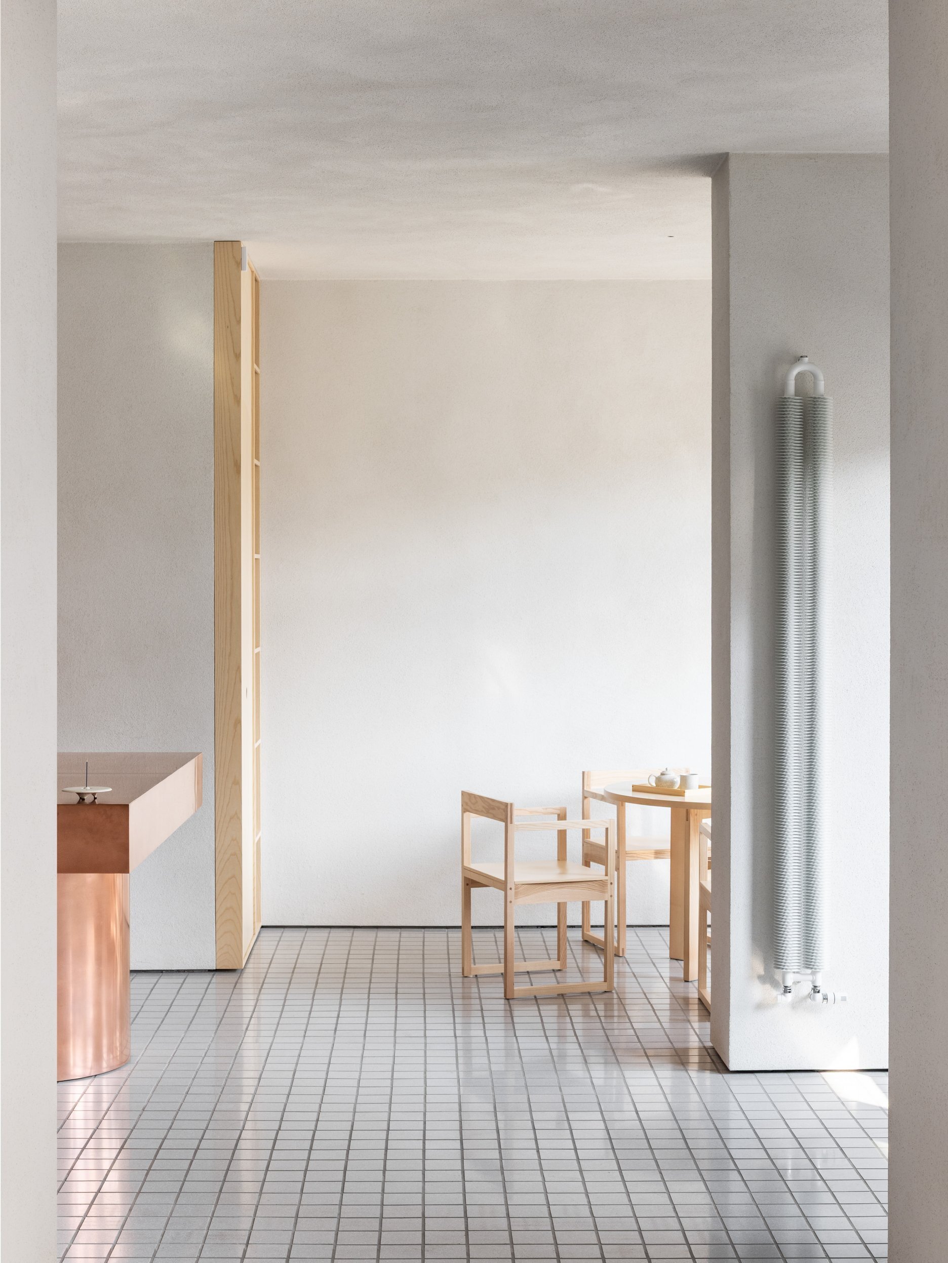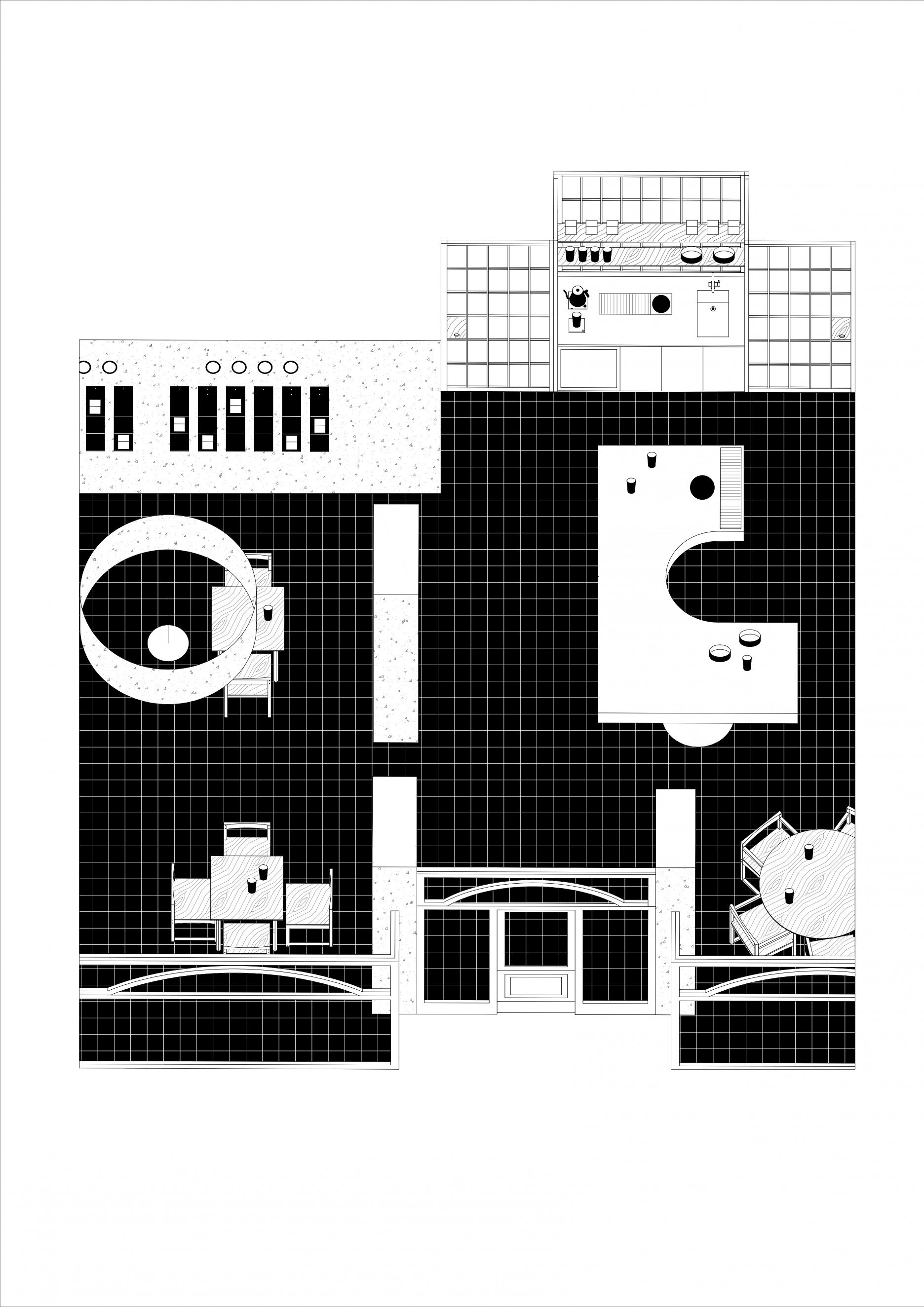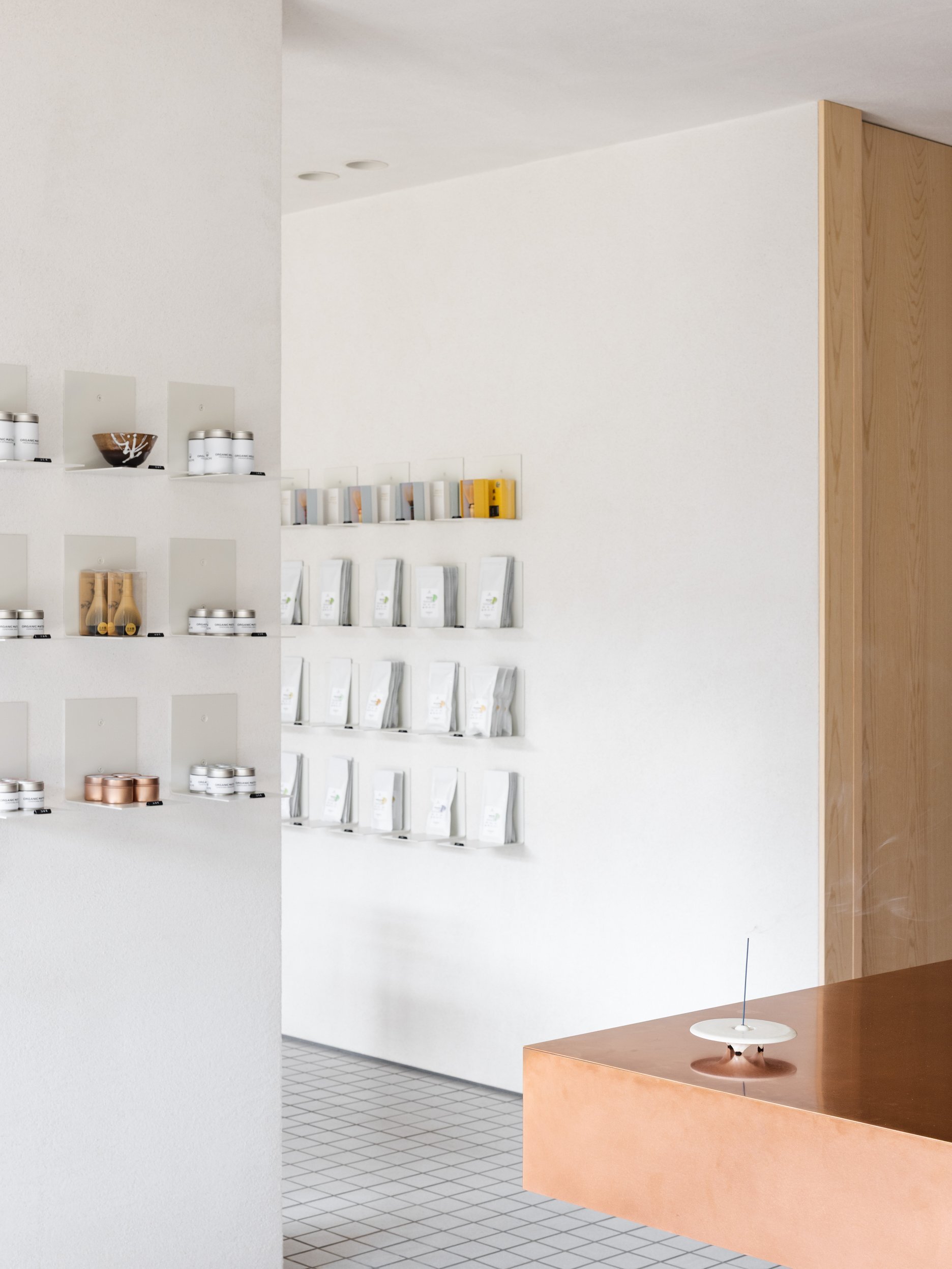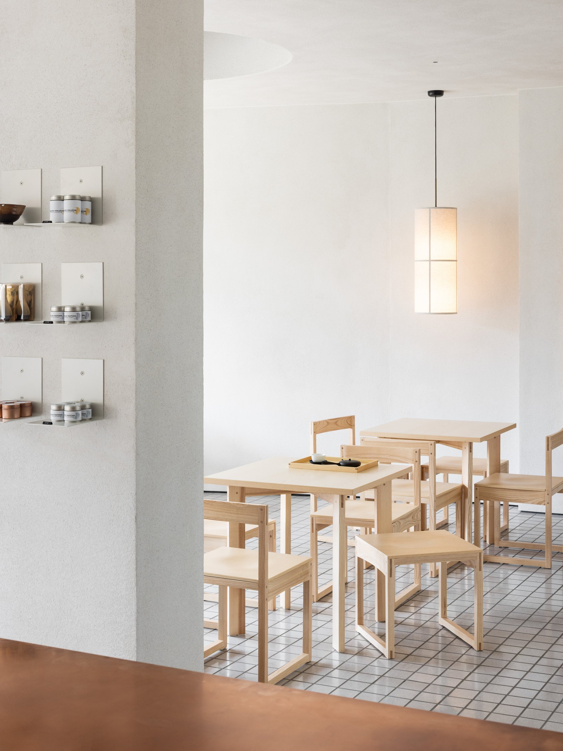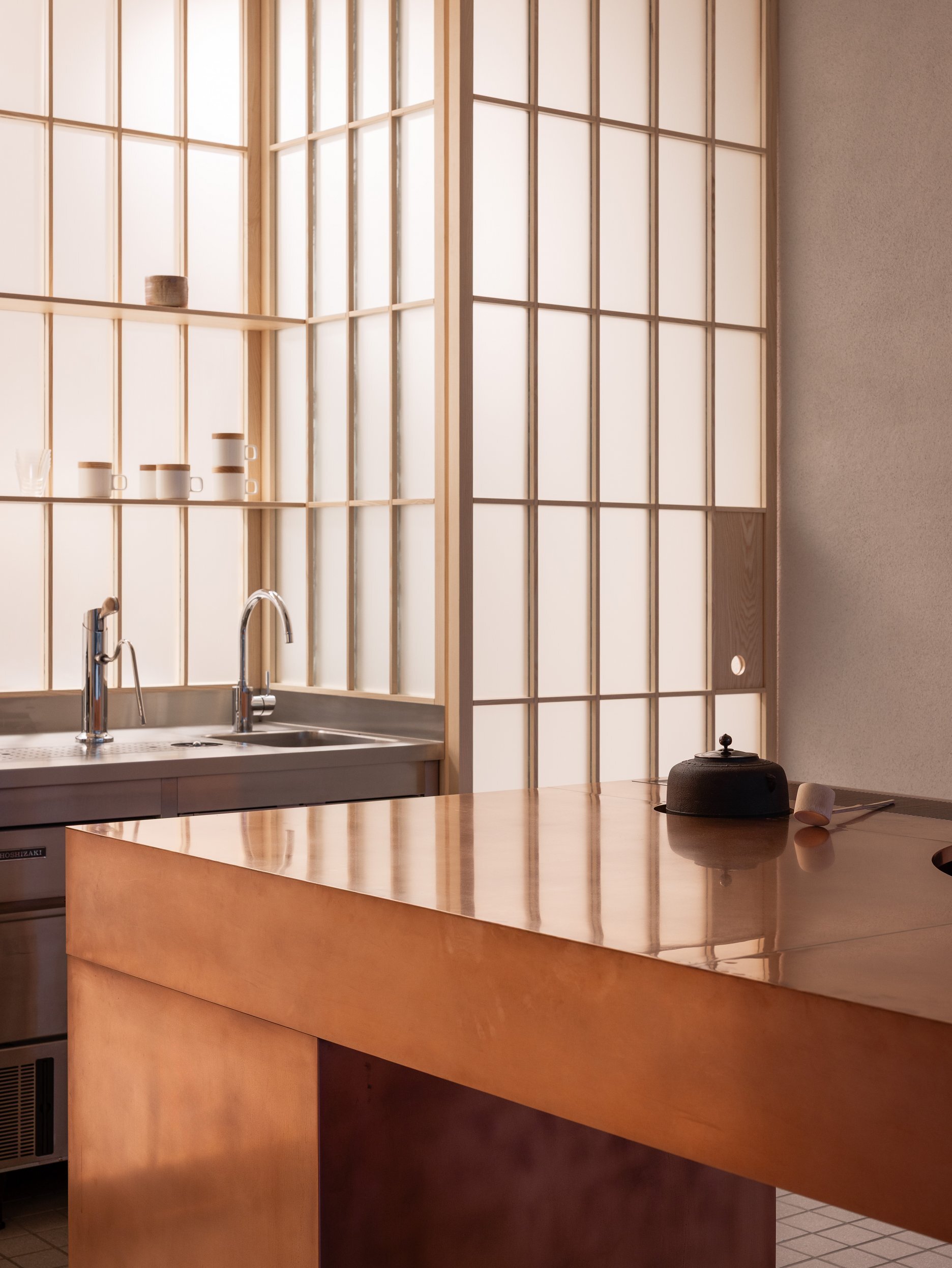 Dôsledné "vyčistenie" dispozície a interiéru upriamuje pozornosť na to podstatné - prípravu čaju a predaj čajovej keramiky. Ústredným prvkom prevádzky je vykrojený medený pult, ktorý slúži ako pracovisko čajového majstra. Na prvý pohľad nenápadnú estetiku priestoru dotvára citlivá práca autorov s materiálmi a detailmi, voľne inšpirovaná japonskými remeselnými tradíciami.