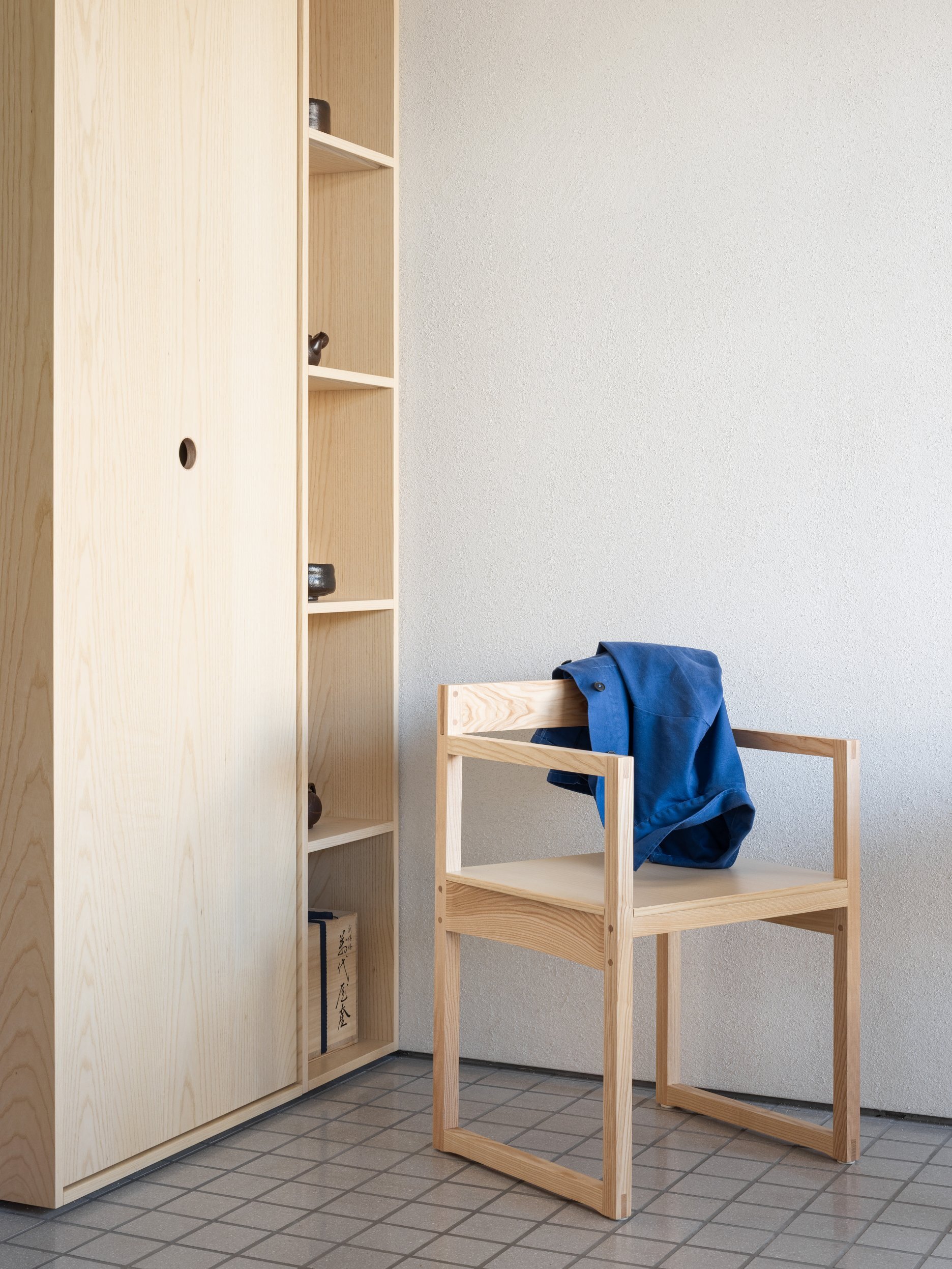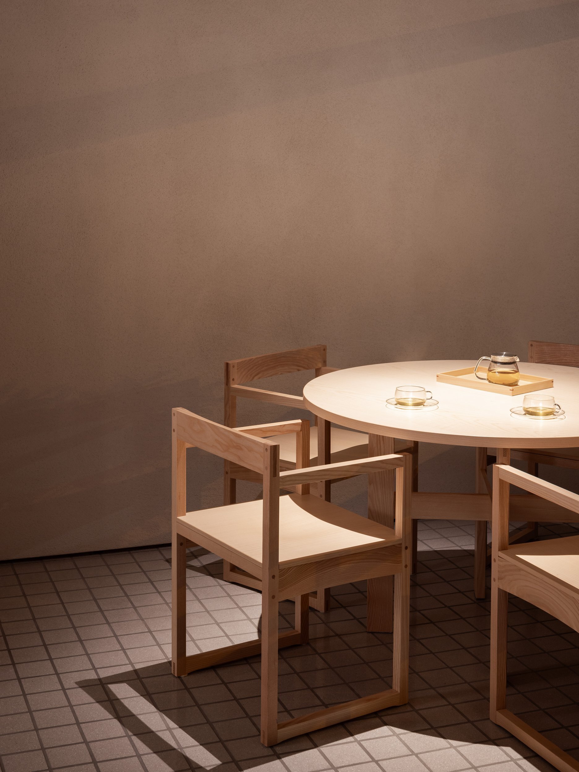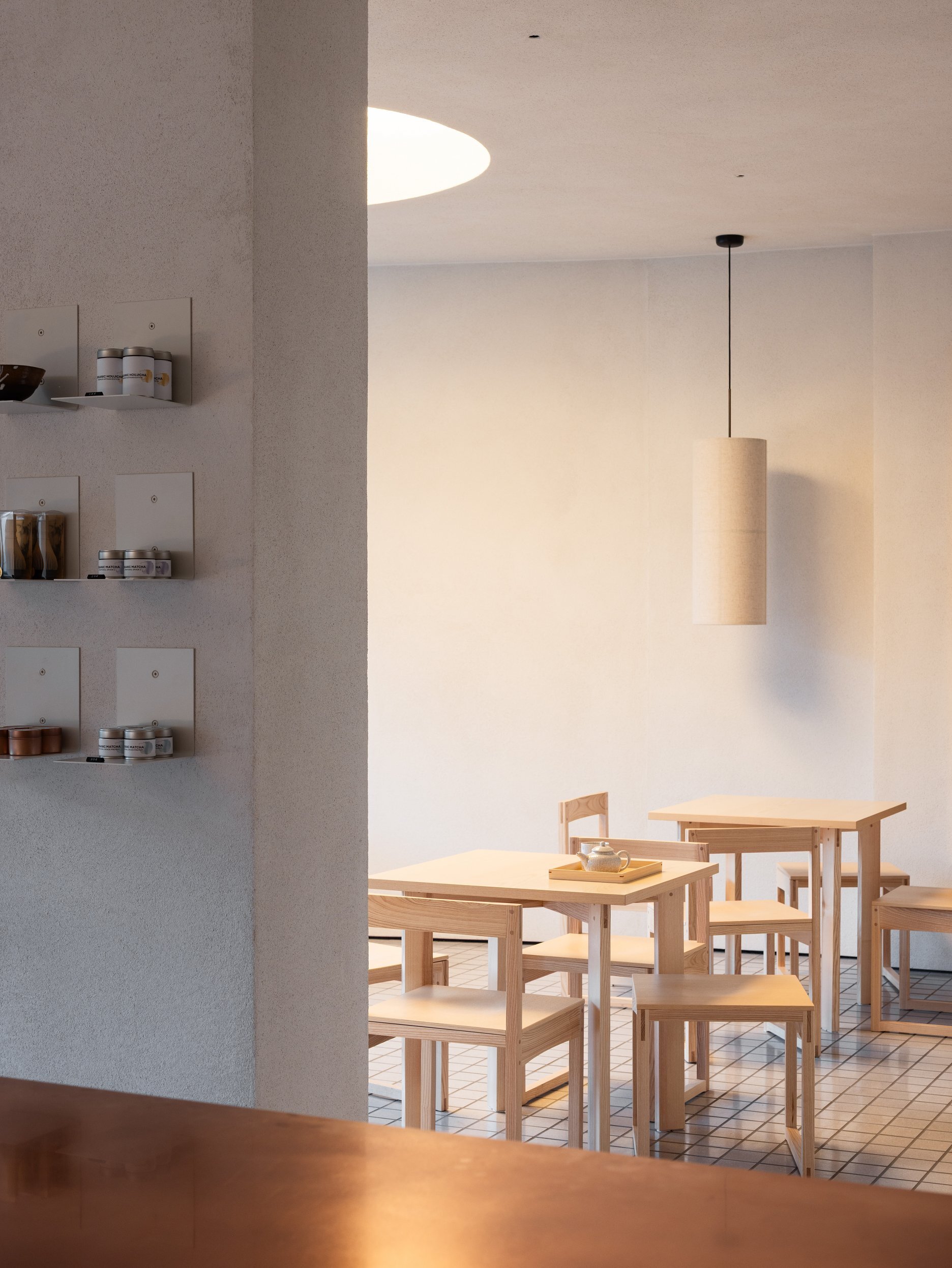 Vytvorili sme jednoduchú, ľahko čitateľnú dispozíciu, ktorá rešpektuje danosti priestoru (pozícia výkladov, svetelné podmienky…) a je založená na symetrii a kompozičných osiach. Časť pre pobyt zákazníkov smeruje do ulice, zázemie a sociálne zariadenia sú umiestnené v hĺbke dispozície. Predajné plynú na viacerých miestach v rámci interiéru. Cieľom nebolo ich sústredenie výlučne na jedno miesto, práve naopak, majú byť súčasťou zážitku. Forma predajných plôch je buď v podobe ľahkých oceľoých políc alebo drevených políc určených prioritne na predaj čajovej keramiky. Väčšina prvkov čerpá z tradičných japonských remeselných elementov, ako napríklad semi-transparentná deliaca stena nápadne pripomínajúca japonské shoji. Vo vstupných dverách visí látkový záves - noren, ktorý značí, že je prevádza otvorená.