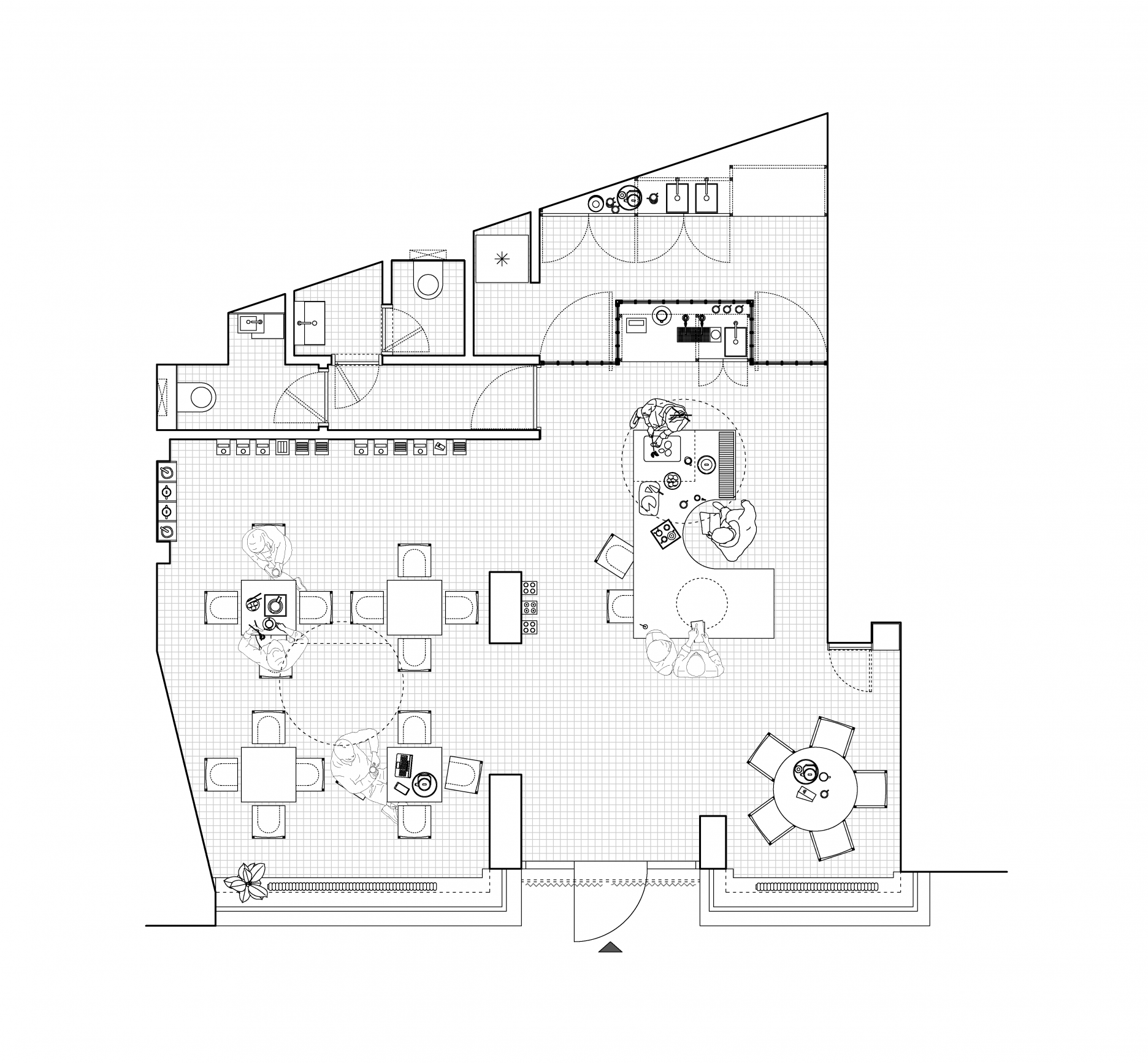 Všetky technológie a technické zaradenia boli dôsledne zabudované, aby nenarušili čistotu priestoru. Prívod a odvod vzduchu je riešený cez nenápadné kruhové otvory v stope. Podobným princípom je riešená aj klimatizácia priestoru. Všetky gastro zariadenia (páka na paru, oplach...) sú komplet zabudované v kuchynskej časti, resp. vo frontbare, ktorý slúži ako zázemie medeného pultu. Rovnako tak väčšina stropného osvetlenia s výnimkou kruhových tanierov osvetľujúcich ‘‘svetlíky’’. Primárne osvetlenie tvorí séria svetelných spotov malého priemeru, ktoré distribuujú svetlo cez otvor v strope. Všetky riešenia, použité materiály a detaily zhmotňujú v našich očiach predstavu o pokoji, harmónii a japonskej precíznosti.