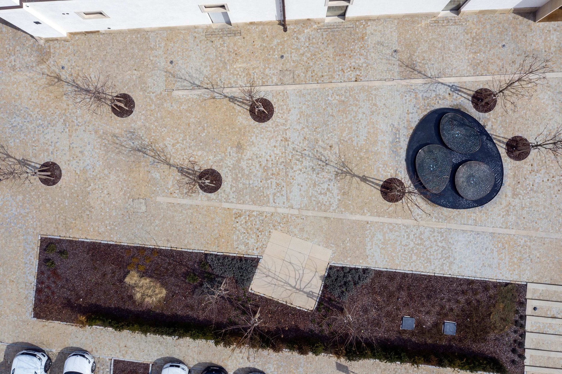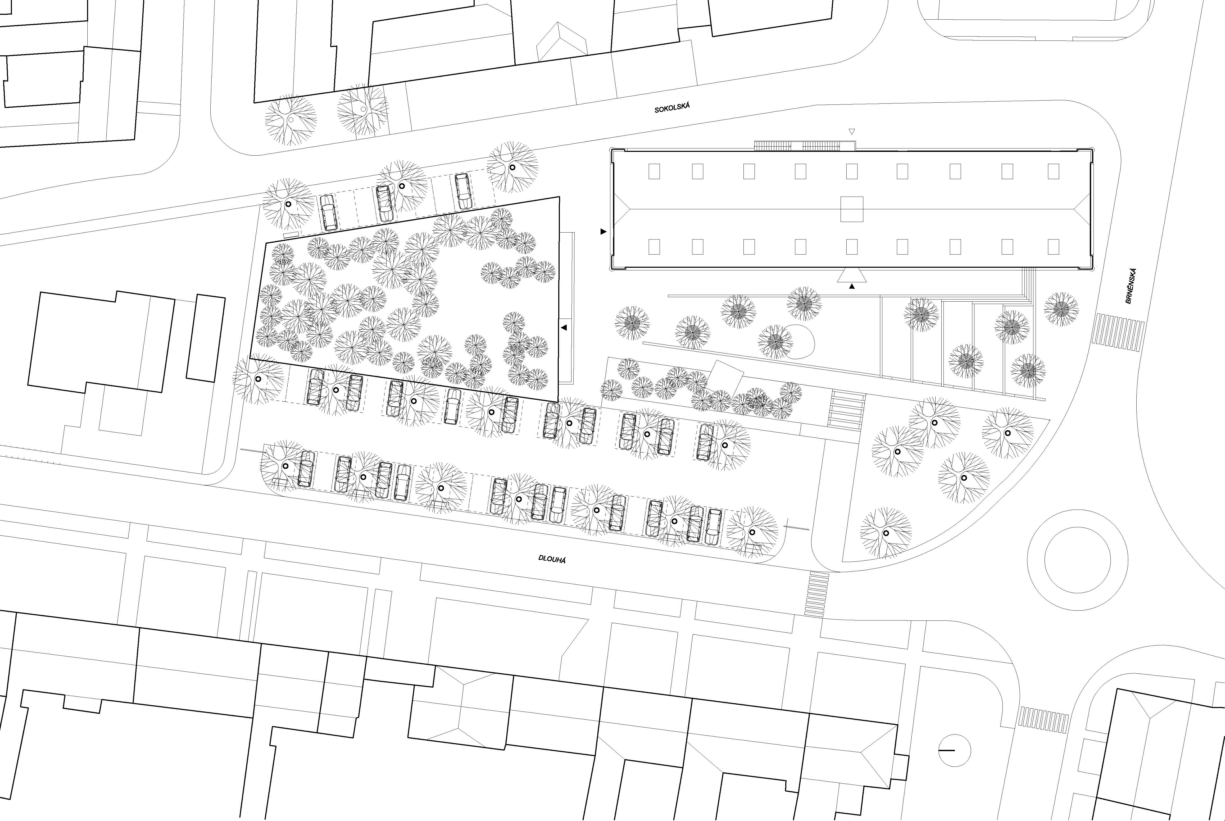 Vegetačná strecha nového objektu je využitá ako marhuľový sad. Areál je zo strany exteriéru vymedzený upravenými vonkajšími plochami s vysadenými platanmi, nízkou zeleňou a novou fontánou.