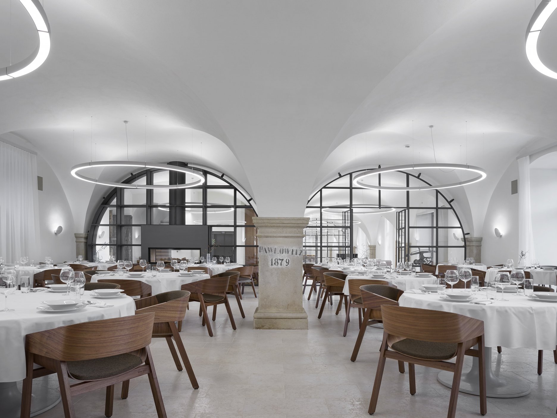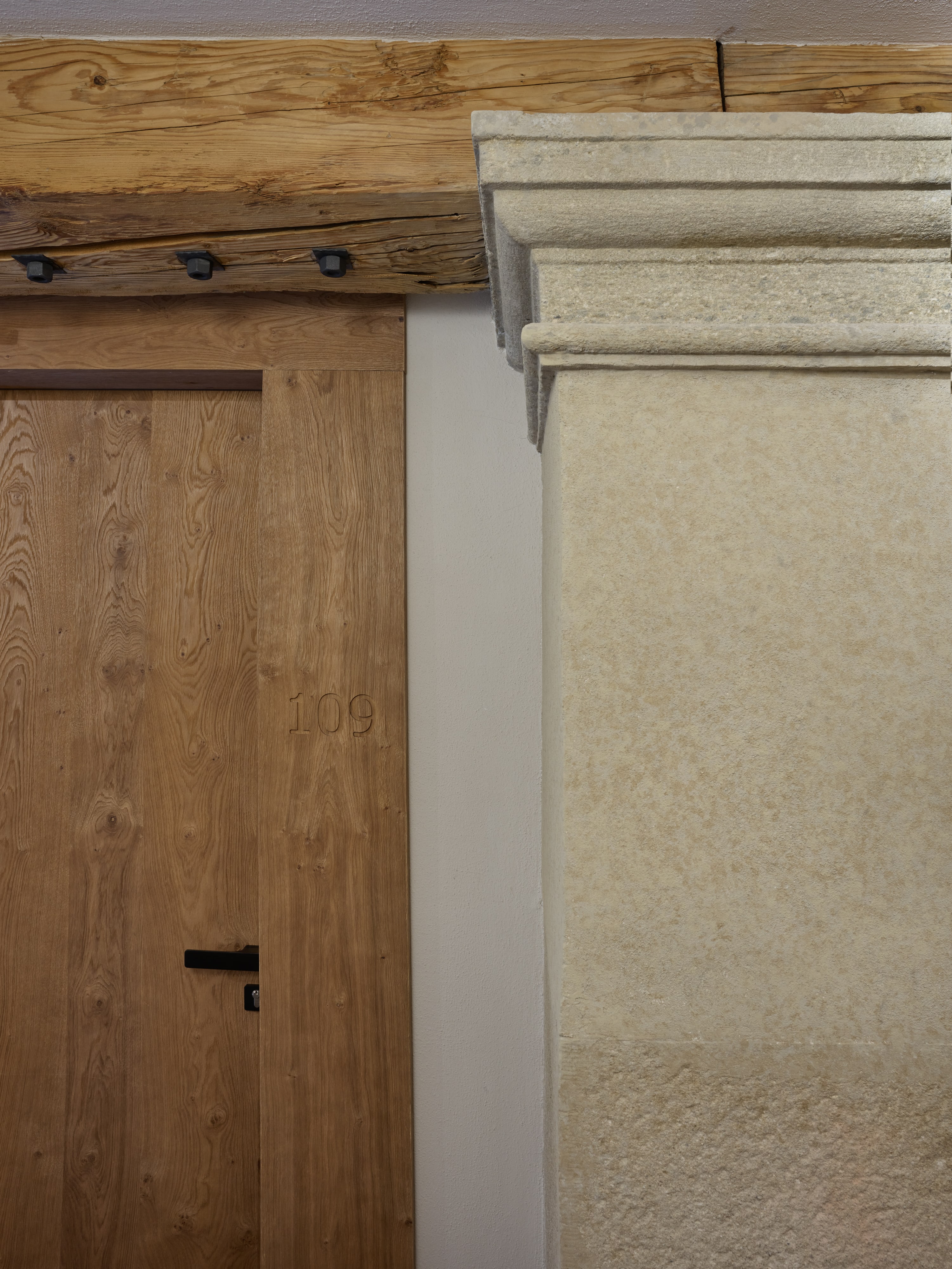Zachované pôvodné stavebné prvky (kamenné ostenia okien, kamenné a drevené stĺpy, kovaná brána, drevené schodisko, spracovanie omietok, či veľkoplošná kamenná dlažba...) vykazujú značnú remeselnú kvalitu. "Výtvarný koncept interiéru stačilo jen vnímat a respektovat. Rozhodli jsme se novými prvky a povrchy nekonkurovat stávajícím, ale podpořit jejich vyznění současnými stavebními a technickými možnostmi," vysvetľujú architekti.