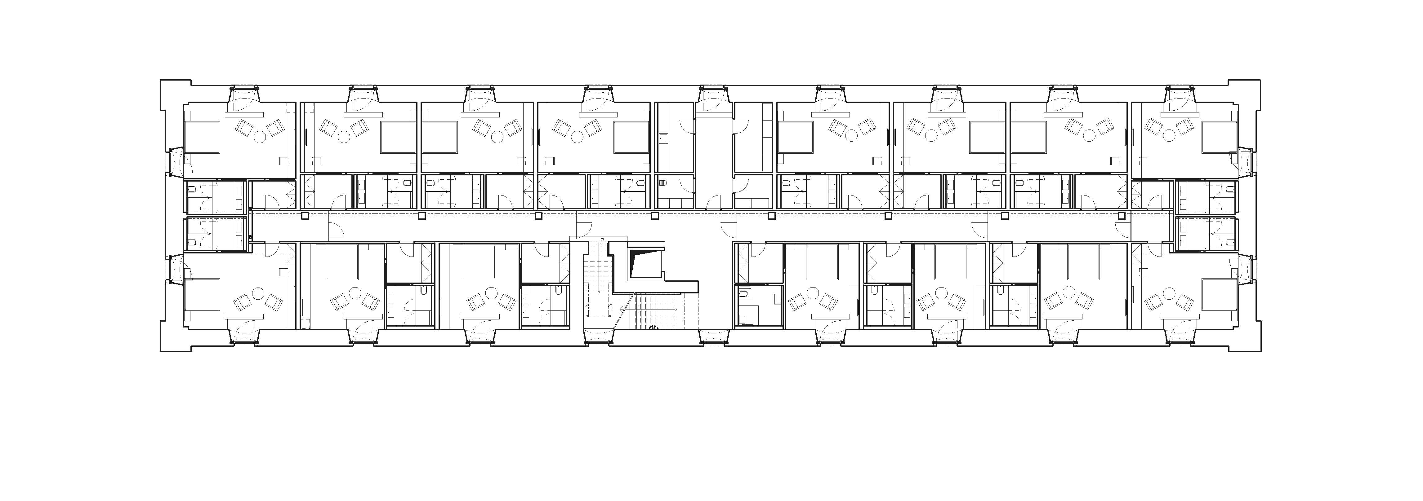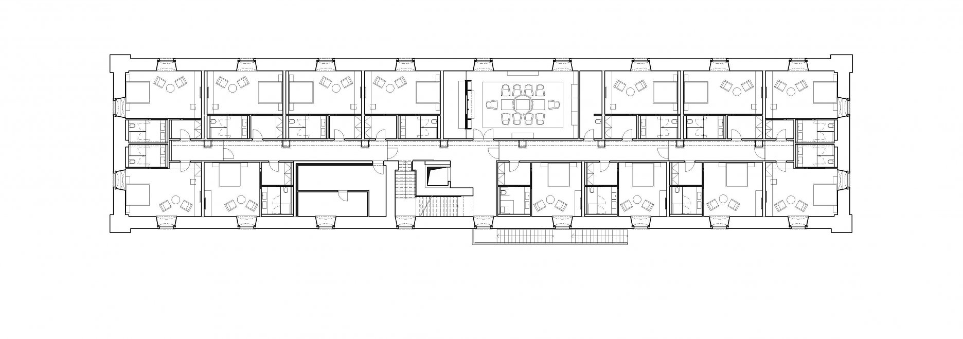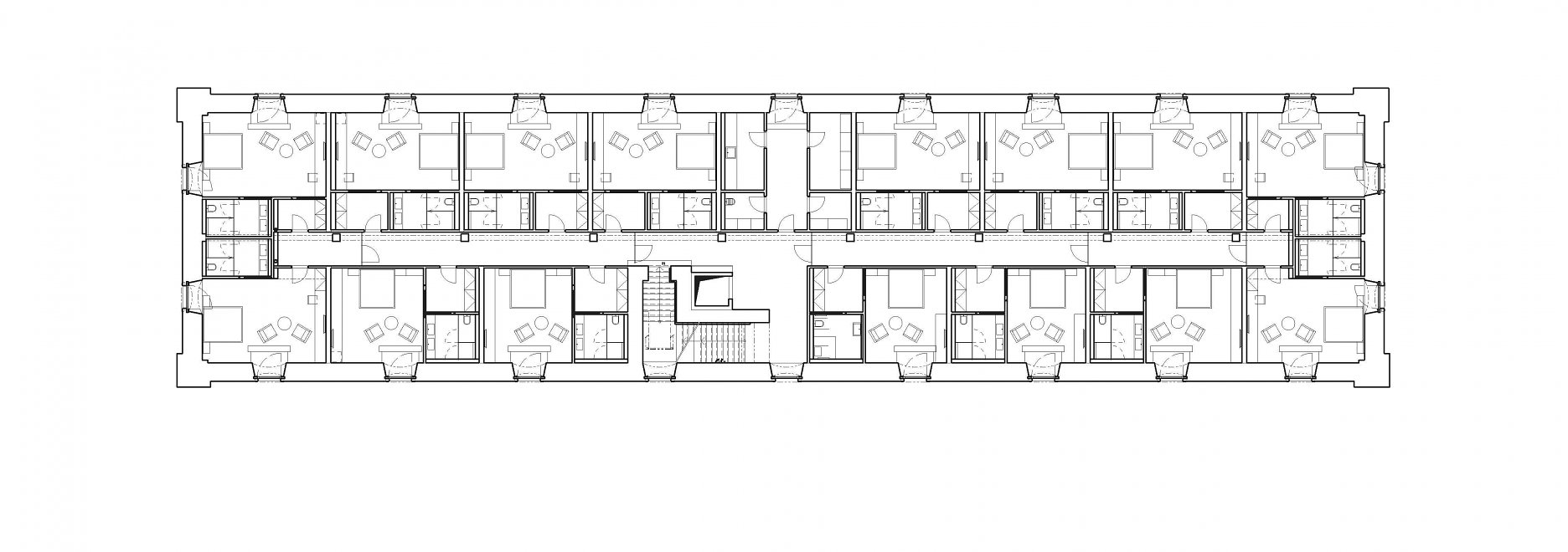 Na ďalších poschodiach je štyridsaťdva hotelových izieb rôznych kategórií. Skladbu dopĺňajú štyri apartmány, klubový salónik a kancelária správy prevádzky. Priestranné hotelové izby majú drevené podlahy, robustné drevené dvere a masívny vstavaný nábytok. Rozmer okenných výplní umožnil zachovať pôvodné kamenné ostenia. "Jsou však zvětšena proskleným parapetem ve venkovním líci stěny. Z interiéru tak vzniká dojem arkýře, vně sklo se sítotiskem splývá s fasádou. Koupelny jsou ve světlém nebo tmavém velkoplošném obkladu," dodávajú architekti.
