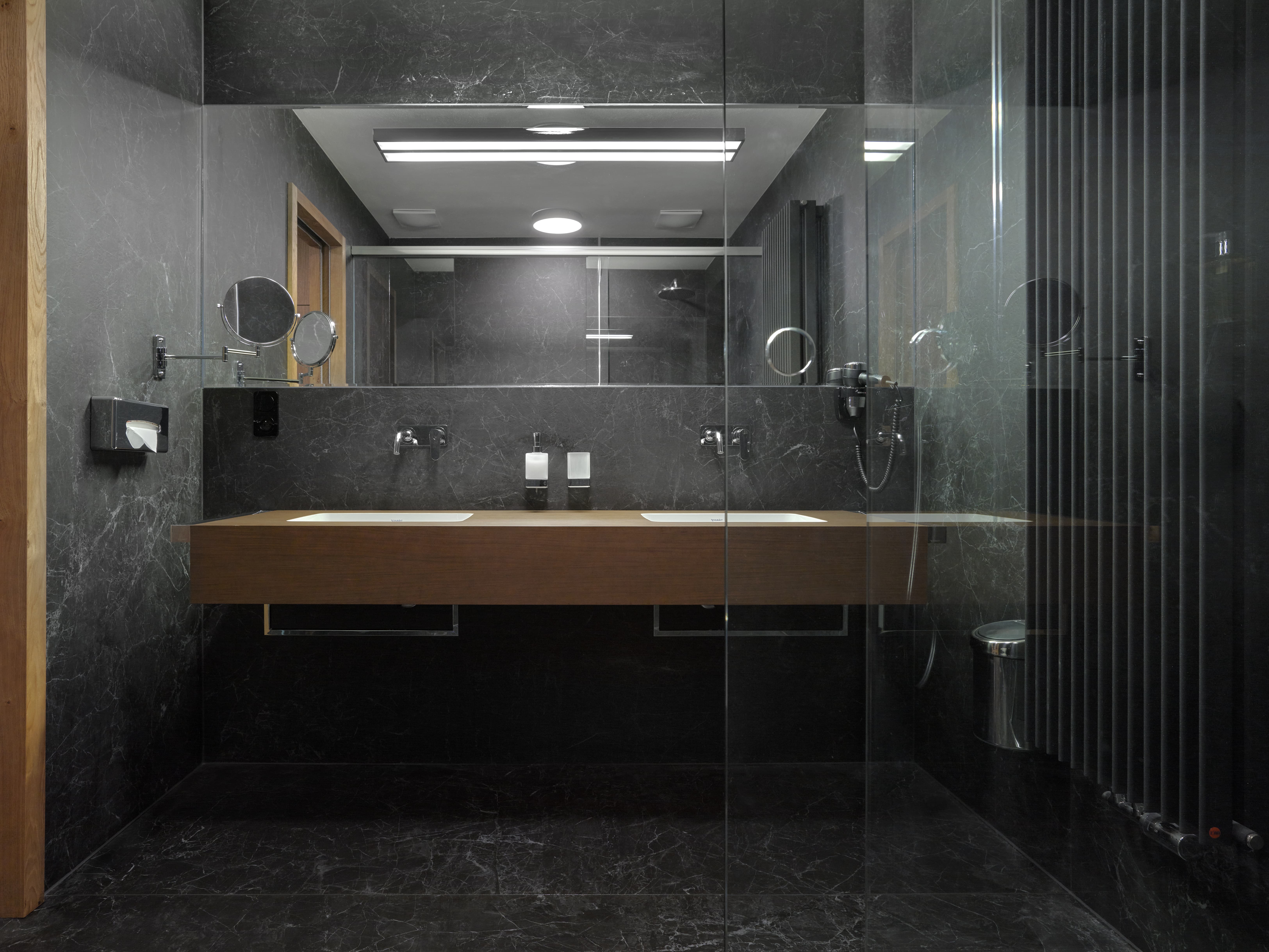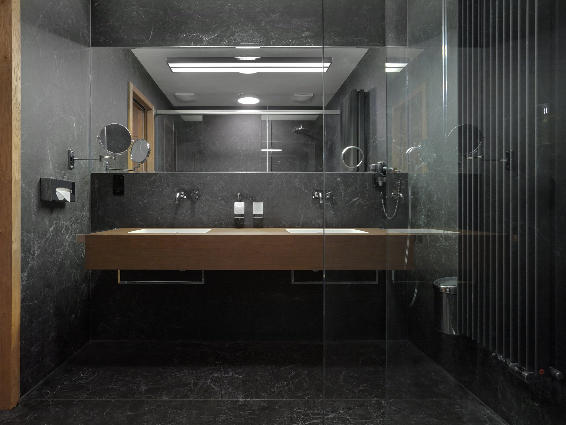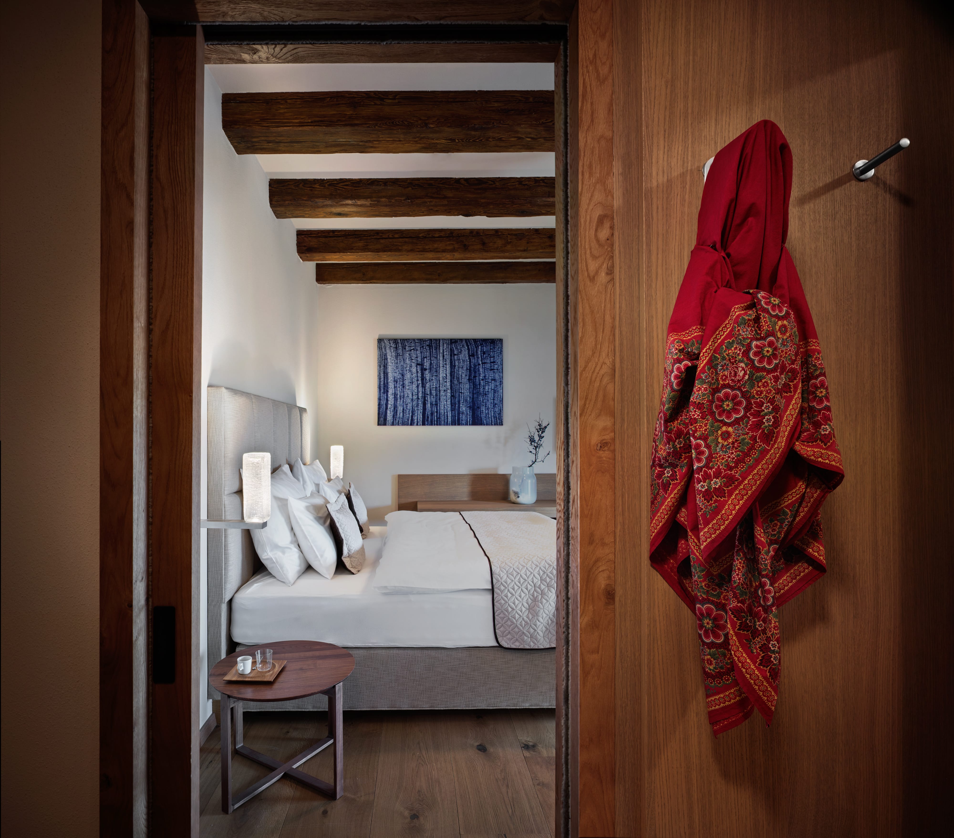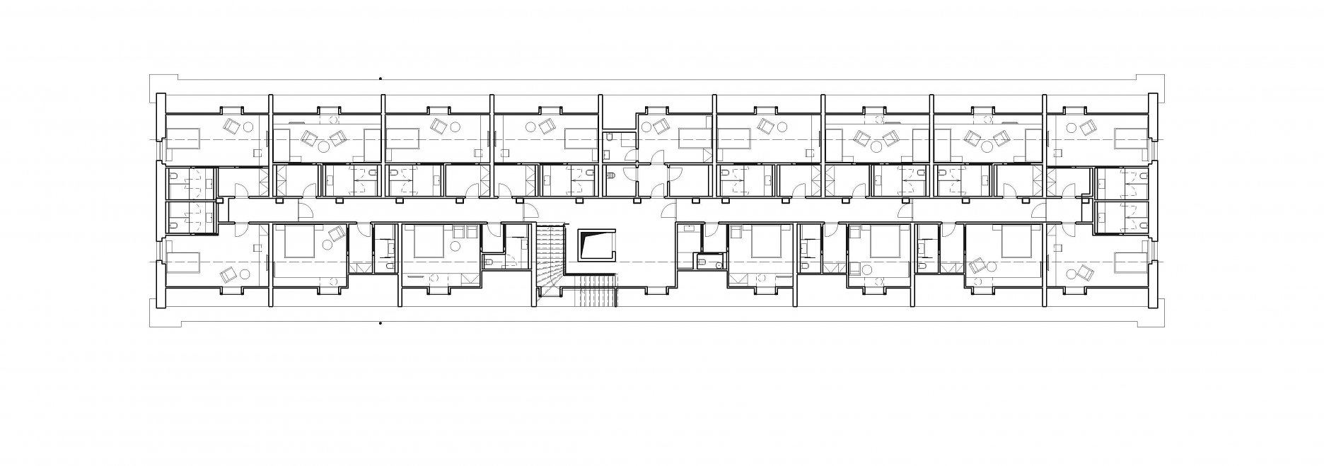 Na ďalších poschodiach je štyridsaťdva hotelových izieb rôznych kategórií. Skladbu dopĺňajú štyri apartmány, klubový salónik a kancelária správy prevádzky. Priestranné hotelové izby majú drevené podlahy, robustné drevené dvere a masívny vstavaný nábytok. Rozmer okenných výplní umožnil zachovať pôvodné kamenné ostenia. "Jsou však zvětšena proskleným parapetem ve venkovním líci stěny. Z interiéru tak vzniká dojem arkýře, vně sklo se sítotiskem splývá s fasádou. Koupelny jsou ve světlém nebo tmavém velkoplošném obkladu," dodávajú architekti.