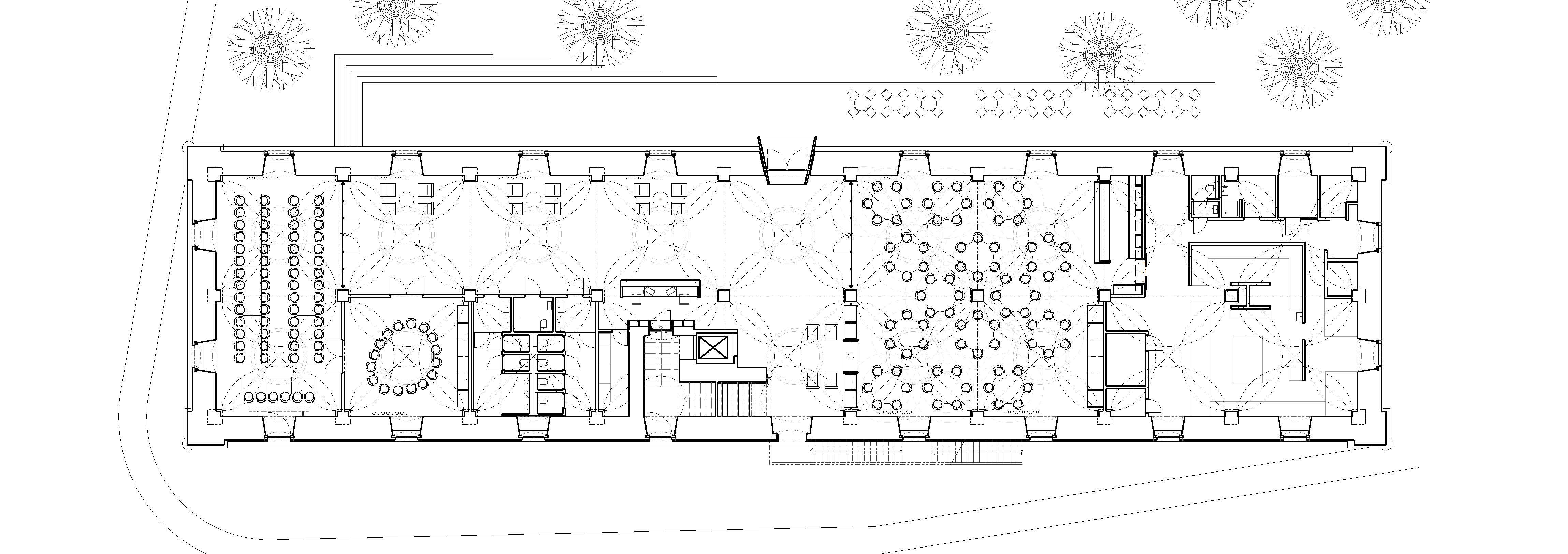 Prízemie budovy je v čo najväčšej miere otvorené, aby vynikla zrejmá veľkorysosť zaklenutého priestoru. Nachádza sa tu vstupná hala, reštaurácia so zázemím, dve konferenčné sály a potrebné zázemie. "Prosklené stěny s kovanými rámy a vestavba krbu, jež oddělují jednotlivé provozy, osvětlení, objekt recepce a baru, mobiliář, to vše je podřízeno pokračujícímu prostoru," dopĺňajú autori.