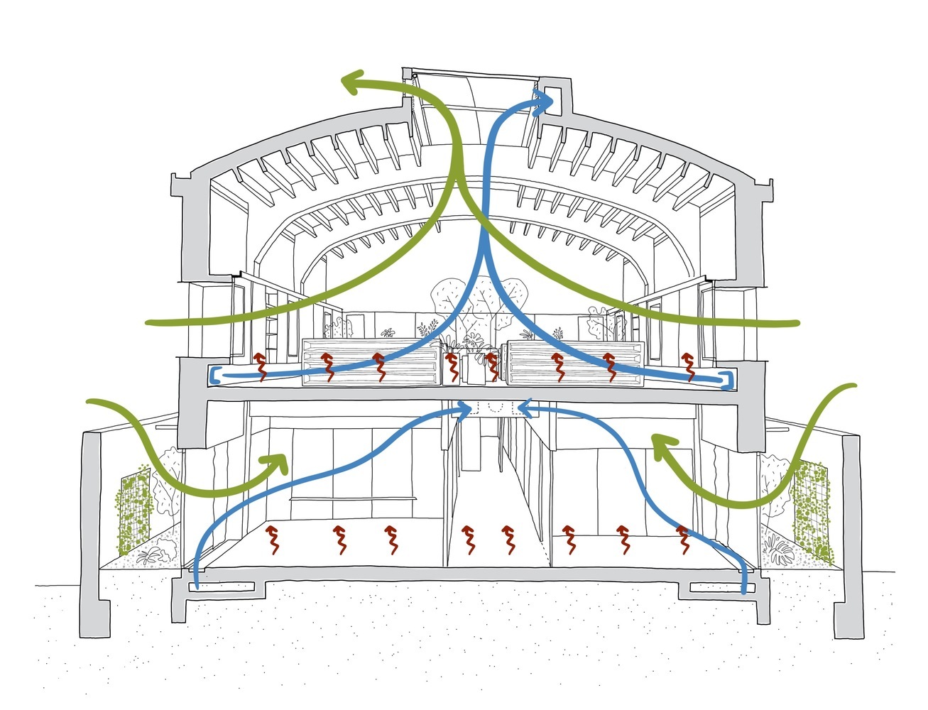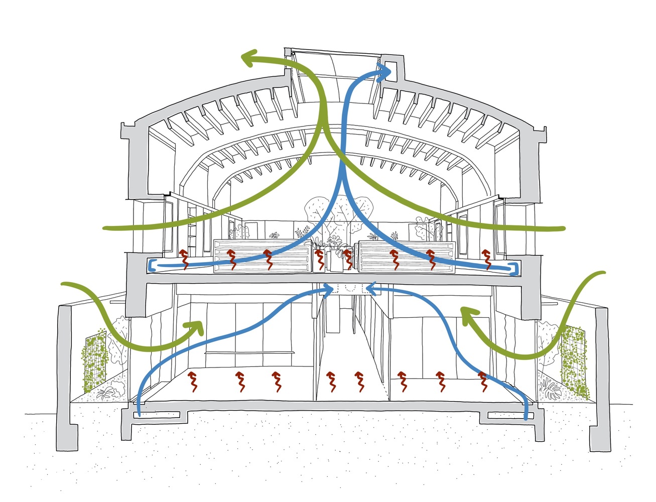 Veľkou výzvou bolo viesť denné svetlo do miestností, ktoré s tým tým pôvodne nepočítali. Bočné trakty na prízemí kinosály zmenili architekti na otvorené átriá, ktoré privádzajú svetlo do interiéru cez rozsiahle zasklenia bez parapetov. Výška centrálneho priestoru kinosály viedla architektov k vloženiu medziposchodia, ktoré presvetľuje nielen séria nových otvorov po obvode fasády, ale hlavne strešné svetlíky v celej dĺžke hrebeňa strechy. “Predtým tu bola klasická šikmá strecha, ktorá zakrývala krásny zakrivený strop. Ten sme odkryli a hľadali vhodný materiál pre zakrivené bočné plochy,“ opisuje Begović a dopĺňa: „Kvôli tvárnosti, minimálnemu zaťaženiu konštrukcie a trvácnosti, sme sa rozhodli pre systém PREFA PREFALZ.“