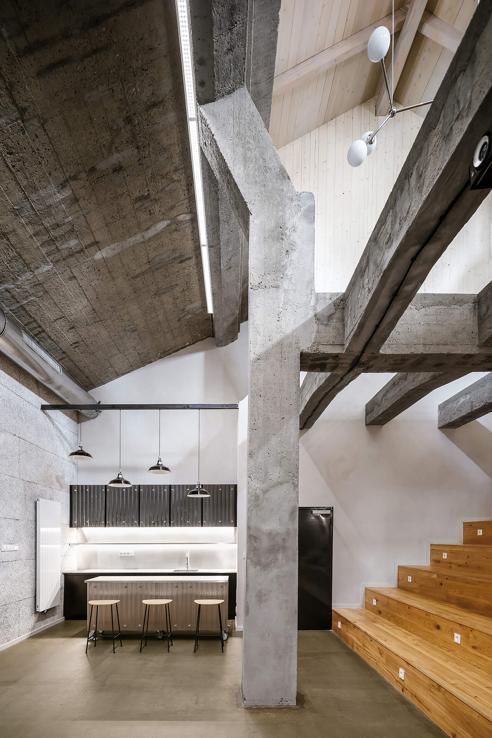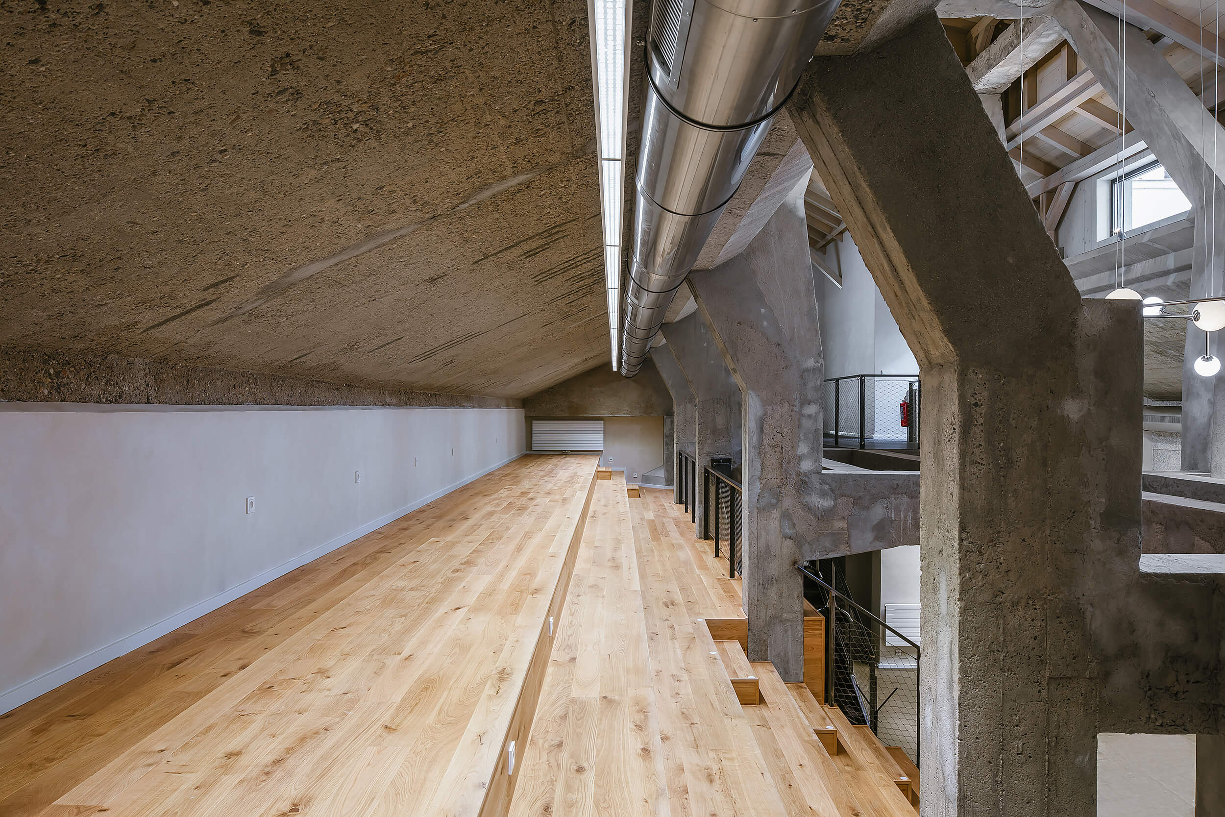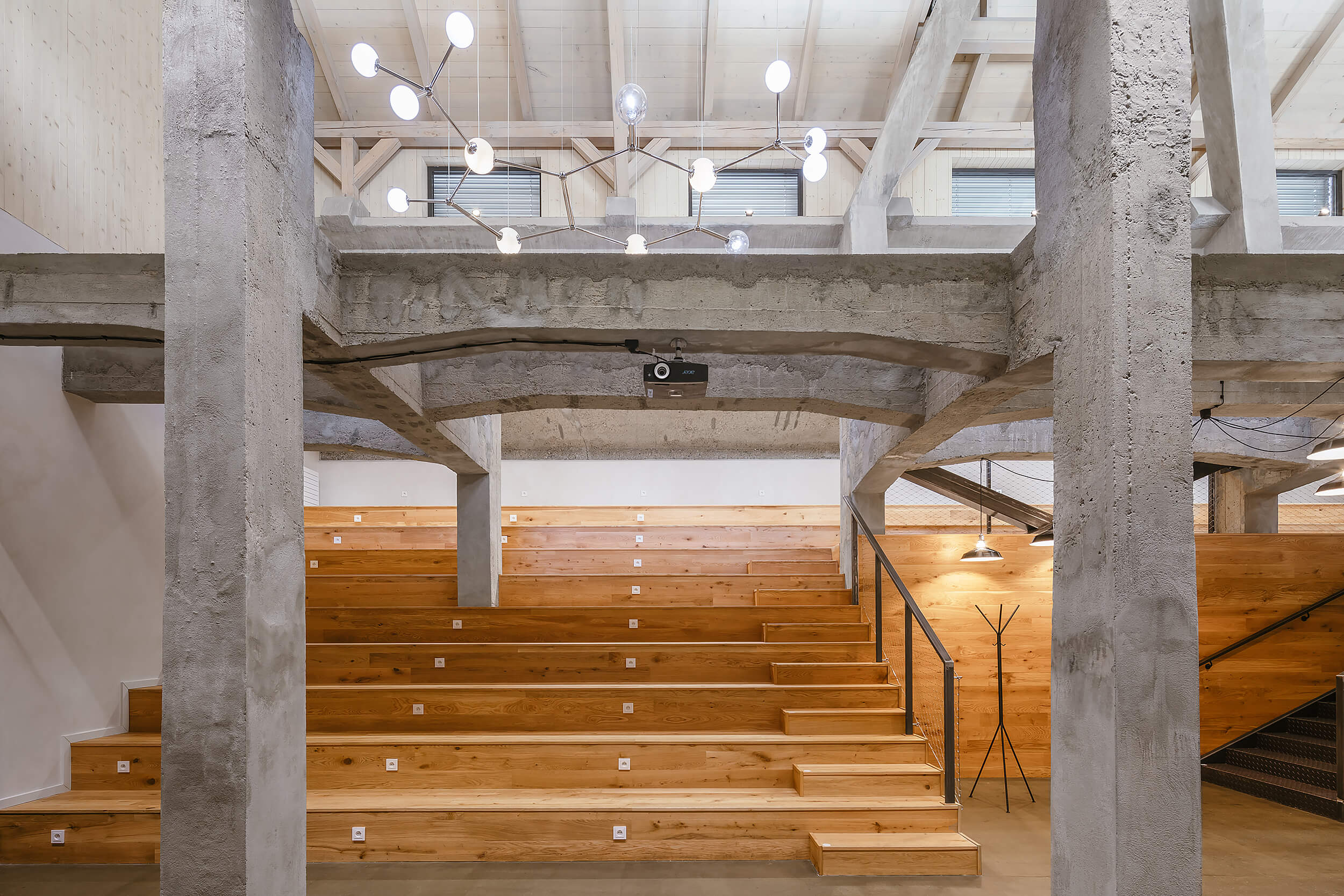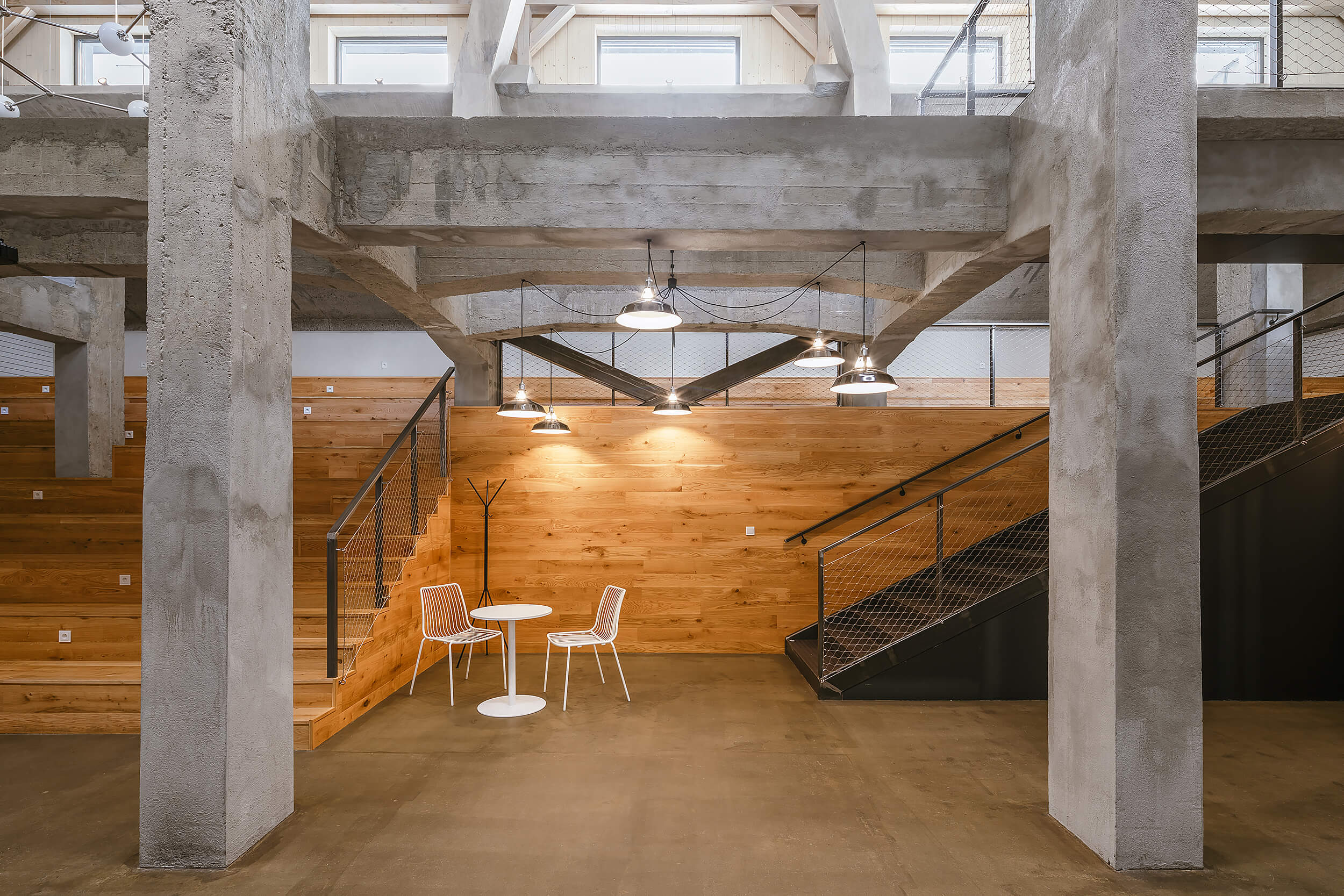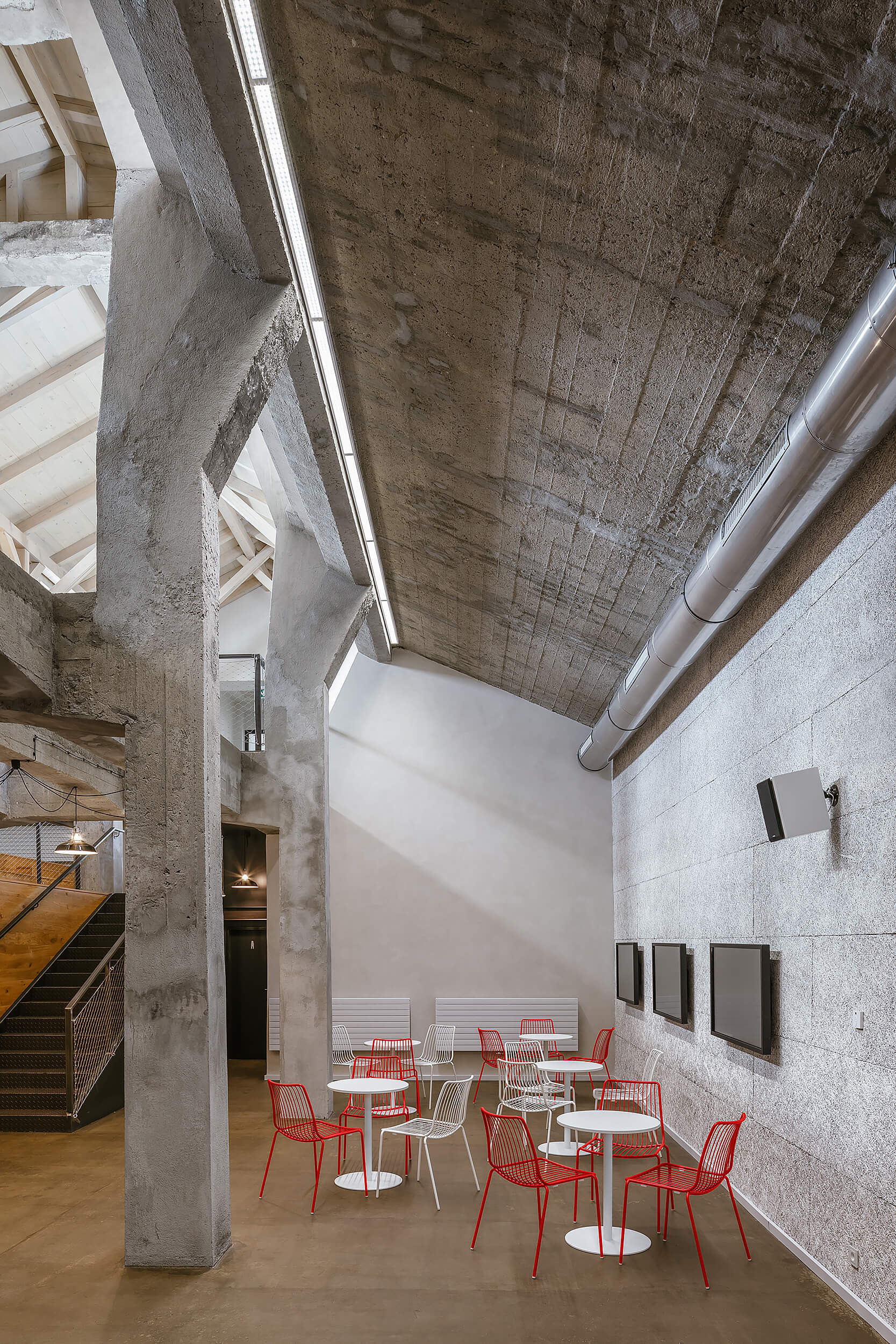“Když nás do něj poprvé přivedl investor, nezdálo se, že by se prostor dal smysluplně využít. Chyběly rovné části podlah a větší prostor. Pohled do řezu s dvěma naklopenými plochami nás přivedl na myšlenku využít jednu stranu jako skloněné auditorium. Rozhodli jsme se zachovat maximum z betonové konstrukce, která je krásná ve své původní účelovosti,“ vysvetľujú architekti.